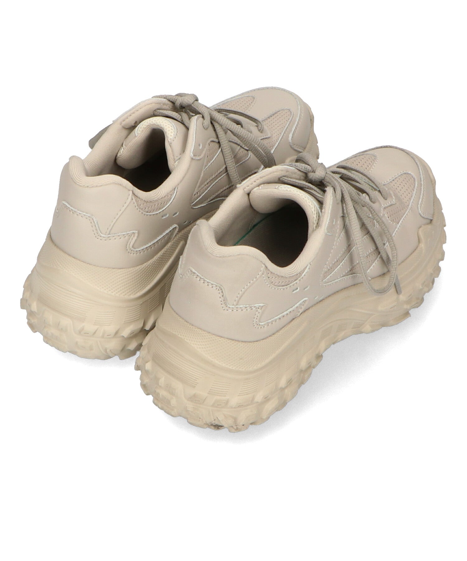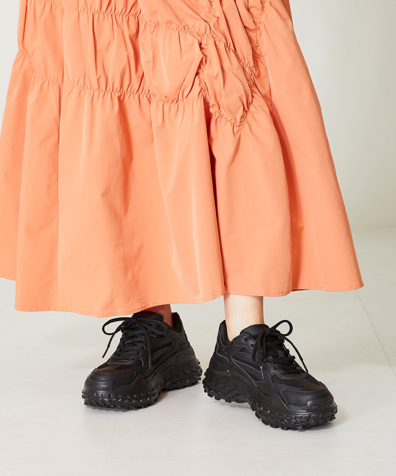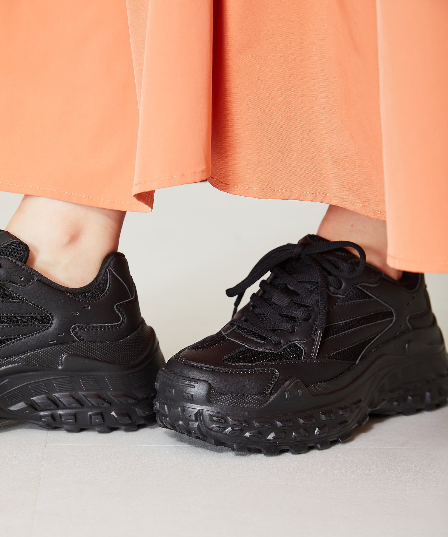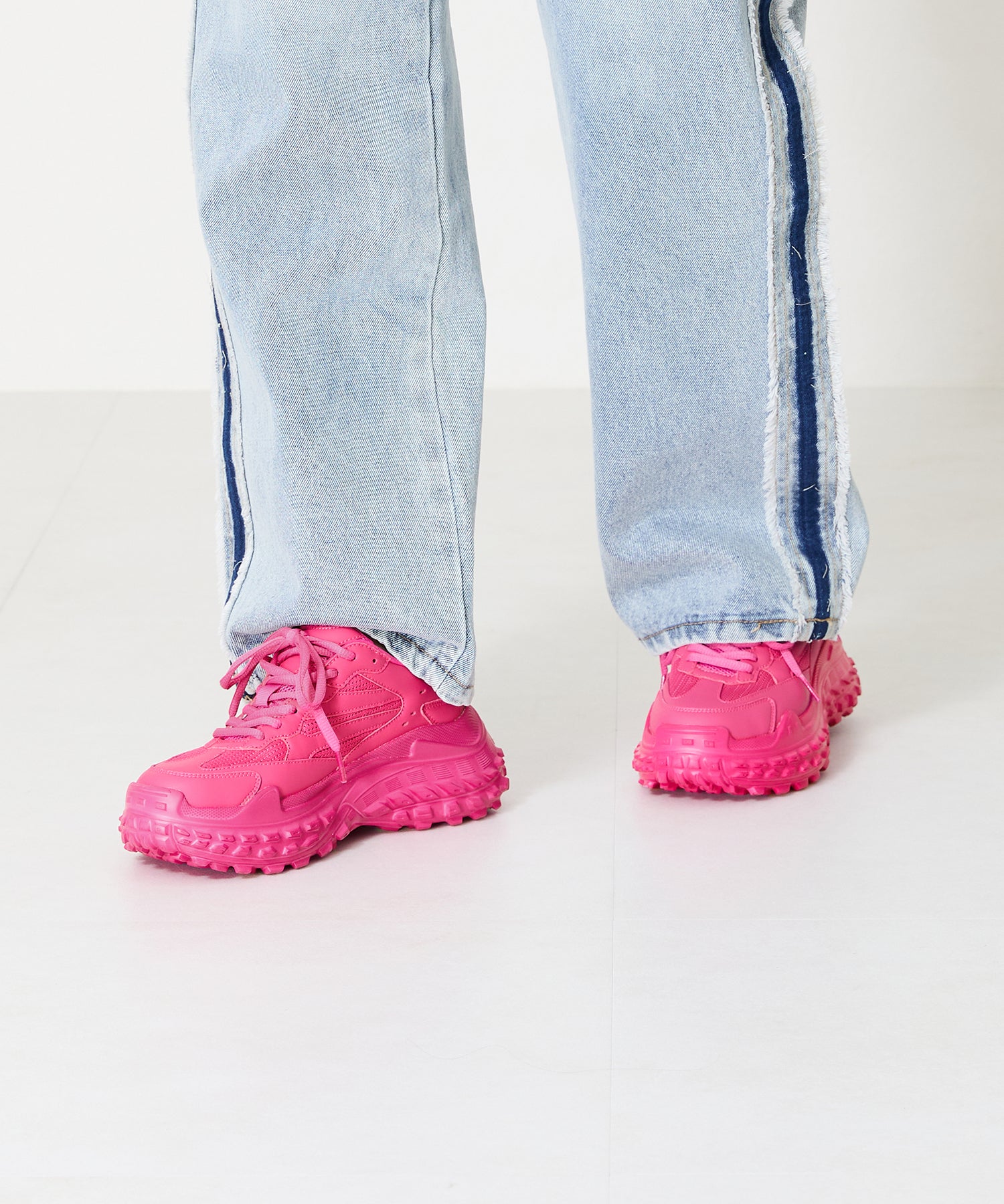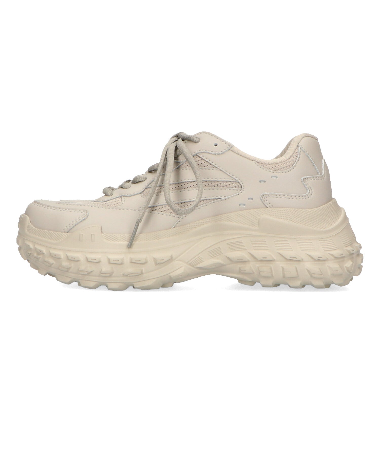 ごつごつとしたソールが新鮮なスニーカーは足元に取り入れるだけで旬なコーディネートに。全体を丸いシルエットにすることでメンズっぽくなりすぎず履けるのが嬉しい。ソールからアッパーまで同色でまとめることで形のユニークさもありながら、コーディネートとの馴染みの良さも両立。メッシュ素材を取り入れ通気性が良く軽量でラクチンな履き心地。
