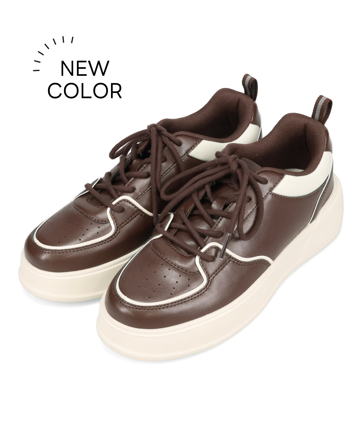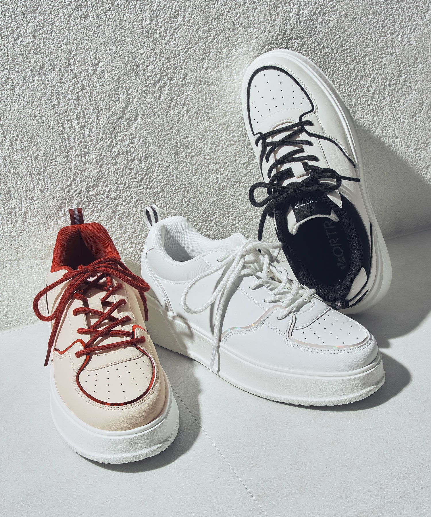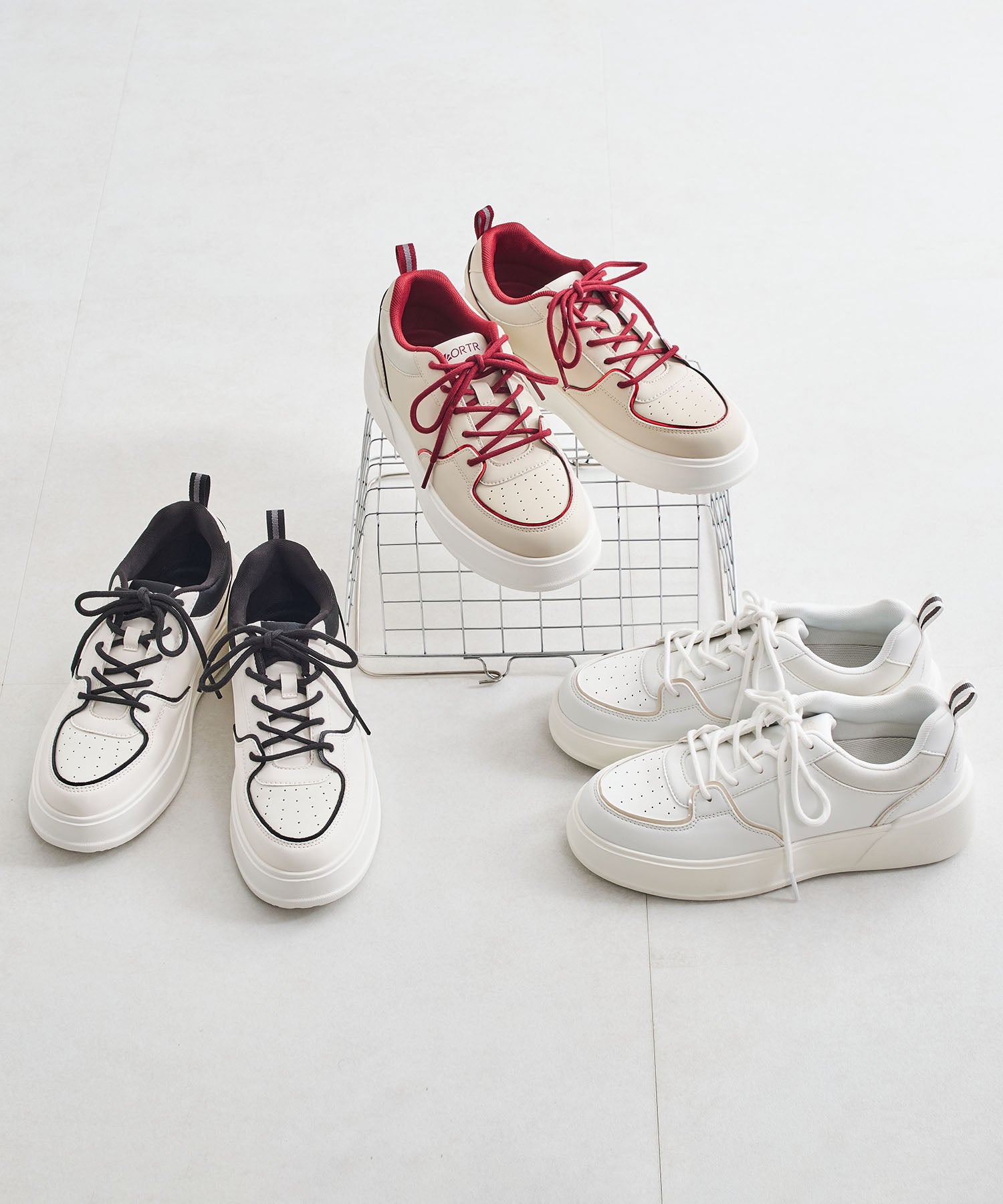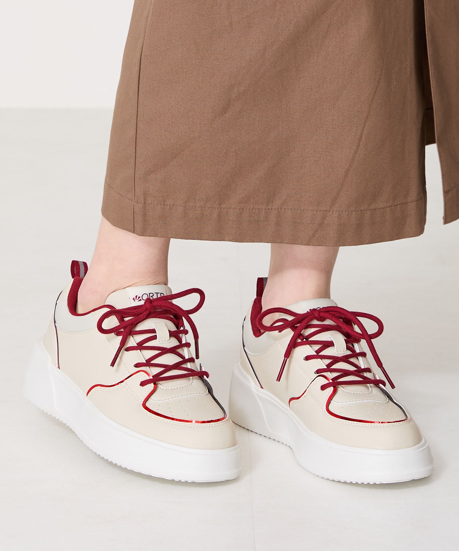 厚みのあるコートソールとパンチングデザインの組み合わせが今っぽいカジュアルなスニーカーは、厚底ながらもすっきりとしたソールで女性らしい柔らかい雰囲気を纏った仕上がりに。さりげないバイカラーのデザインが可愛いブラックとレッド、ワントーンでまとめることでコーデを選ばす履けるホワイト、新色のブラウンの豊富な選べる4色展開。