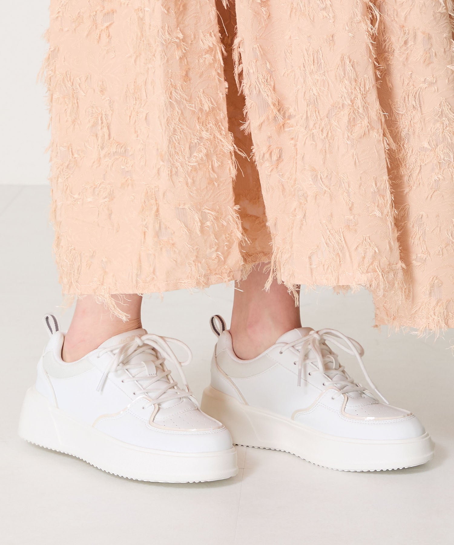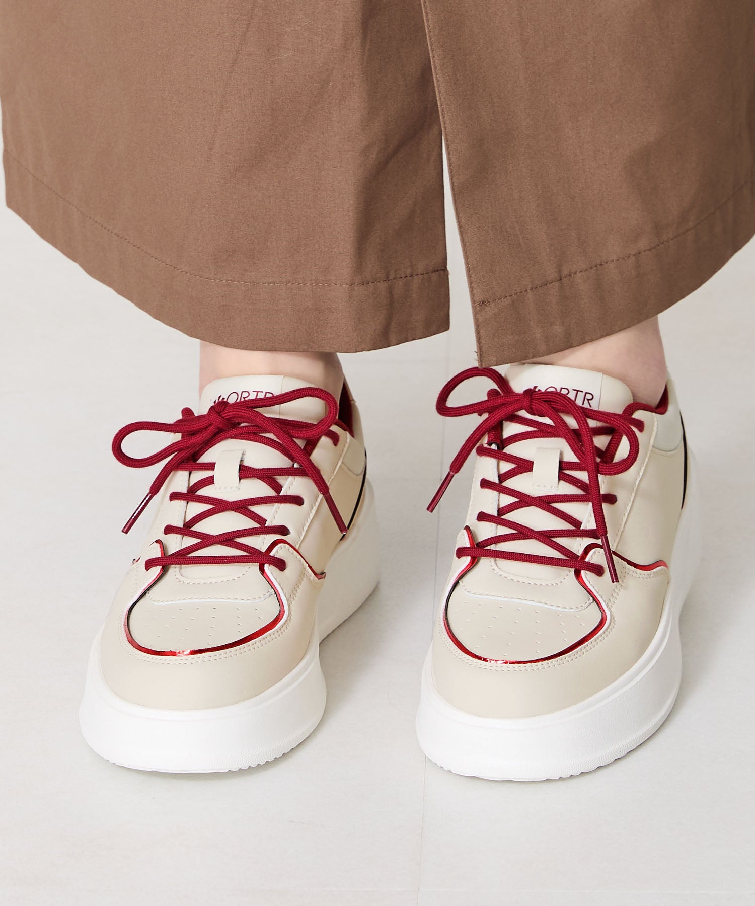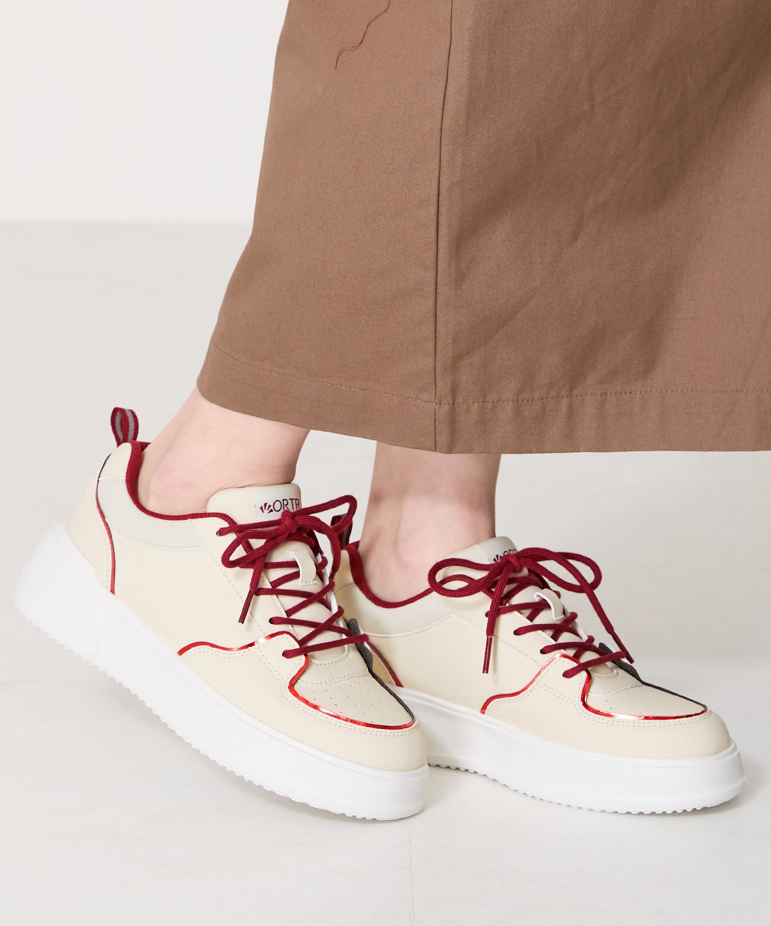 厚みのあるコートソールとパンチングデザインの組み合わせが今っぽいカジュアルなスニーカーは、厚底ながらもすっきりとしたソールで女性らしい柔らかい雰囲気を纏った仕上がりに。さりげないバイカラーのデザインが可愛いブラックとレッド、ワントーンでまとめることでコーデを選ばす履けるホワイト、新色のブラウンの豊富な選べる4色展開。
