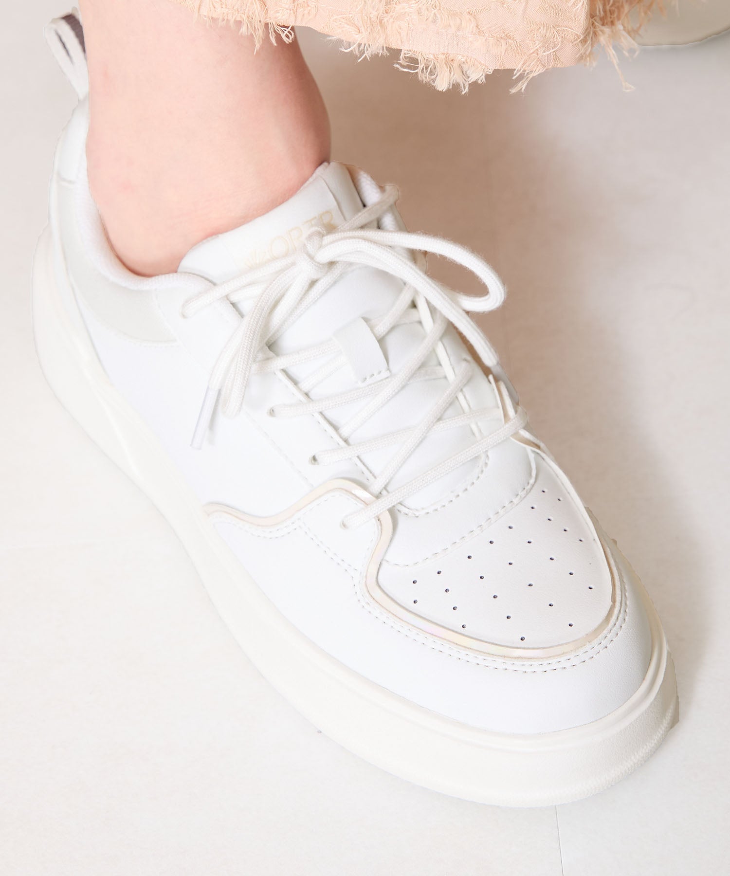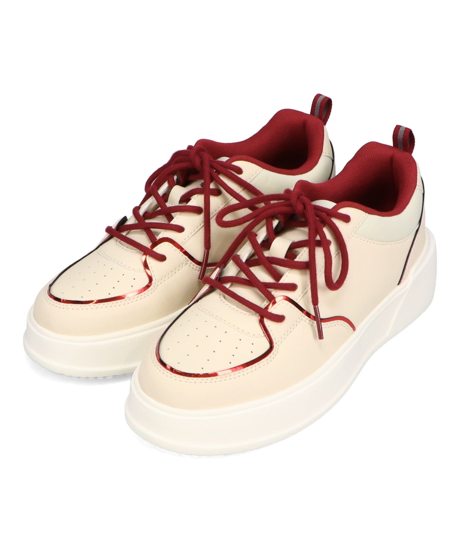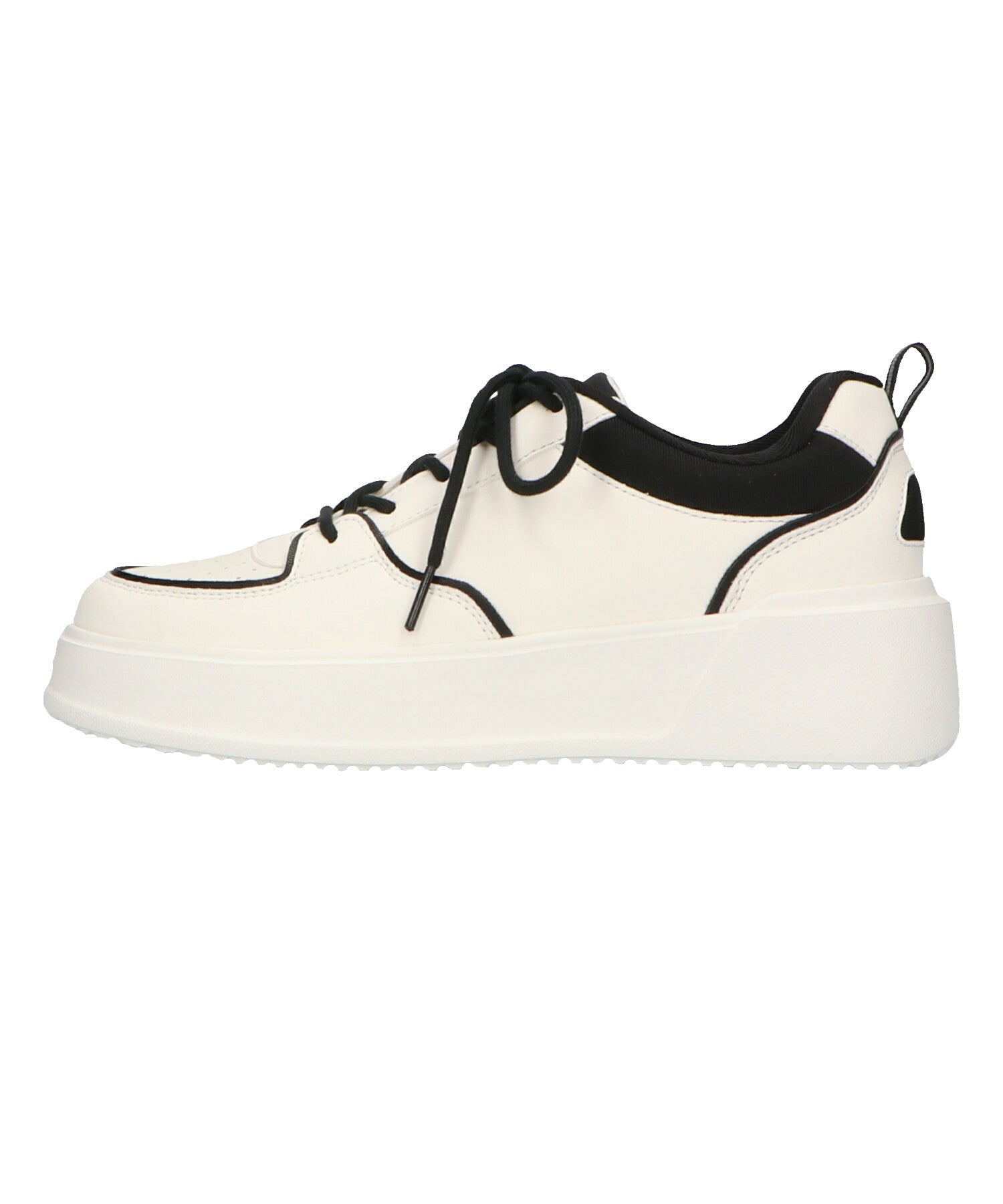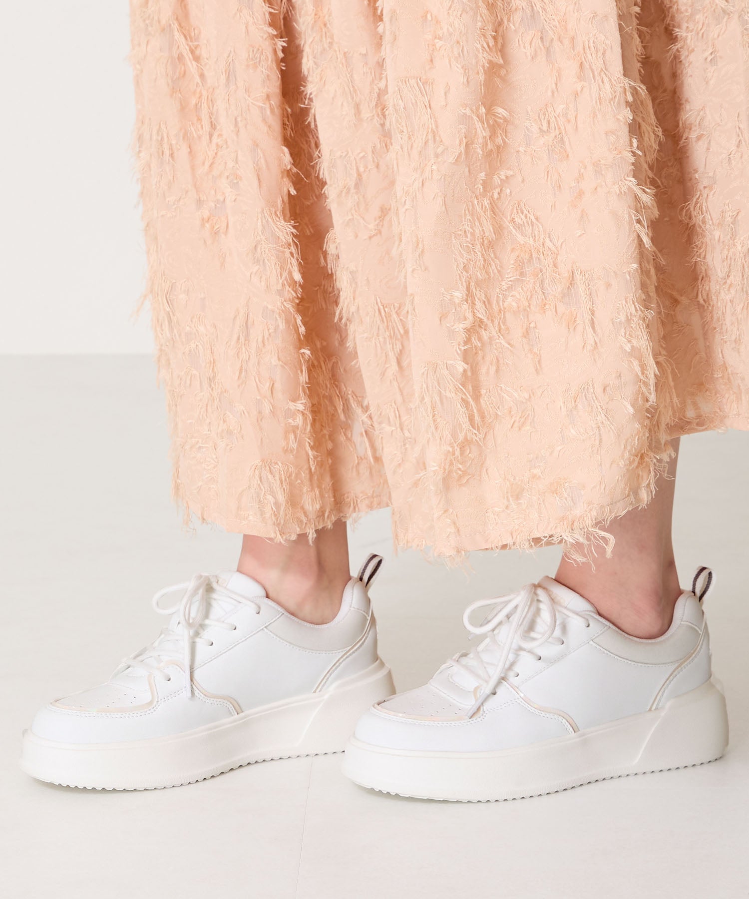 厚みのあるコートソールとパンチングデザインの組み合わせが今っぽいカジュアルなスニーカーは、厚底ながらもすっきりとしたソールで女性らしい柔らかい雰囲気を纏った仕上がりに。さりげないバイカラーのデザインが可愛いブラックとレッド、ワントーンでまとめることでコーデを選ばす履けるホワイト、新色のブラウンの豊富な選べる4色展開。