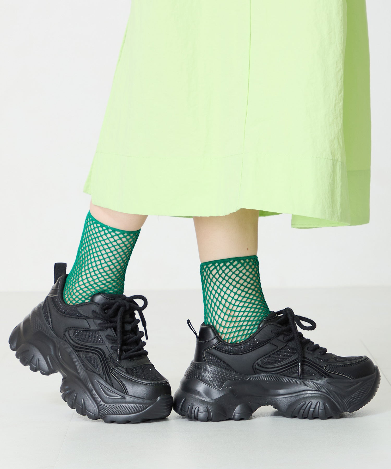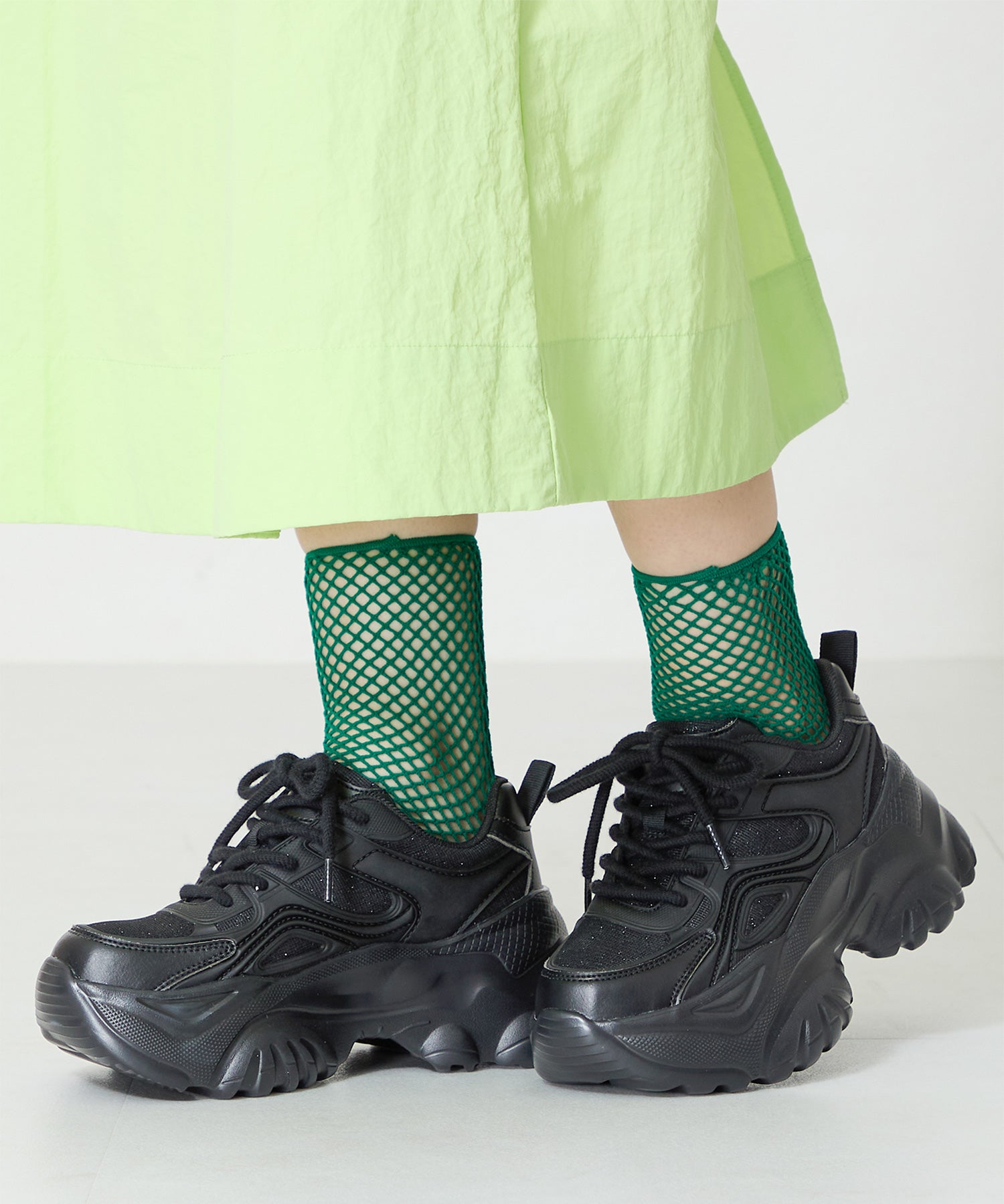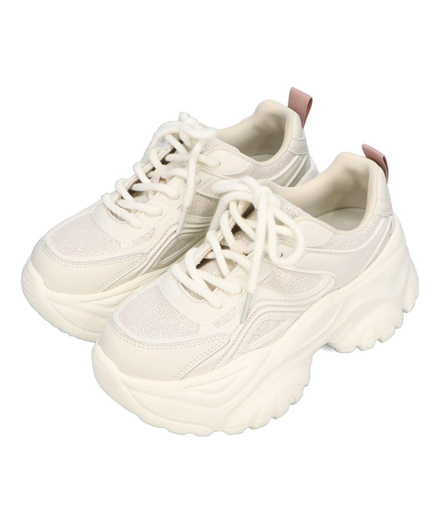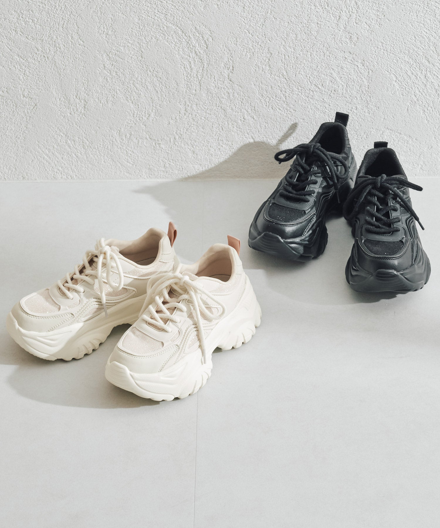 人気継続中のボリューム感たっぷりの厚底スニーカーは、細やかなラメを織り込んだアッパーデザインにすることで上品な印象に。スポーティーになりすぎない落ち着いたワントーンカラーなのでフェミニンコーデにも合わせやすく、スカートやワンピースはもちろん、ミニボトムと合わせて脚長効果が期待できるのも嬉しい。さりげない輝きが足元に軽やかさを与えてくれる。