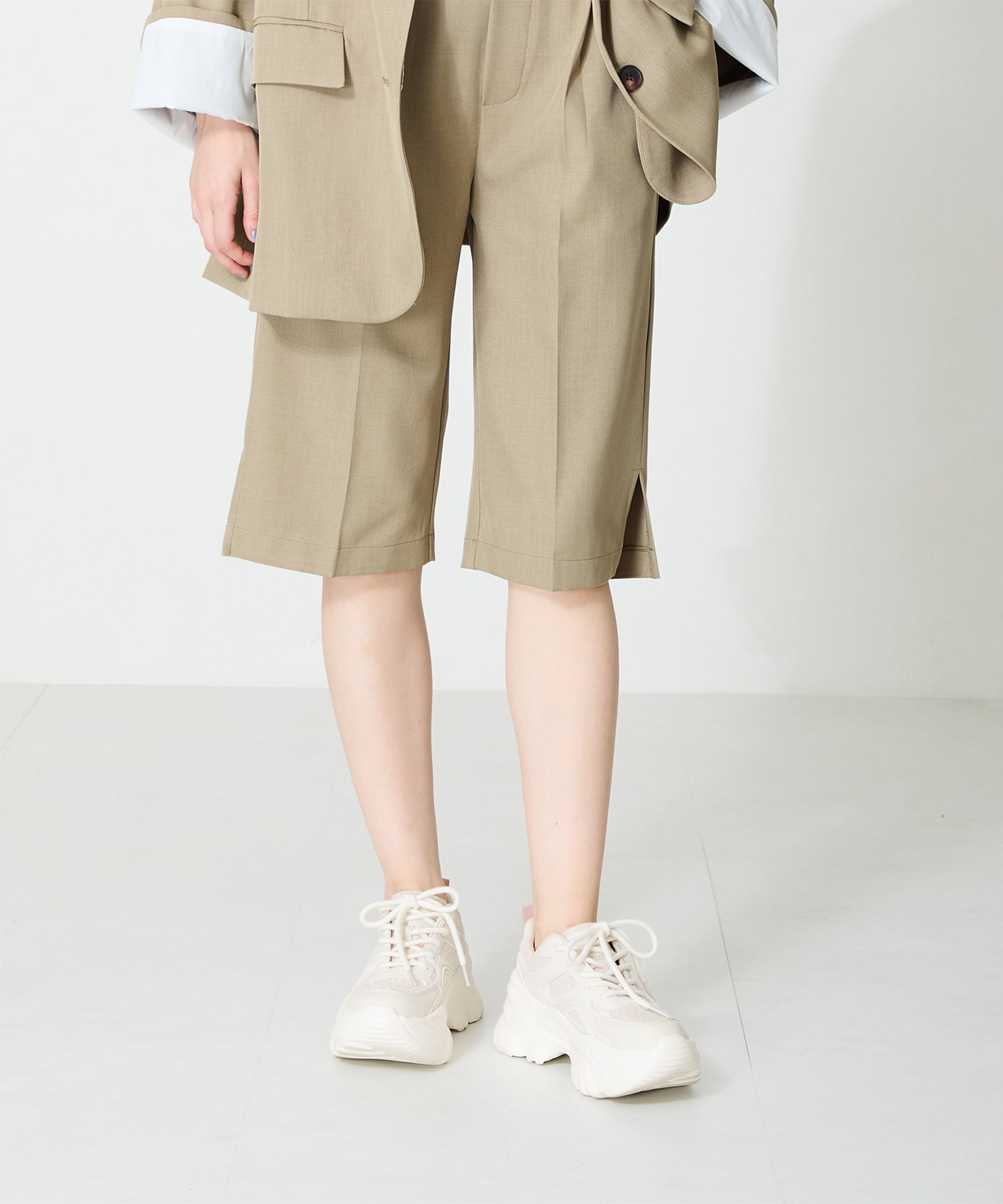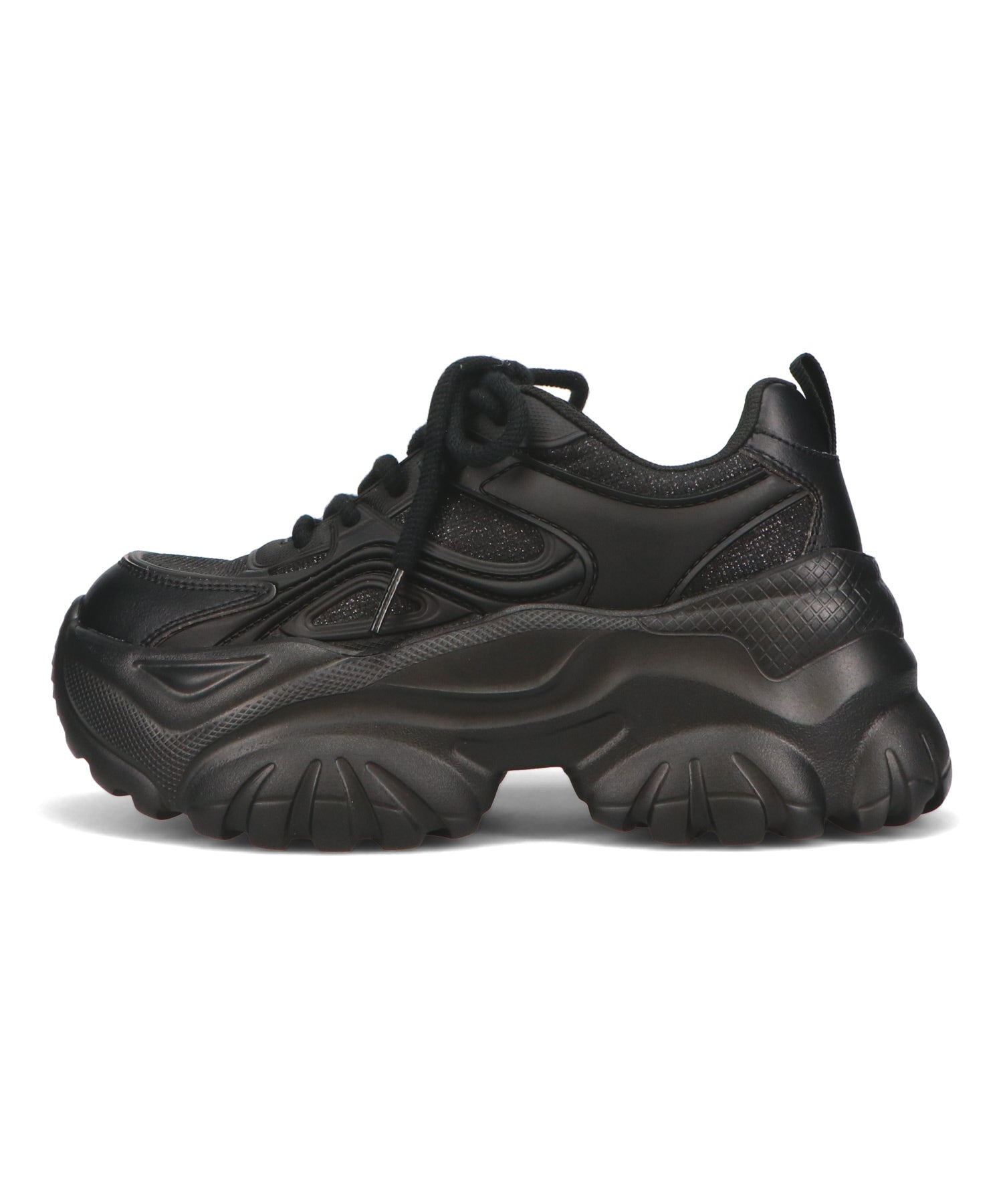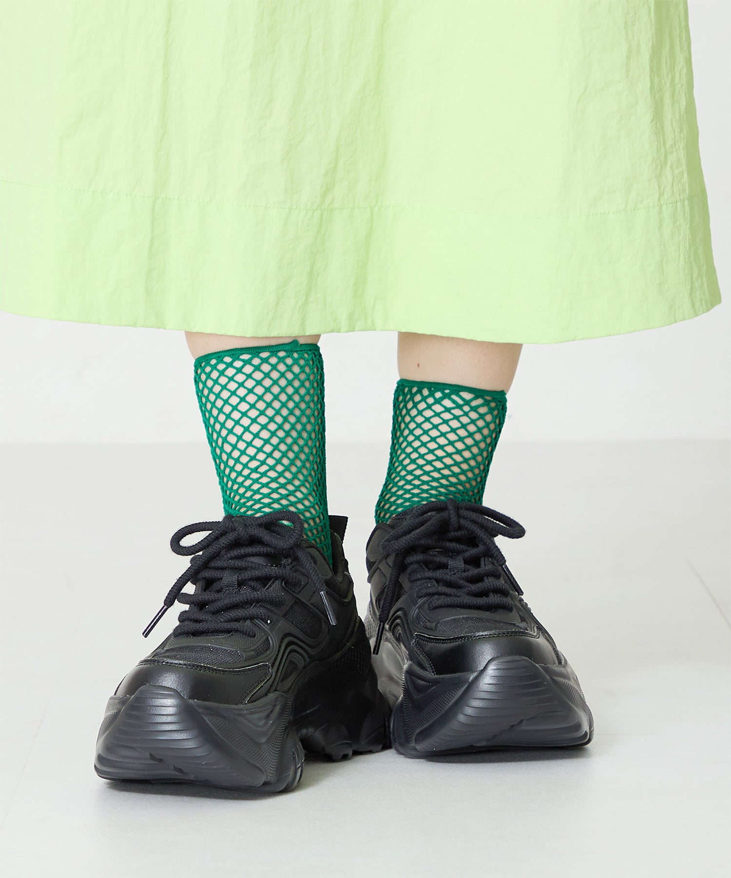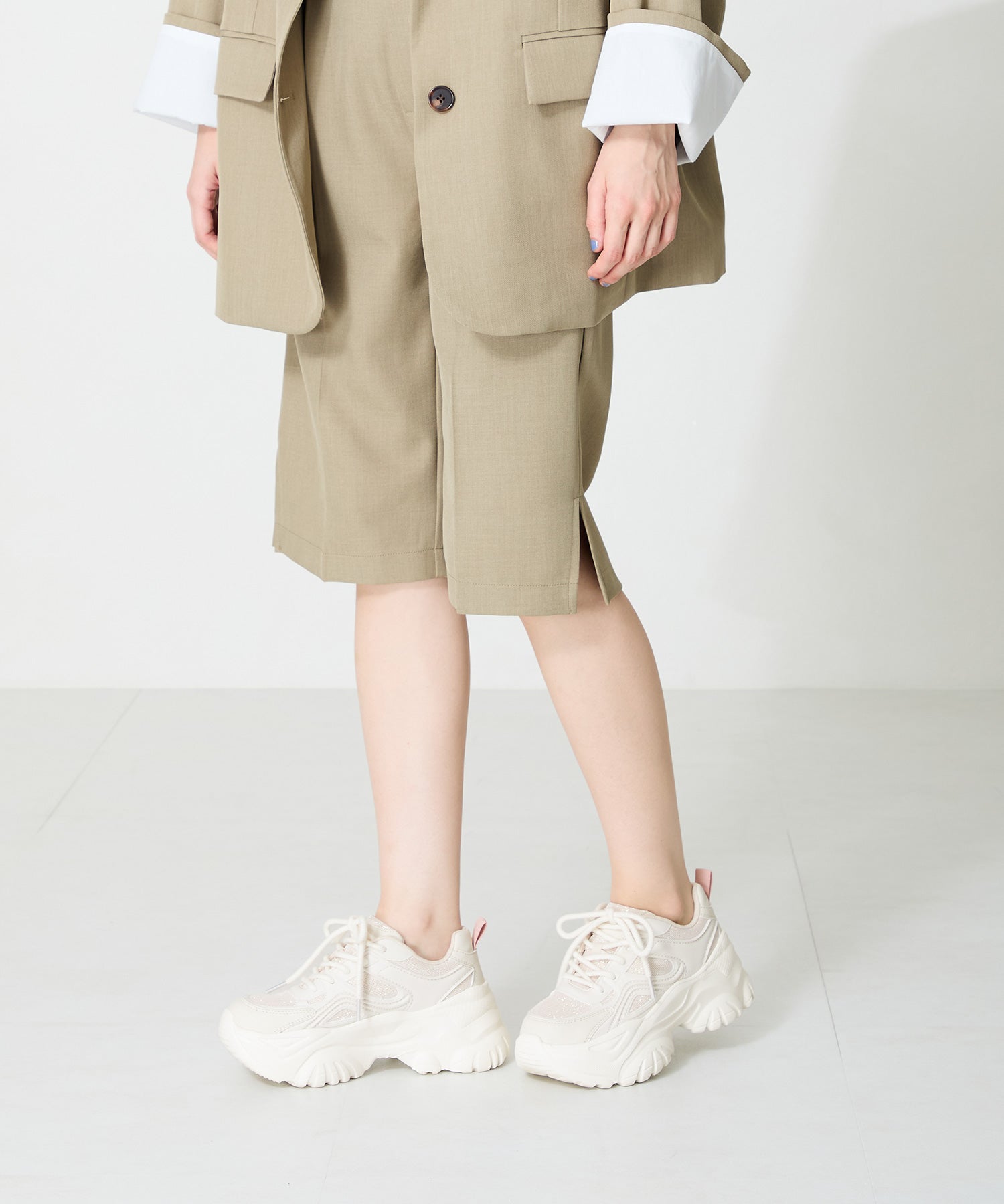 人気継続中のボリューム感たっぷりの厚底スニーカーは、細やかなラメを織り込んだアッパーデザインにすることで上品な印象に。スポーティーになりすぎない落ち着いたワントーンカラーなのでフェミニンコーデにも合わせやすく、スカートやワンピースはもちろん、ミニボトムと合わせて脚長効果が期待できるのも嬉しい。さりげない輝きが足元に軽やかさを与えてくれる。
