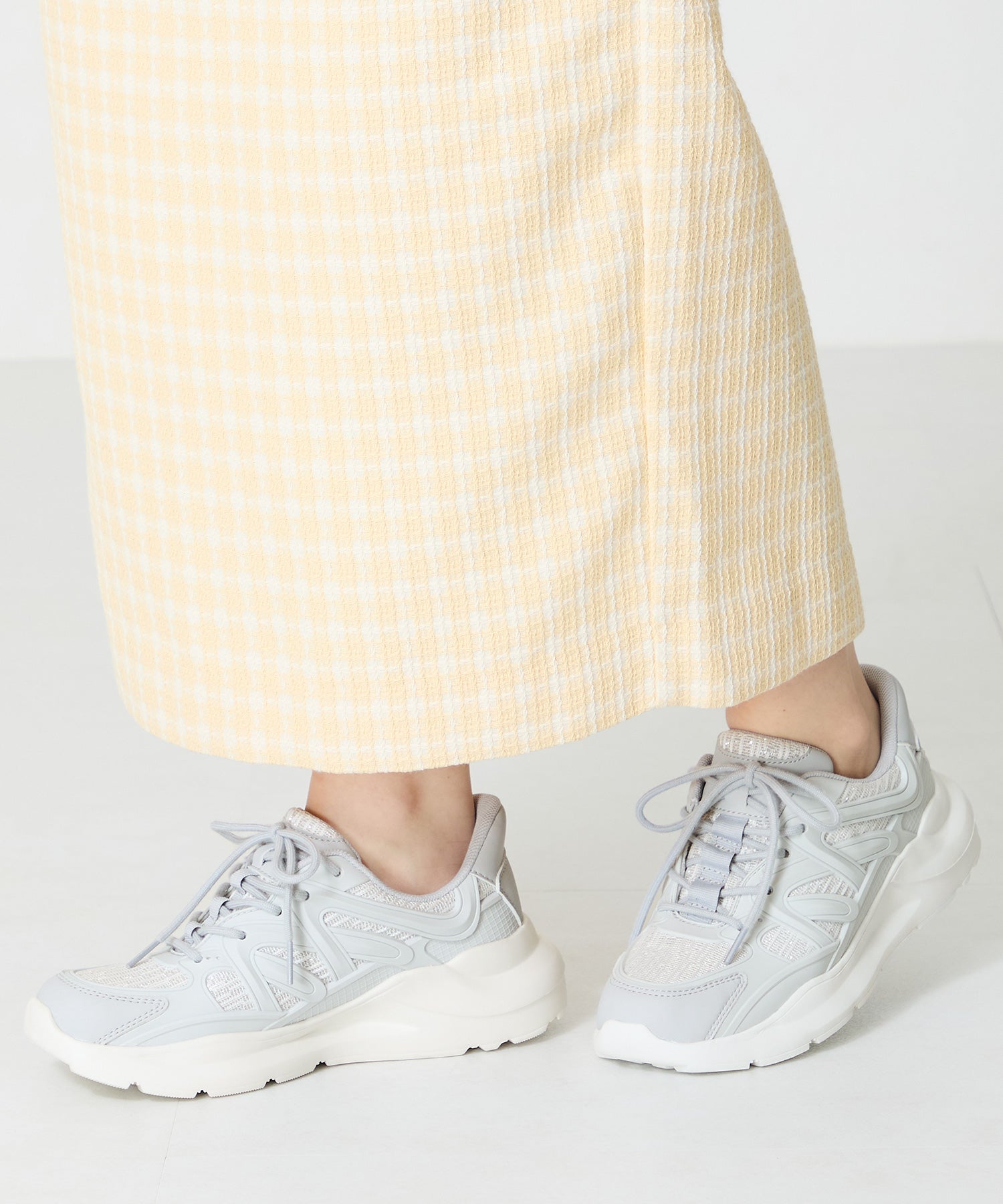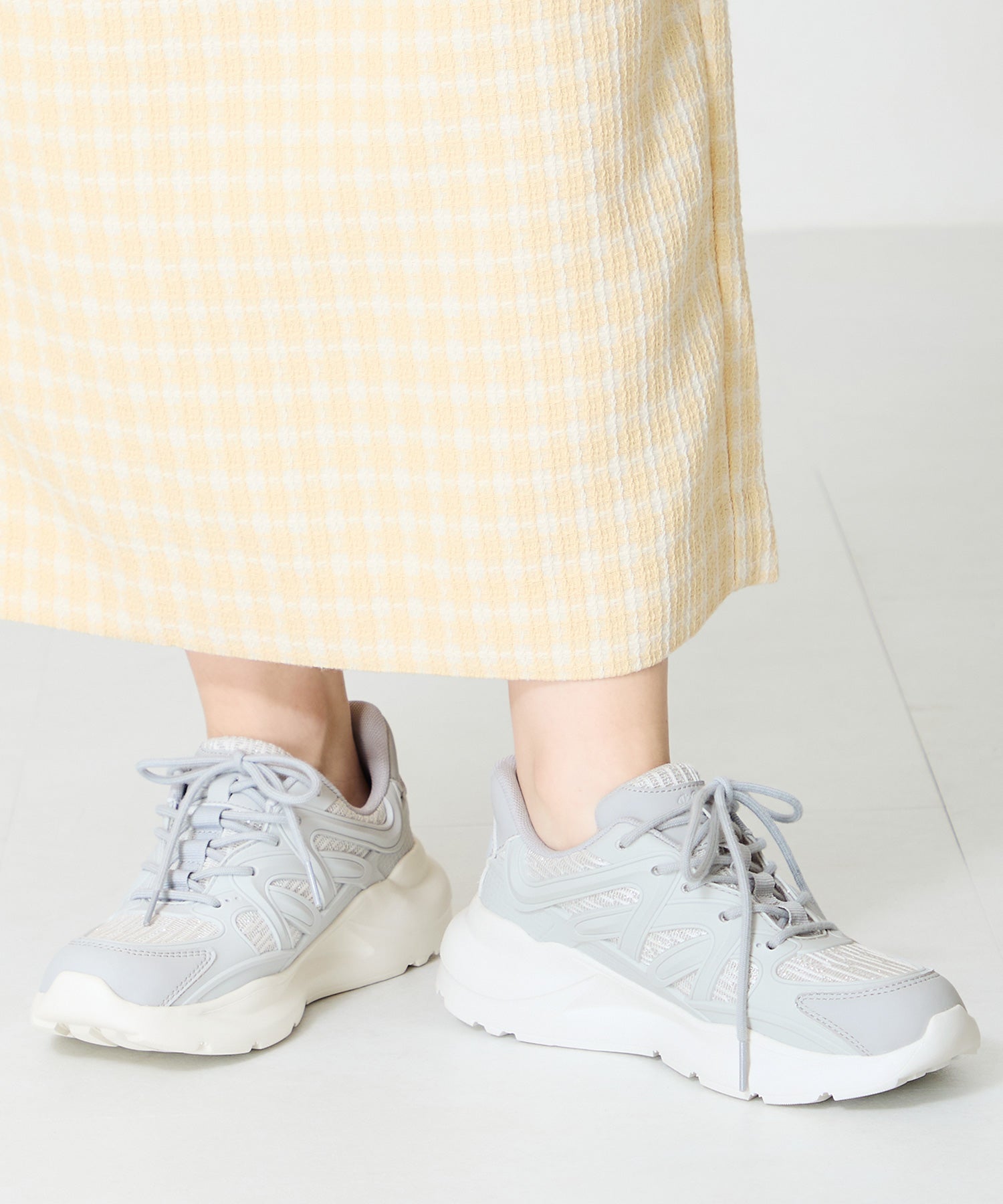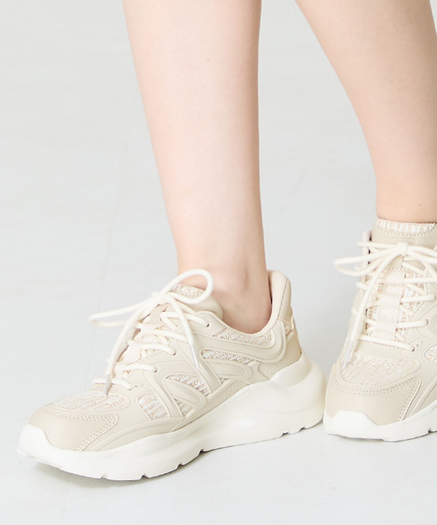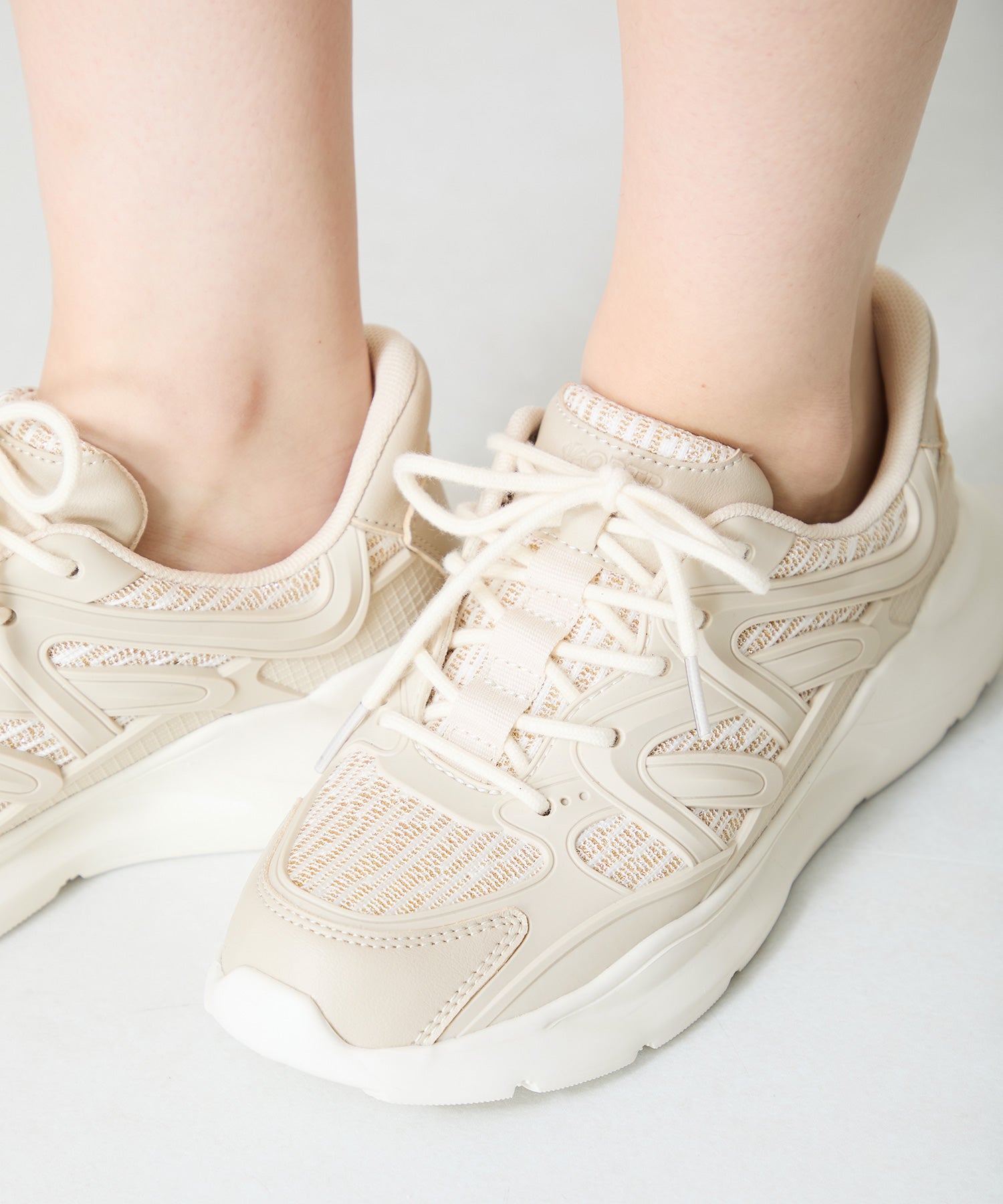 アッパーに施したラメを纏ったレースが大人可愛い足元を演出してくれるスニーカーが登場。ラバーパーツが程良いアクセントで、ボリュームを抑えたすっきりとしたシルエットと、柔らかなワントーンカラーでまとめたデザインがスポーティーすぎないので甘めのフェミニンコーデにぴったり。季節問わず使えて重たくなりすぎないデザインが重宝する1足。