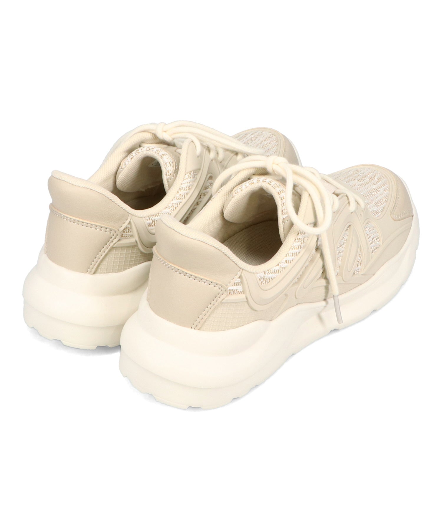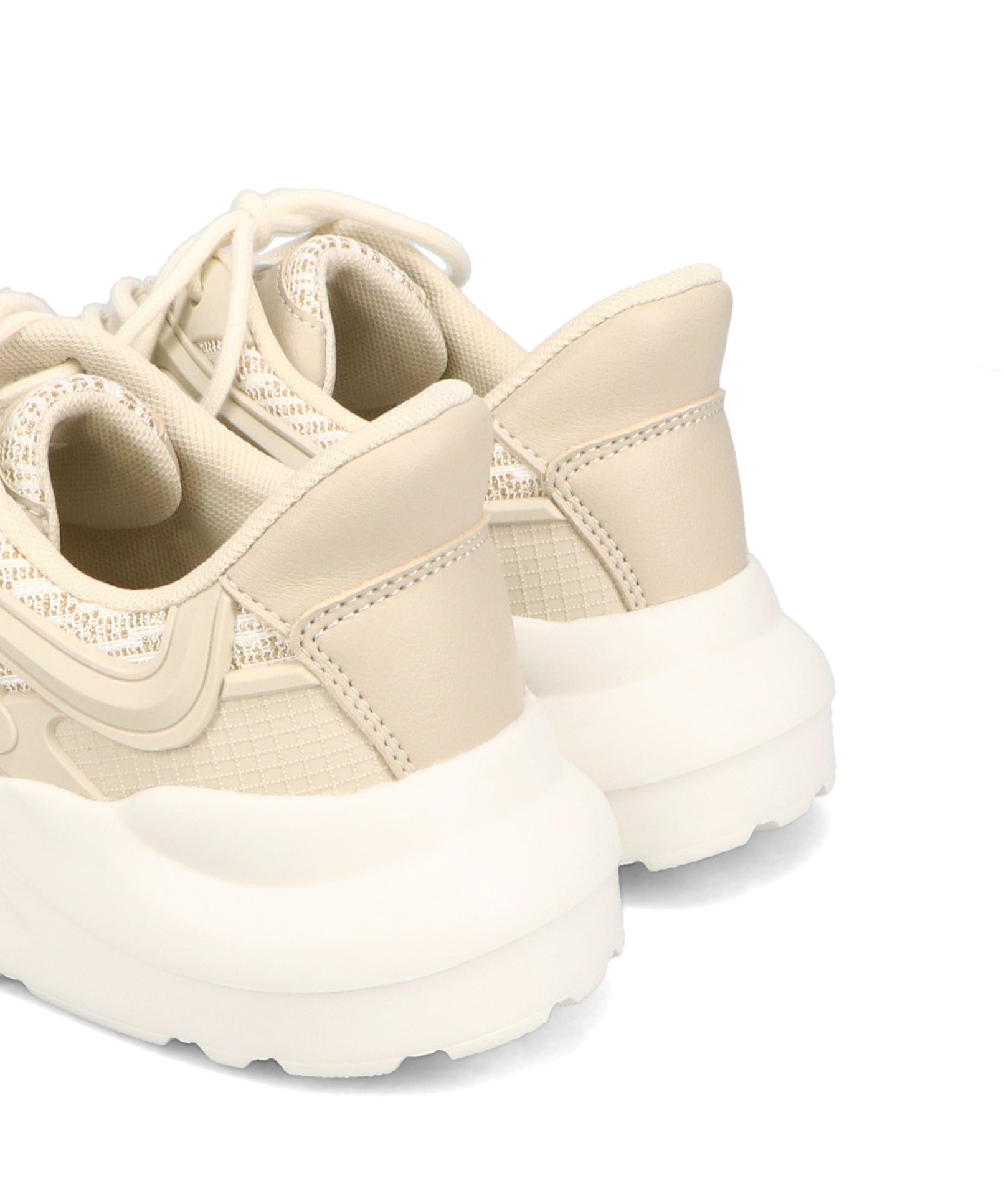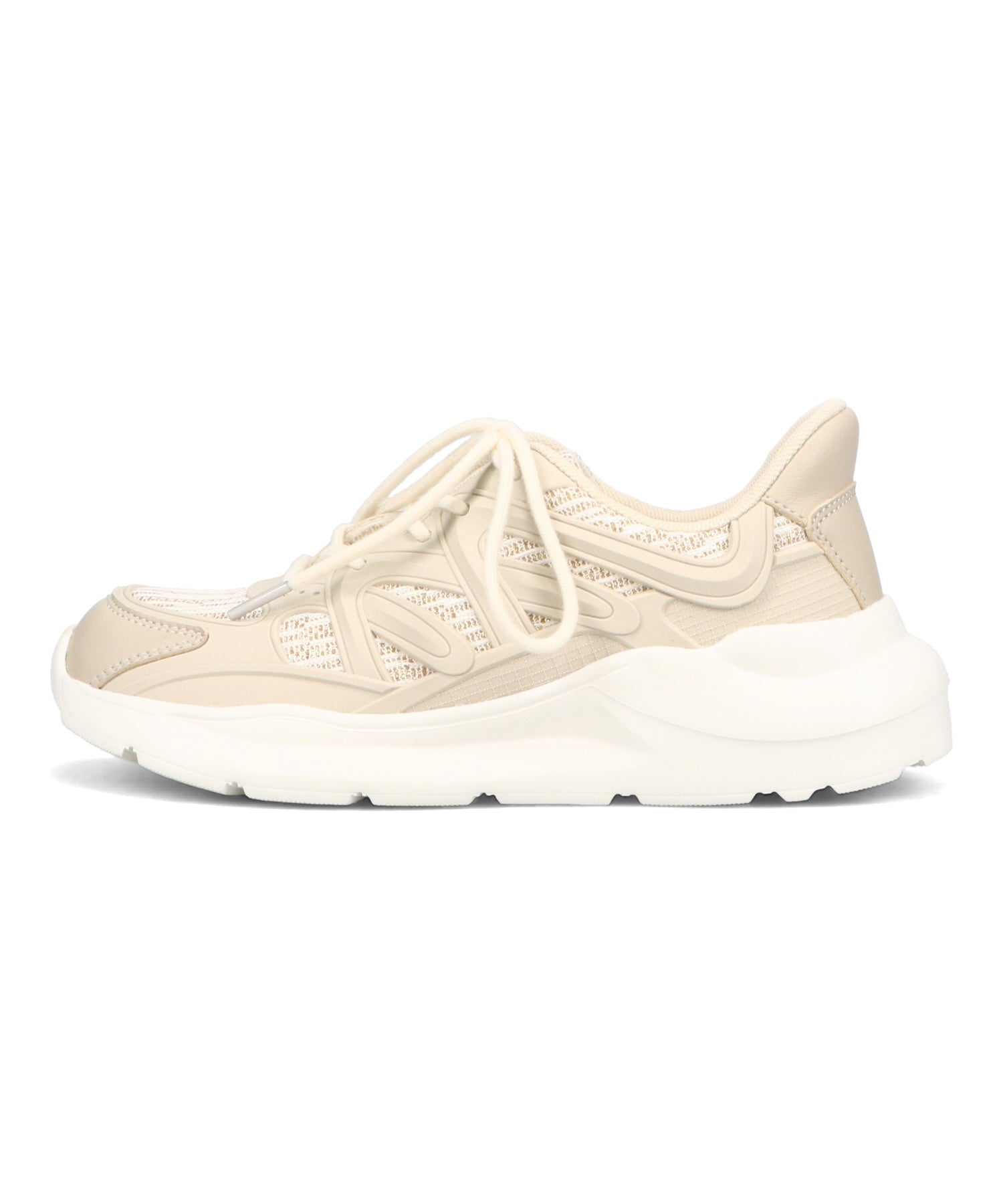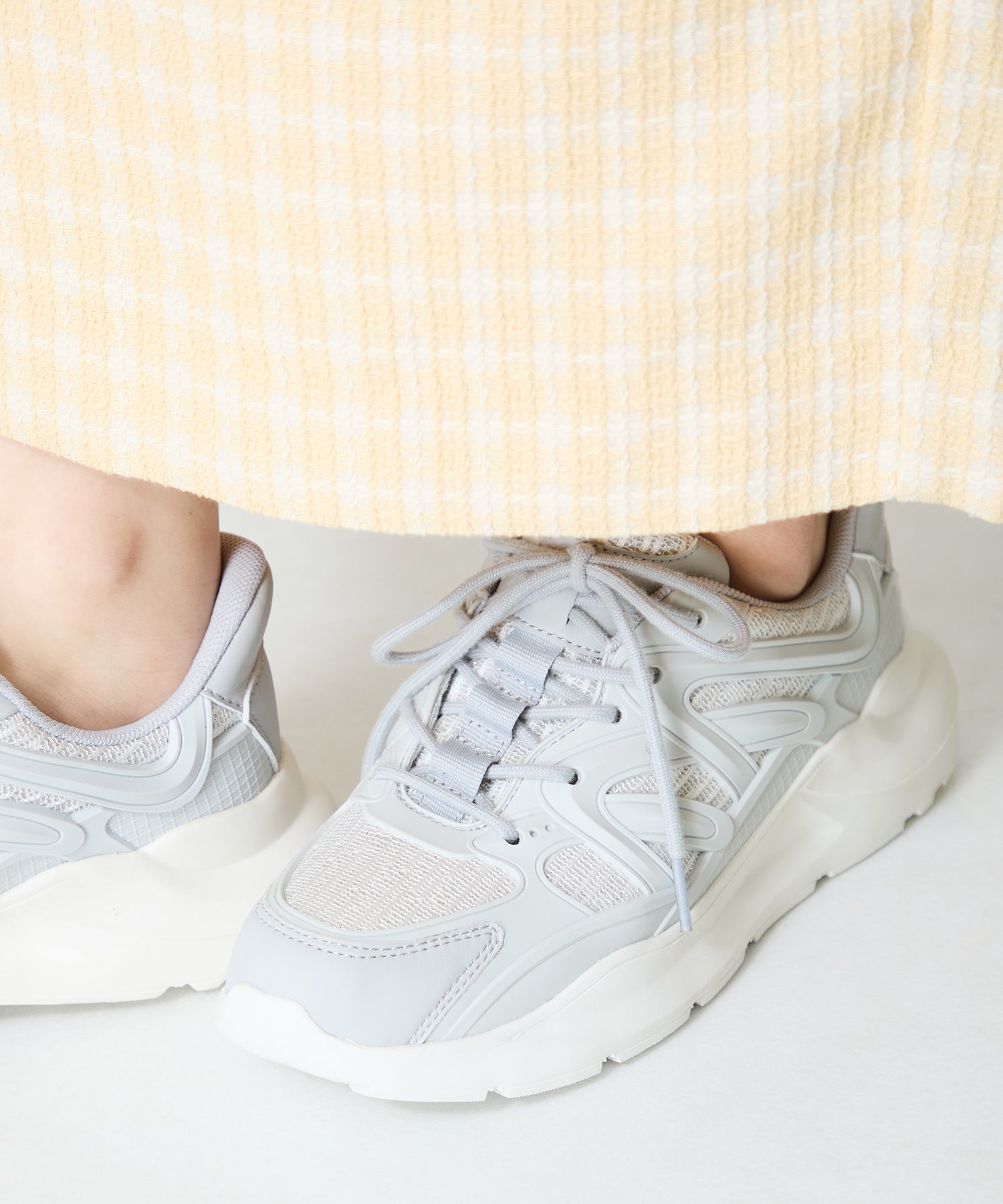 アッパーに施したラメを纏ったレースが大人可愛い足元を演出してくれるスニーカーが登場。ラバーパーツが程良いアクセントで、ボリュームを抑えたすっきりとしたシルエットと、柔らかなワントーンカラーでまとめたデザインがスポーティーすぎないので甘めのフェミニンコーデにぴったり。季節問わず使えて重たくなりすぎないデザインが重宝する1足。