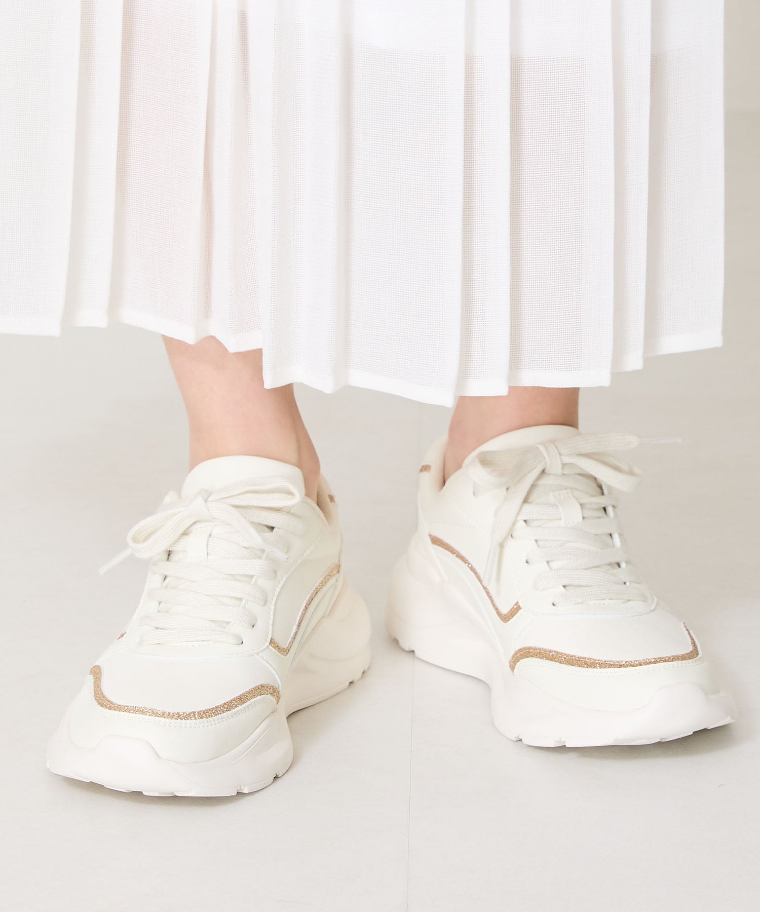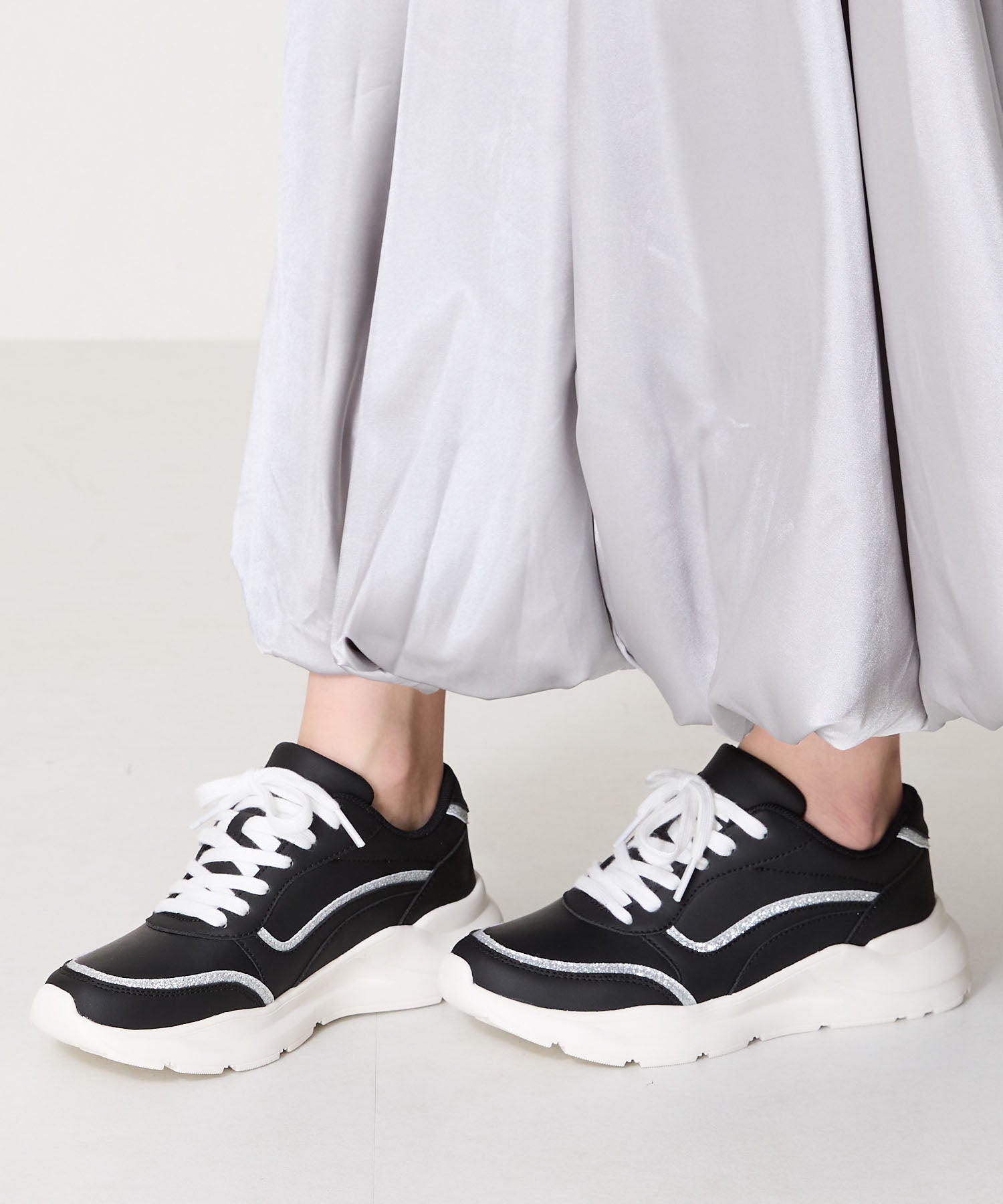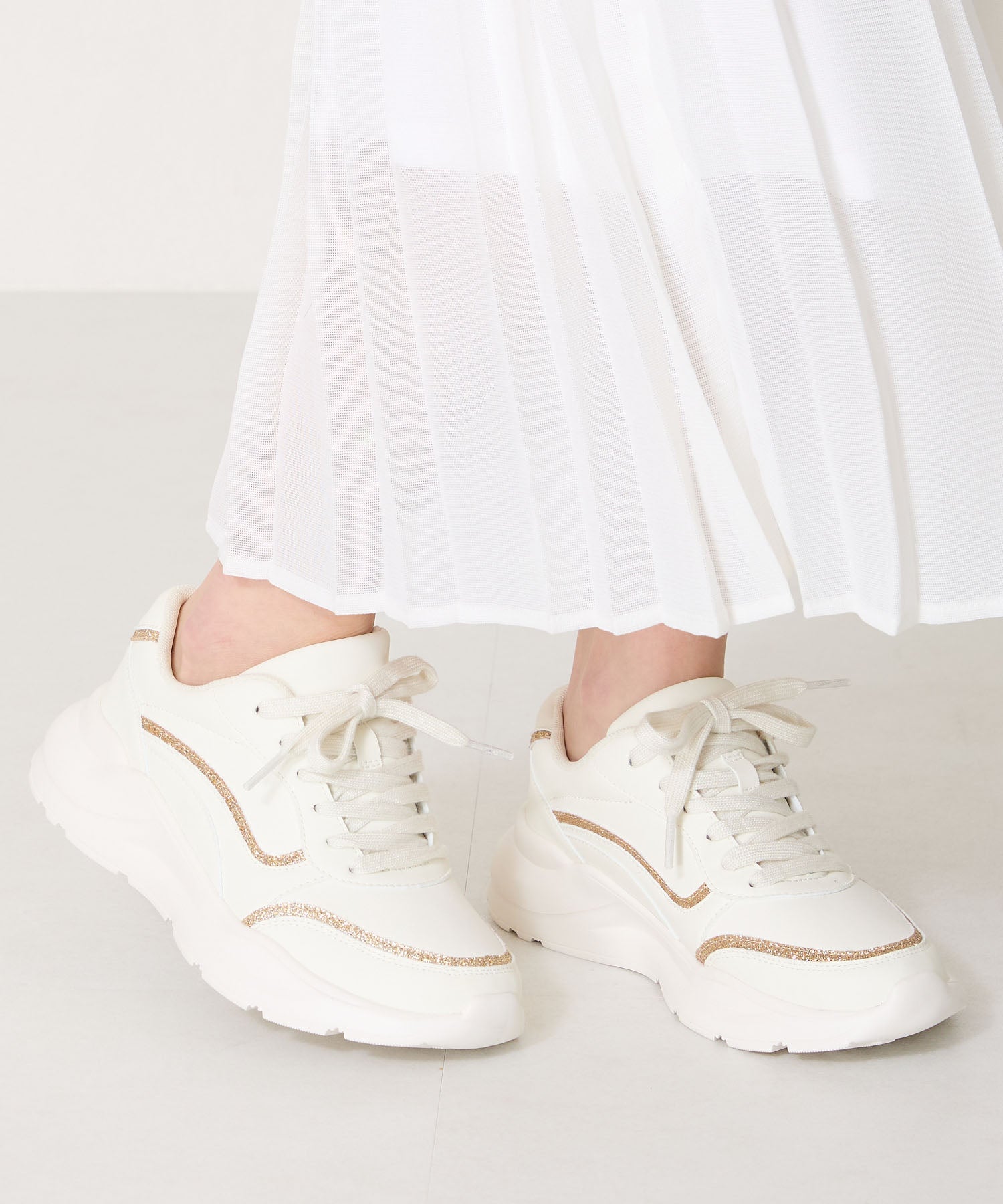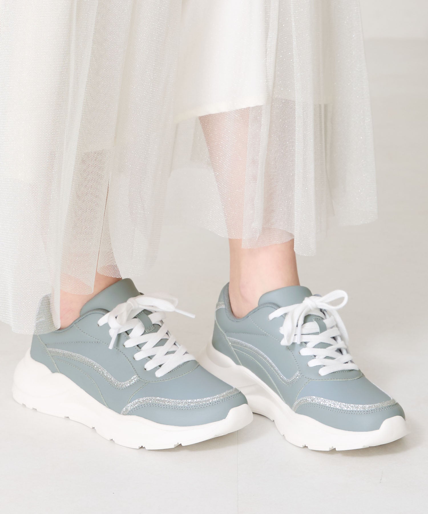 アッパーにグリッターのラインを施すことで足元を華やかにしてくれるスニーカーは、程よい厚底ソールを選んでフェミニン派の方でも取り入れやすい1足に。シンプルな切り替えデザインにすることでグリッターを引き立たせつつも派手になりすぎず、いつものコーデに馴染みやすいのも嬉しいポイント。ワンピースやスカートなどに合わせてとことん甘めなスタイルを楽しんで。
