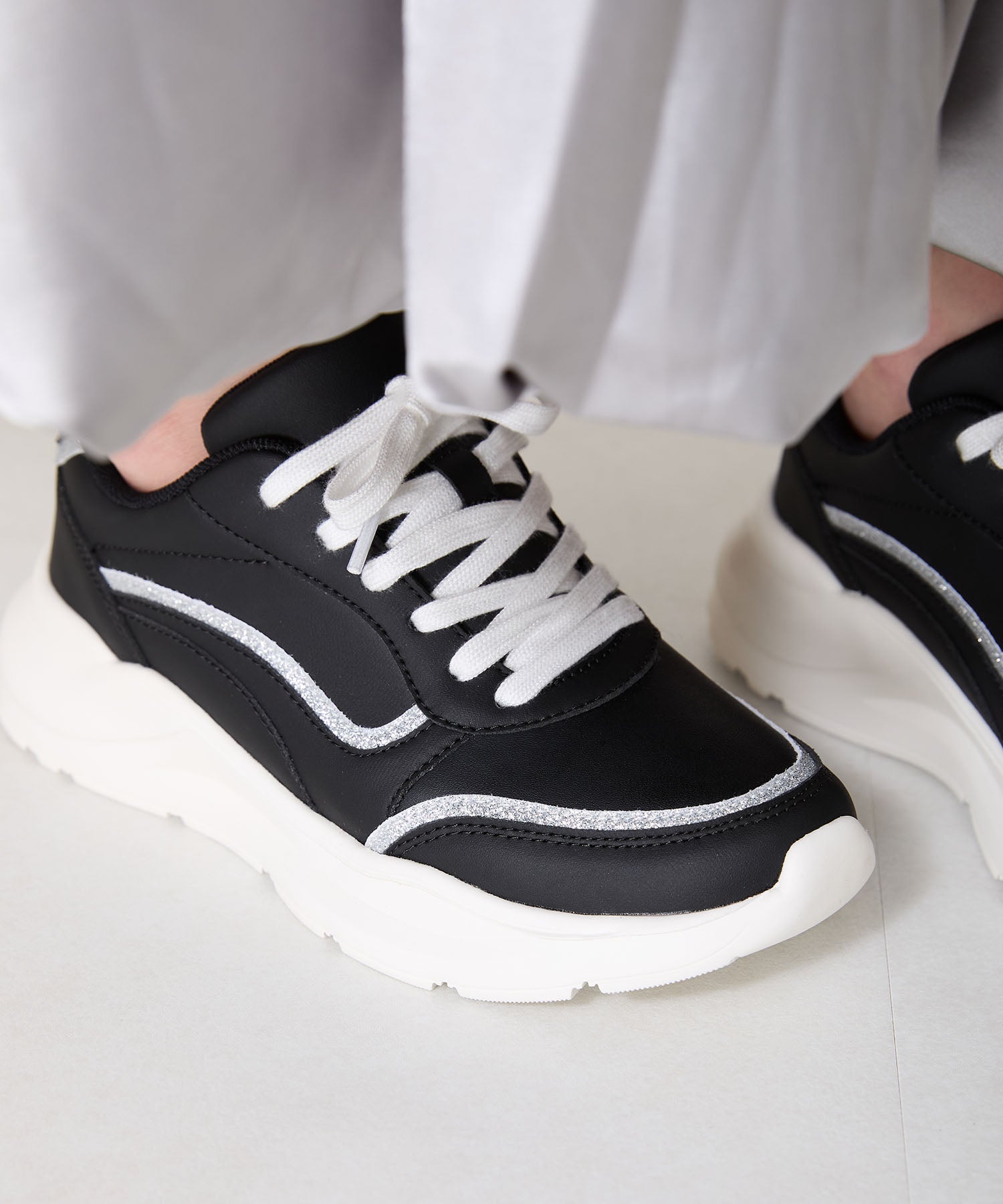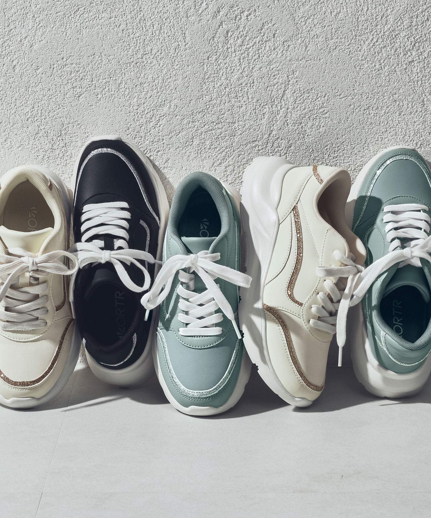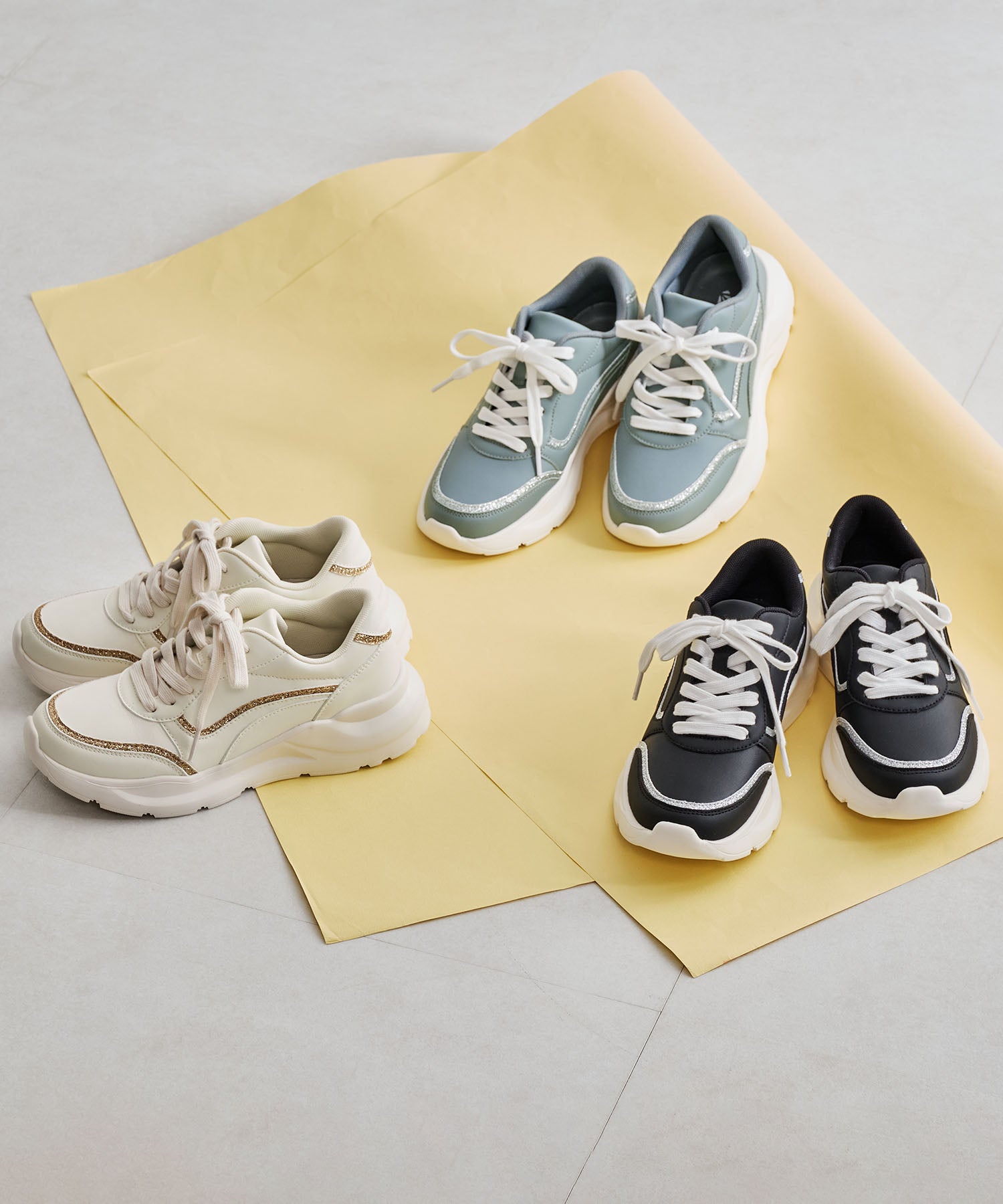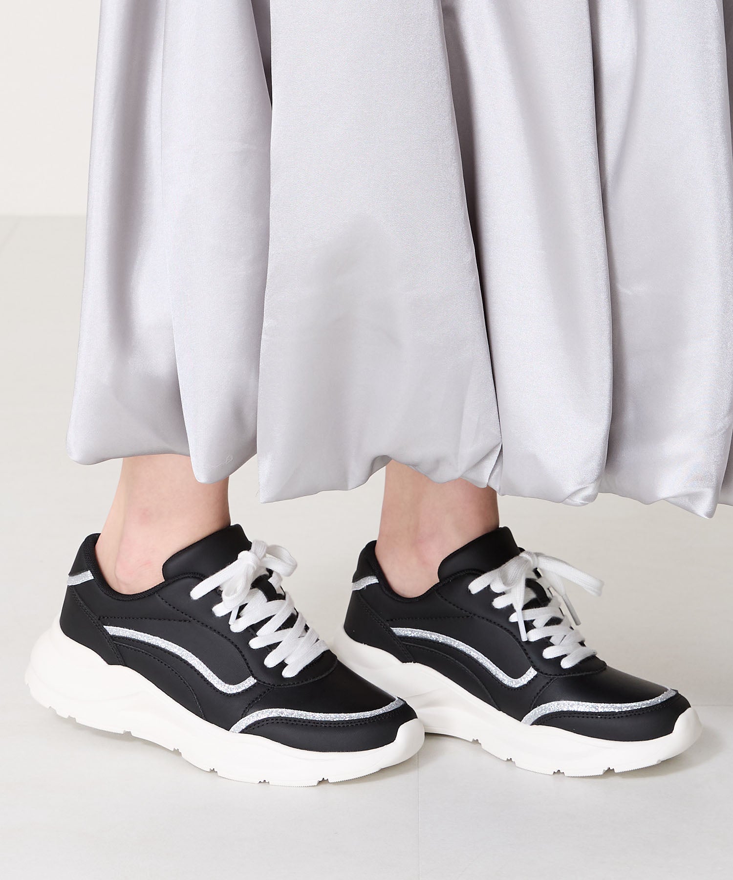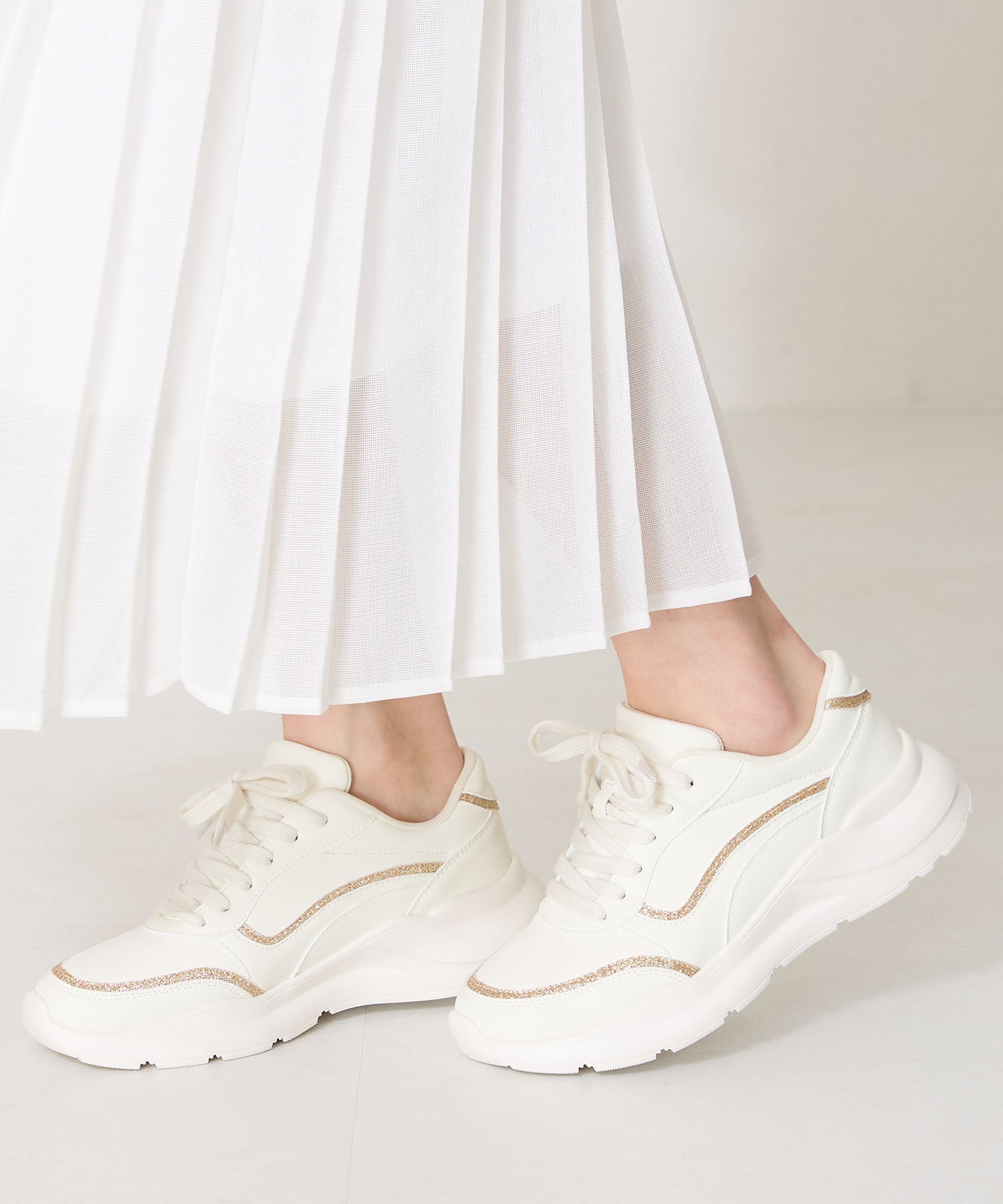 アッパーにグリッターのラインを施すことで足元を華やかにしてくれるスニーカーは、程よい厚底ソールを選んでフェミニン派の方でも取り入れやすい1足に。シンプルな切り替えデザインにすることでグリッターを引き立たせつつも派手になりすぎず、いつものコーデに馴染みやすいのも嬉しいポイント。ワンピースやスカートなどに合わせてとことん甘めなスタイルを楽しんで。