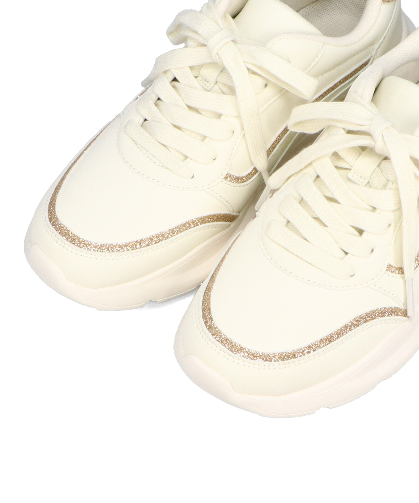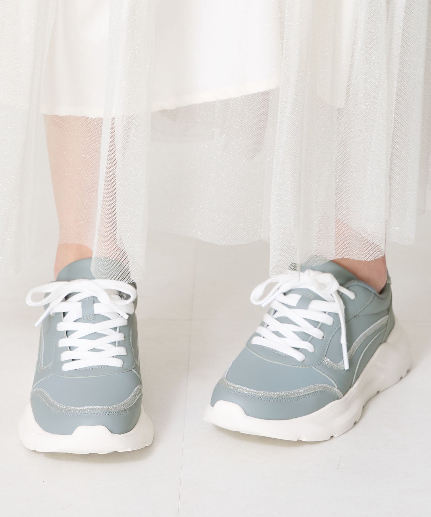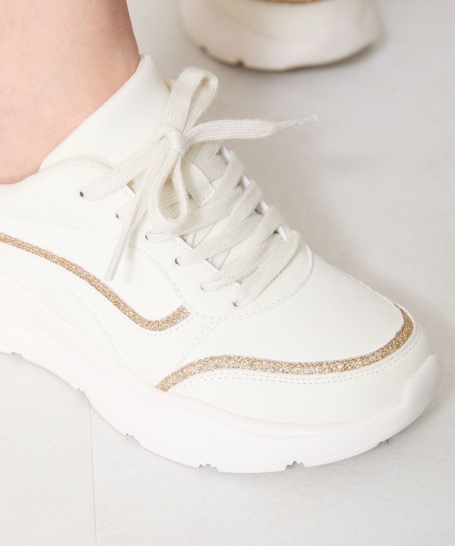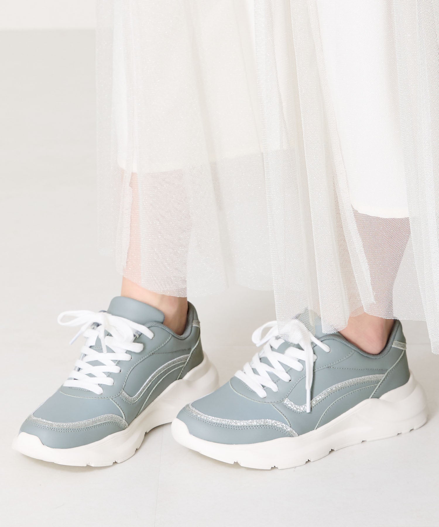 アッパーにグリッターのラインを施すことで足元を華やかにしてくれるスニーカーは、程よい厚底ソールを選んでフェミニン派の方でも取り入れやすい1足に。シンプルな切り替えデザインにすることでグリッターを引き立たせつつも派手になりすぎず、いつものコーデに馴染みやすいのも嬉しいポイント。ワンピースやスカートなどに合わせてとことん甘めなスタイルを楽しんで。