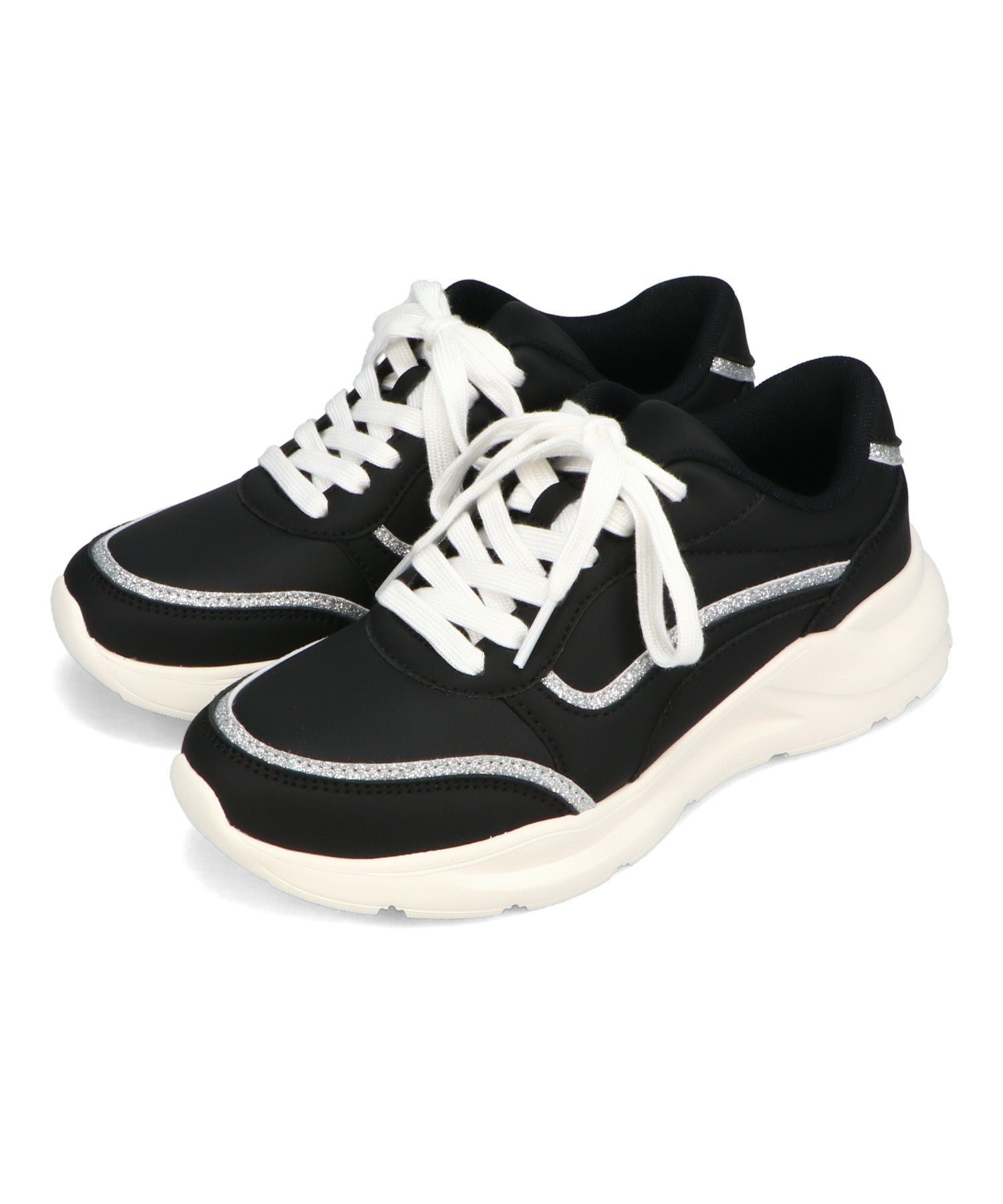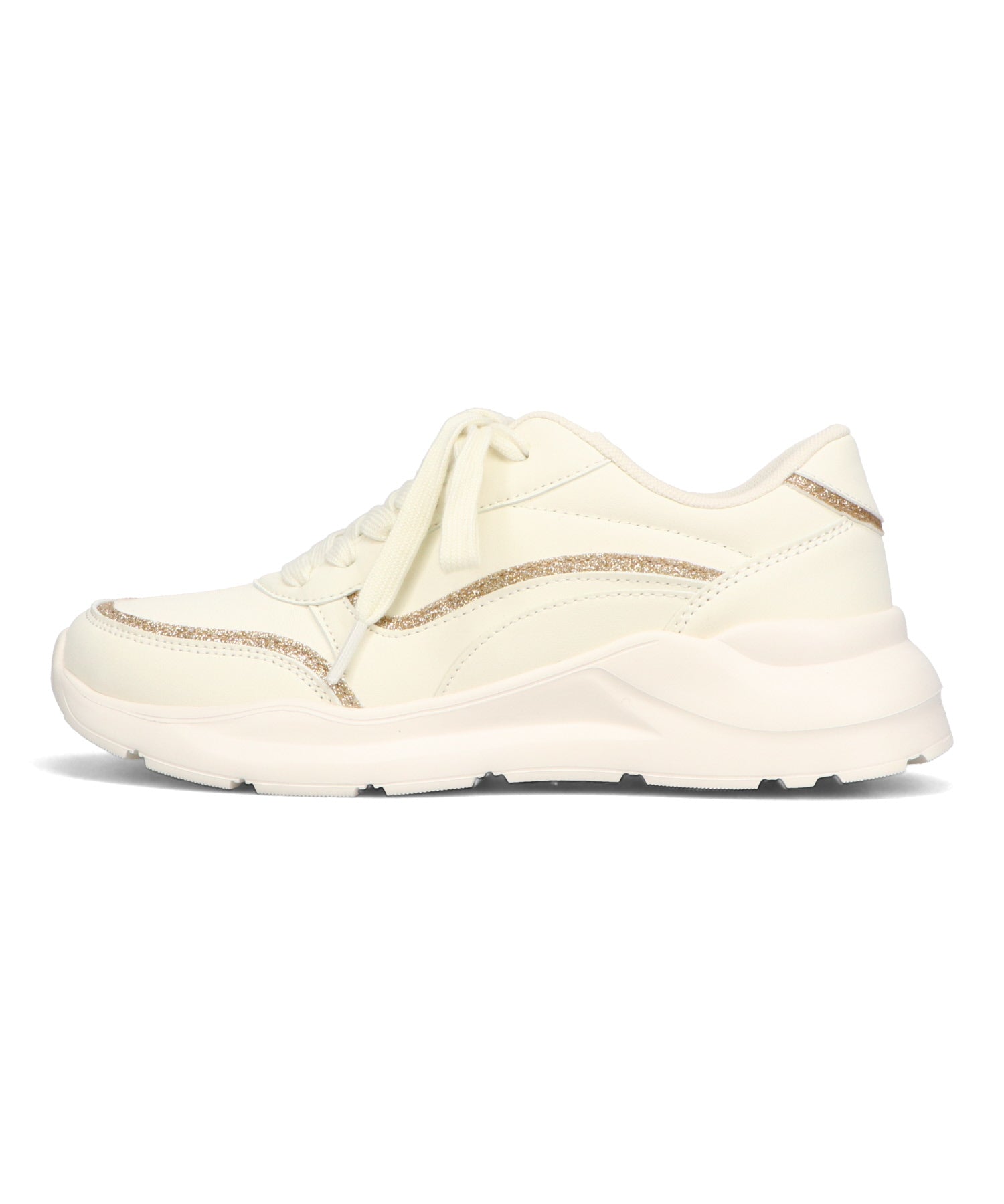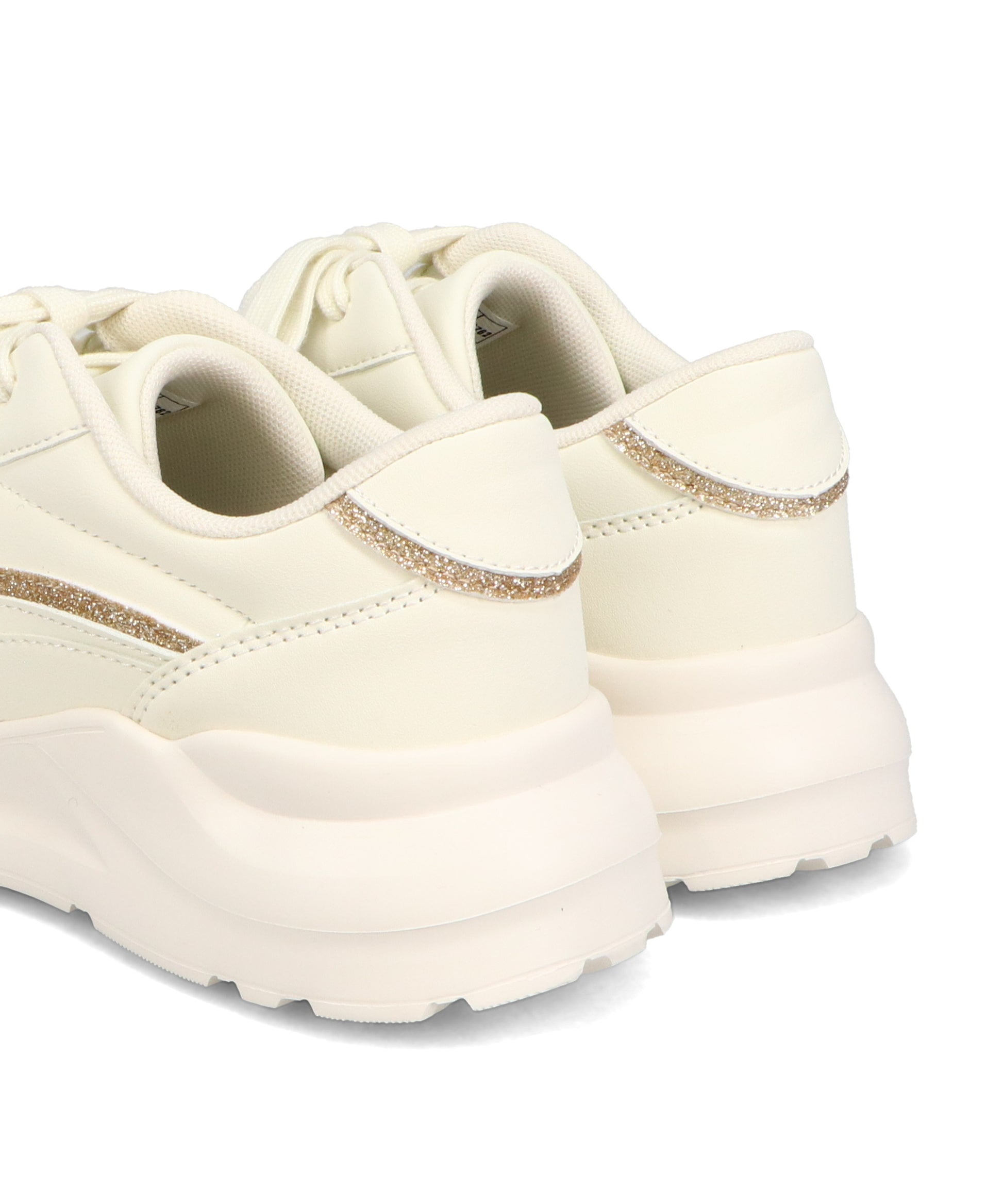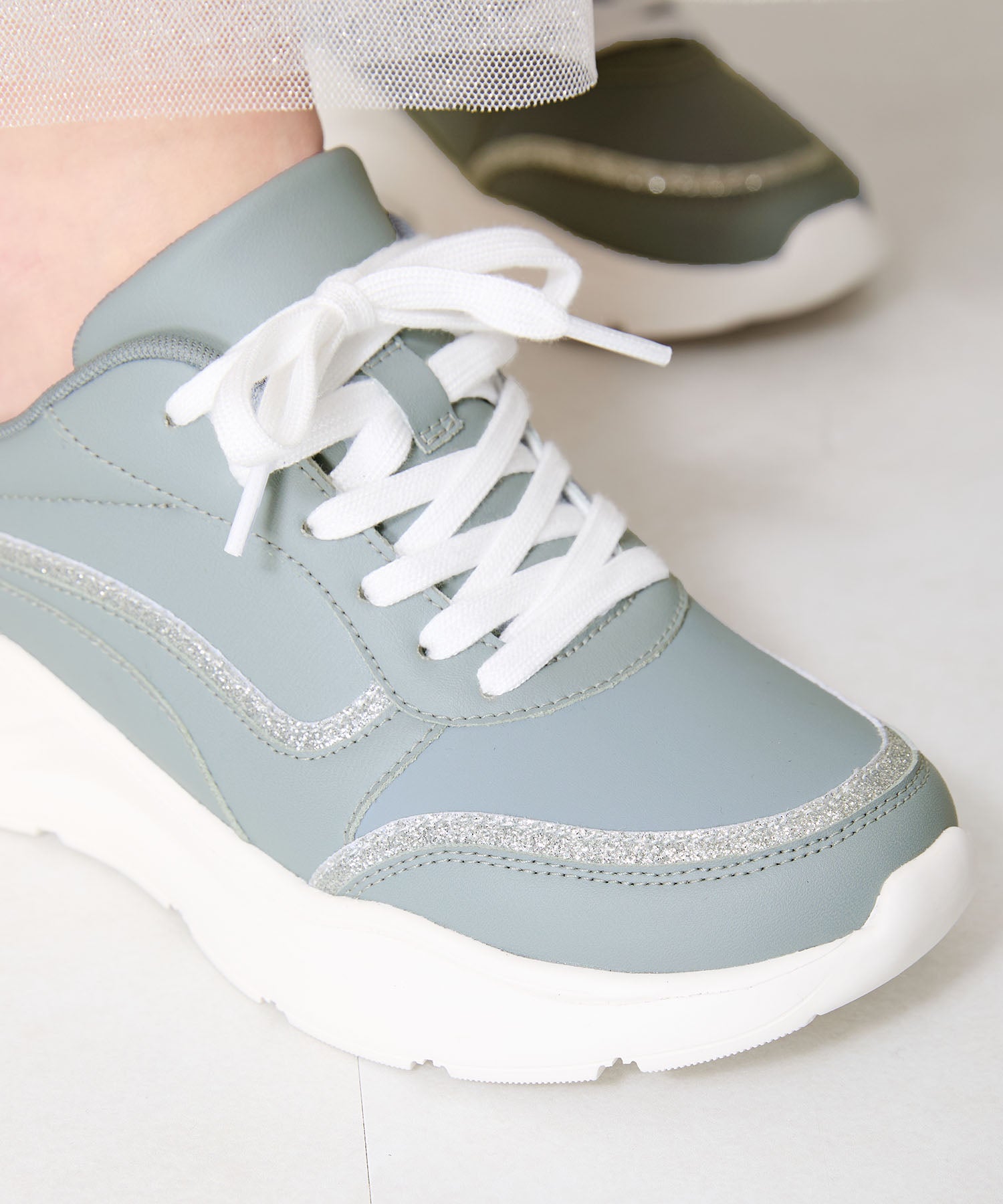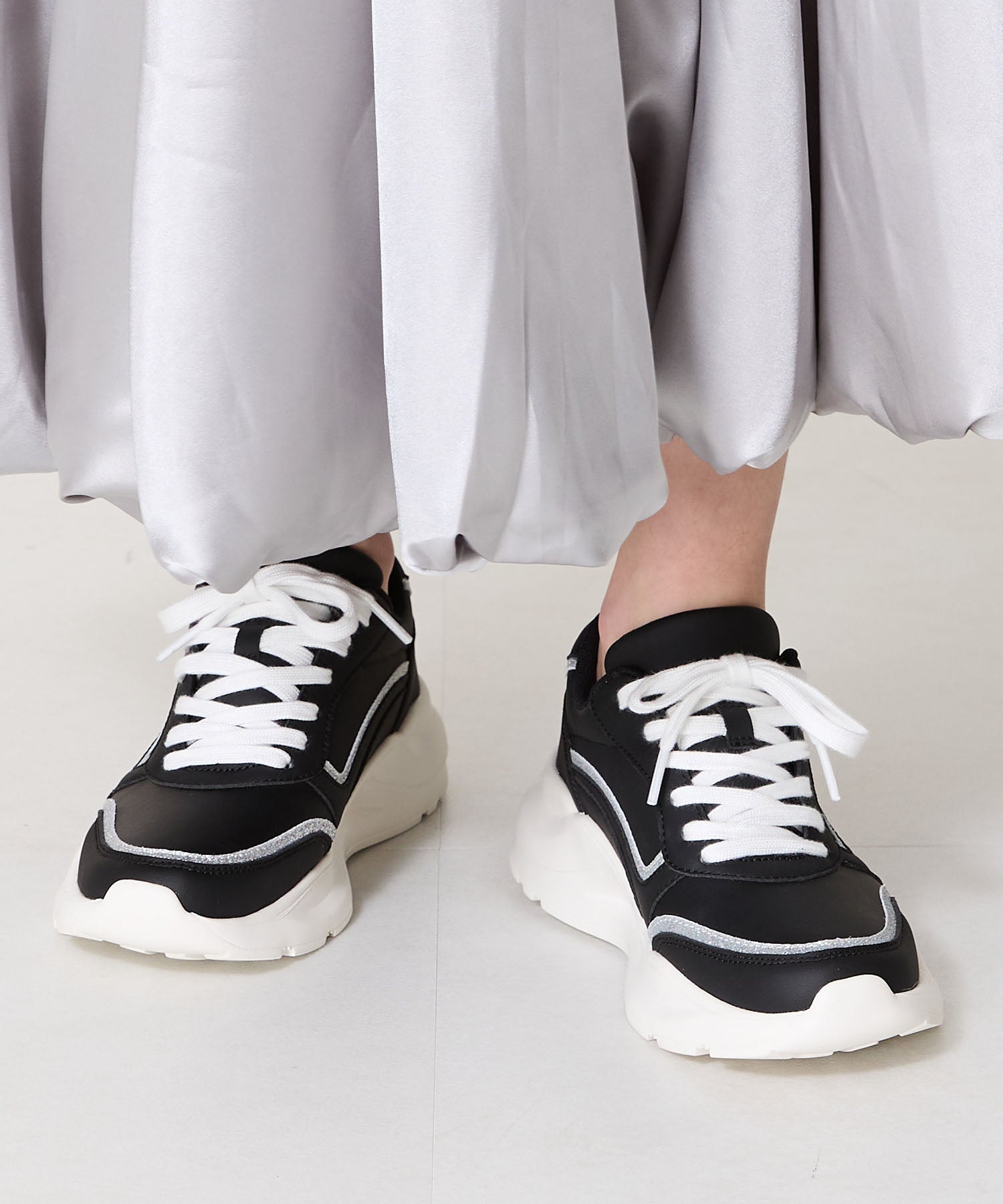 アッパーにグリッターのラインを施すことで足元を華やかにしてくれるスニーカーは、程よい厚底ソールを選んでフェミニン派の方でも取り入れやすい1足に。シンプルな切り替えデザインにすることでグリッターを引き立たせつつも派手になりすぎず、いつものコーデに馴染みやすいのも嬉しいポイント。ワンピースやスカートなどに合わせてとことん甘めなスタイルを楽しんで。
