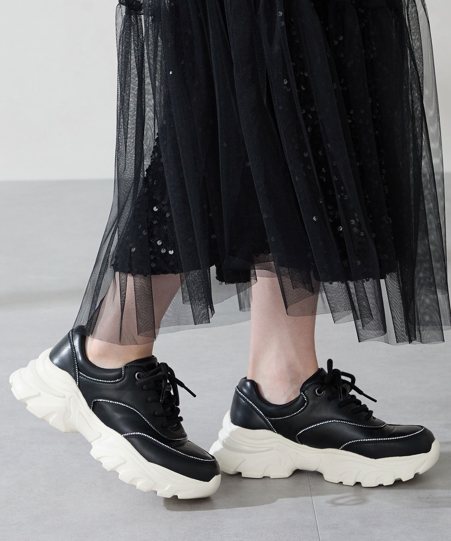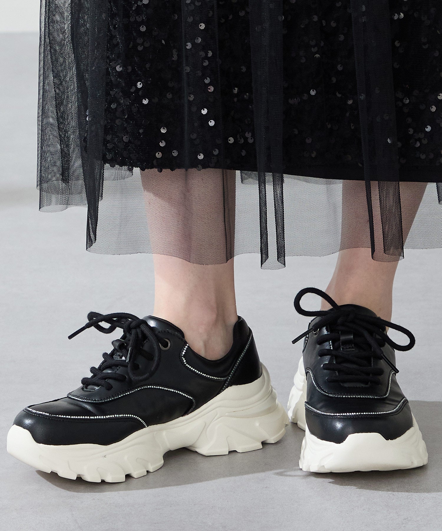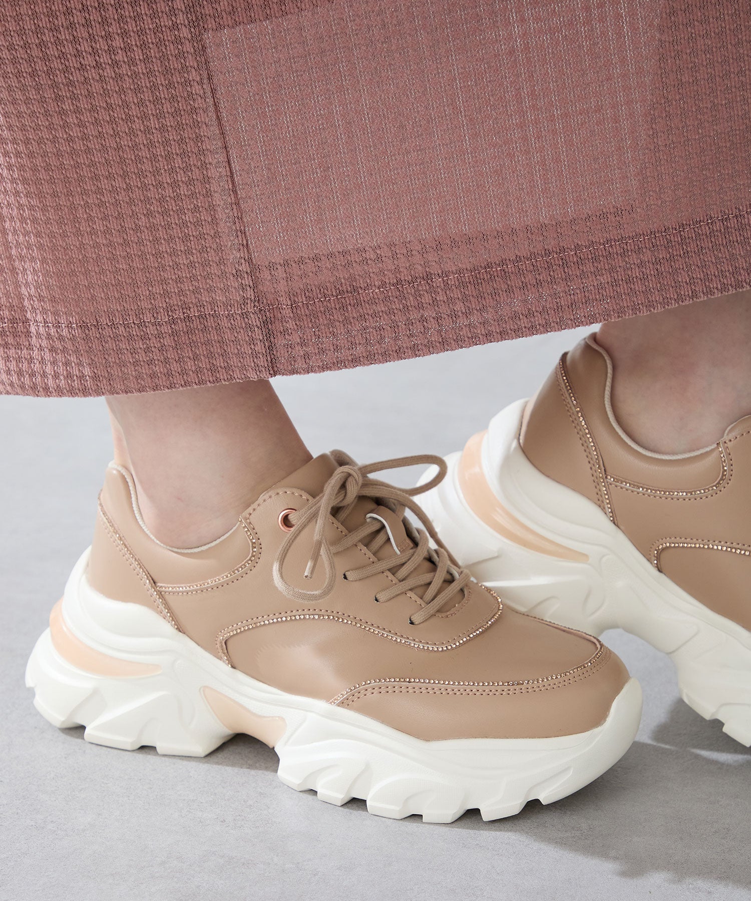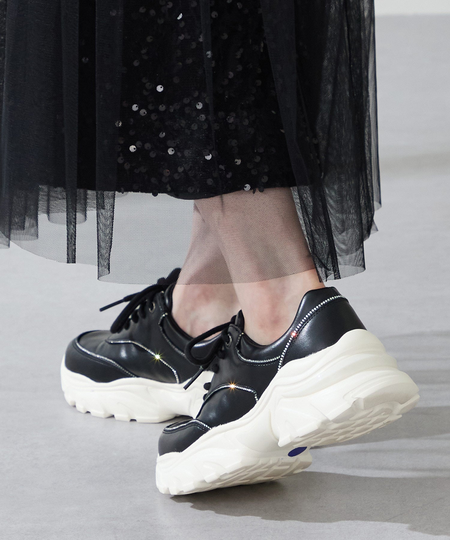 ワントーンのカラーリングの上にキラリと輝くラインストーンが目を引く、大人の華やかさを纏った1足。あえて凹凸感のある厚底ソールを組み合わせることでカジュアルダウンさせているのでフェミニンなコーデはもちろん、デニムなどパンツスタイルとも相性抜群。ラインストーンが際立つブラックと、ヌーディーなカラーがレディライクなベージュの2色展開。