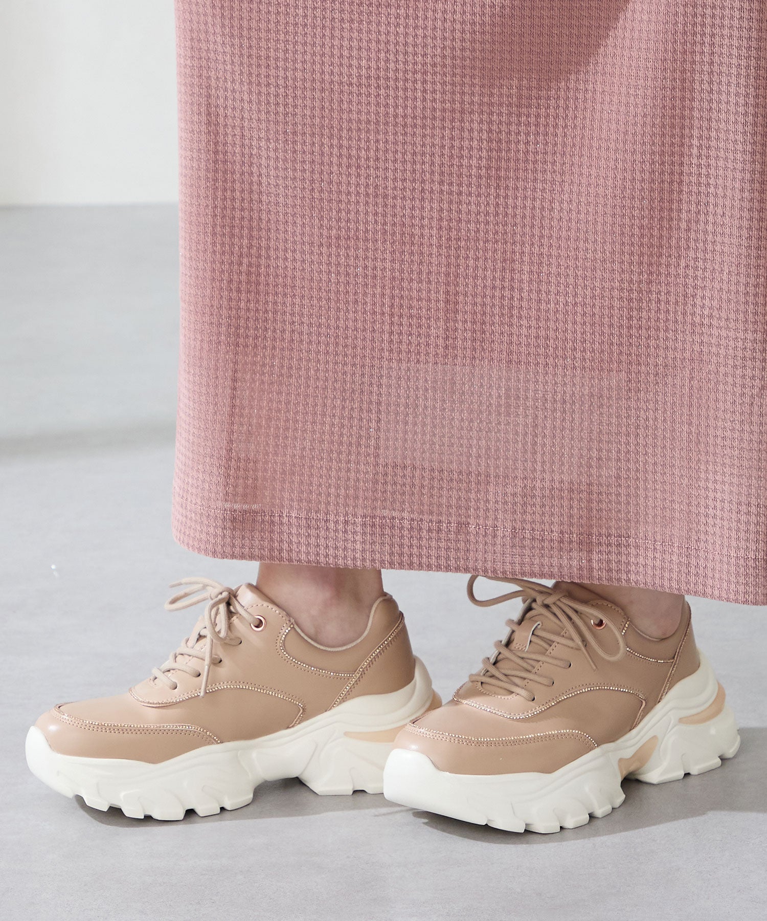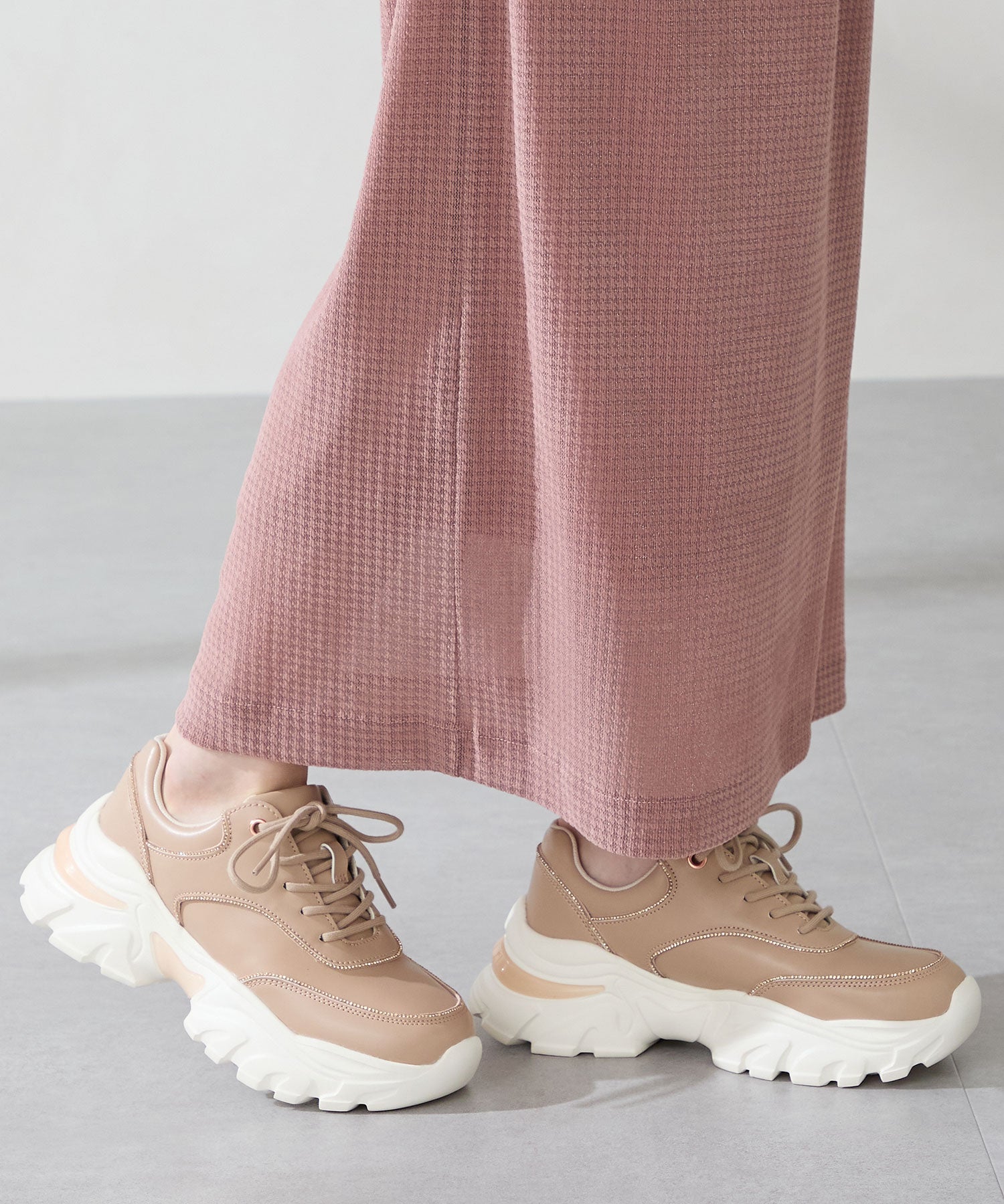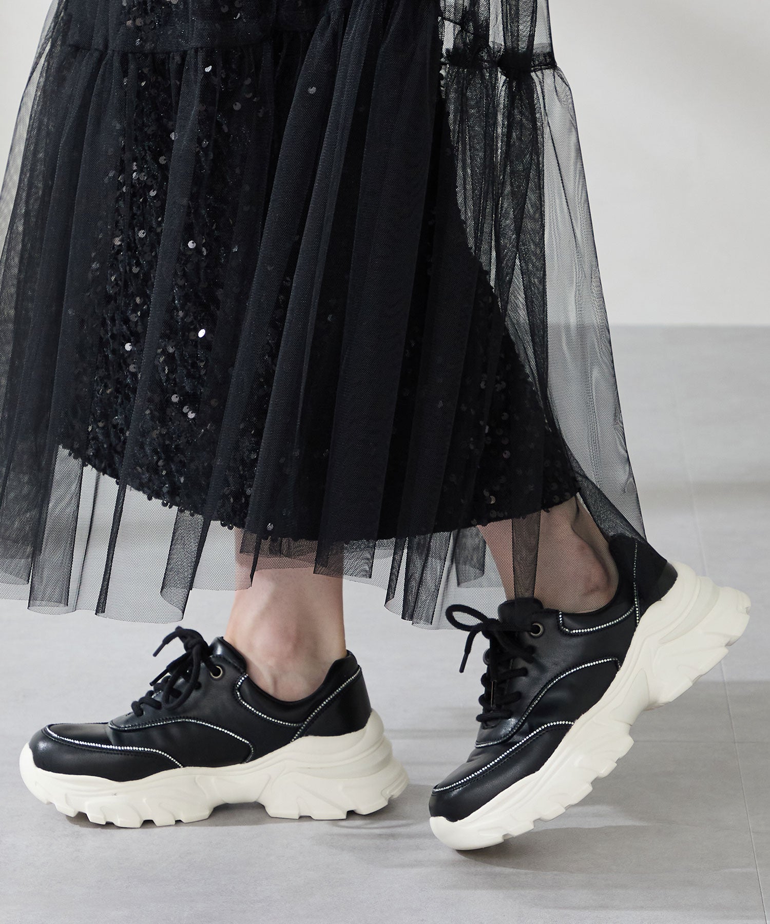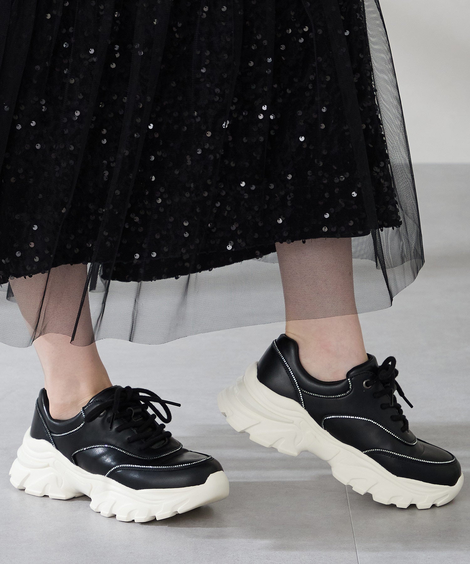 ワントーンのカラーリングの上にキラリと輝くラインストーンが目を引く、大人の華やかさを纏った1足。あえて凹凸感のある厚底ソールを組み合わせることでカジュアルダウンさせているのでフェミニンなコーデはもちろん、デニムなどパンツスタイルとも相性抜群。ラインストーンが際立つブラックと、ヌーディーなカラーがレディライクなベージュの2色展開。