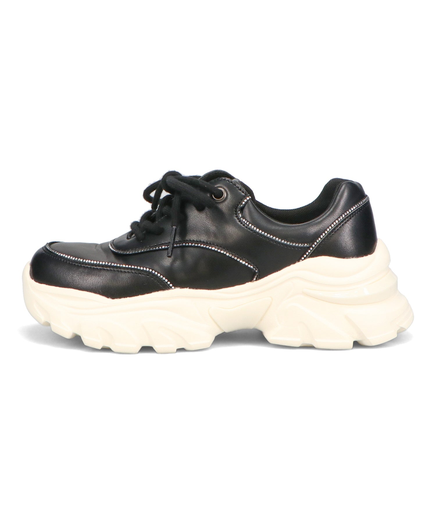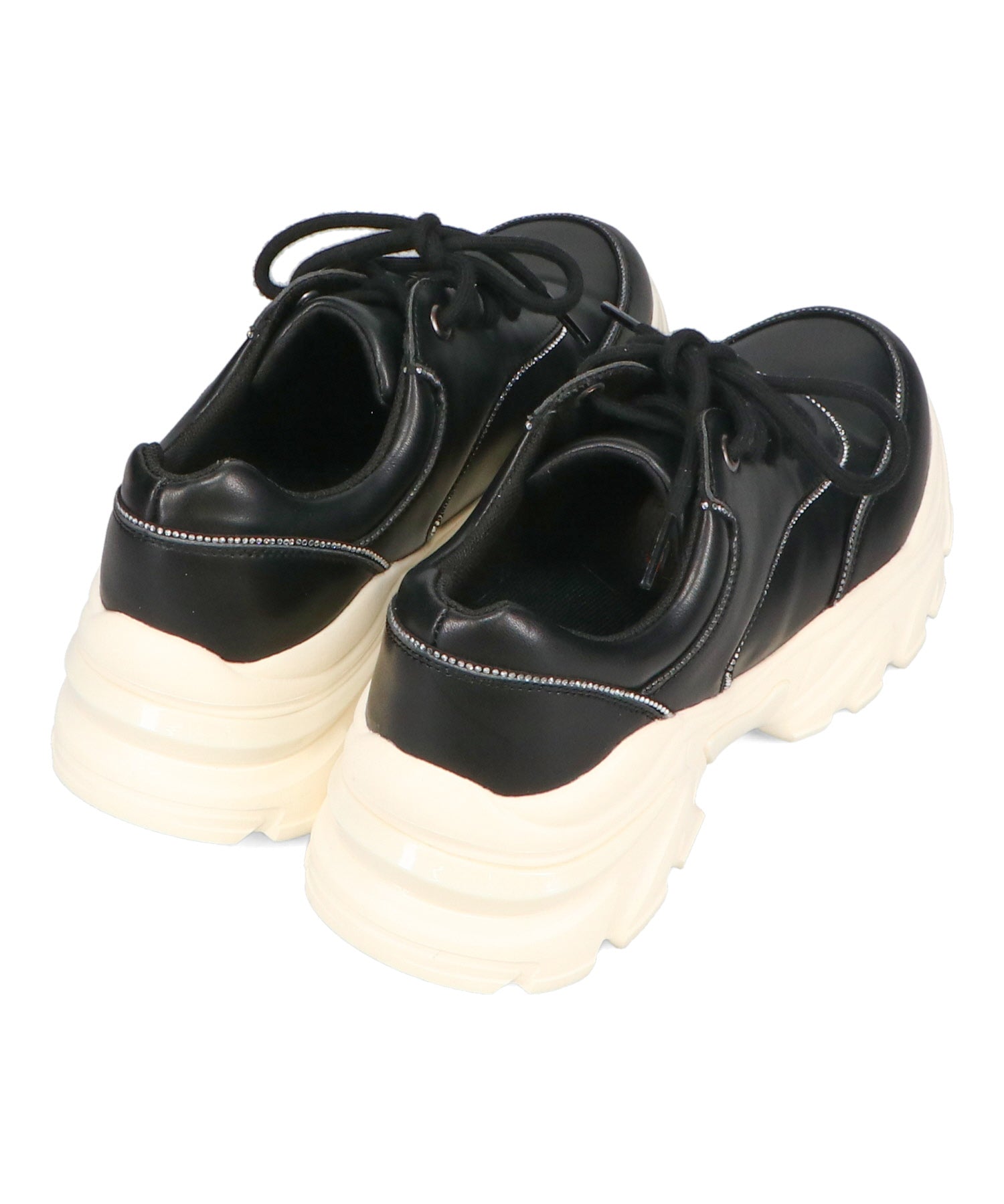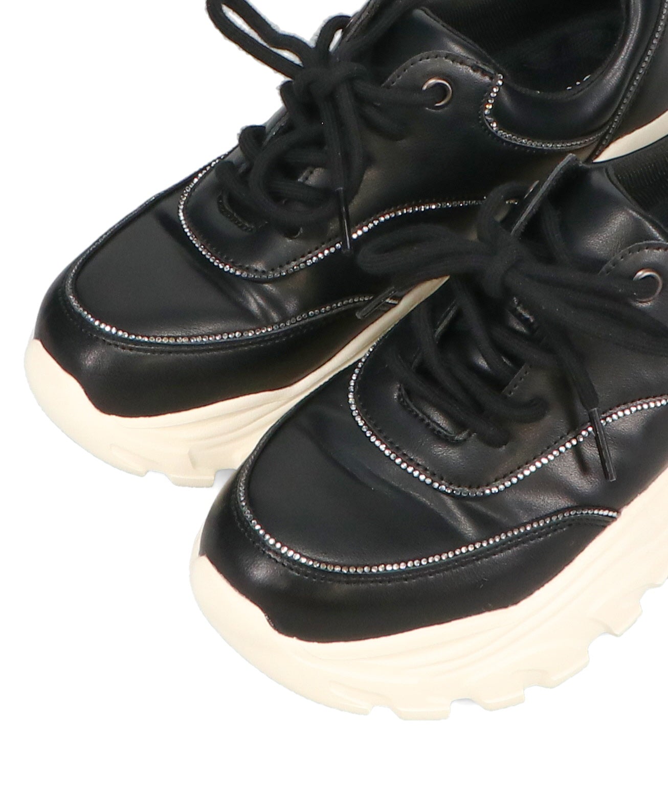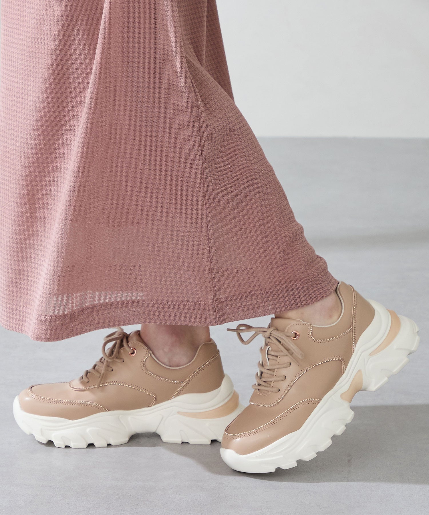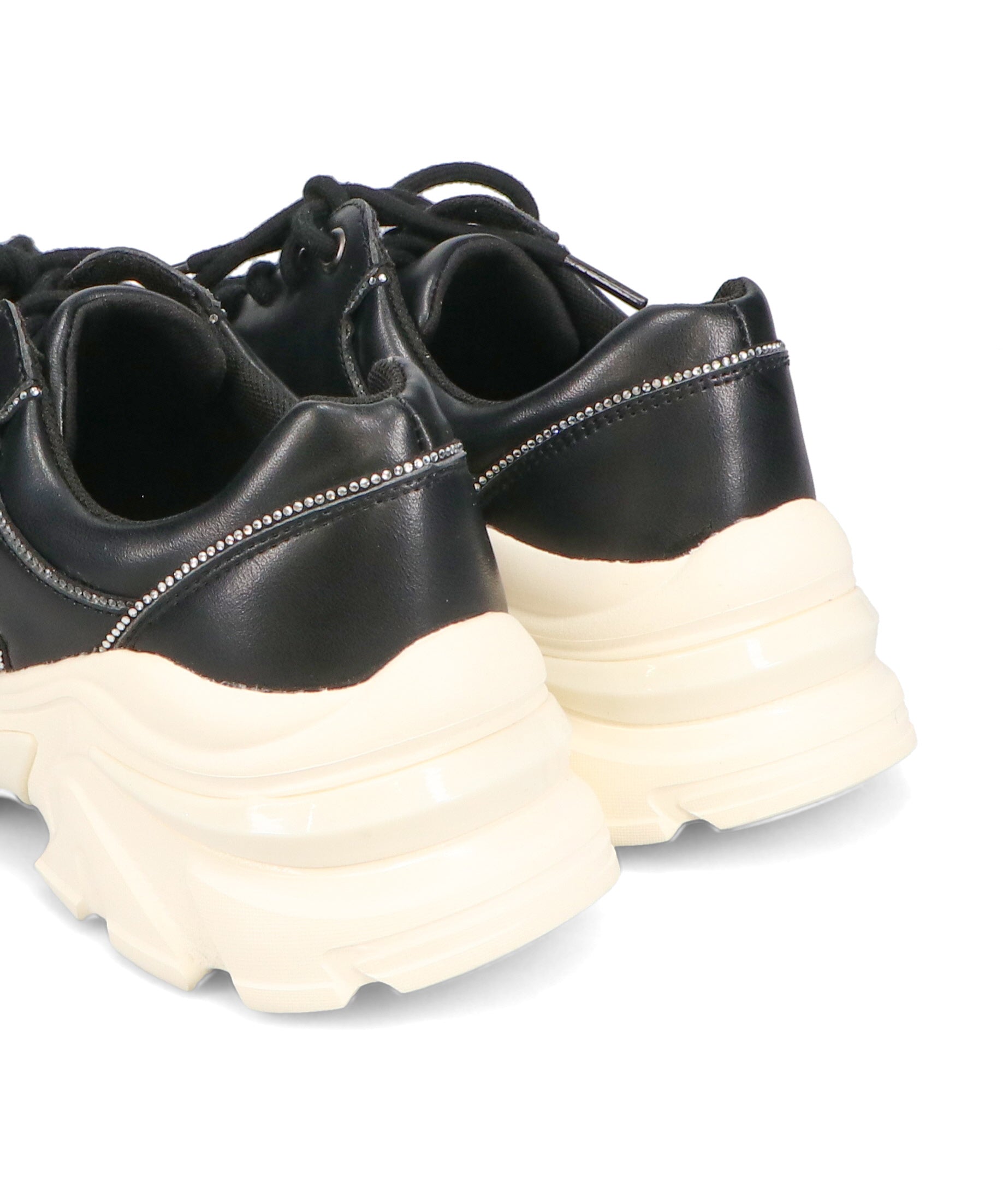 ワントーンのカラーリングの上にキラリと輝くラインストーンが目を引く、大人の華やかさを纏った1足。あえて凹凸感のある厚底ソールを組み合わせることでカジュアルダウンさせているのでフェミニンなコーデはもちろん、デニムなどパンツスタイルとも相性抜群。ラインストーンが際立つブラックと、ヌーディーなカラーがレディライクなベージュの2色展開。