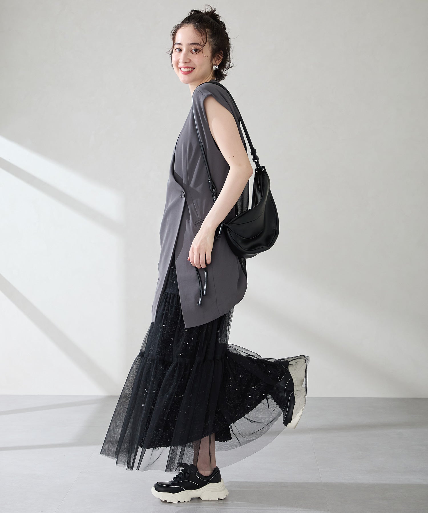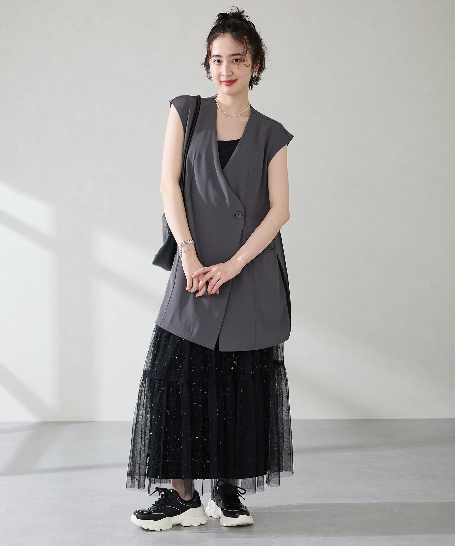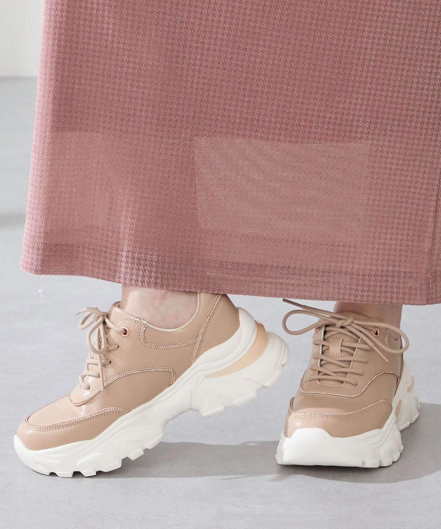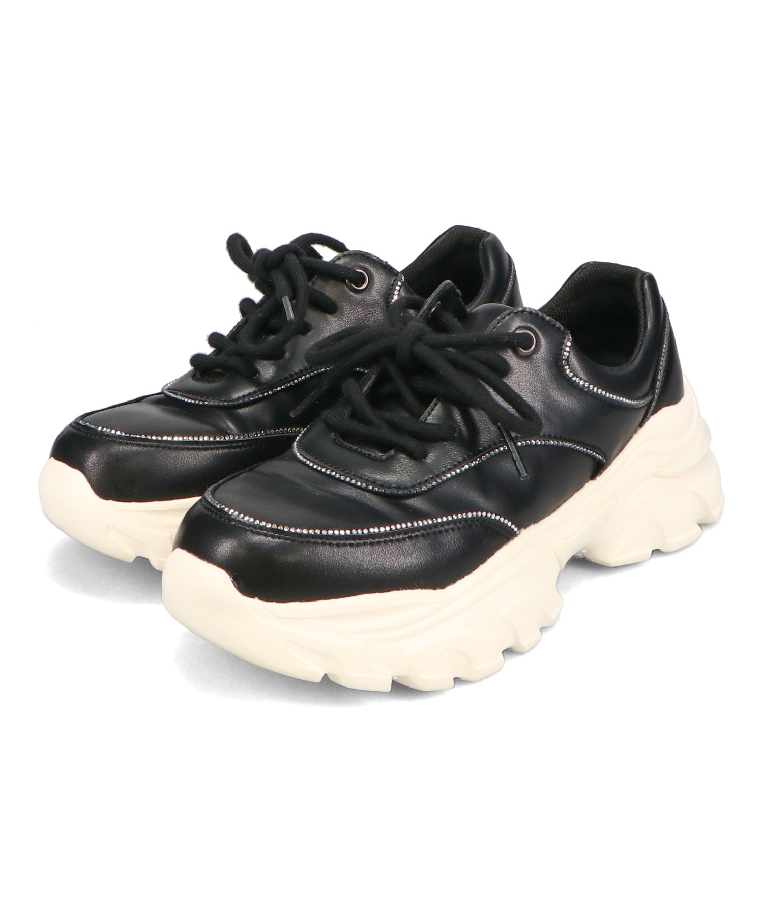 ワントーンのカラーリングの上にキラリと輝くラインストーンが目を引く、大人の華やかさを纏った1足。あえて凹凸感のある厚底ソールを組み合わせることでカジュアルダウンさせているのでフェミニンなコーデはもちろん、デニムなどパンツスタイルとも相性抜群。ラインストーンが際立つブラックと、ヌーディーなカラーがレディライクなベージュの2色展開。