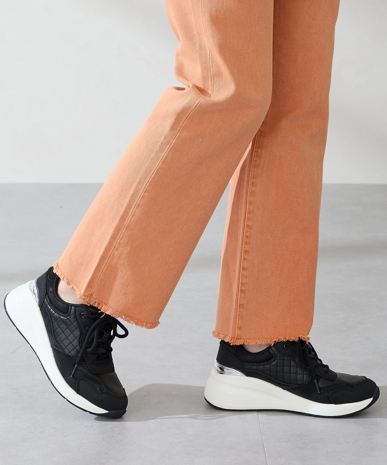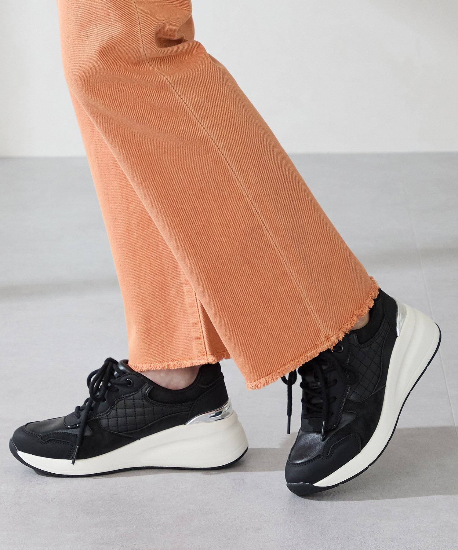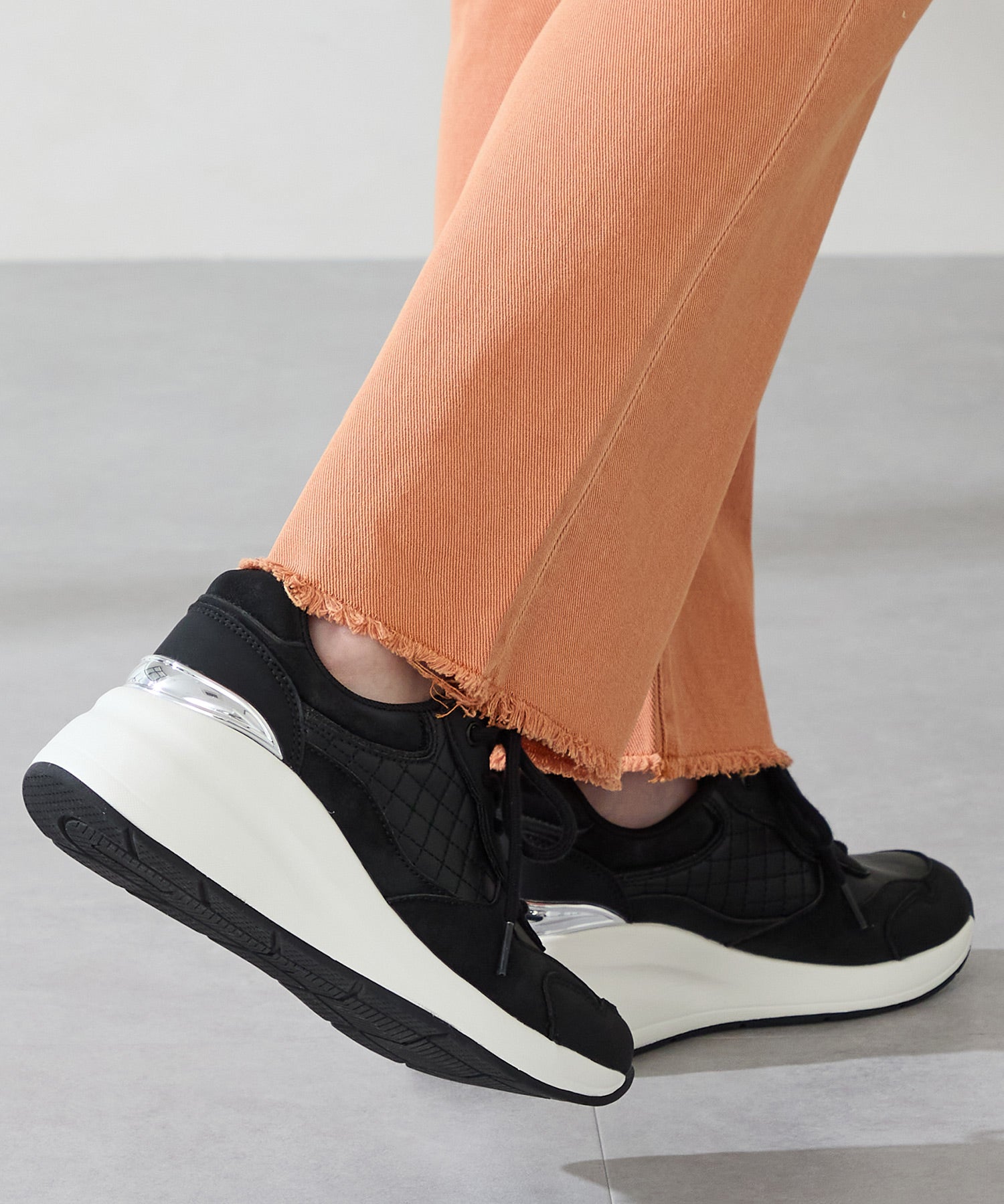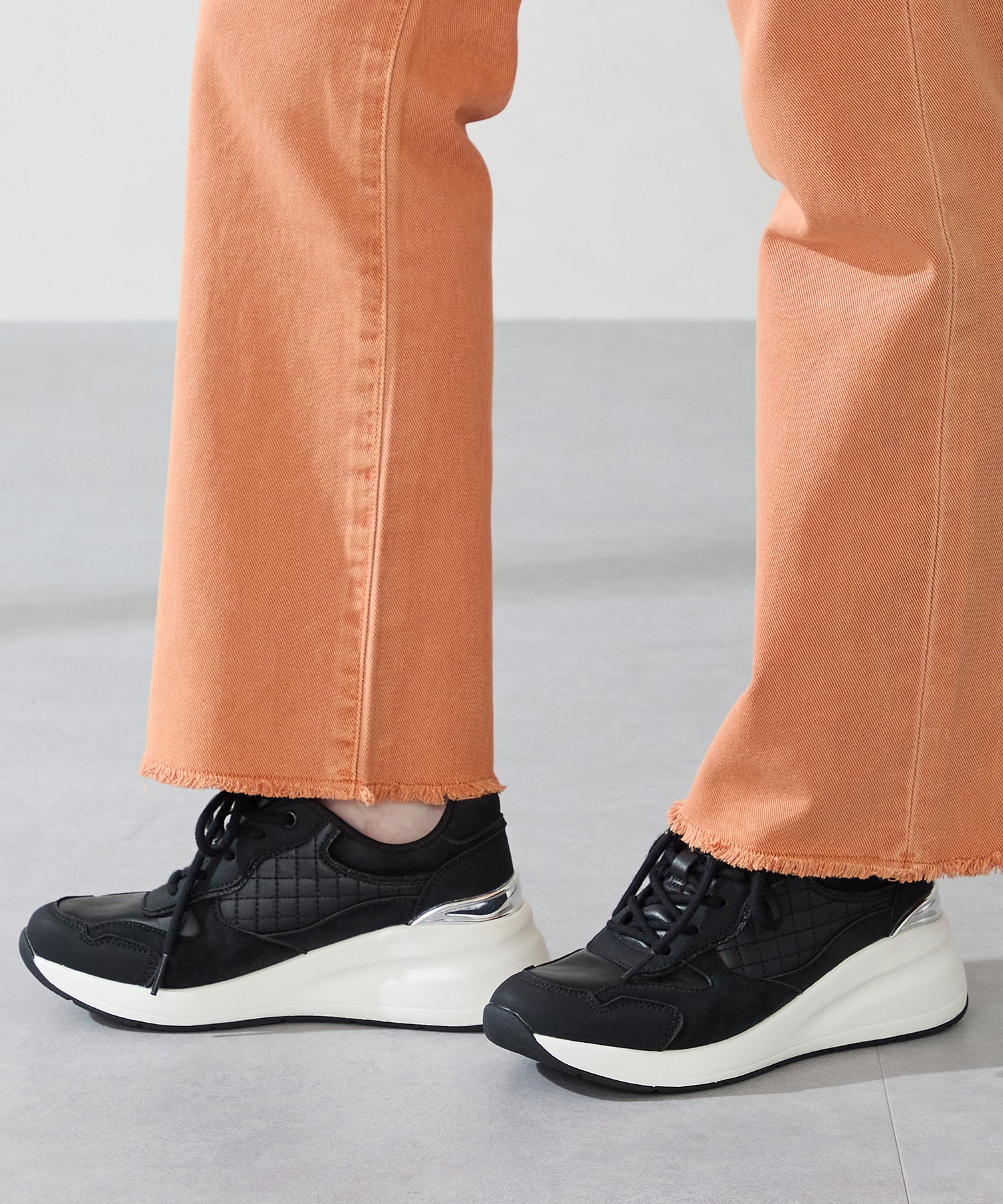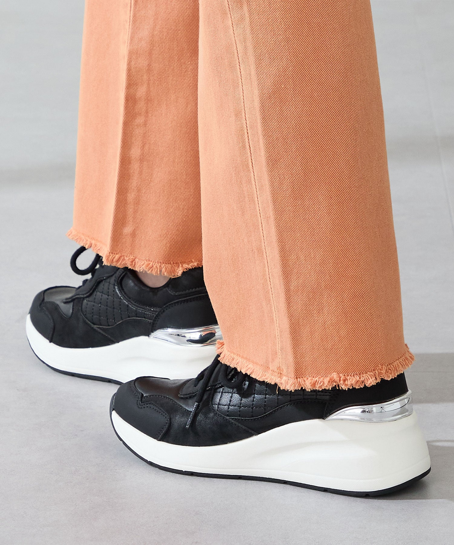 スタイルアップが叶うヒールアップ仕様のソールを使用したスニーカーは自然に脚長効果を演出してくれる。サイドには上品なキルティングデザインを施し、さりげないアクセントに。全体的にすっきりとした細身のシルエットでカジュアル感を抑えて、普段パンプス派の方にもお勧めしたいアイテムに。かかとにメタルパーツを付けて後ろ姿も抜かりないアイテム。