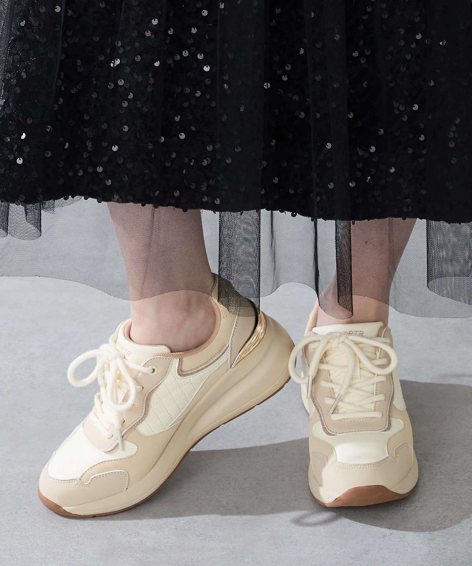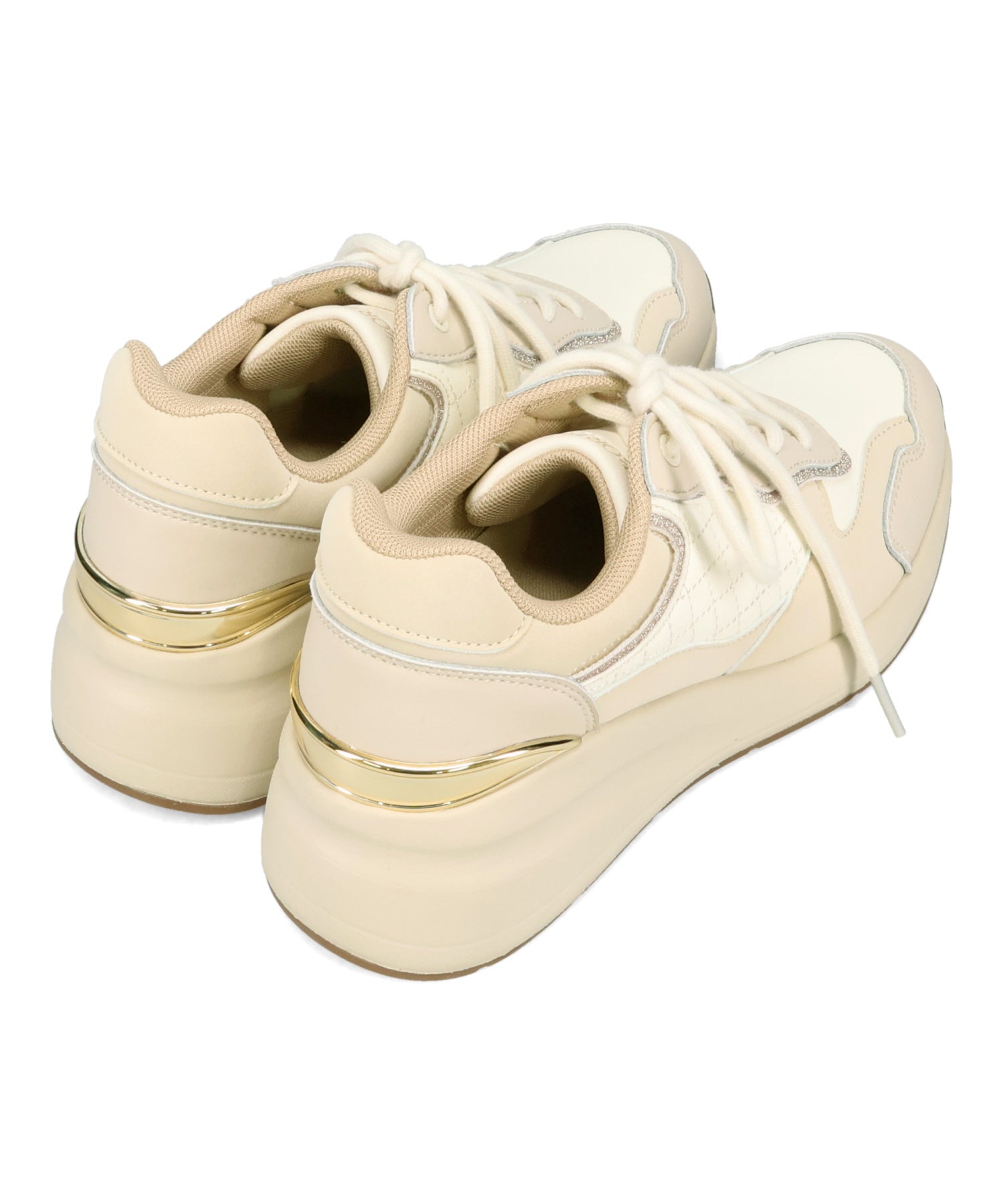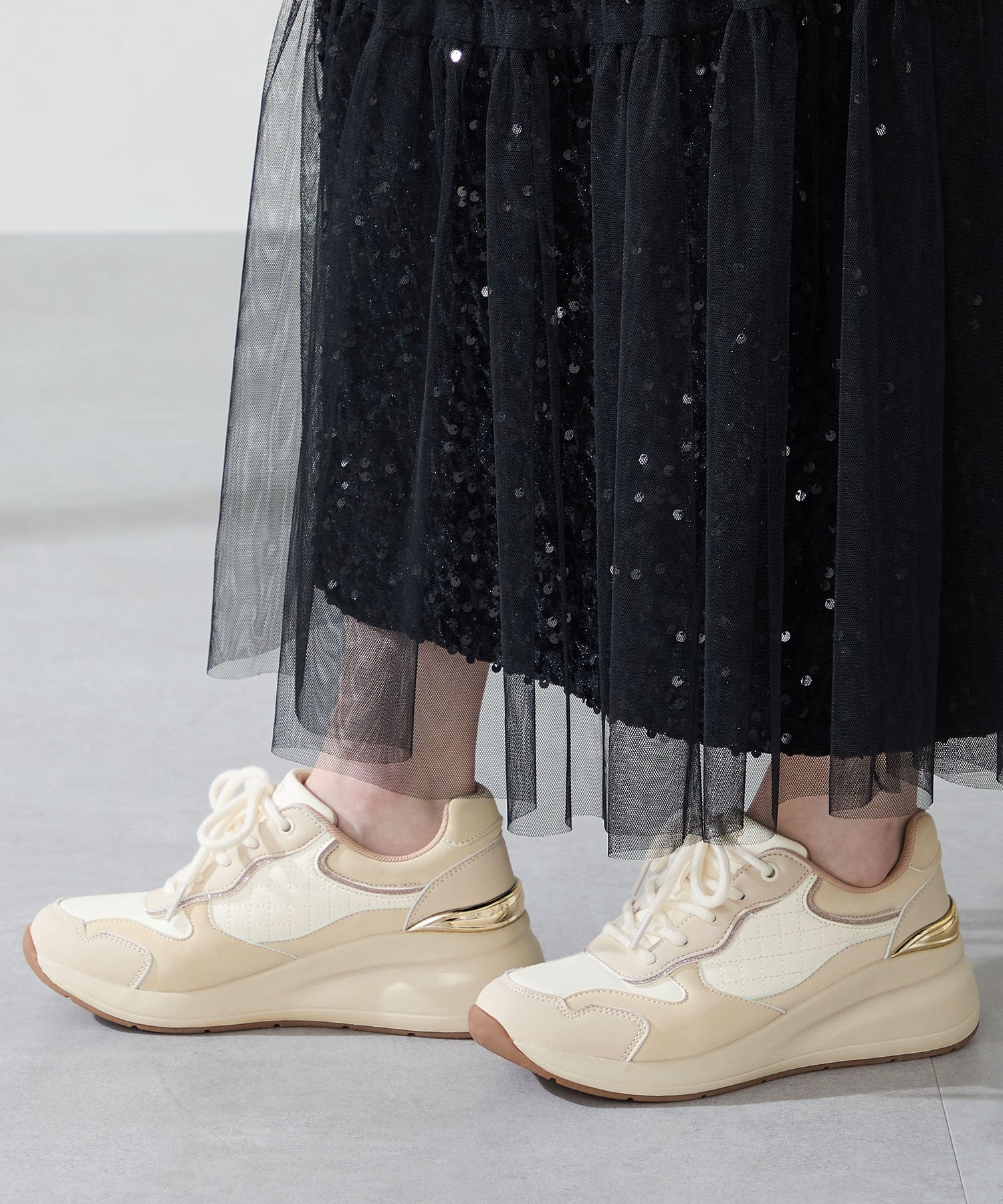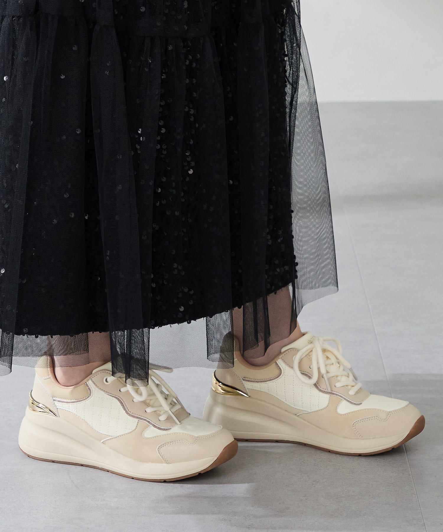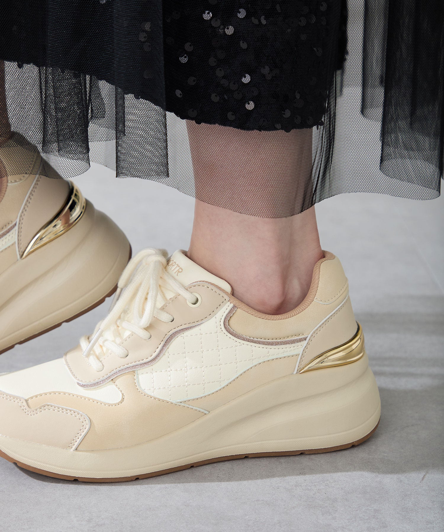 スタイルアップが叶うヒールアップ仕様のソールを使用したスニーカーは自然に脚長効果を演出してくれる。サイドには上品なキルティングデザインを施し、さりげないアクセントに。全体的にすっきりとした細身のシルエットでカジュアル感を抑えて、普段パンプス派の方にもお勧めしたいアイテムに。かかとにメタルパーツを付けて後ろ姿も抜かりないアイテム。