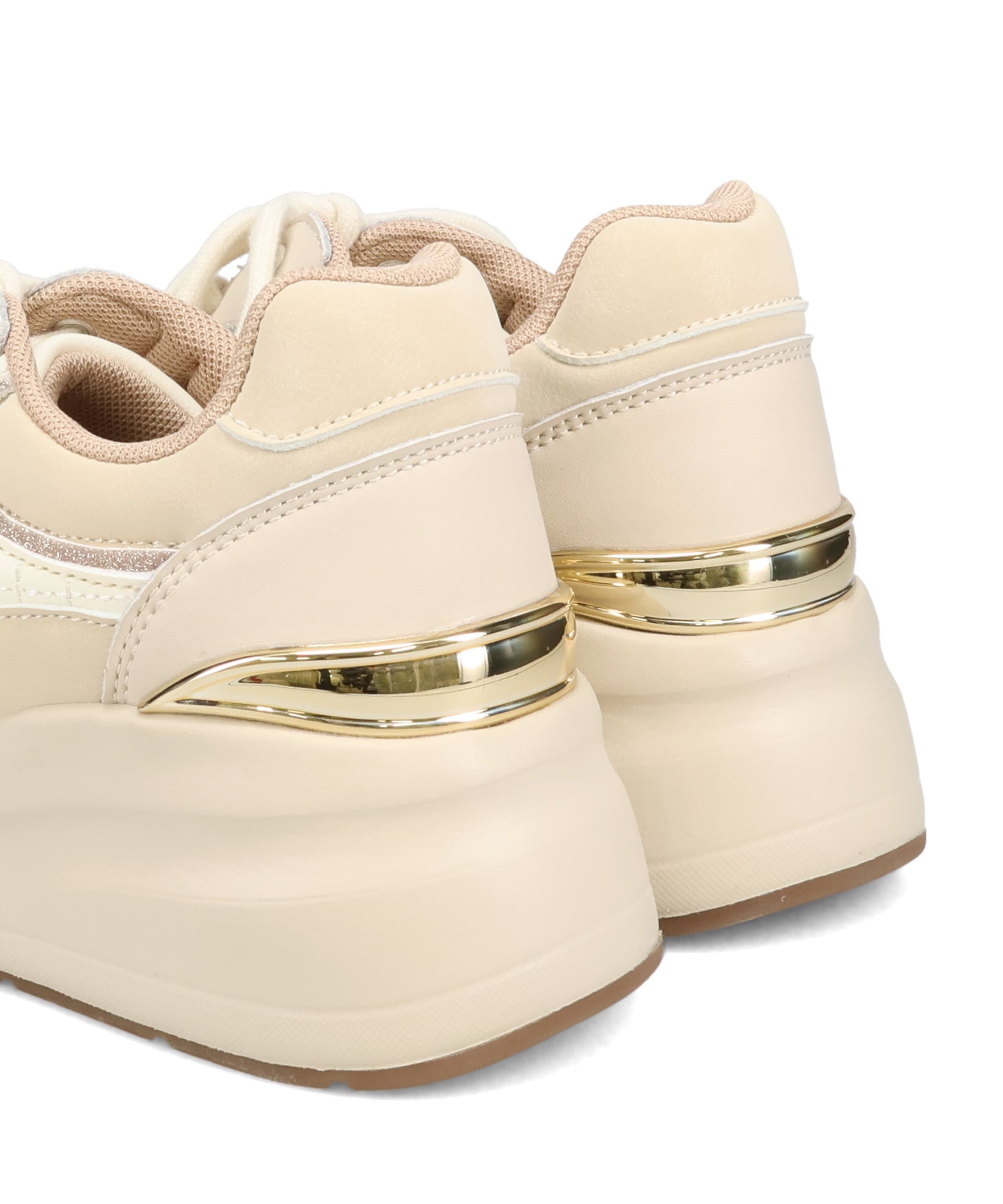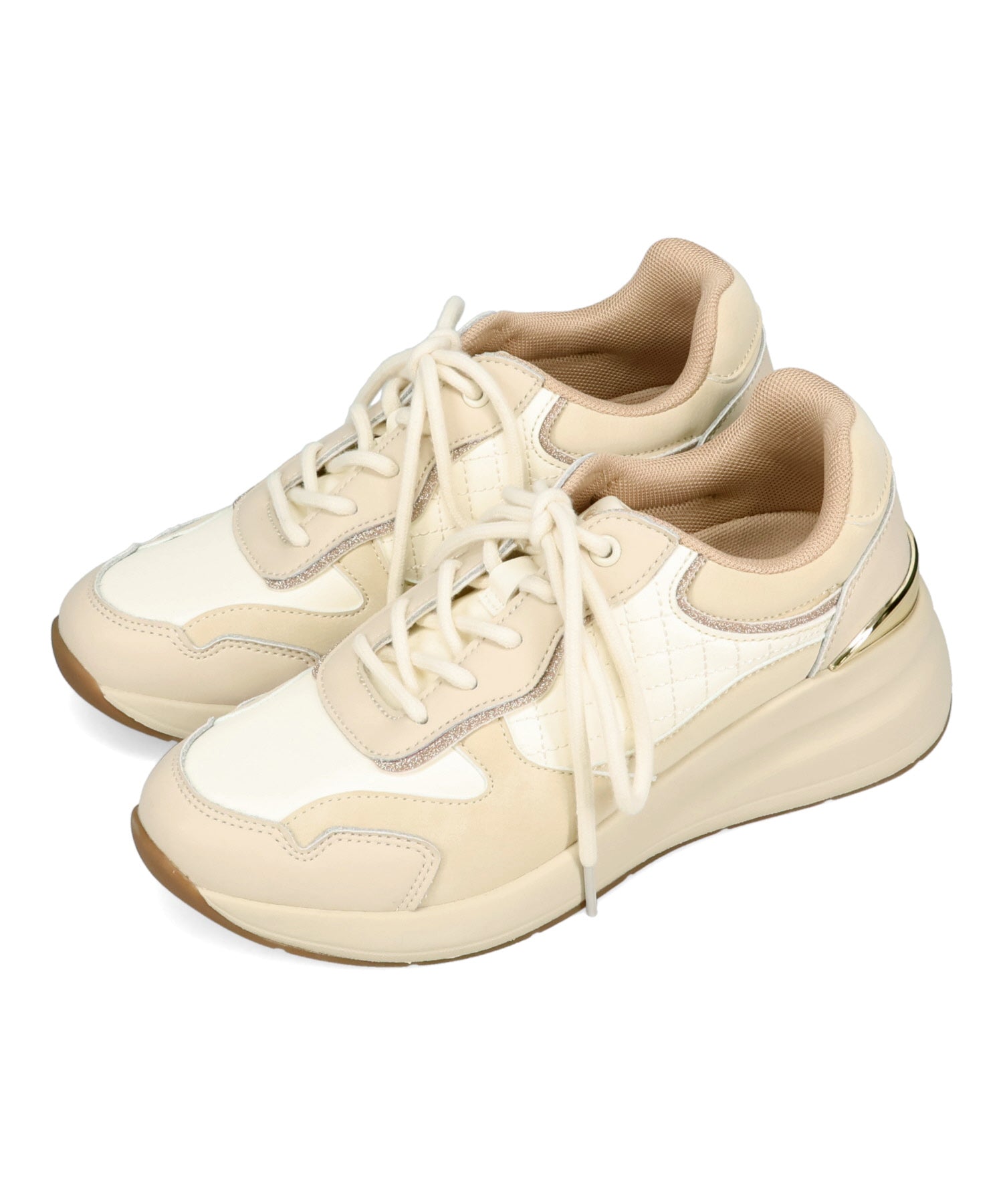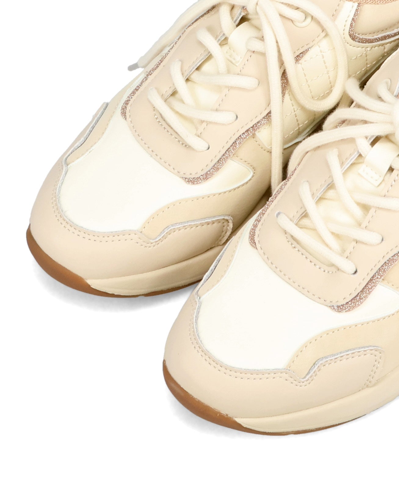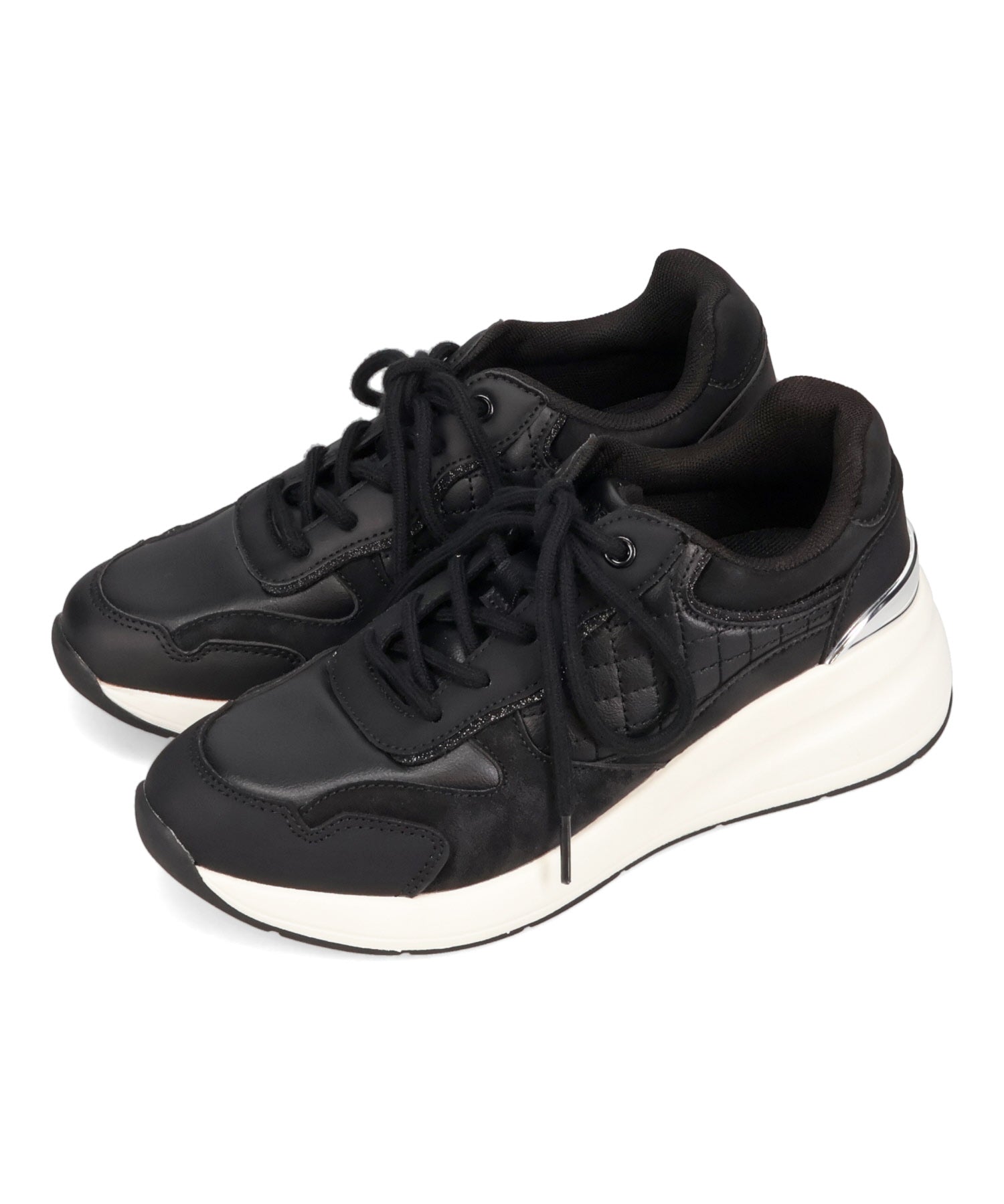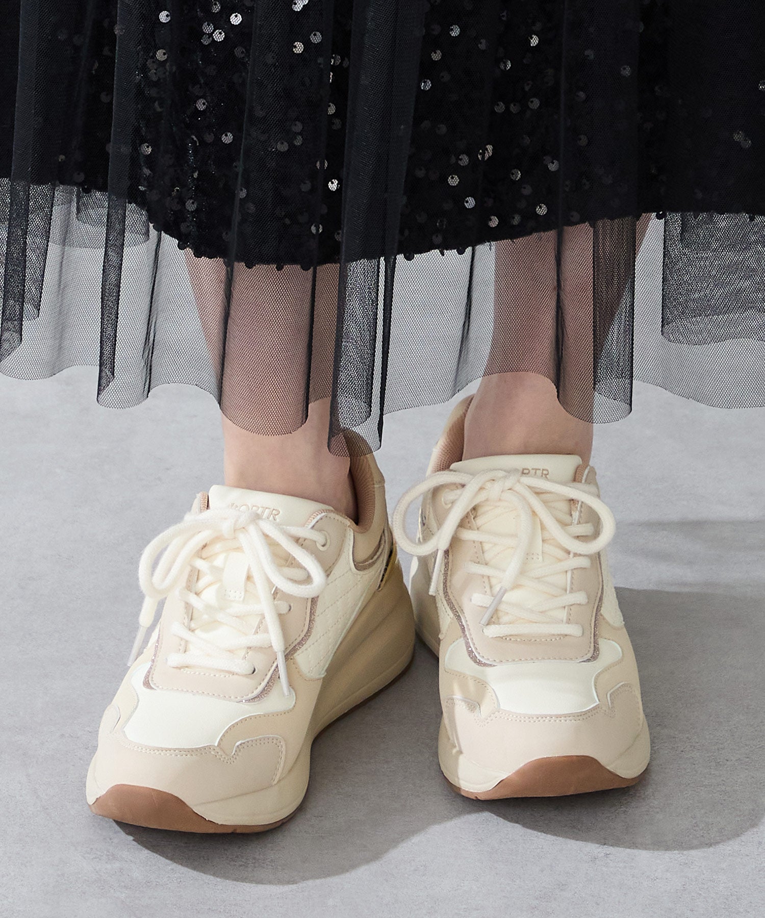 スタイルアップが叶うヒールアップ仕様のソールを使用したスニーカーは自然に脚長効果を演出してくれる。サイドには上品なキルティングデザインを施し、さりげないアクセントに。全体的にすっきりとした細身のシルエットでカジュアル感を抑えて、普段パンプス派の方にもお勧めしたいアイテムに。かかとにメタルパーツを付けて後ろ姿も抜かりないアイテム。