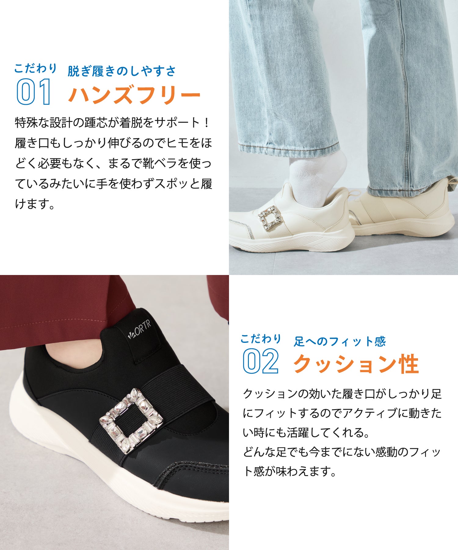 キラキラのビジューバックルやグリッターラインが乙女心くすぐるデザインのハンズフリースニーカーは、手を使わずにさっと履けるので着脱のストレスがないのが嬉しい。クッション性にこだわりフィット感が心地よく、軽量でたくさん歩いても疲れにくいので楽に履きたいけどおしゃれも楽しみたい方におすすめ。ベーシックなカラバリが使いやすくオールシーズン履けるのもポイント。
