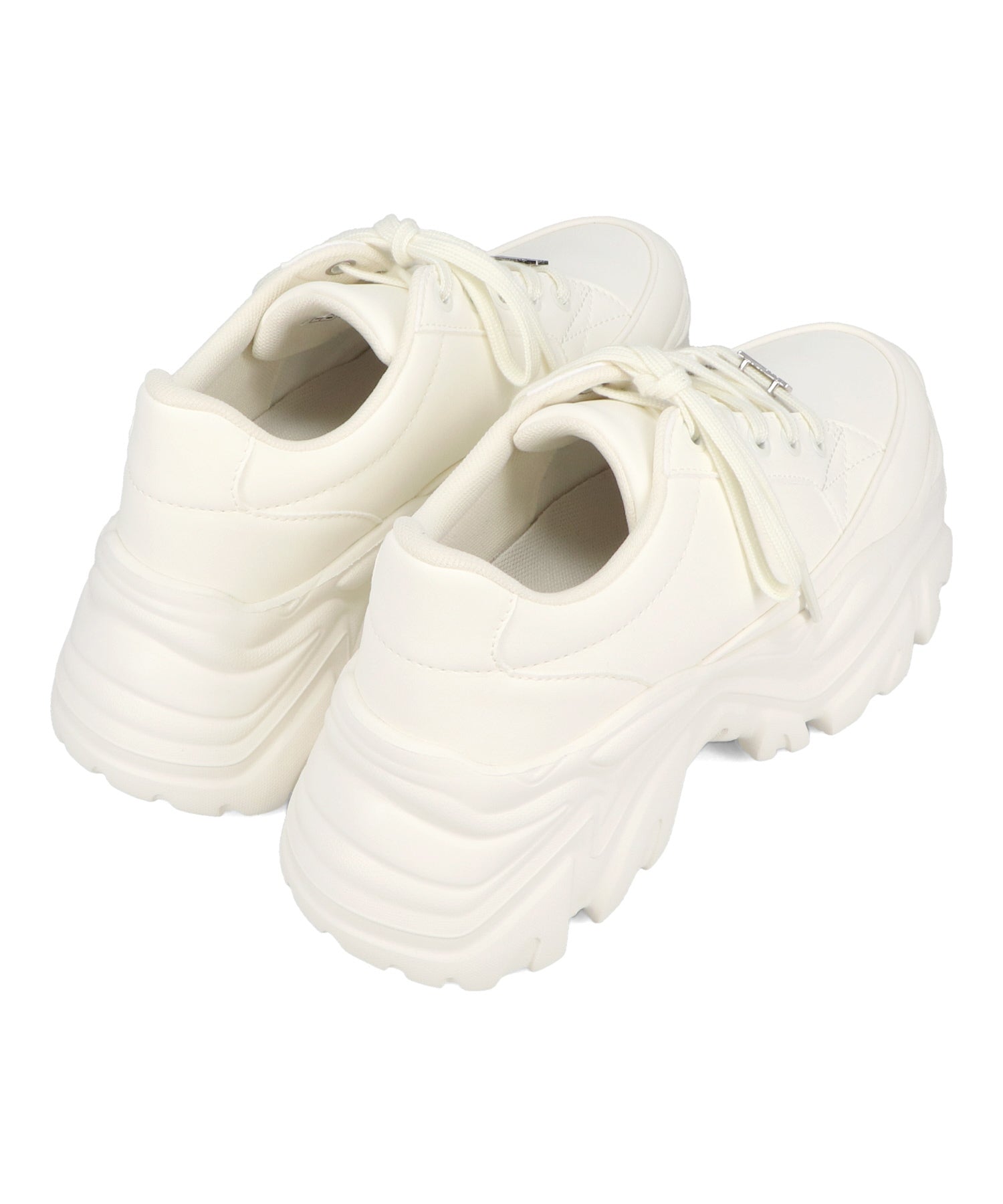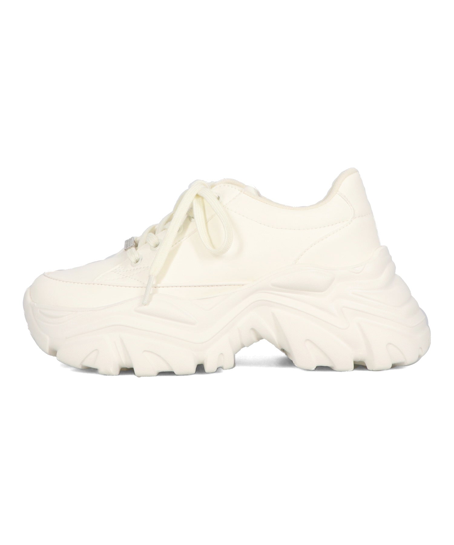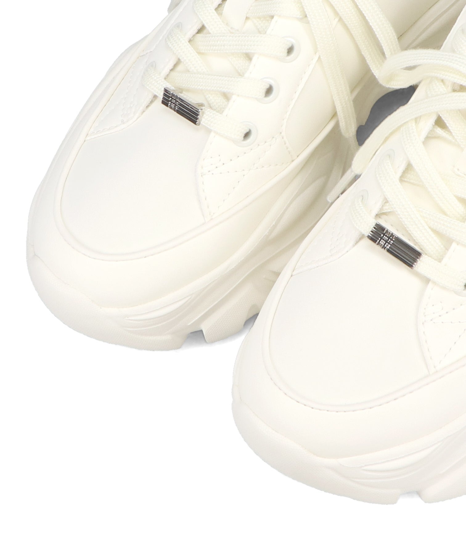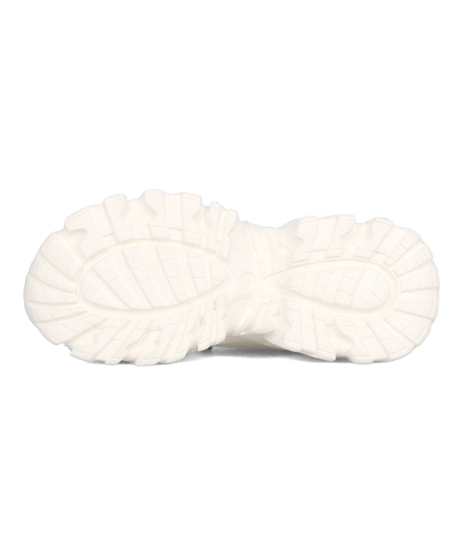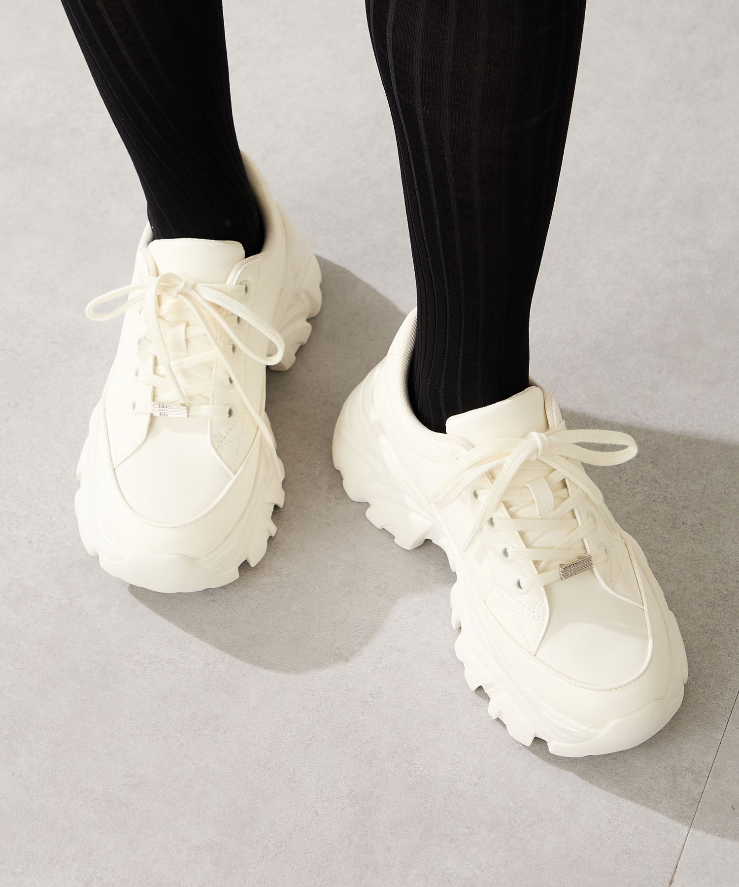とことんボリュームのあるソールがスタイルアップを叶えてくれるスニーカーは、オリジナルの金具パーツでアクセントを効かせた1足。インパクトのあるソールも見た目以上に軽く、全色ホワイトに統一することで重たく見えないのもポイント。切替パーツが少なくすっきりとしたデザインに、シボのある素材をアッパー全体に使用することで高級感のある仕上がりに。