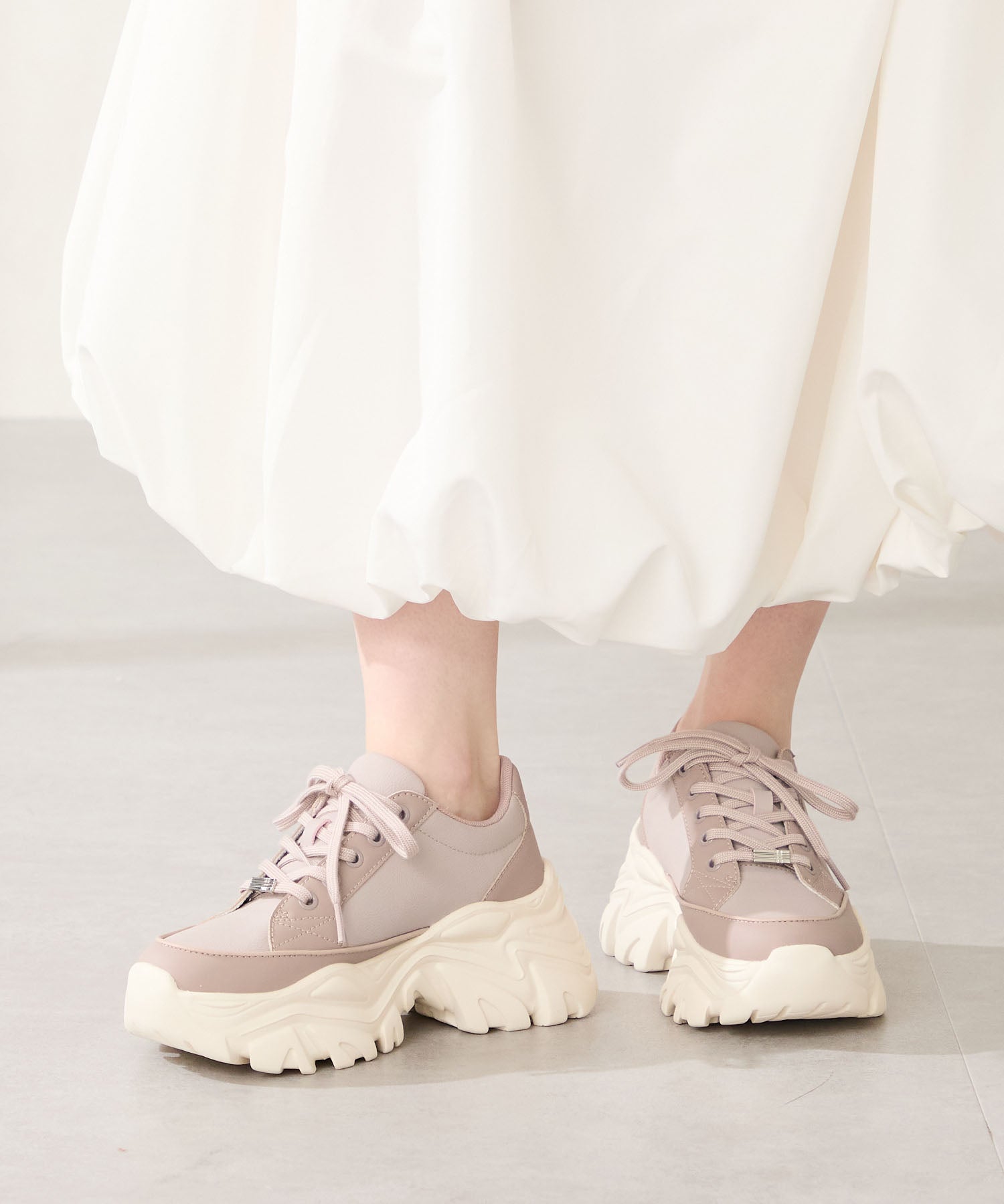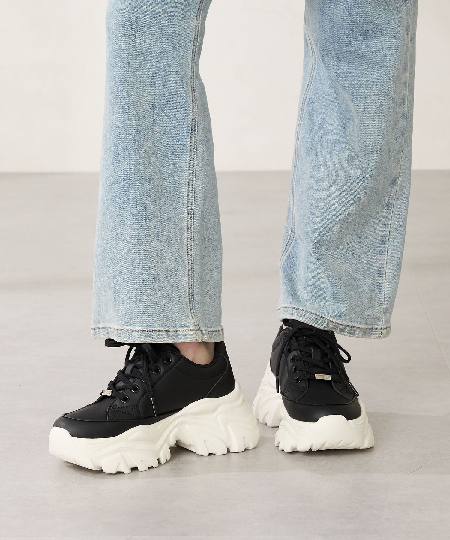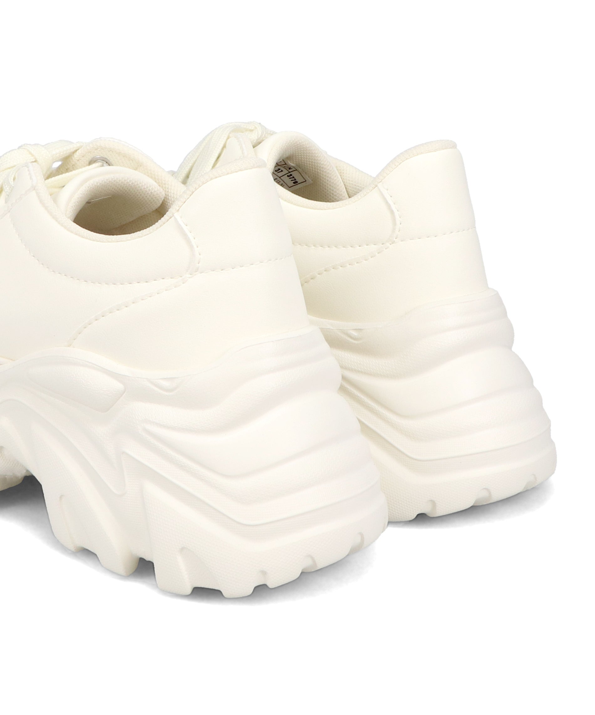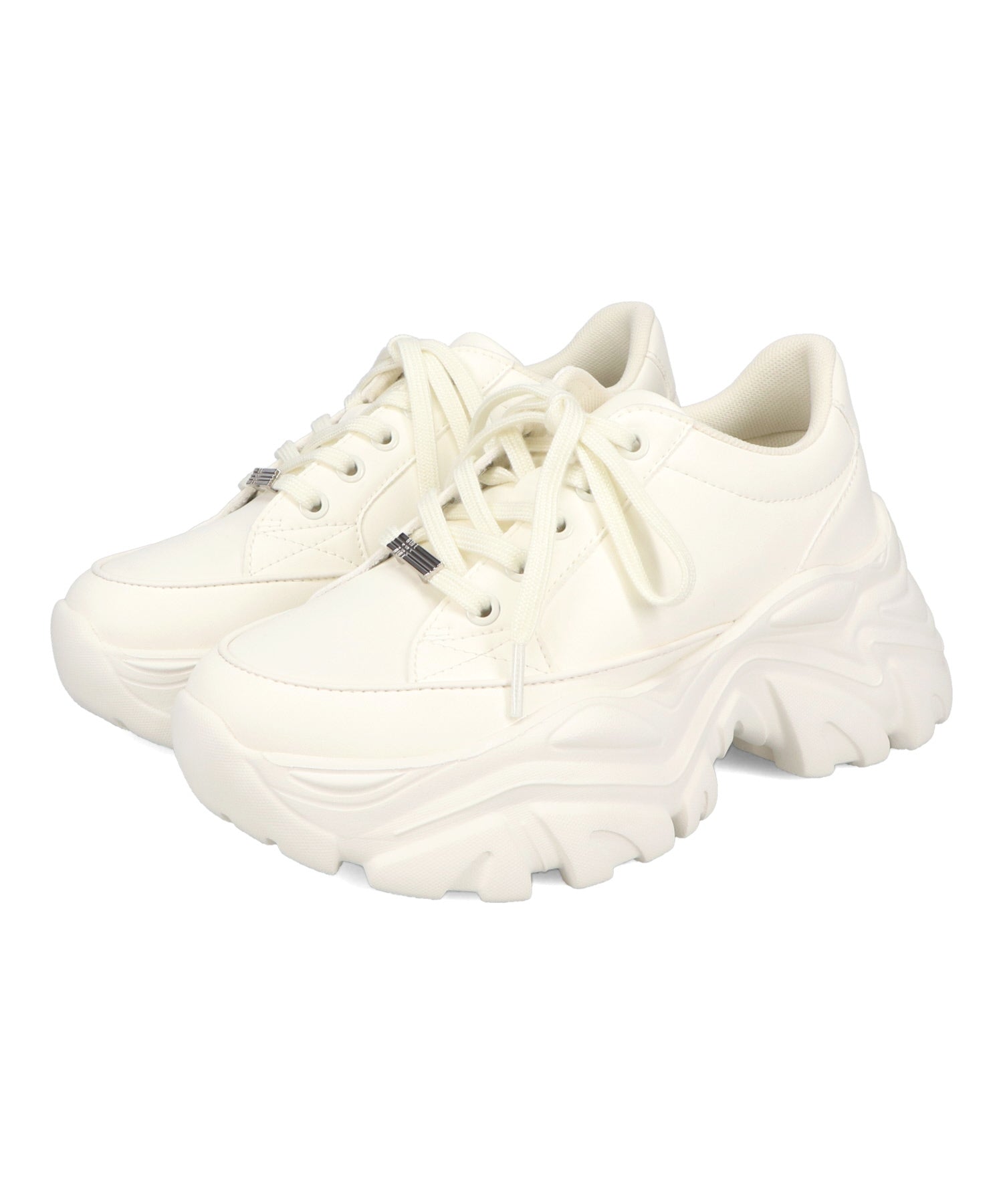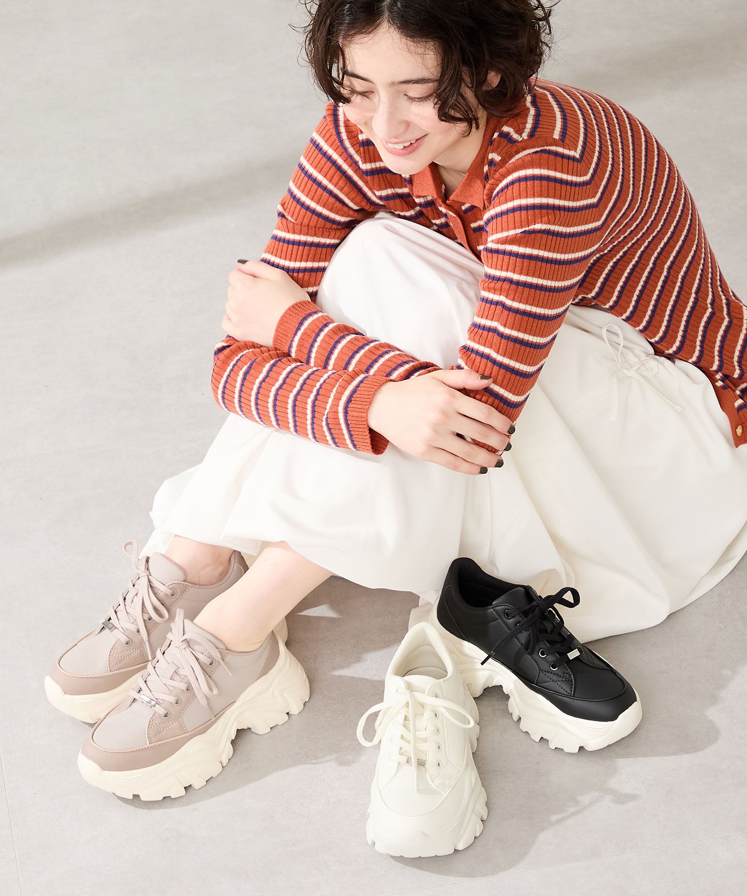 とことんボリュームのあるソールがスタイルアップを叶えてくれるスニーカーは、オリジナルの金具パーツでアクセントを効かせた1足。インパクトのあるソールも見た目以上に軽く、全色ホワイトに統一することで重たく見えないのもポイント。切替パーツが少なくすっきりとしたデザインに、シボのある素材をアッパー全体に使用することで高級感のある仕上がりに。