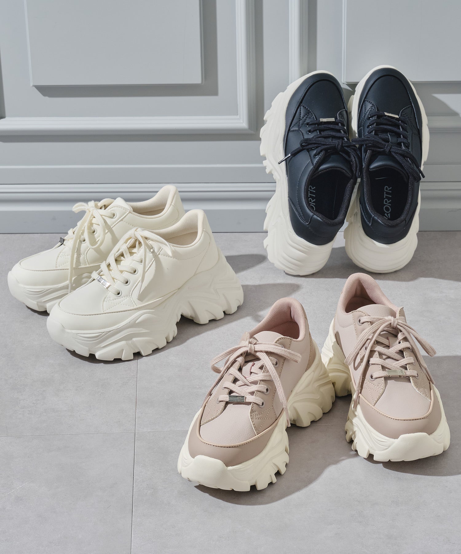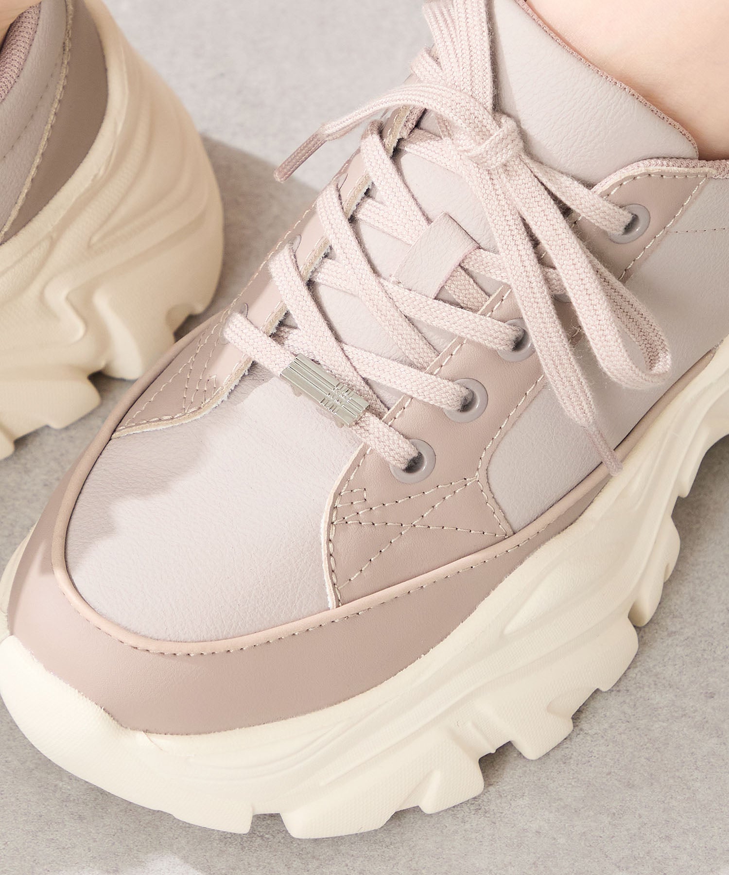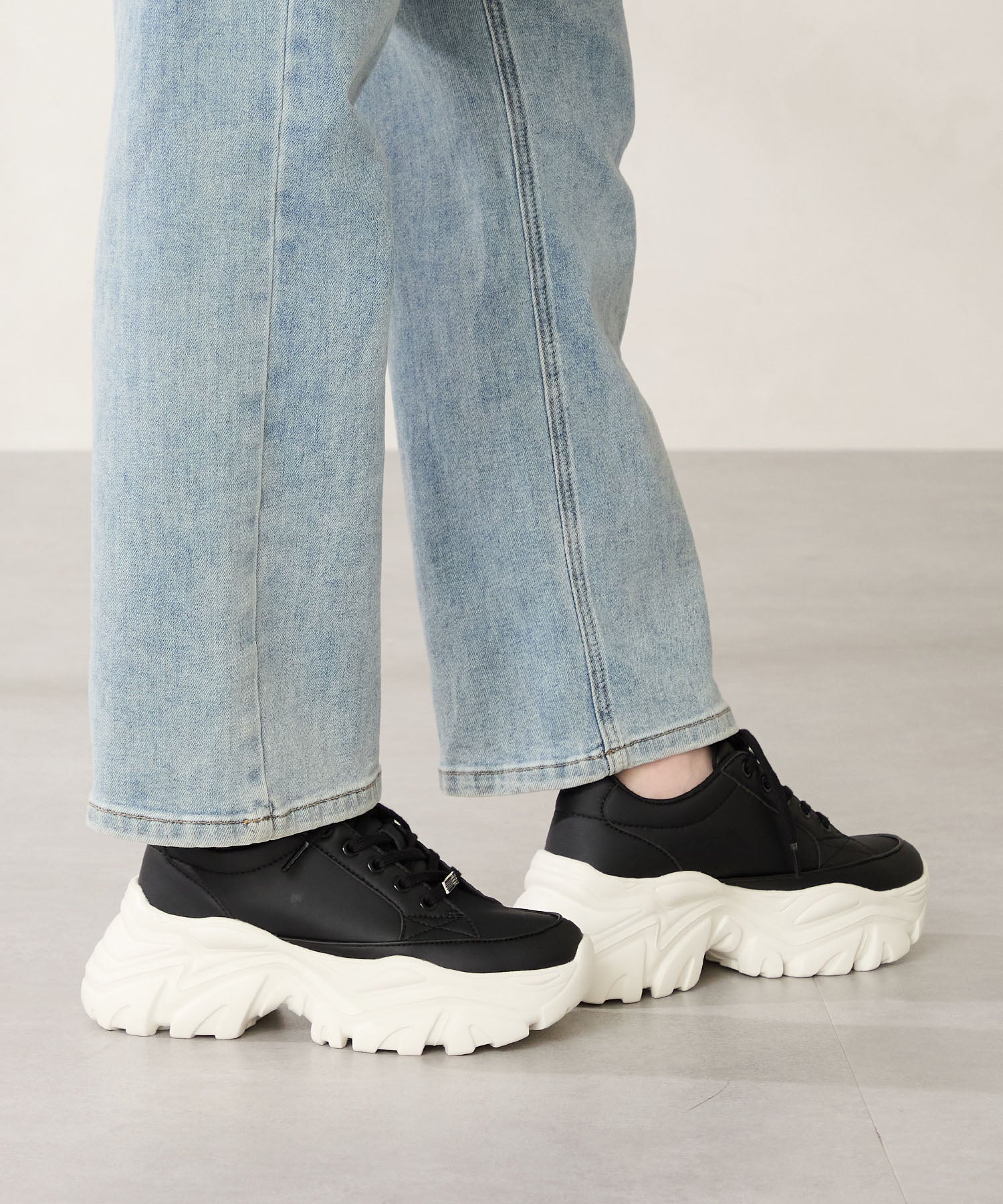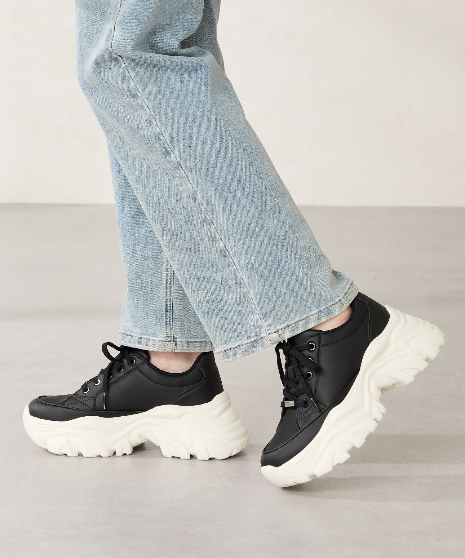 とことんボリュームのあるソールがスタイルアップを叶えてくれるスニーカーは、オリジナルの金具パーツでアクセントを効かせた1足。インパクトのあるソールも見た目以上に軽く、全色ホワイトに統一することで重たく見えないのもポイント。切替パーツが少なくすっきりとしたデザインに、シボのある素材をアッパー全体に使用することで高級感のある仕上がりに。