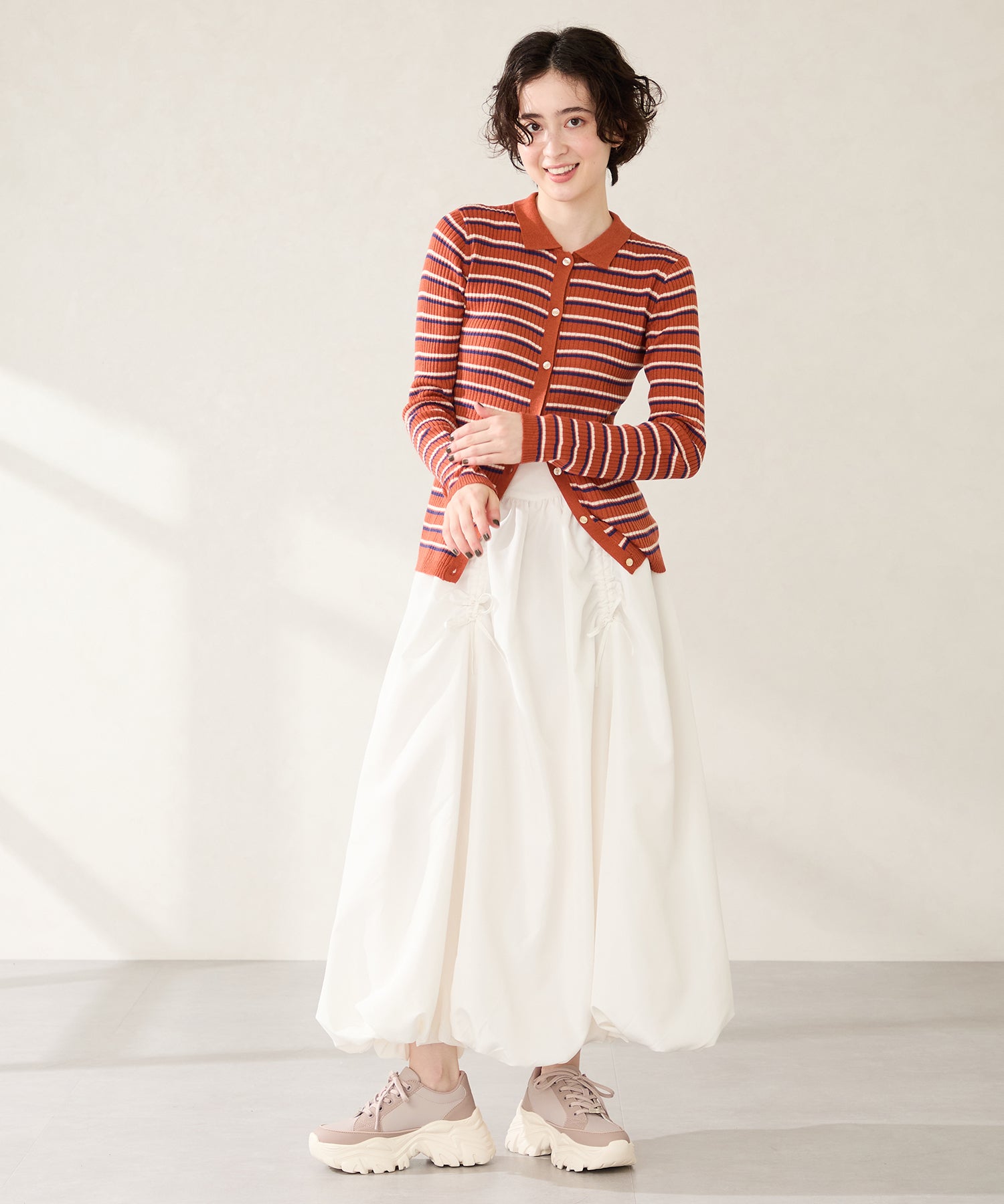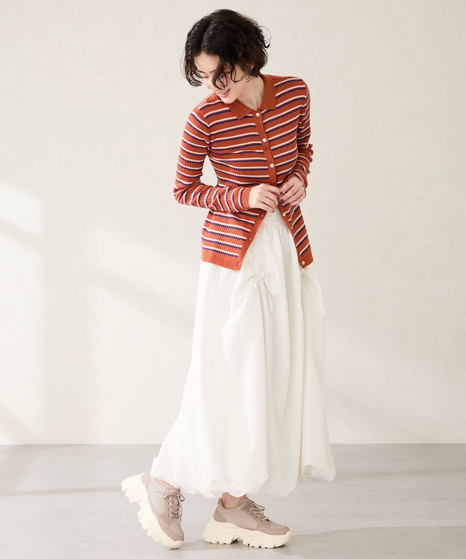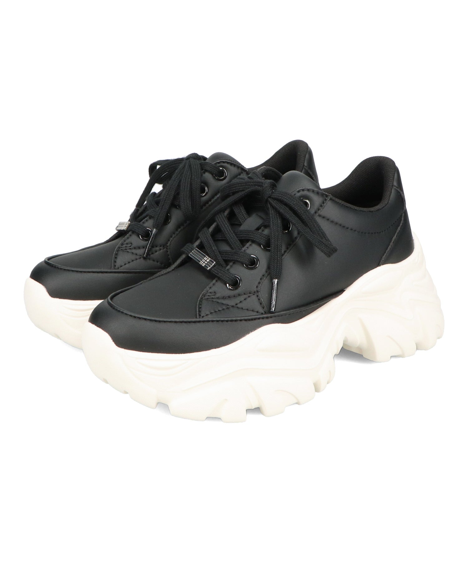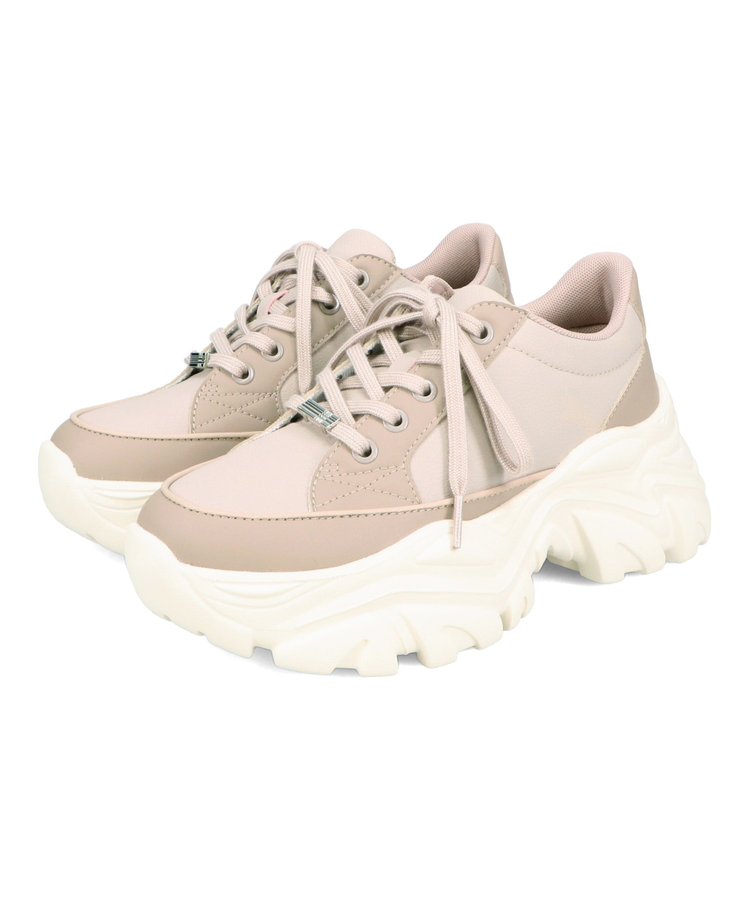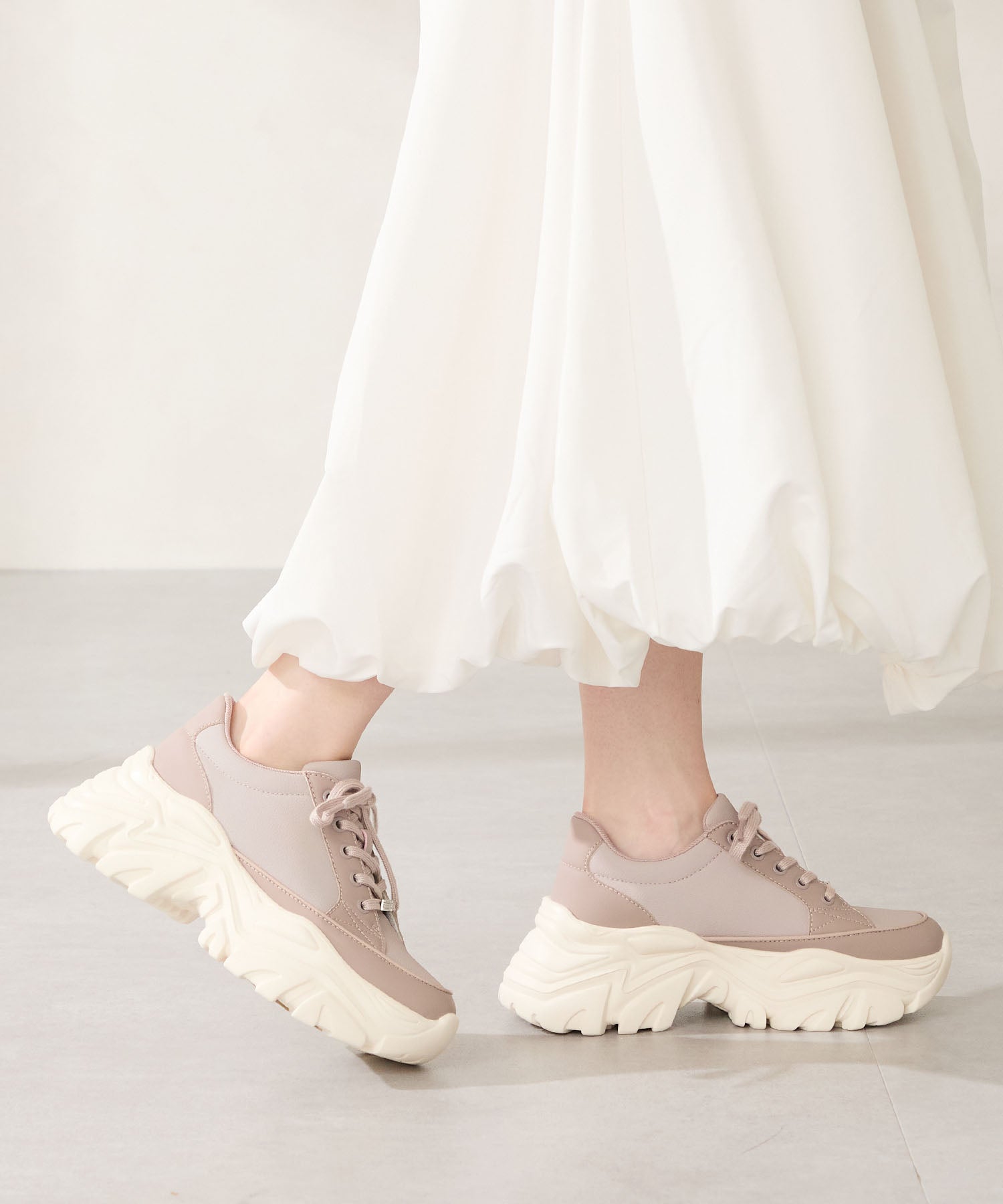 とことんボリュームのあるソールがスタイルアップを叶えてくれるスニーカーは、オリジナルの金具パーツでアクセントを効かせた1足。インパクトのあるソールも見た目以上に軽く、全色ホワイトに統一することで重たく見えないのもポイント。切替パーツが少なくすっきりとしたデザインに、シボのある素材をアッパー全体に使用することで高級感のある仕上がりに。