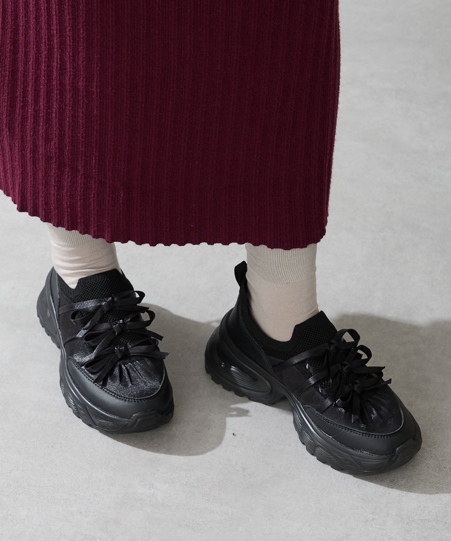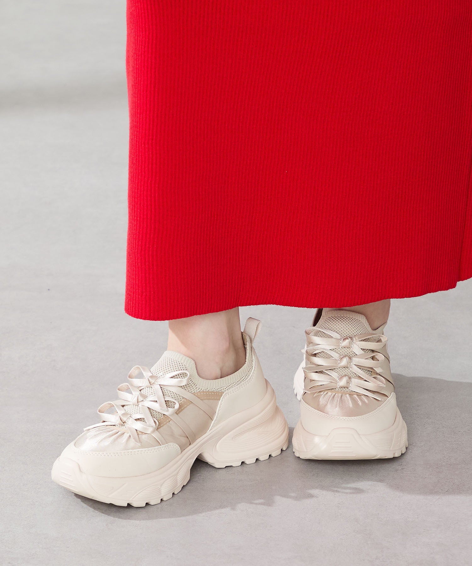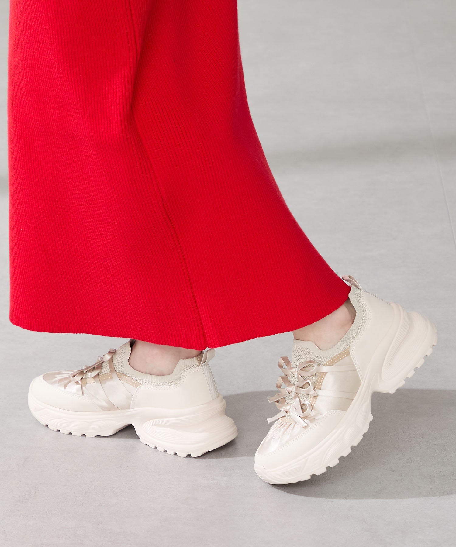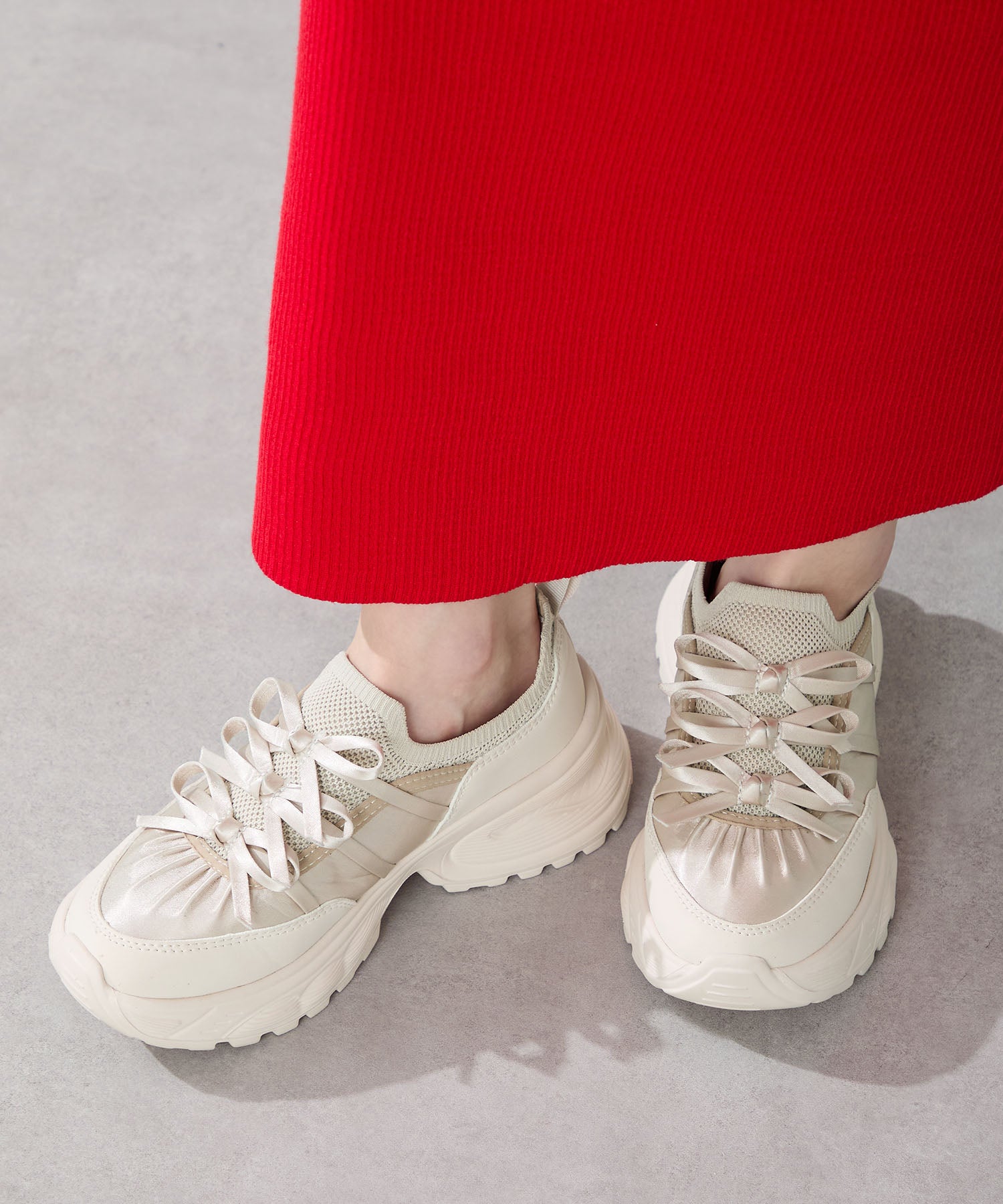 リボンディテールとギャザーがコーディネートに大人可愛い甘さをプラスしてくれる厚底スニーカー。しっかりホールドしてくれる履き口部分のニットは伸縮性がありフィット感も◎。カジュアルにも合わせられるブラックと、フェミニンコーデにぴったりな淡いグレーとピンクのカラバリも可愛い。ガーリーに履きたい方はミニ丈で、甘さをおさえたい方はロング丈のボトムで合わせるがおすすめ。