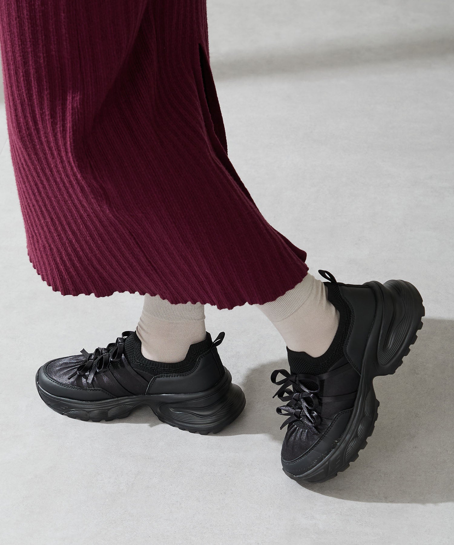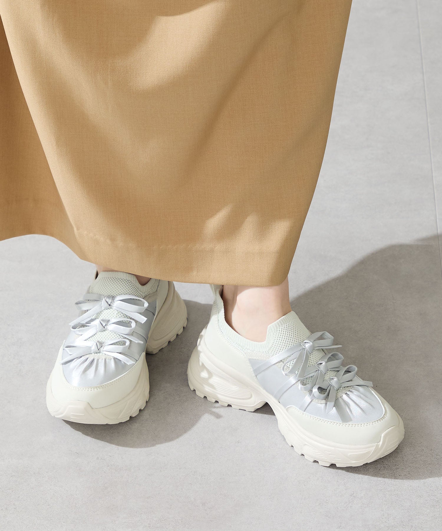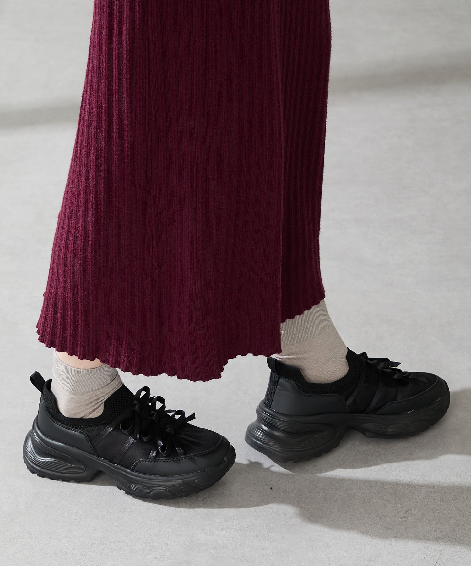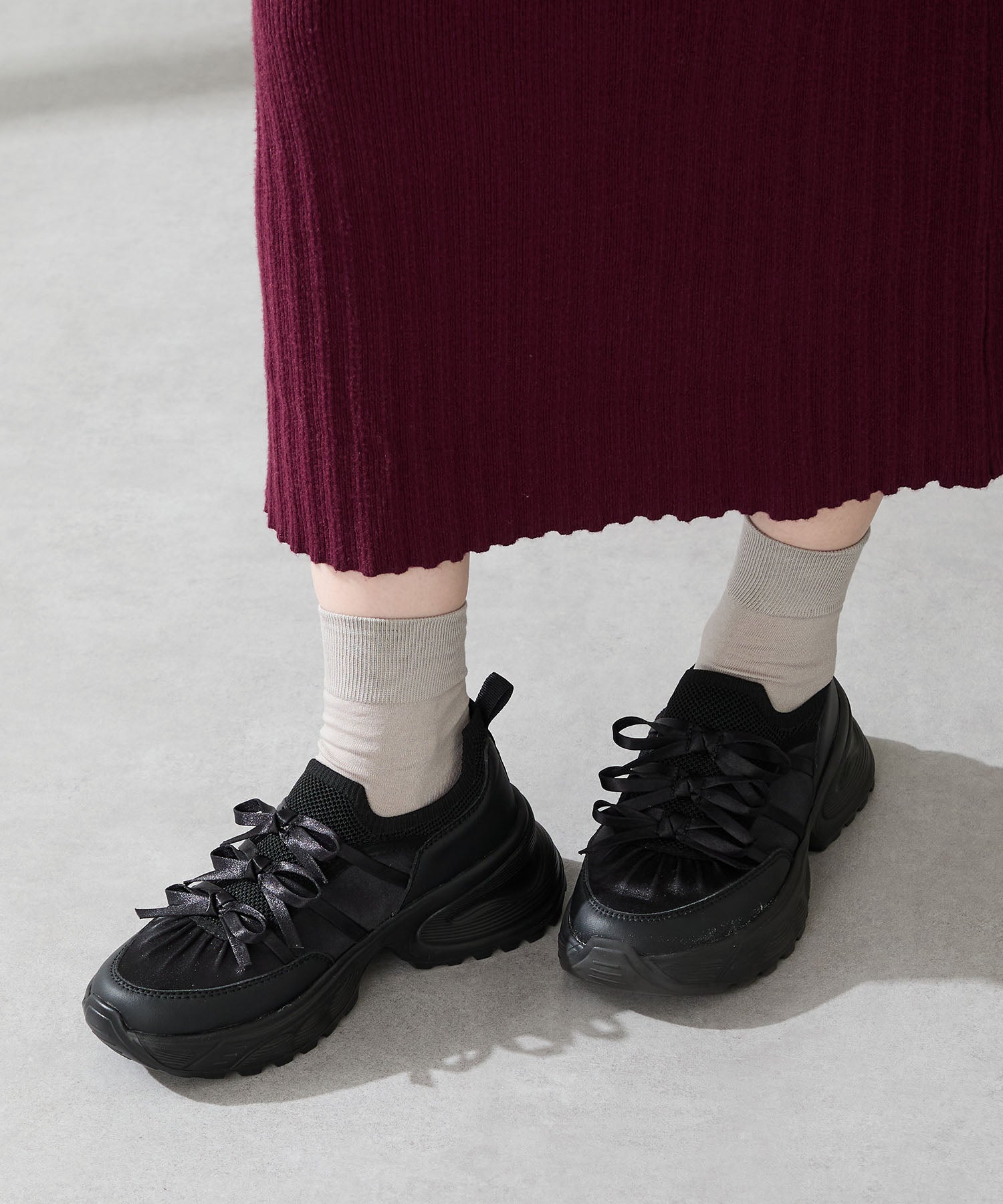 リボンディテールとギャザーがコーディネートに大人可愛い甘さをプラスしてくれる厚底スニーカー。しっかりホールドしてくれる履き口部分のニットは伸縮性がありフィット感も◎。カジュアルにも合わせられるブラックと、フェミニンコーデにぴったりな淡いグレーとピンクのカラバリも可愛い。ガーリーに履きたい方はミニ丈で、甘さをおさえたい方はロング丈のボトムで合わせるがおすすめ。