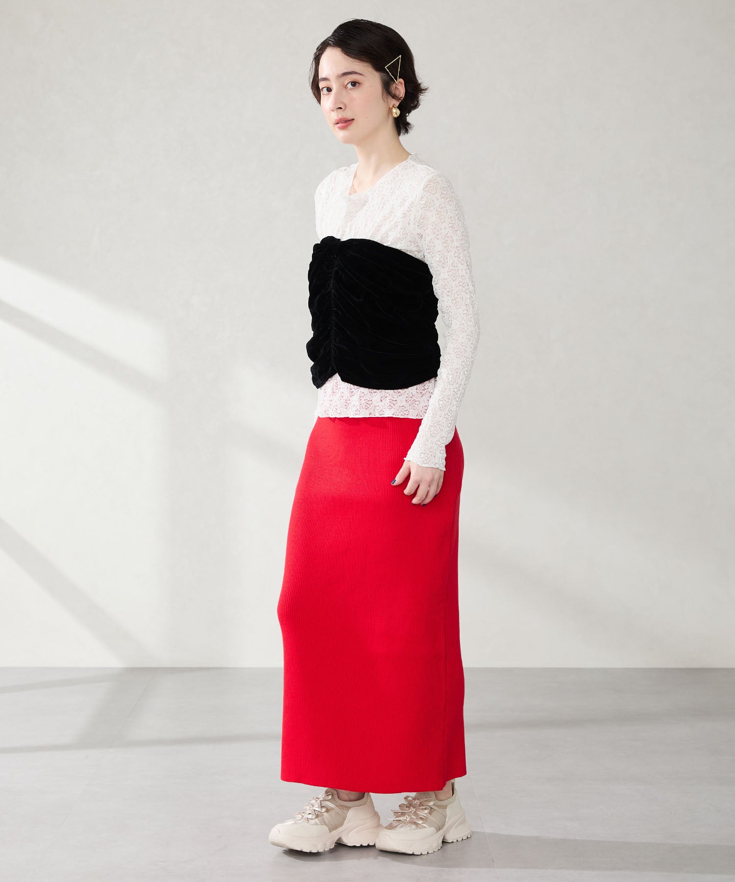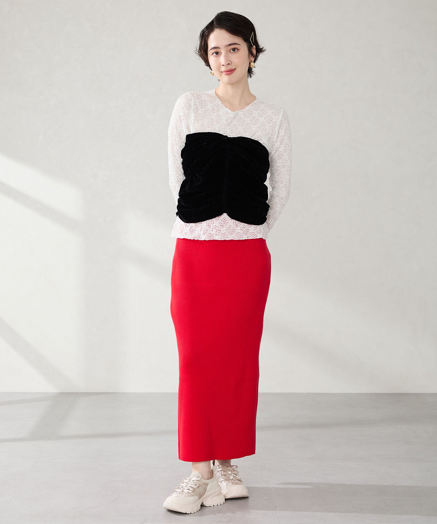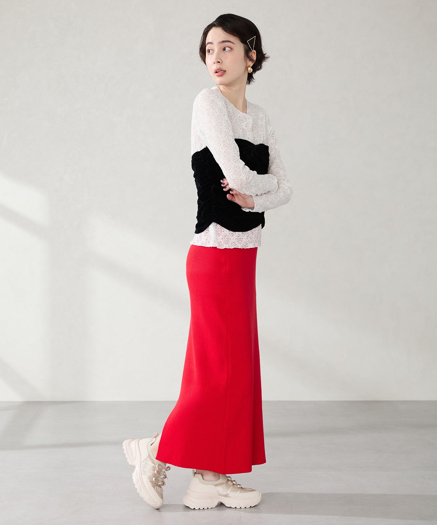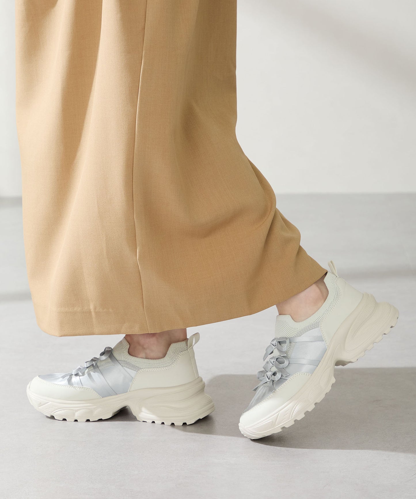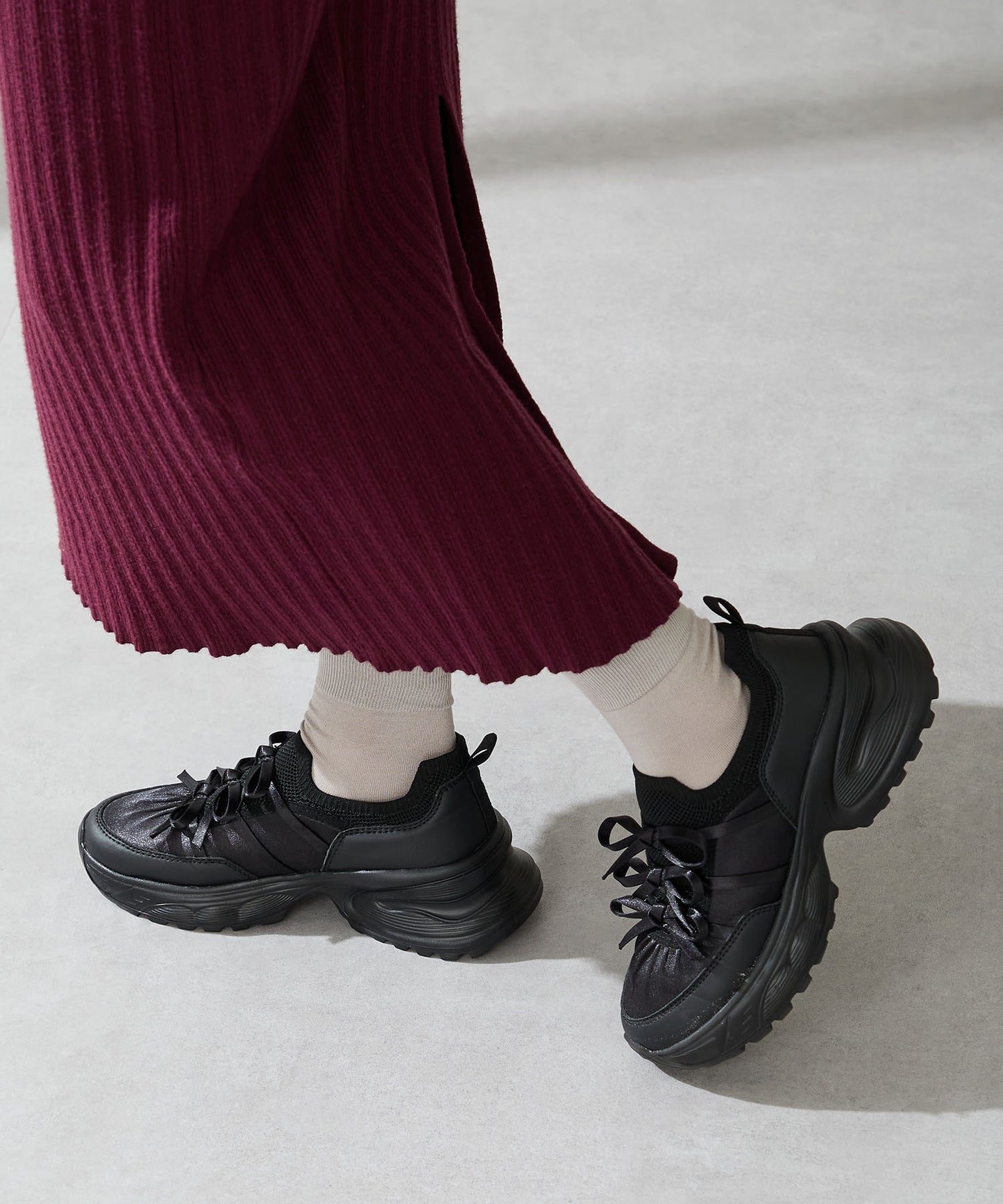リボンディテールとギャザーがコーディネートに大人可愛い甘さをプラスしてくれる厚底スニーカー。しっかりホールドしてくれる履き口部分のニットは伸縮性がありフィット感も◎。カジュアルにも合わせられるブラックと、フェミニンコーデにぴったりな淡いグレーとピンクのカラバリも可愛い。ガーリーに履きたい方はミニ丈で、甘さをおさえたい方はロング丈のボトムで合わせるがおすすめ。
