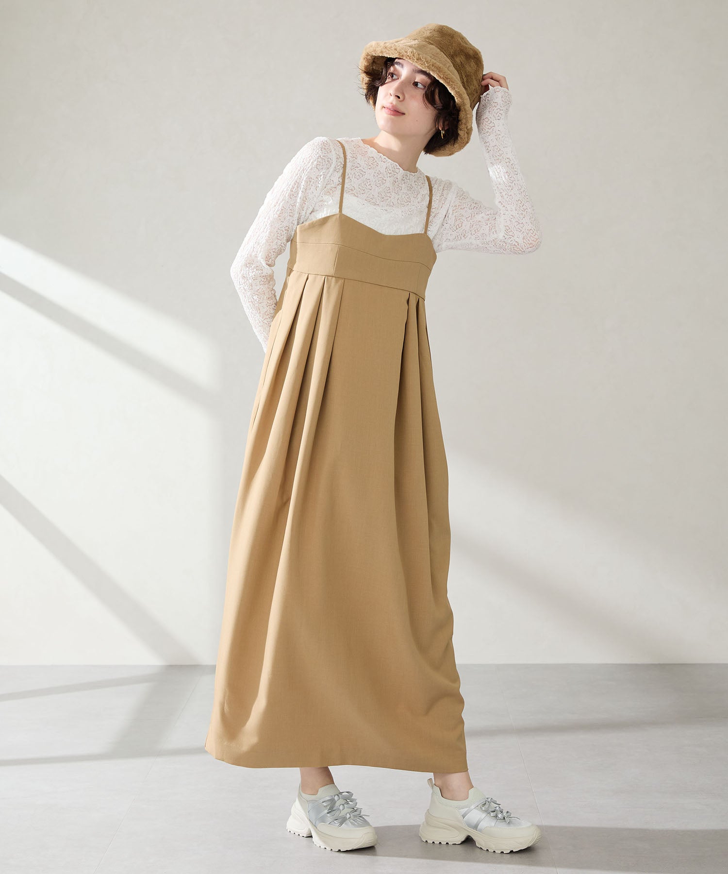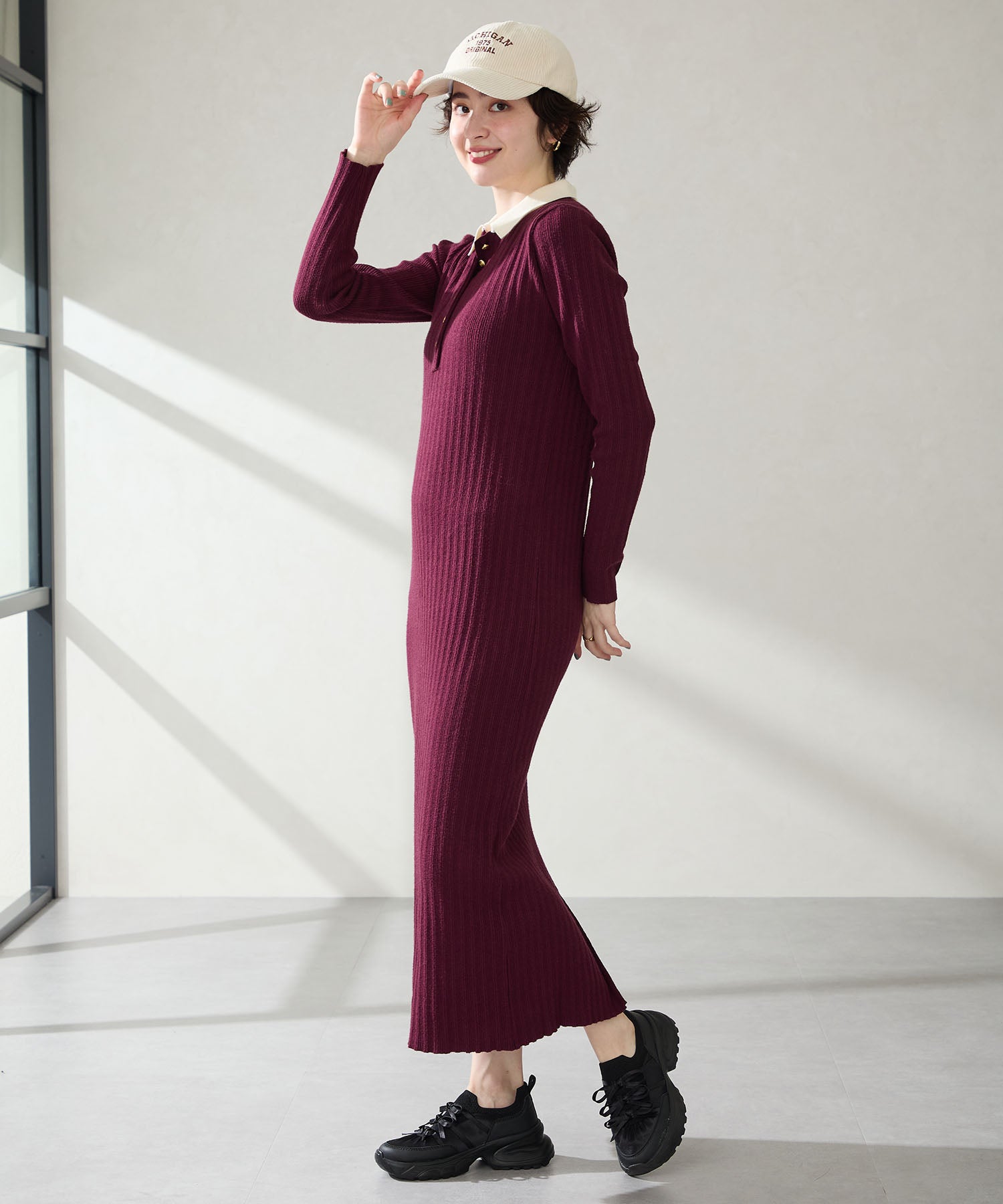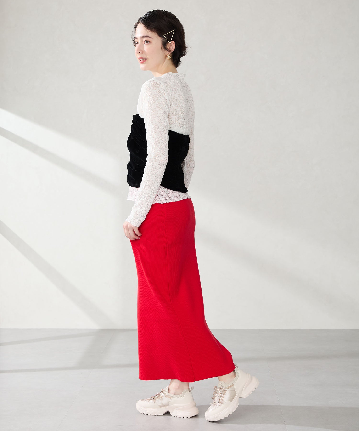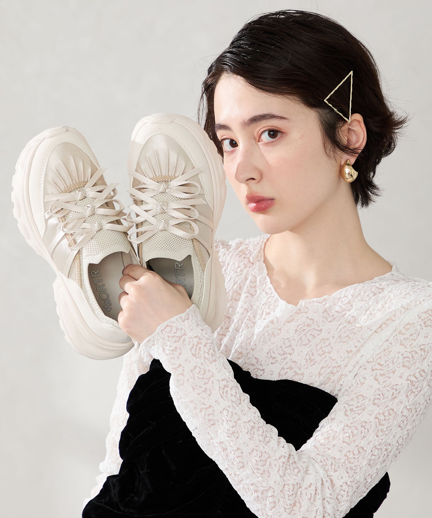 リボンディテールとギャザーがコーディネートに大人可愛い甘さをプラスしてくれる厚底スニーカー。しっかりホールドしてくれる履き口部分のニットは伸縮性がありフィット感も◎。カジュアルにも合わせられるブラックと、フェミニンコーデにぴったりな淡いグレーとピンクのカラバリも可愛い。ガーリーに履きたい方はミニ丈で、甘さをおさえたい方はロング丈のボトムで合わせるがおすすめ。