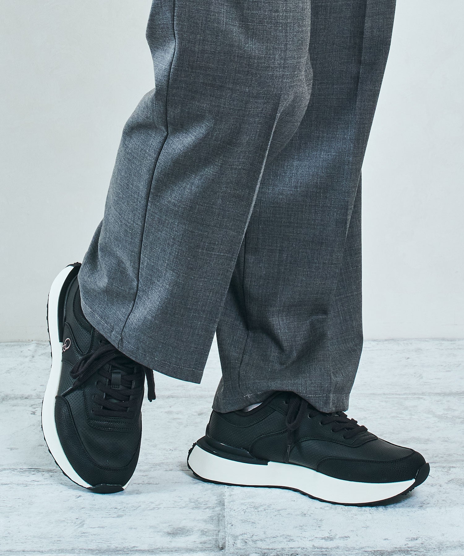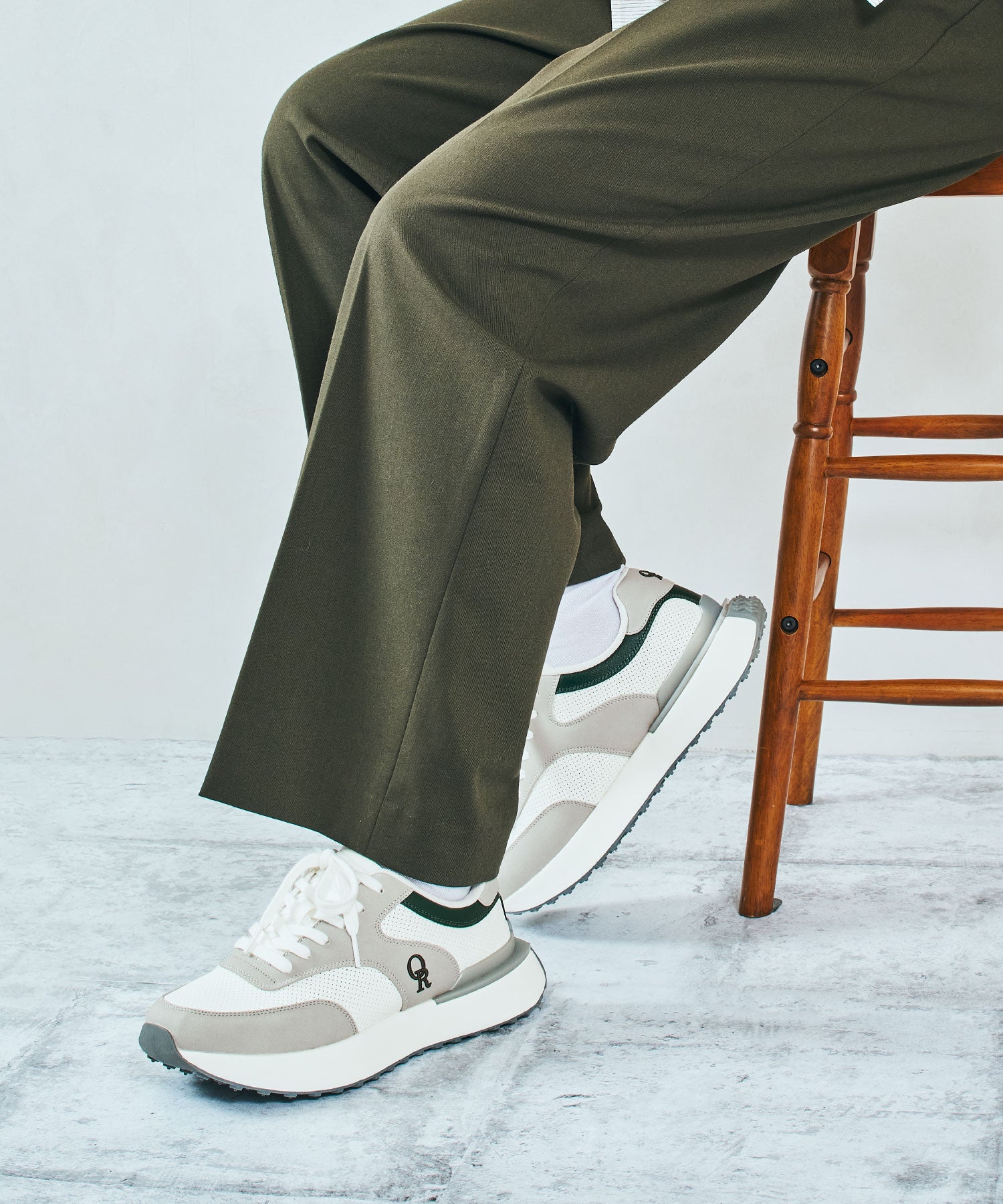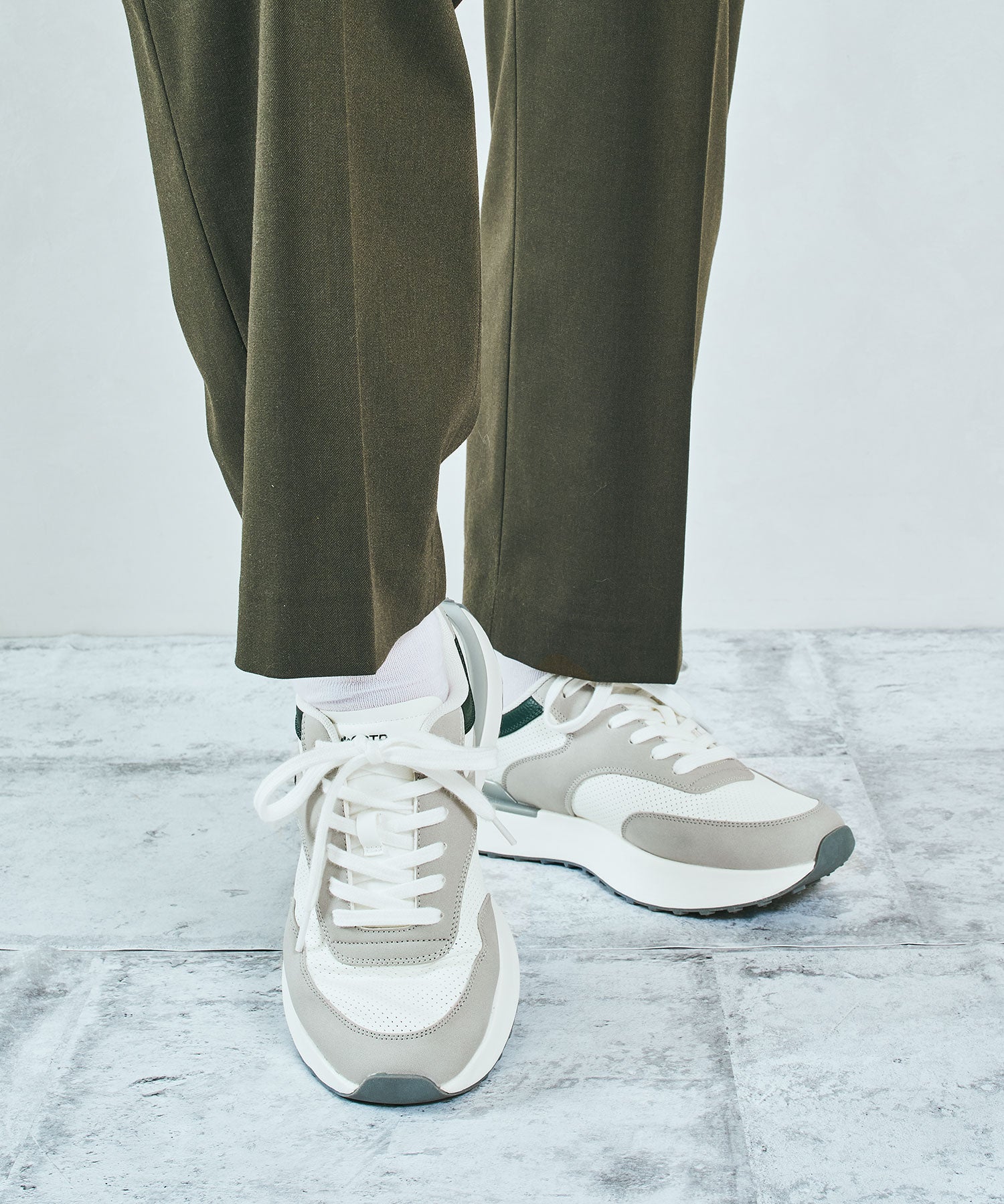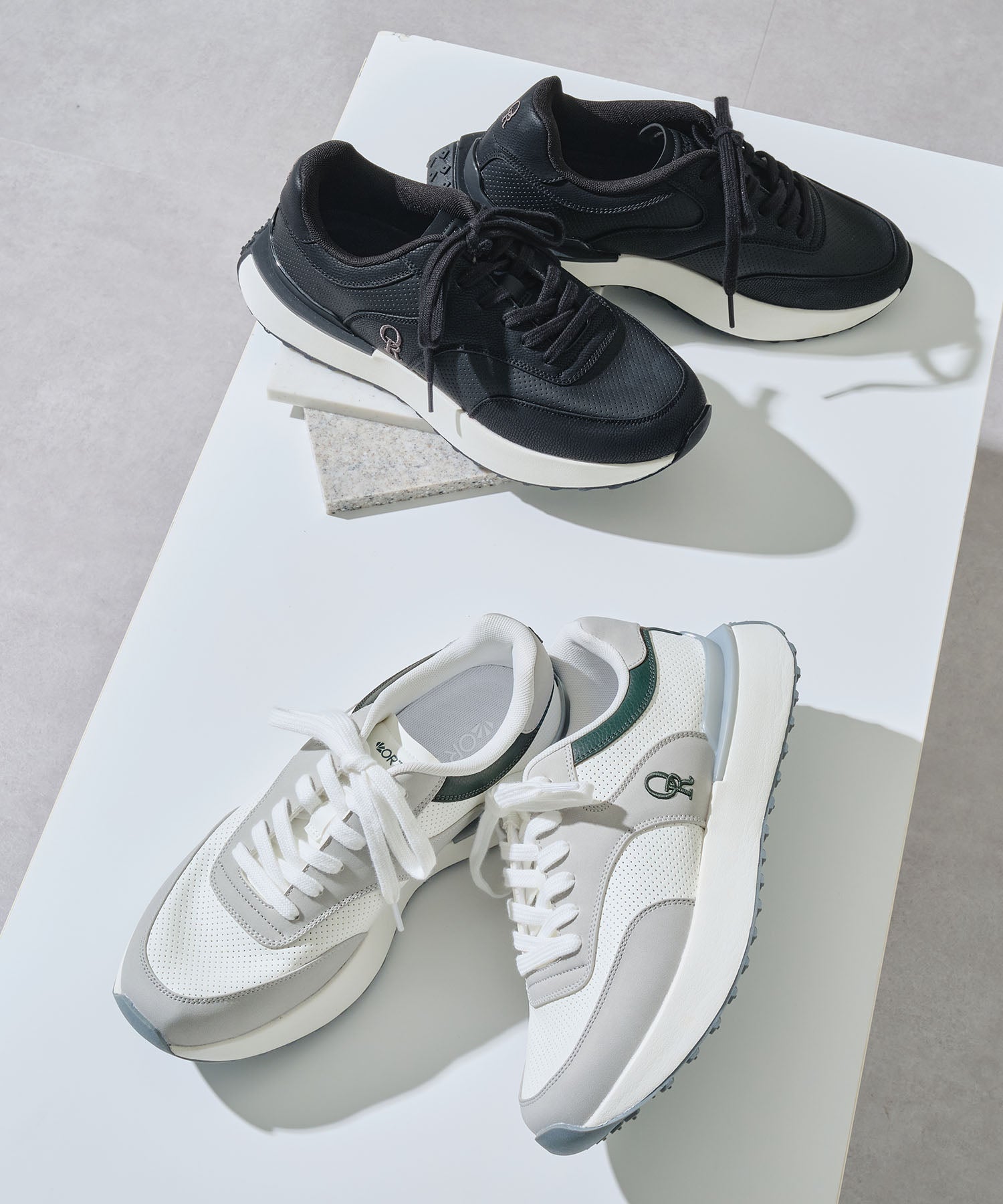 ミニマルなアッパーデザインに凹凸のあるボリュームソールやパンチングでアクティブな印象をプラスしたスニーカー。ワントーンでまとめたブラックはソールをホワイトカラーにすることで重たくなり過ぎず一年通して使いやすいカラー。ホワイトとの配色が爽やかなグレーはパーツやロゴでグリーンを取り入れることでこなれ感を演出。