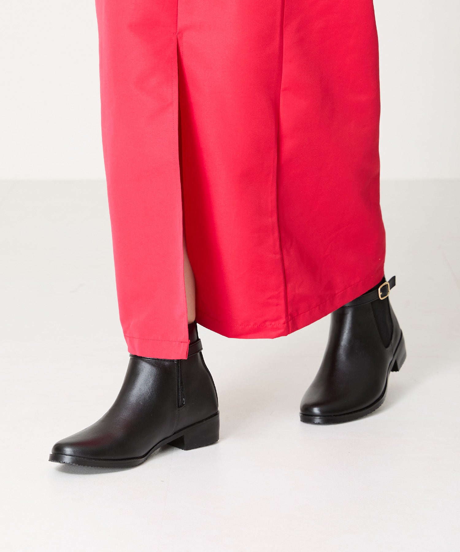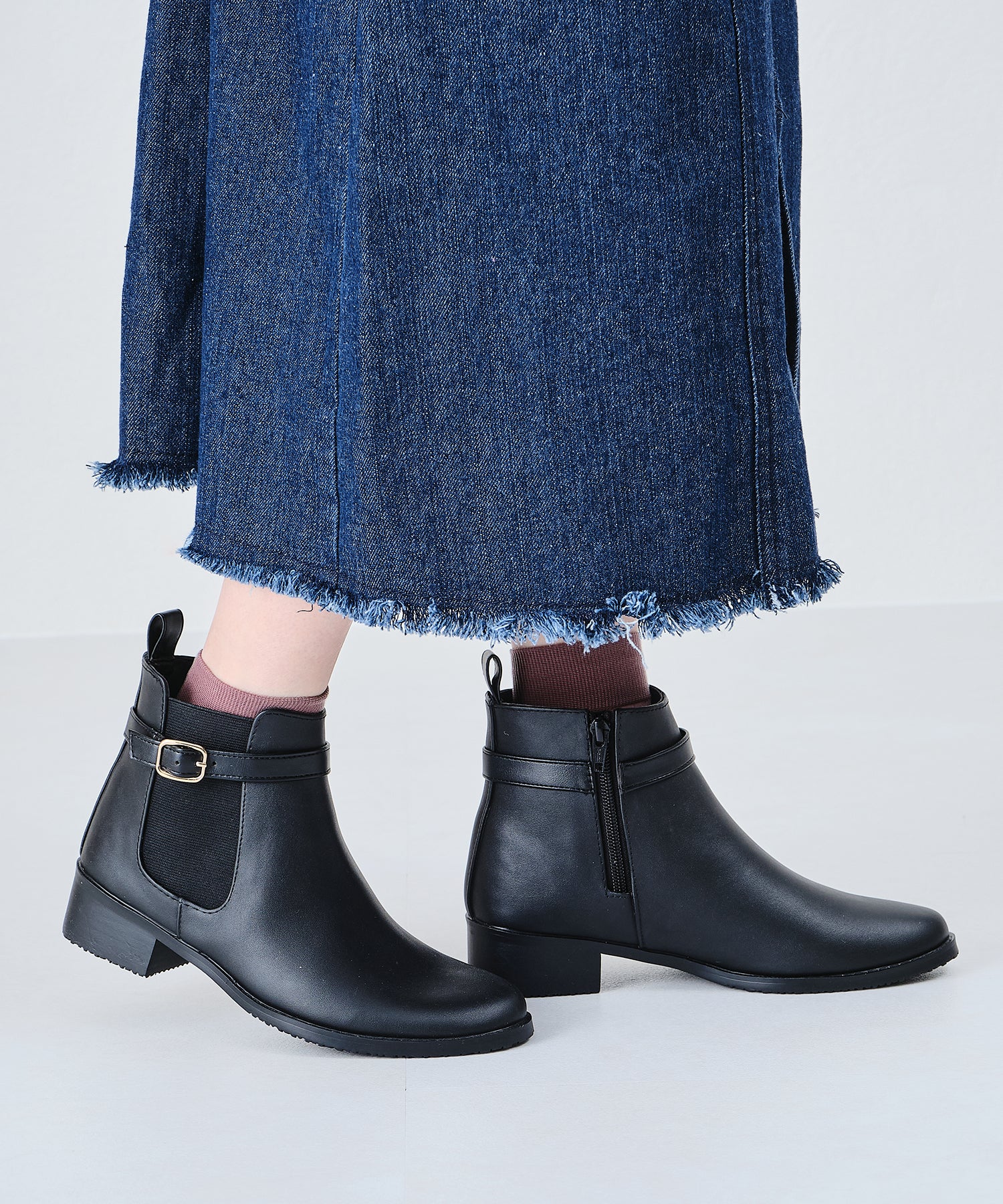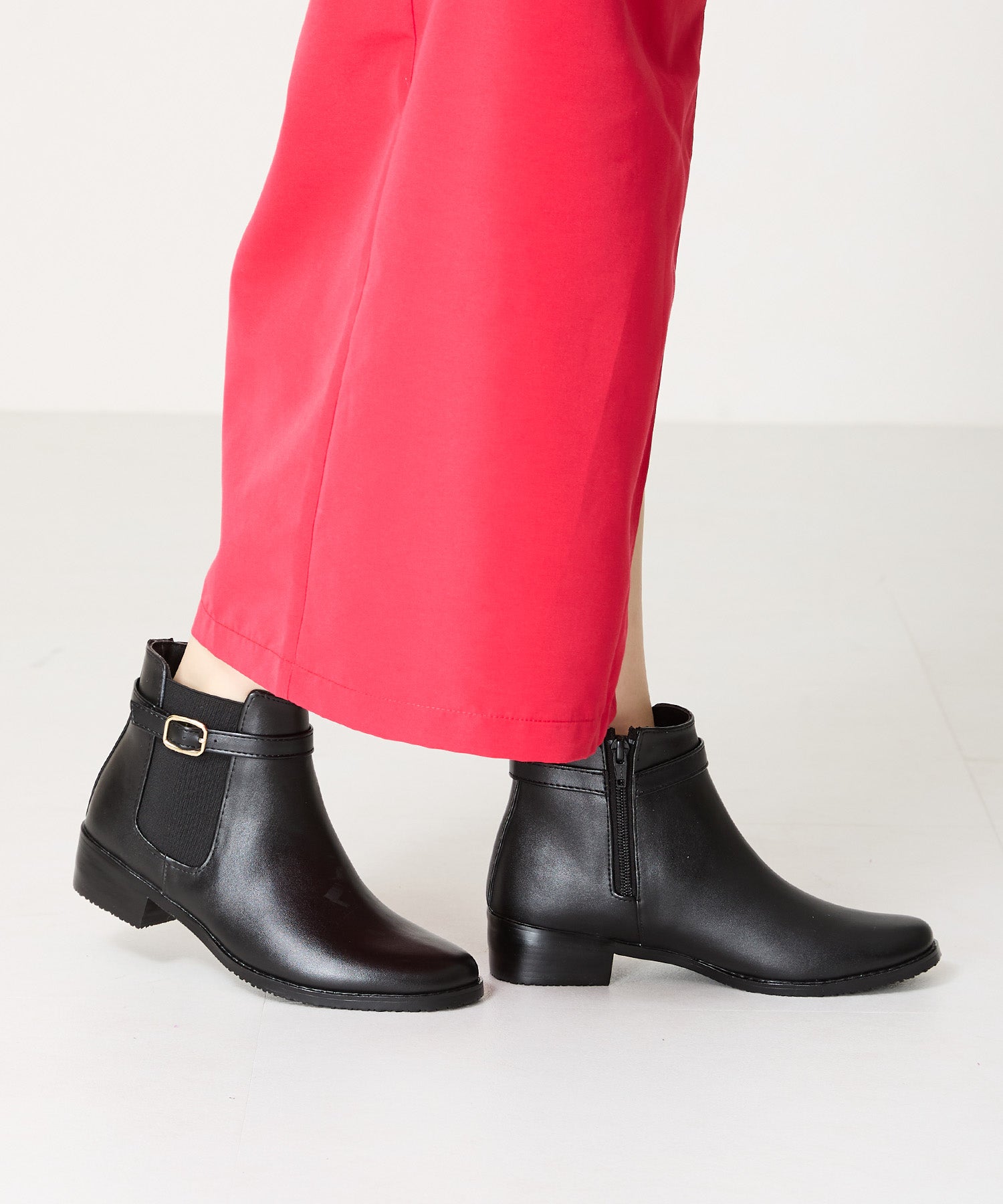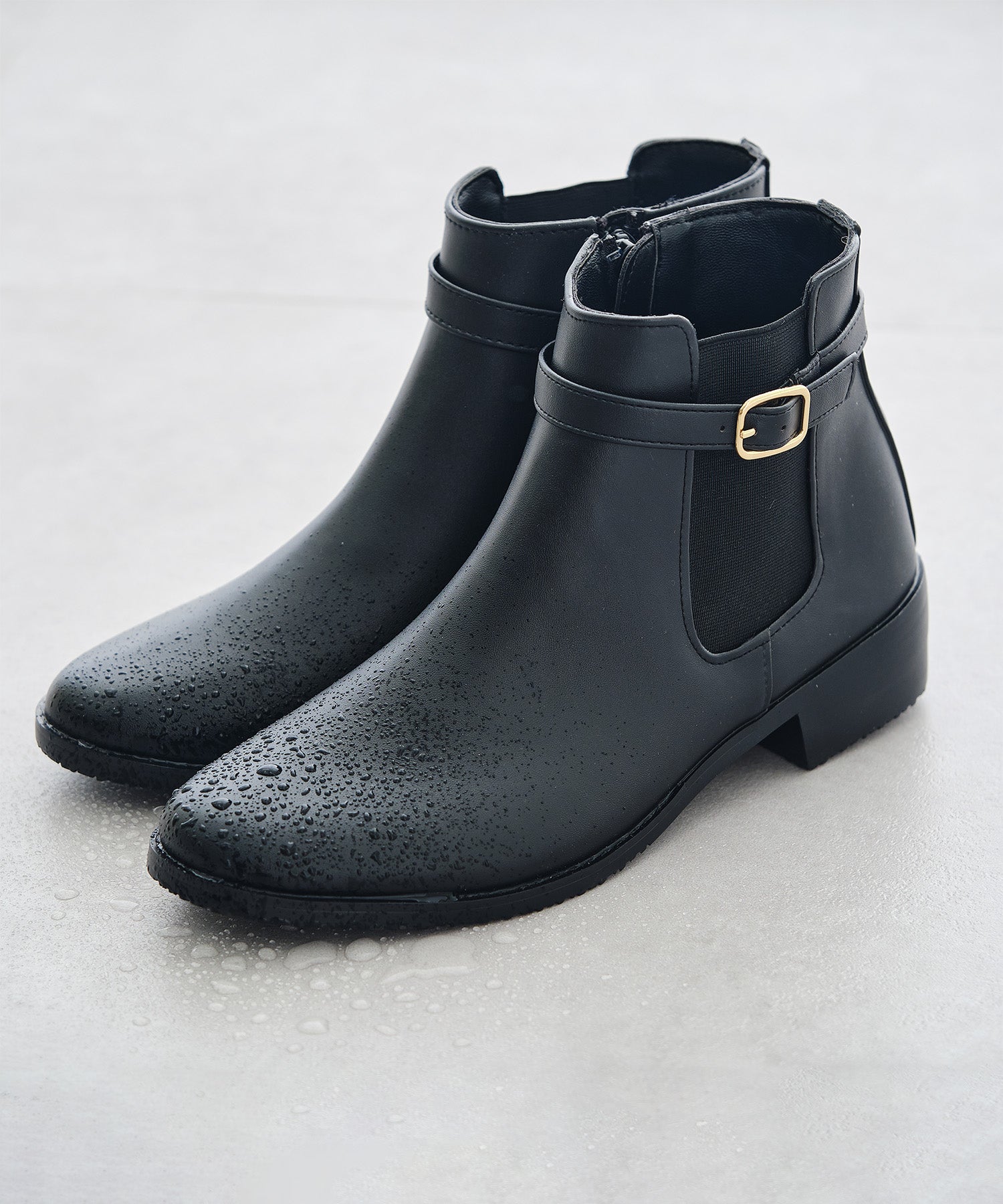 サイドの華奢なベルトとゴールドのバックルがポイントになり、レインブーツに見えないので晴雨兼用で履けるのが嬉しいアイテム。ファスナー位置を調整したことで浸水しにくく、雨の日も安心して履ける1足。ソールは滑りにくい仕様にオリジナルで設計。