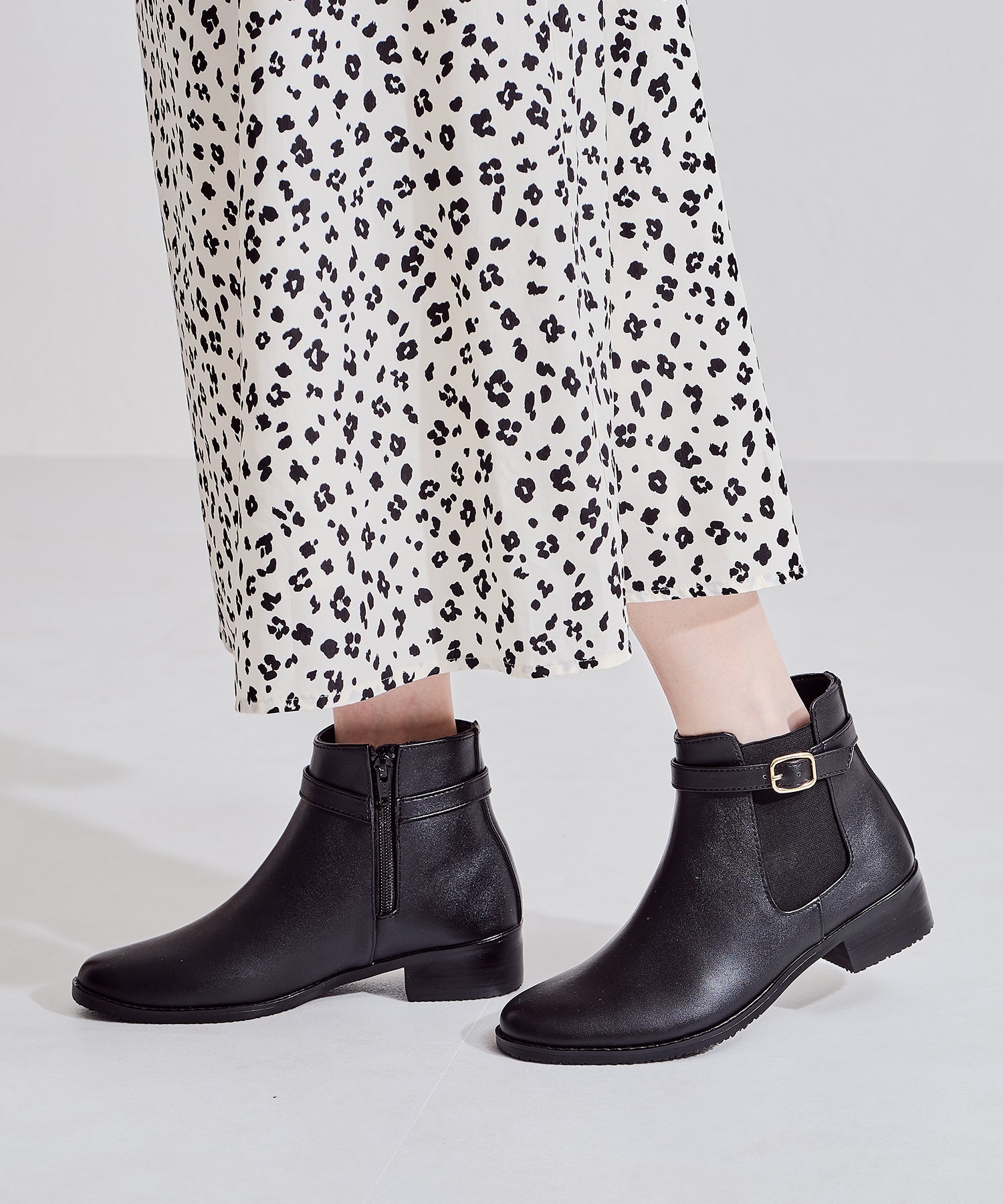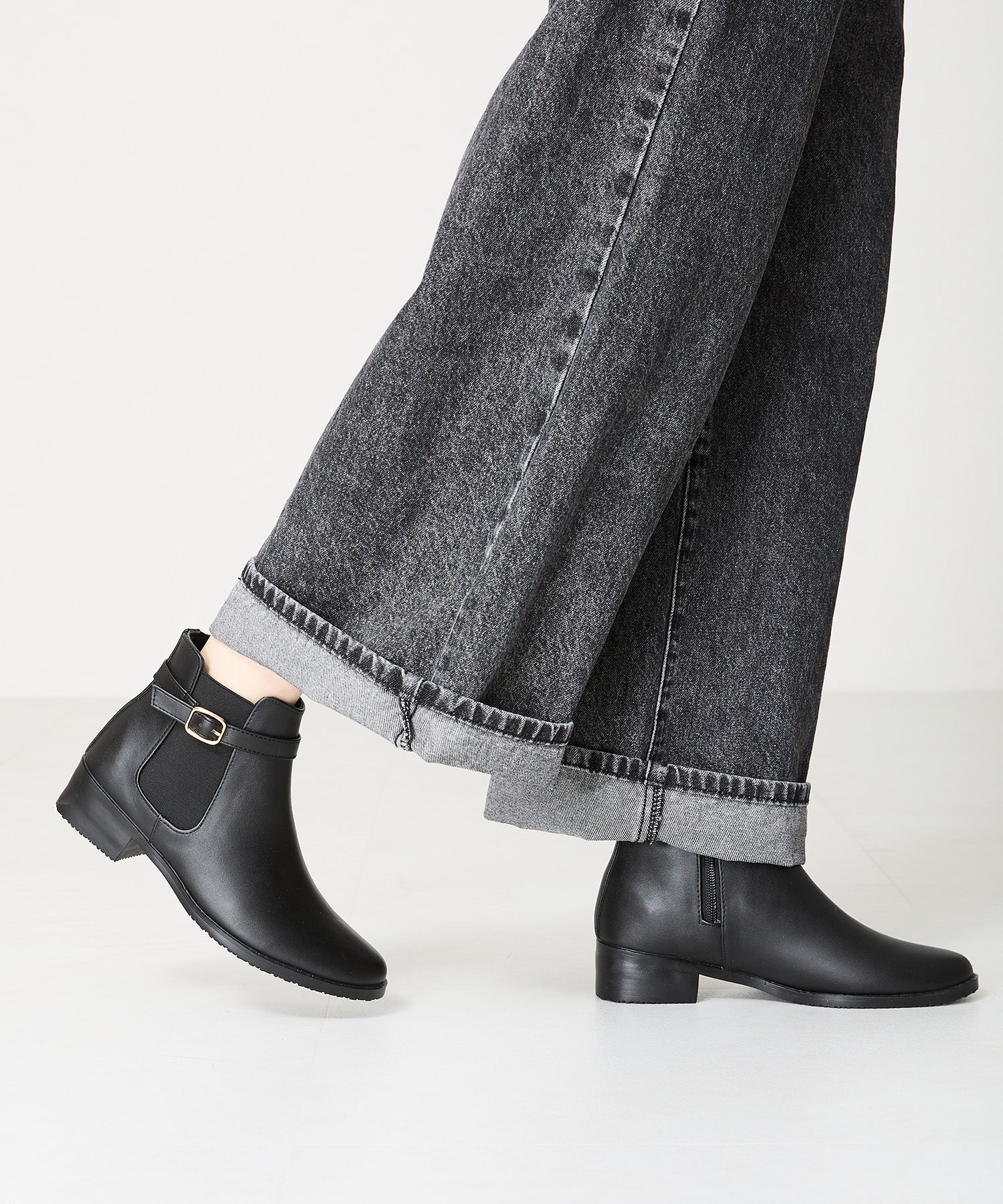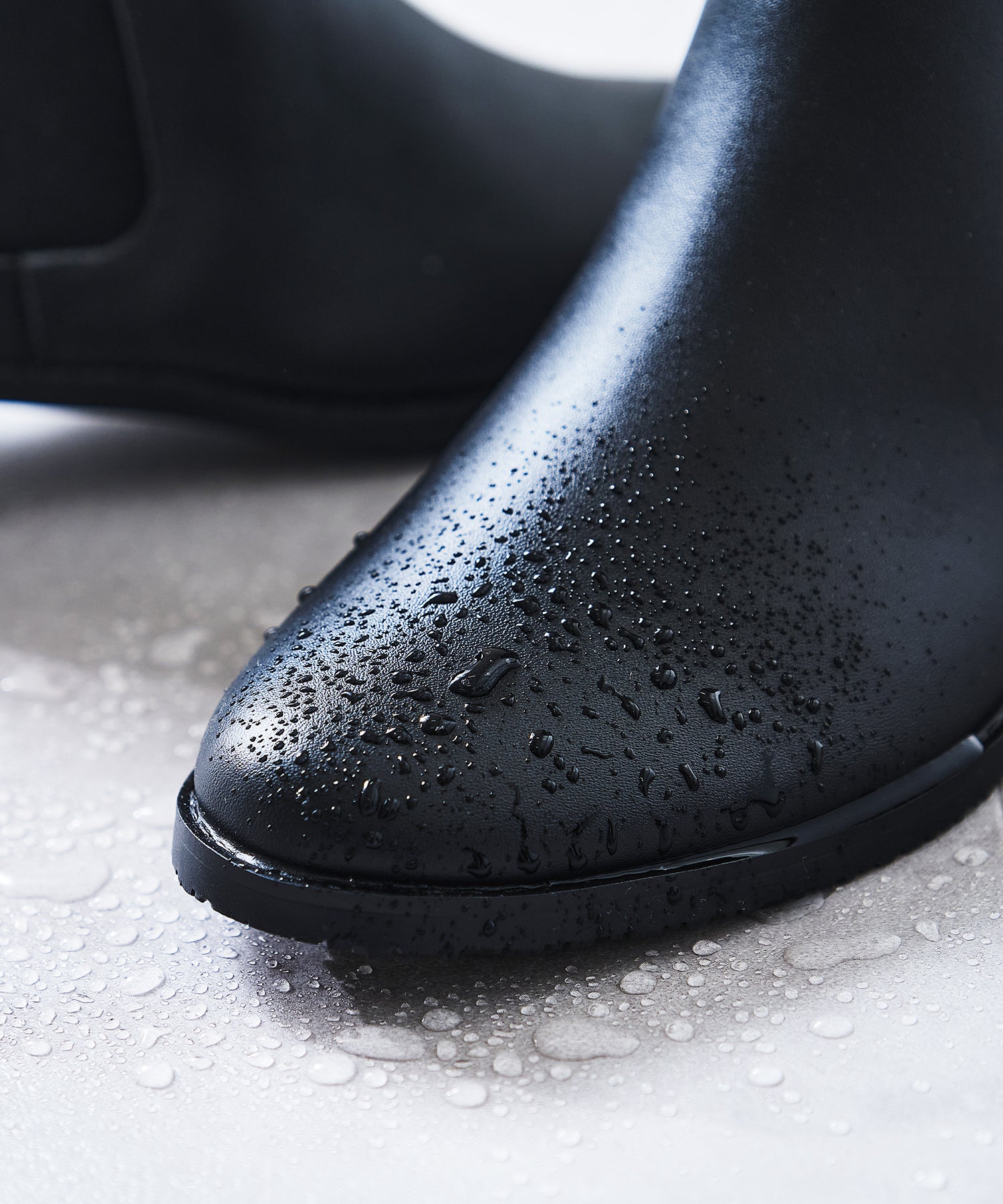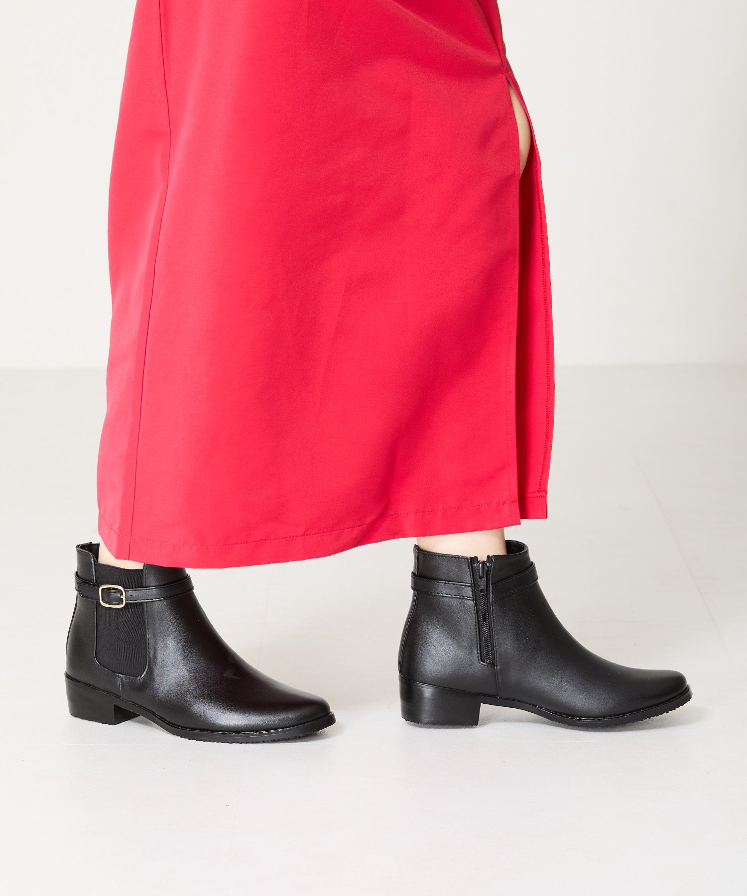 サイドの華奢なベルトとゴールドのバックルがポイントになり、レインブーツに見えないので晴雨兼用で履けるのが嬉しいアイテム。ファスナー位置を調整したことで浸水しにくく、雨の日も安心して履ける1足。ソールは滑りにくい仕様にオリジナルで設計。