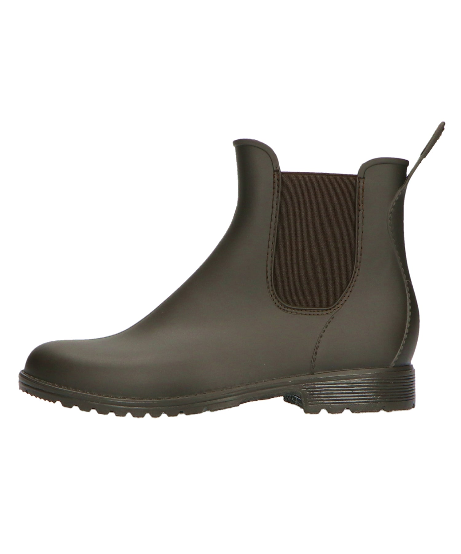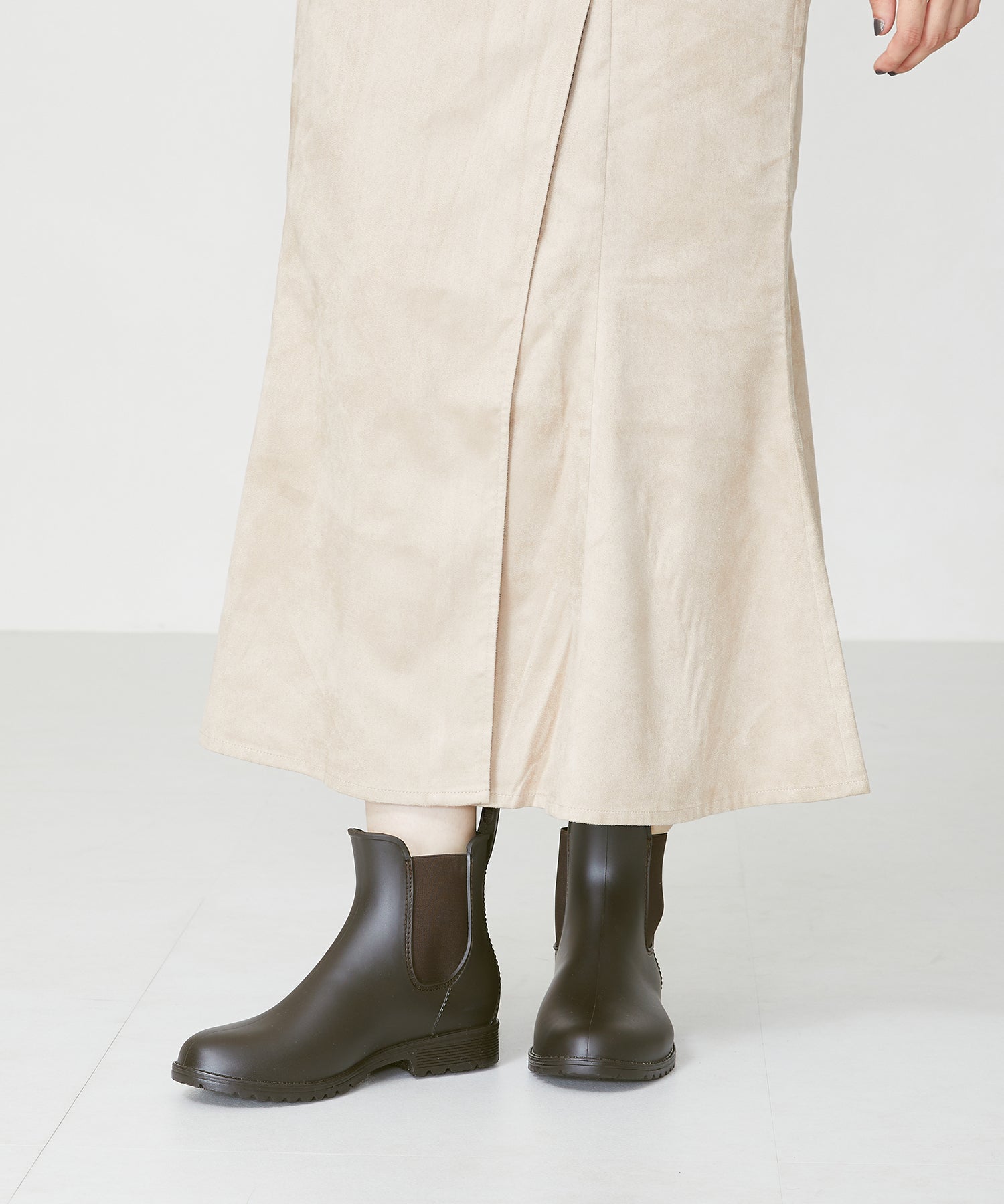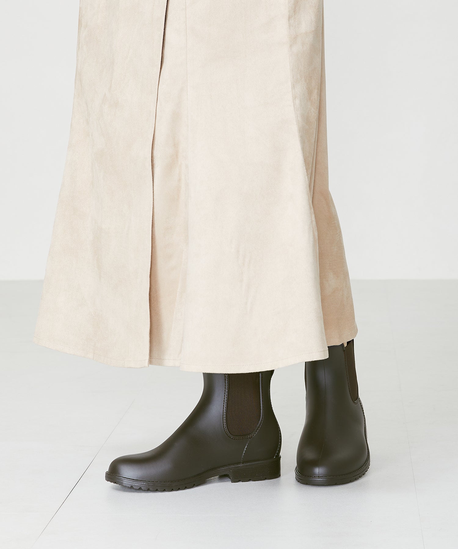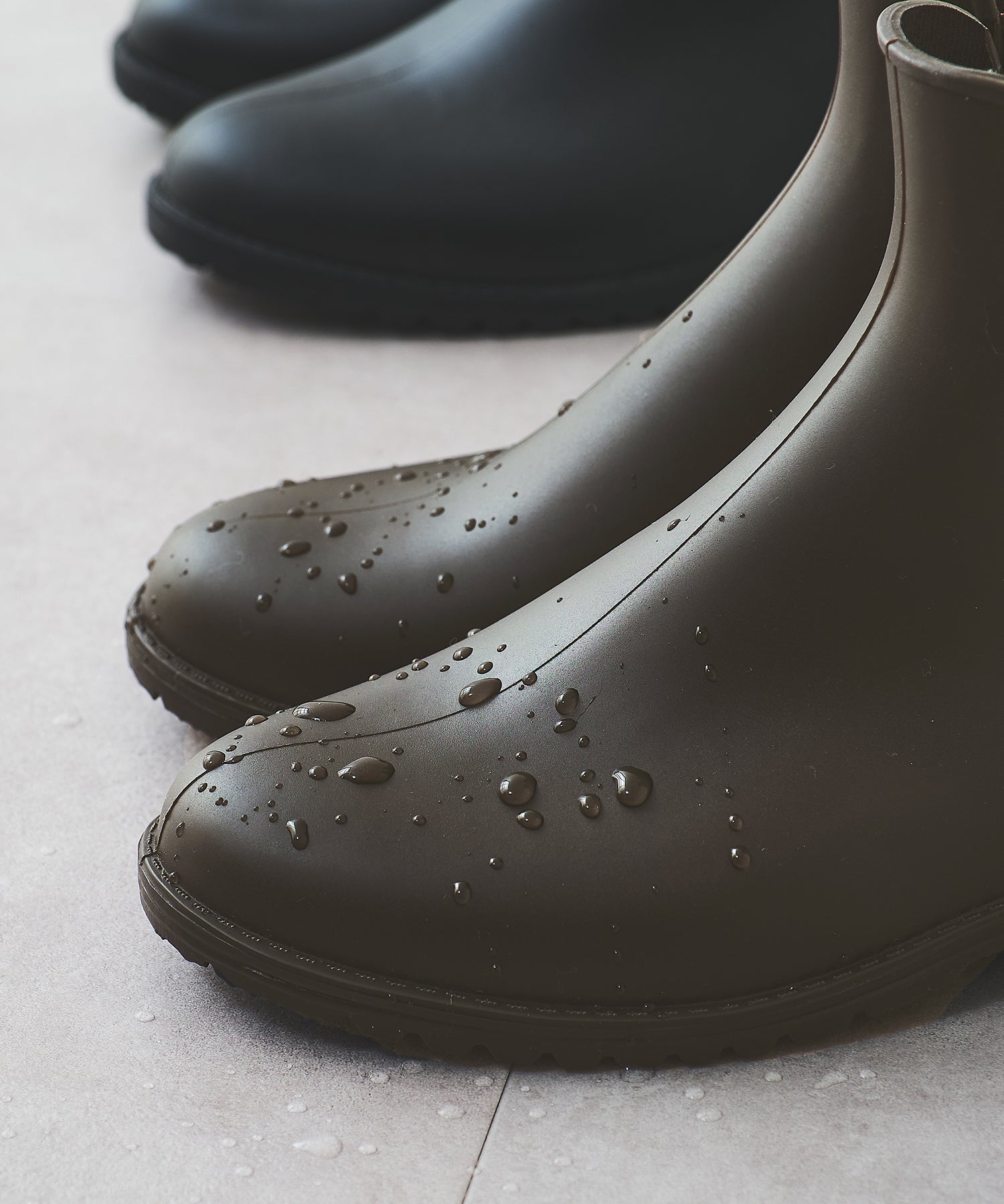 マットな素材感で普段履きとしても使いやすい晴雨兼用のレインブーツは、踵の切替デザインやコバにステッチを入れるなどこだわり満載。ゴア位置を高めにすることで浸水しにくい仕様に。ソールは滑りにくいように加工や凹凸を施し、雨の日でも安心して履ける。