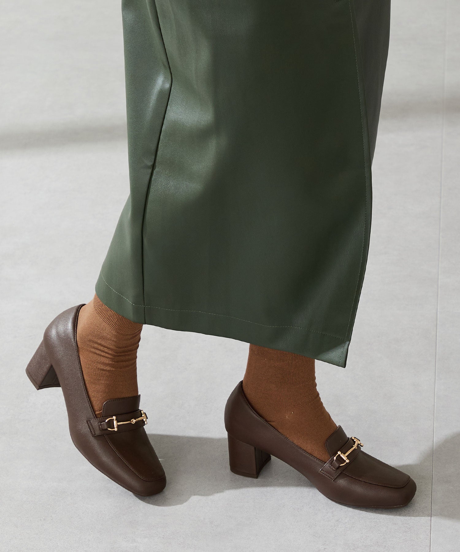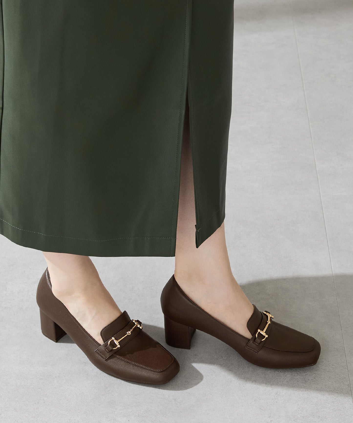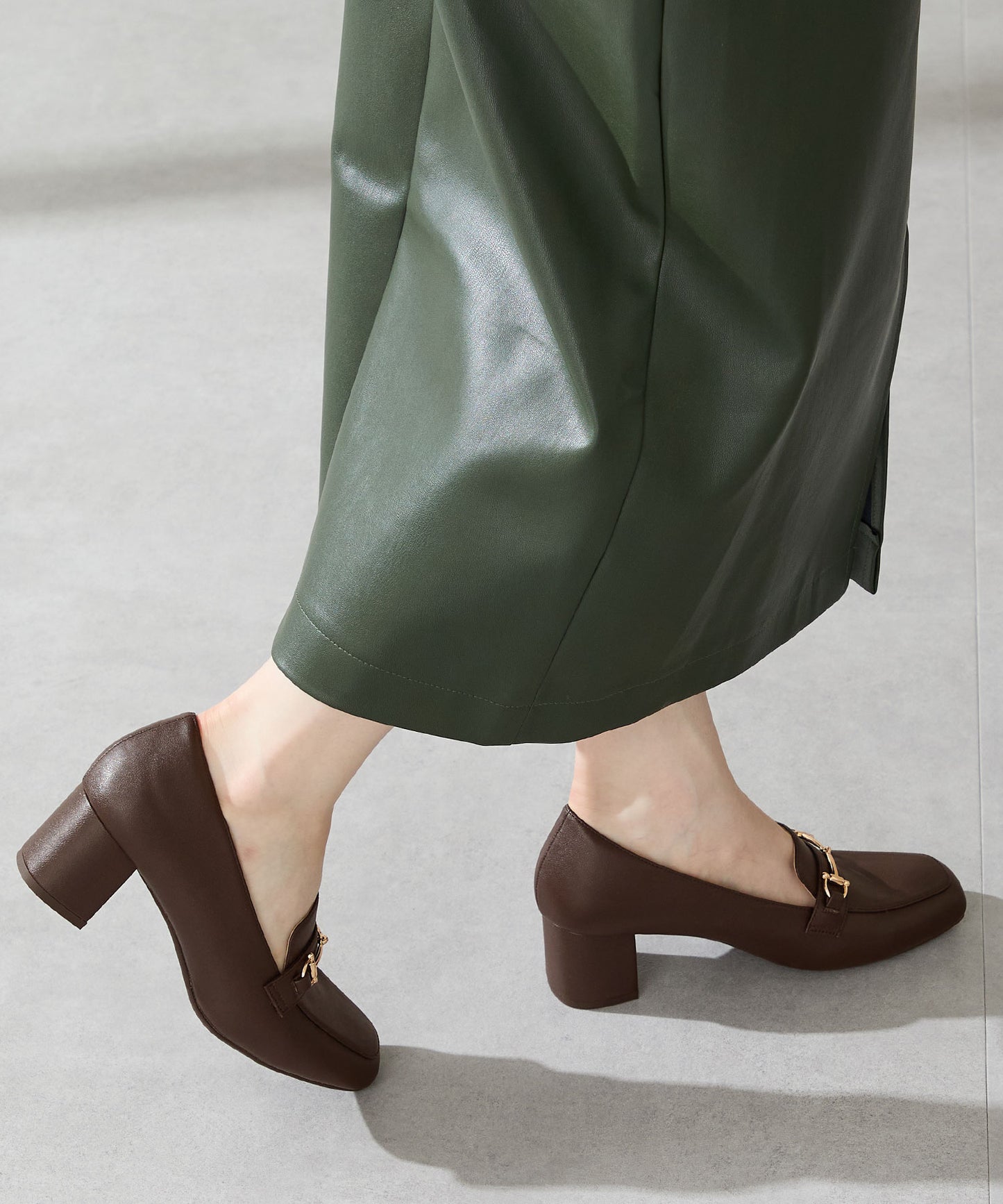 丸みのあるスクエアトゥが女性らしいヒールローファーは、履きやすさとシルエットにとことんこだわったアイテム。インソールに施された厚手のクッションが足の負担を軽減してくれるだけでなく、深めの履き口と踵クッションで脱げにくく、ヒール初心者でも挑戦しやすいのが嬉しいポイント。オンオフ問わず使えるデザインとカラバリで履き回し力も抜群。