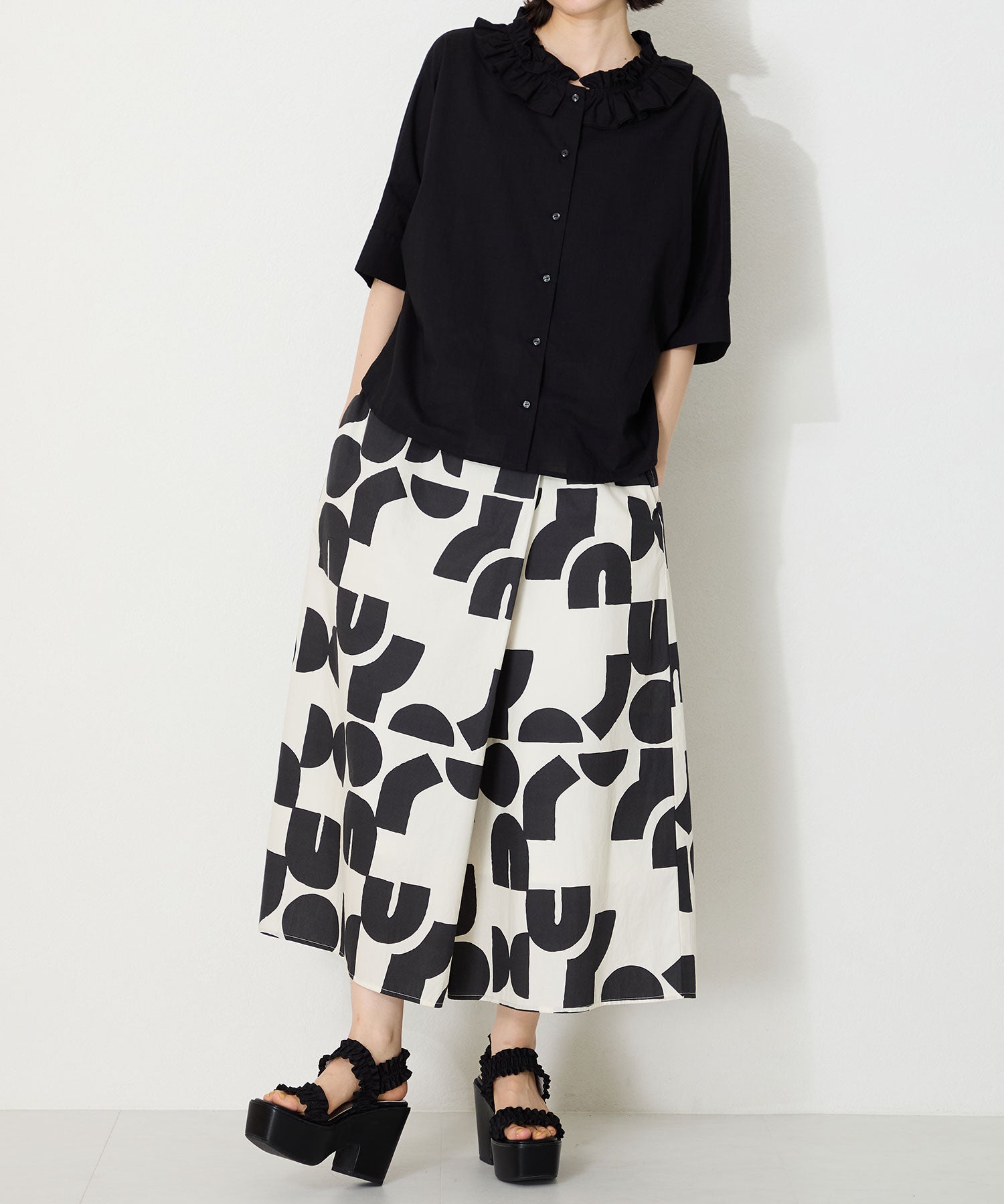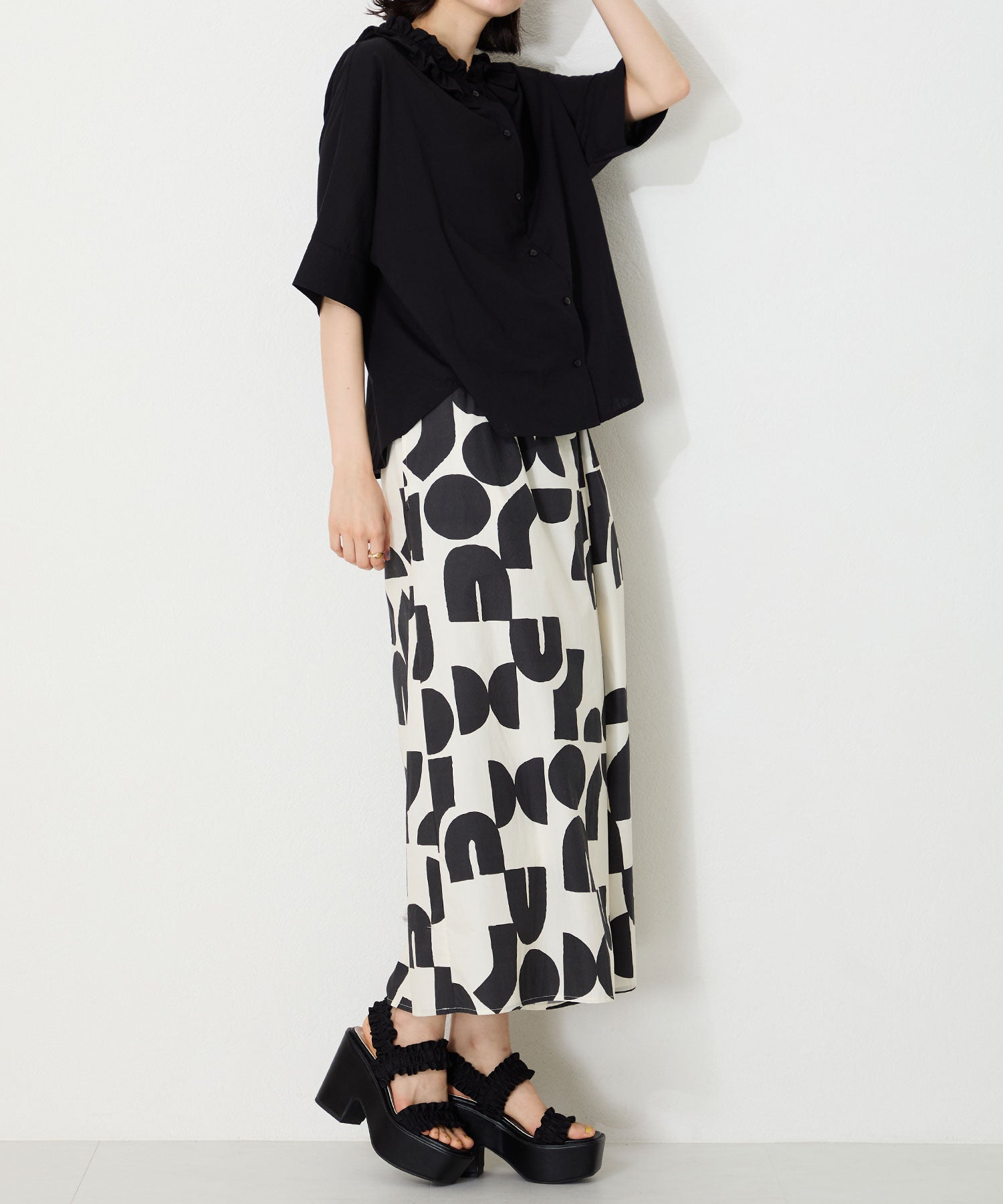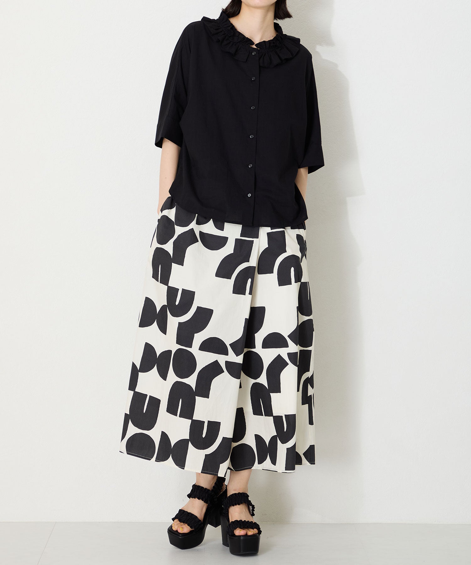フリルデザインがキュートなサンダルは、11.8cmの厚底ヒールでスタイルアップが叶いつつ、高低差が少なく安定感のある履き心地。ベルト幅が広いので足をしっかりと固定してくれるのと、踵ベルトが伸縮するので着脱も簡単。普段のスタイリングに取り入れるだけでお洒落に決まる1足は、素足はもちろんトレンド感のあるシースルー靴下と合わせるのもおすすめ。
