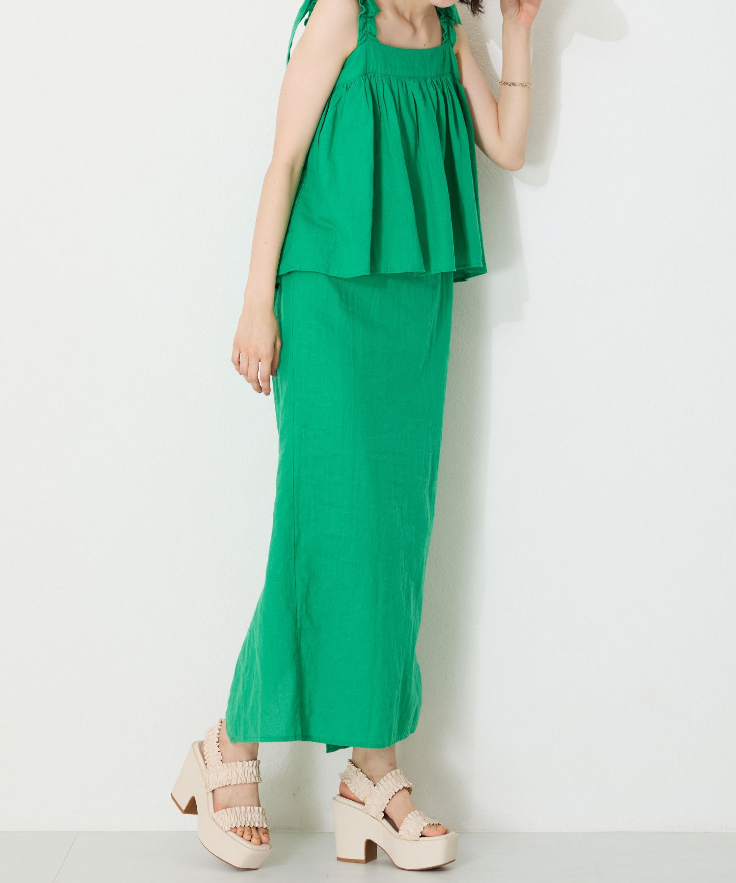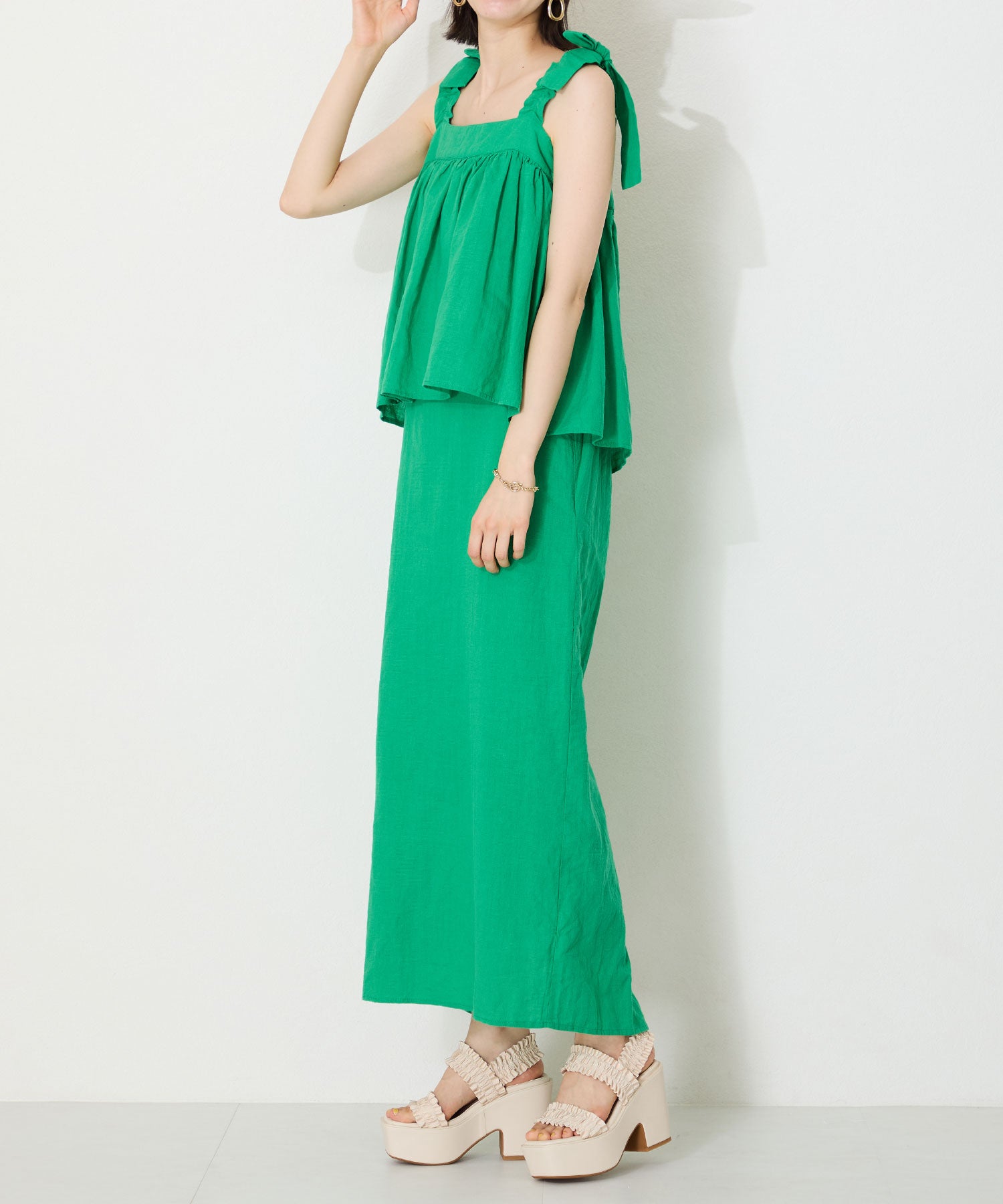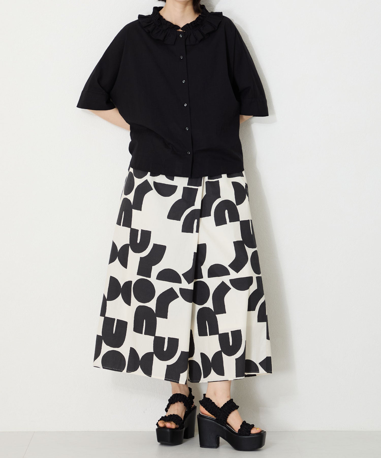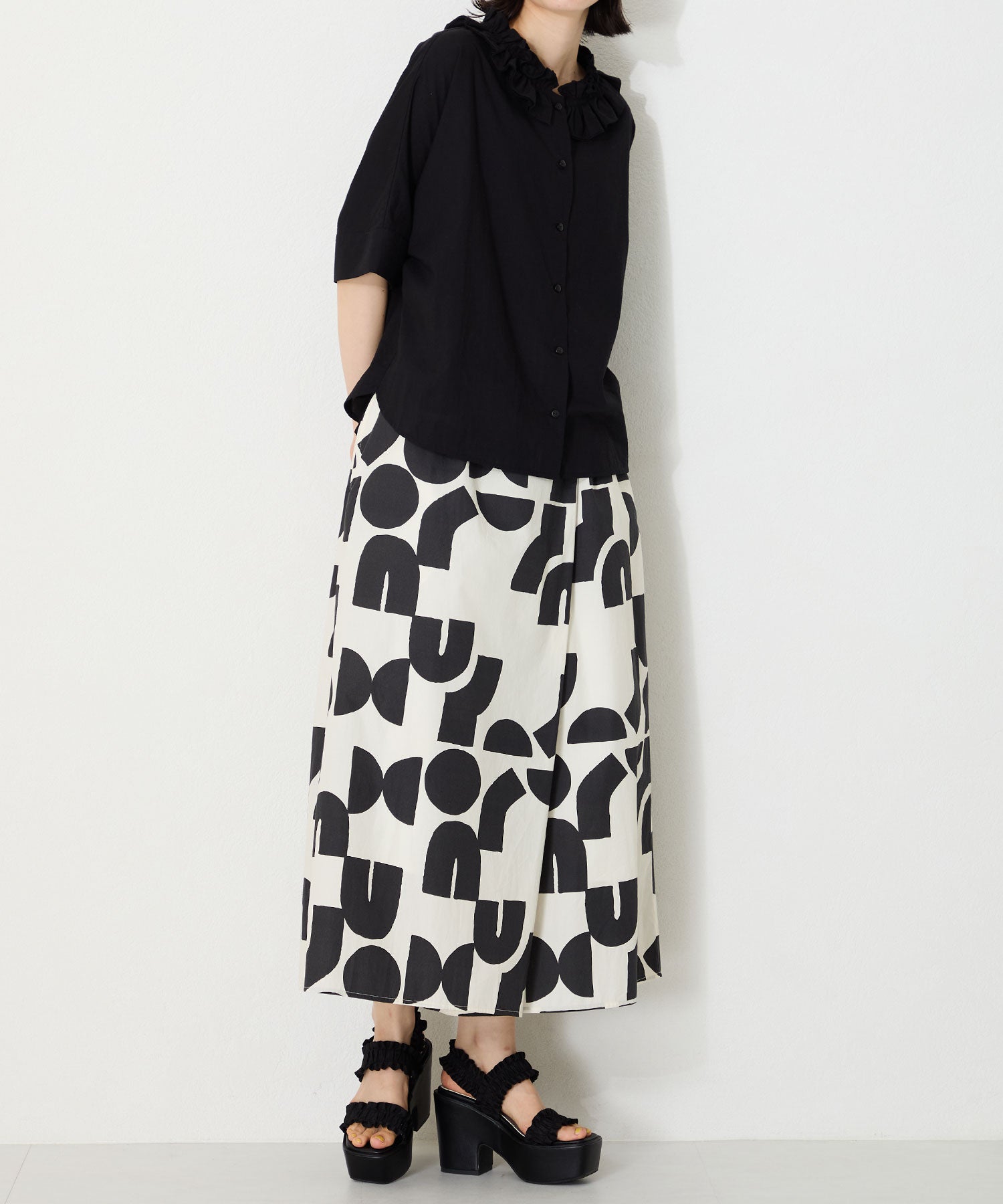 フリルデザインがキュートなサンダルは、11.8cmの厚底ヒールでスタイルアップが叶いつつ、高低差が少なく安定感のある履き心地。ベルト幅が広いので足をしっかりと固定してくれるのと、踵ベルトが伸縮するので着脱も簡単。普段のスタイリングに取り入れるだけでお洒落に決まる1足は、素足はもちろんトレンド感のあるシースルー靴下と合わせるのもおすすめ。