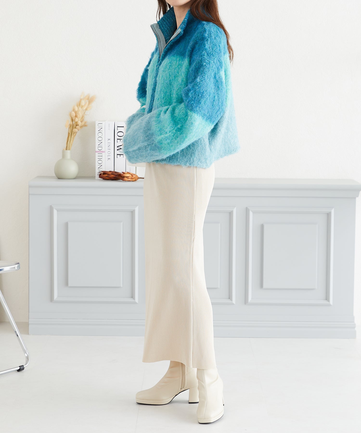 ふんわりとした温かみのある風合いのファー素材と愛らしいグラデーションカラーが魅力のスタンドニットブルゾン。ゆったりとした見ごろでボリュームがありつつもコンパクトな着丈が今年らしいバランスに。逆開ファスナーなのでスタイリングに合わせて雰囲気を変えて楽めるアイテム。