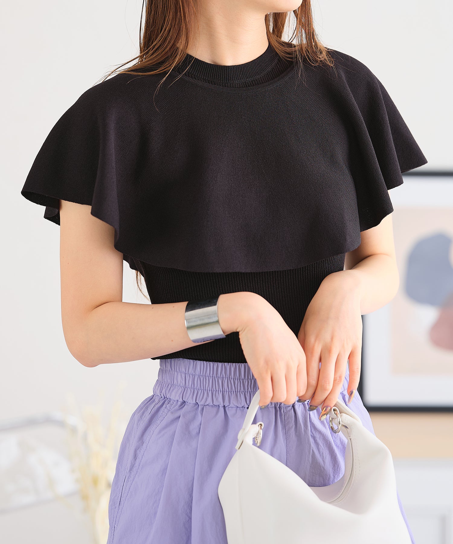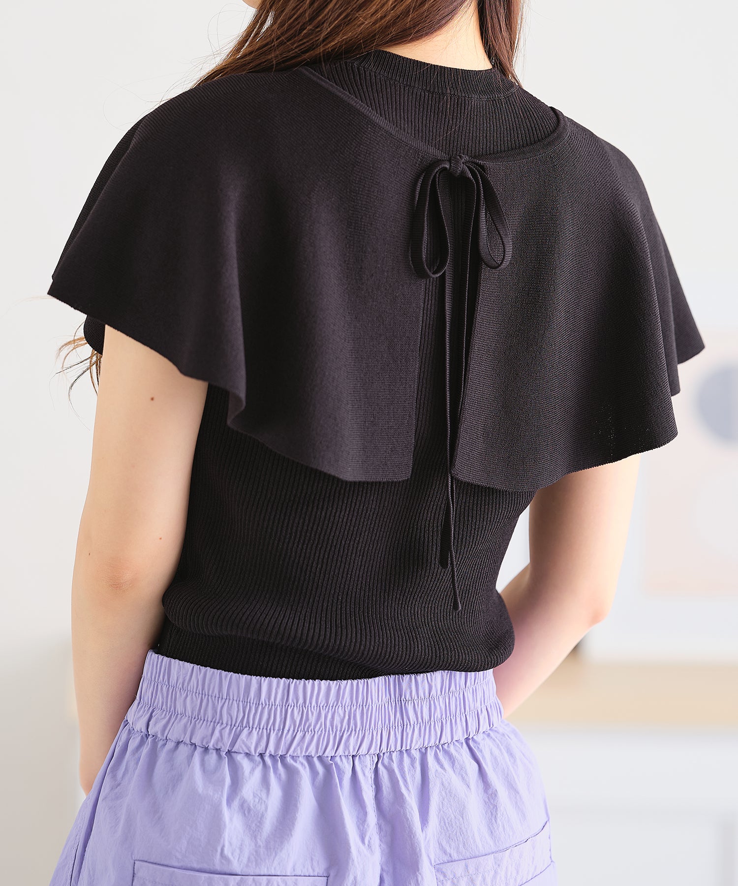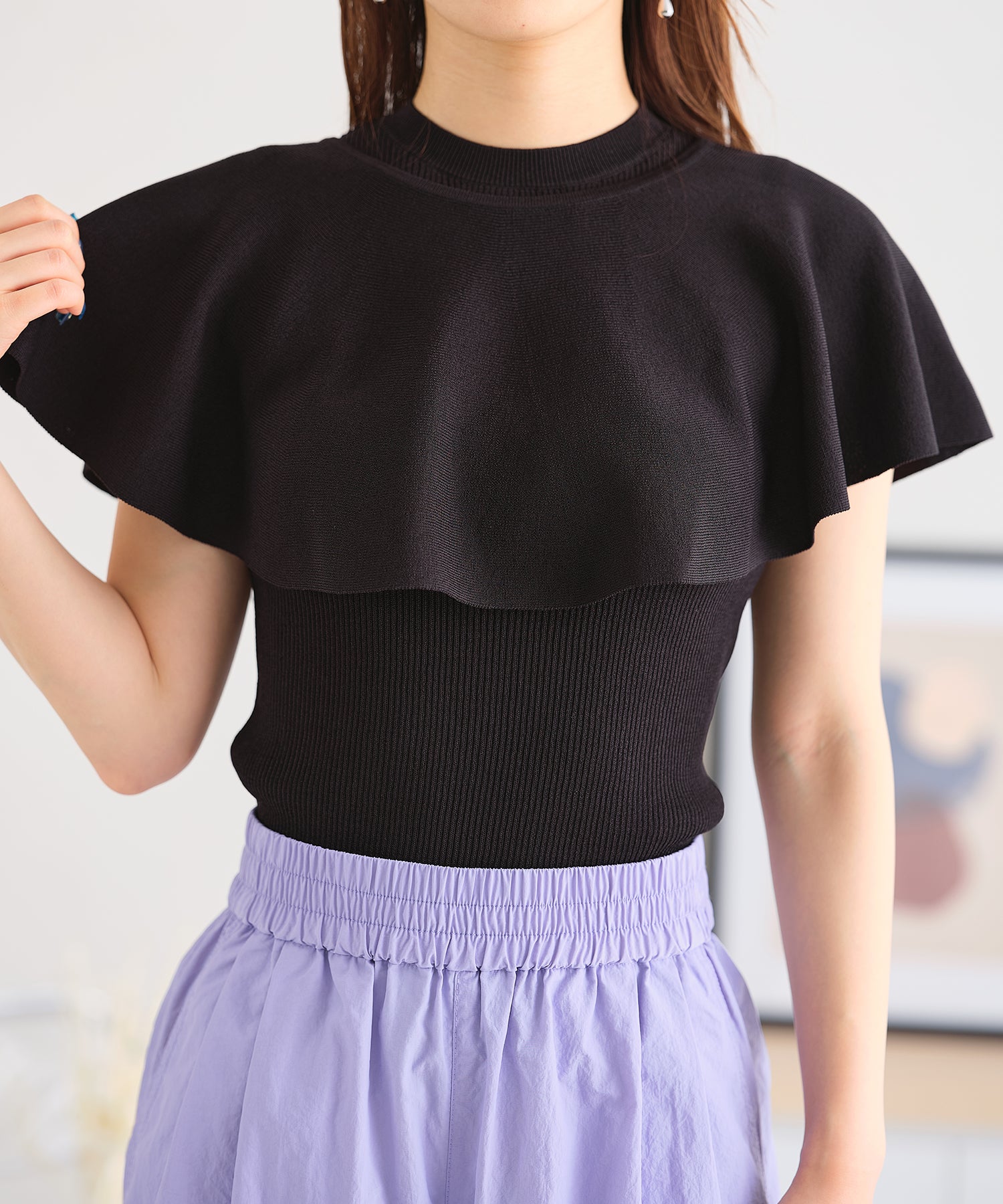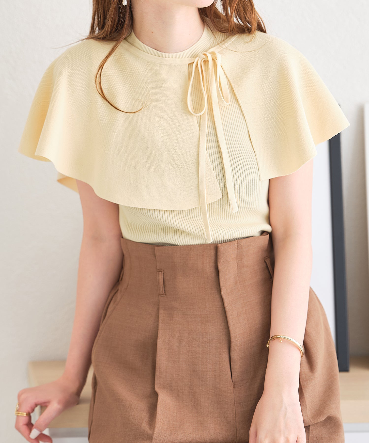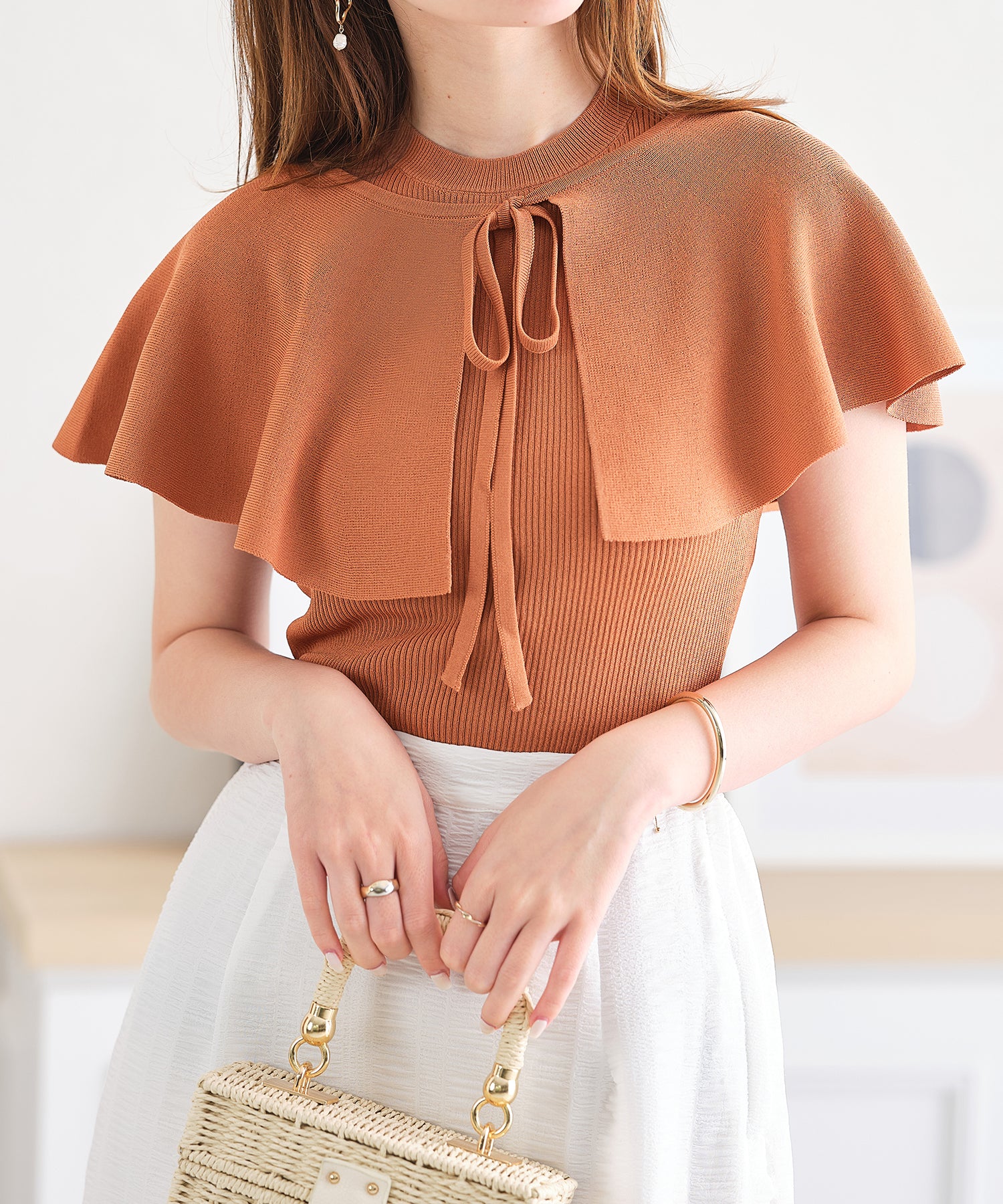 薄手のサマーニットを使用したトップスはケープとノースリーブのセットアイテム。ベーシックに使えるノースリーブに大きめの襟がポイントのケープで可愛らしい旬顔スタイルに。ケープは前後どちらでも使えて、コーディネートの雰囲気に合わせて楽しめるデザイン。