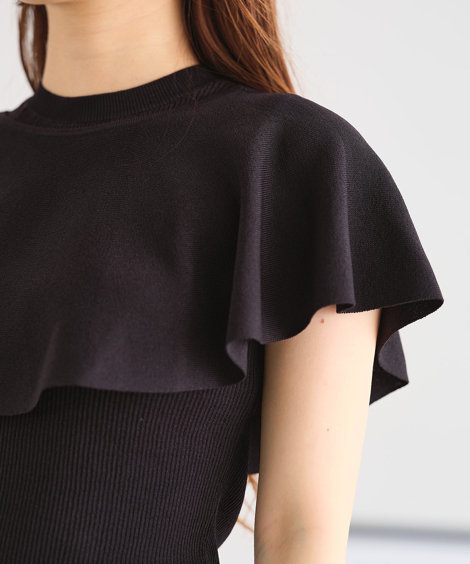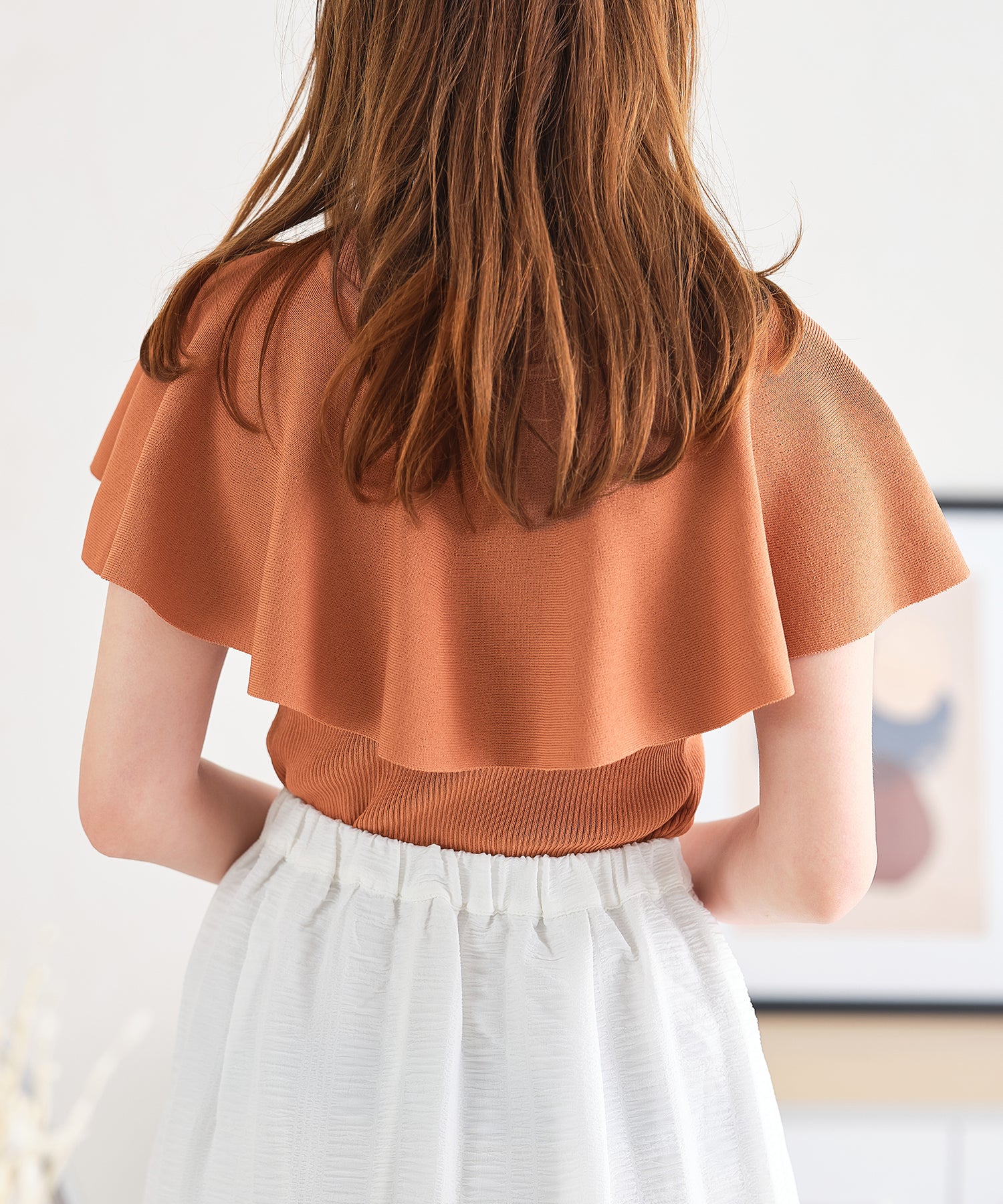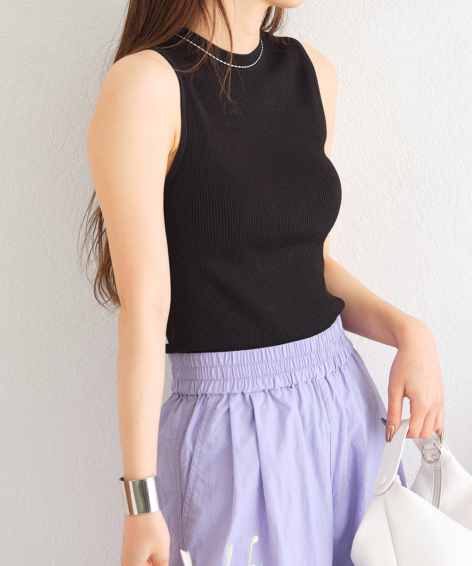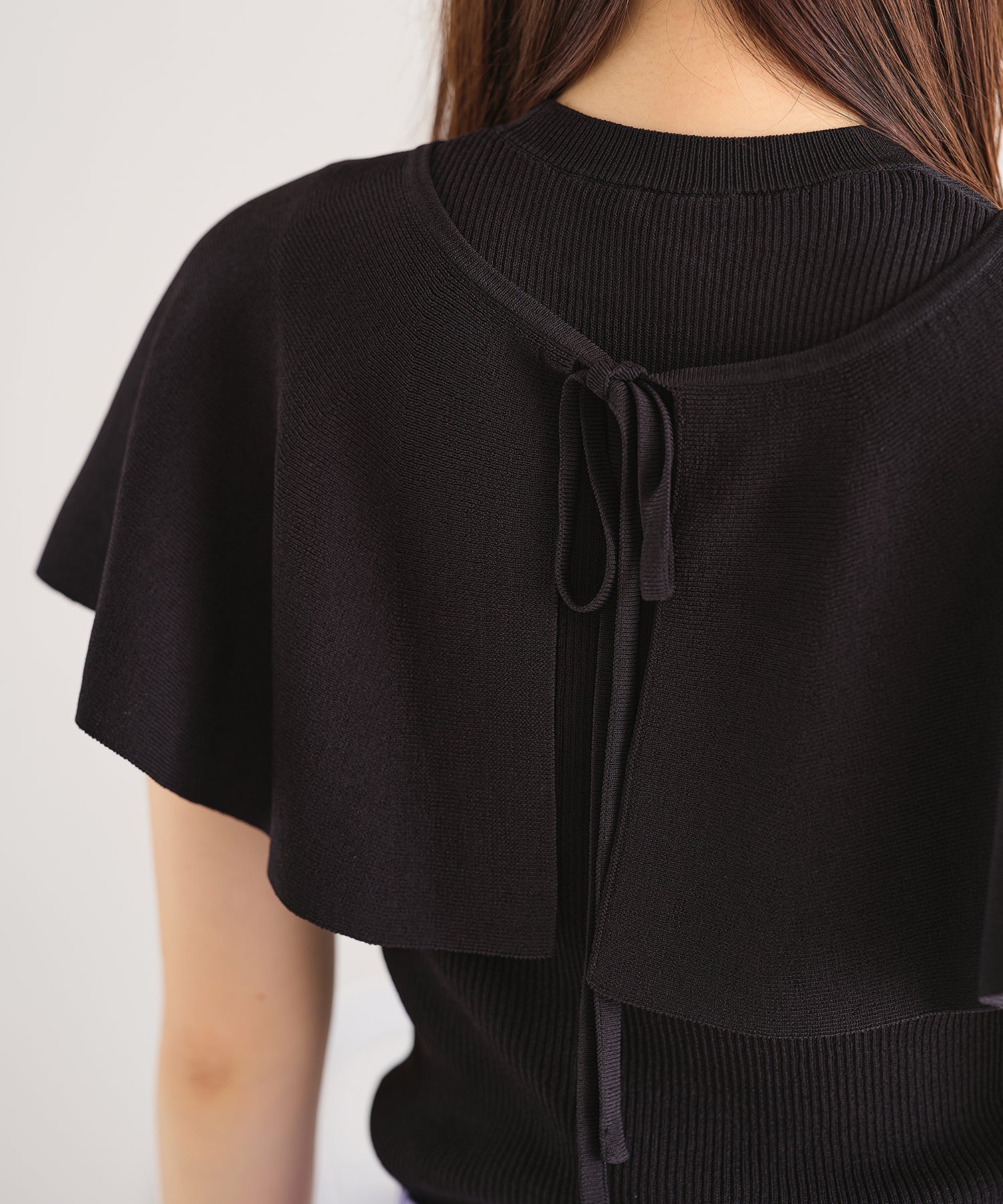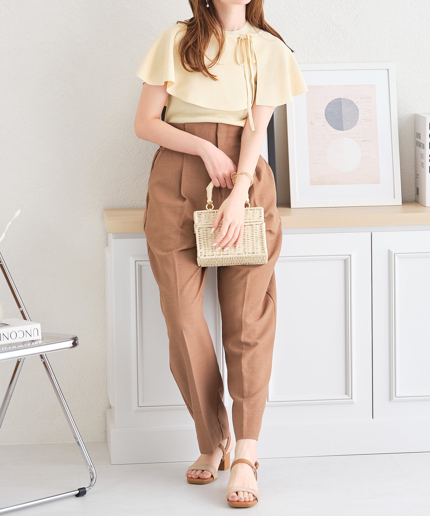 薄手のサマーニットを使用したトップスはケープとノースリーブのセットアイテム。ベーシックに使えるノースリーブに大きめの襟がポイントのケープで可愛らしい旬顔スタイルに。ケープは前後どちらでも使えて、コーディネートの雰囲気に合わせて楽しめるデザイン。
