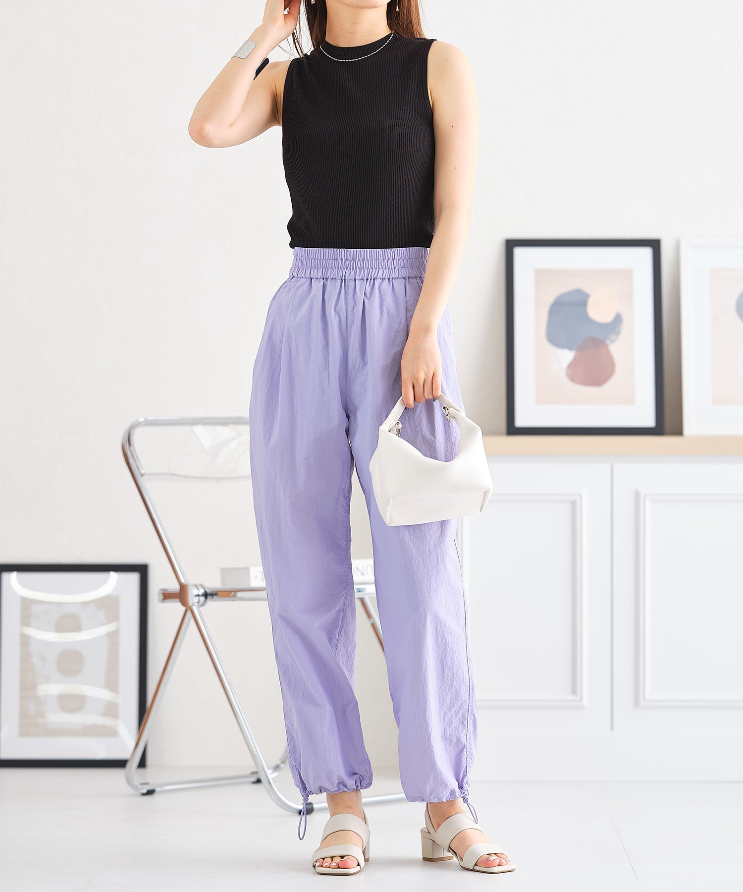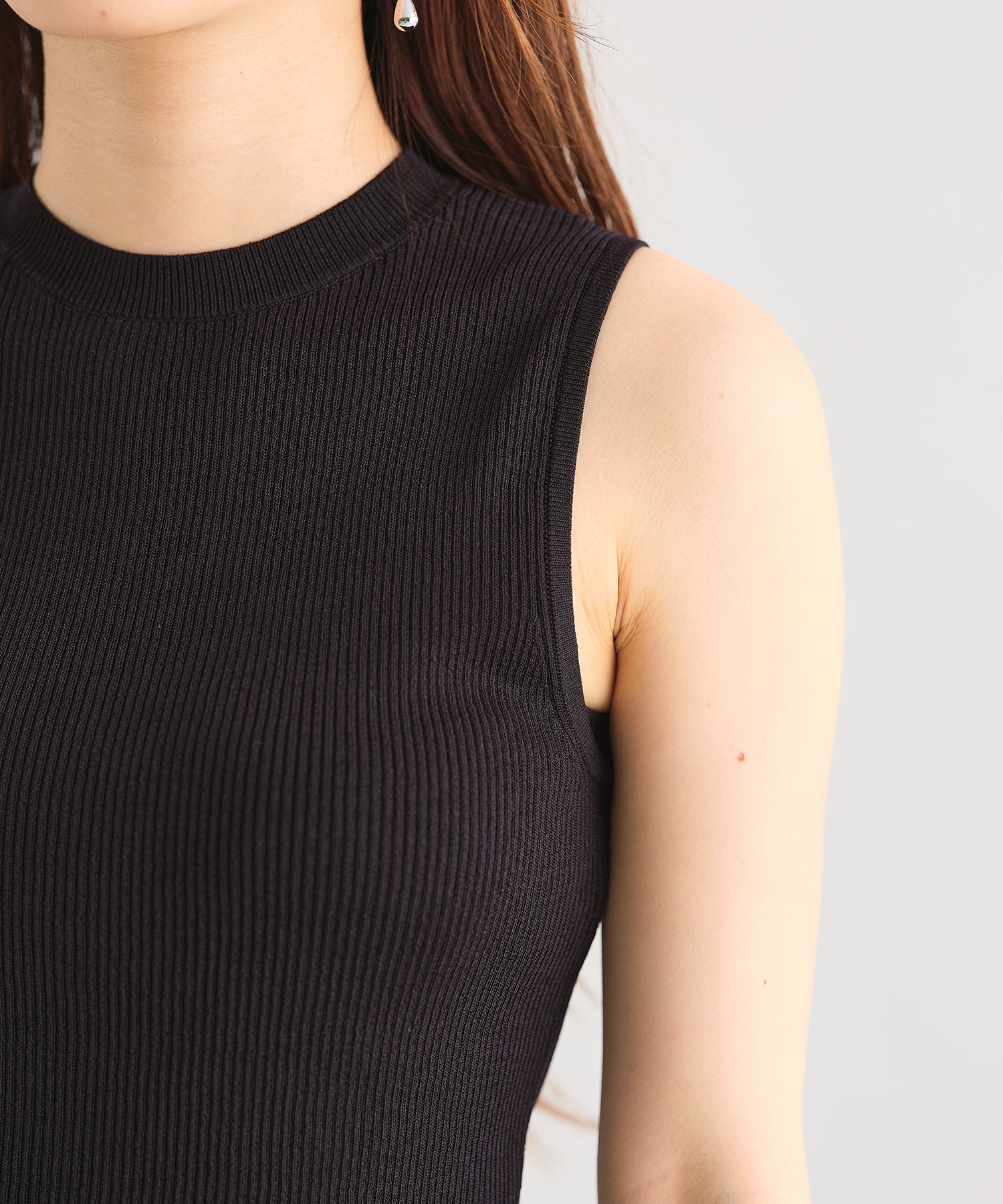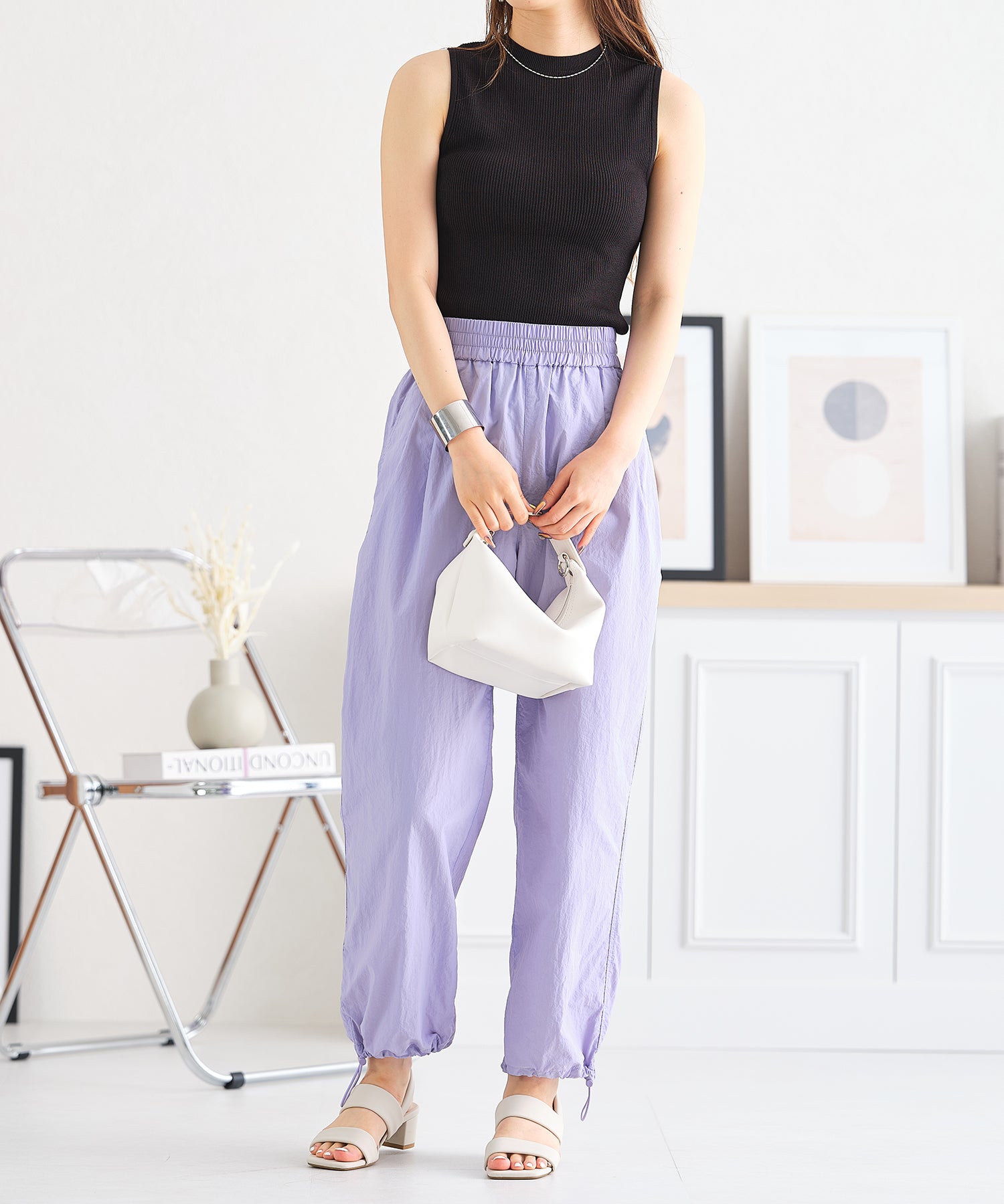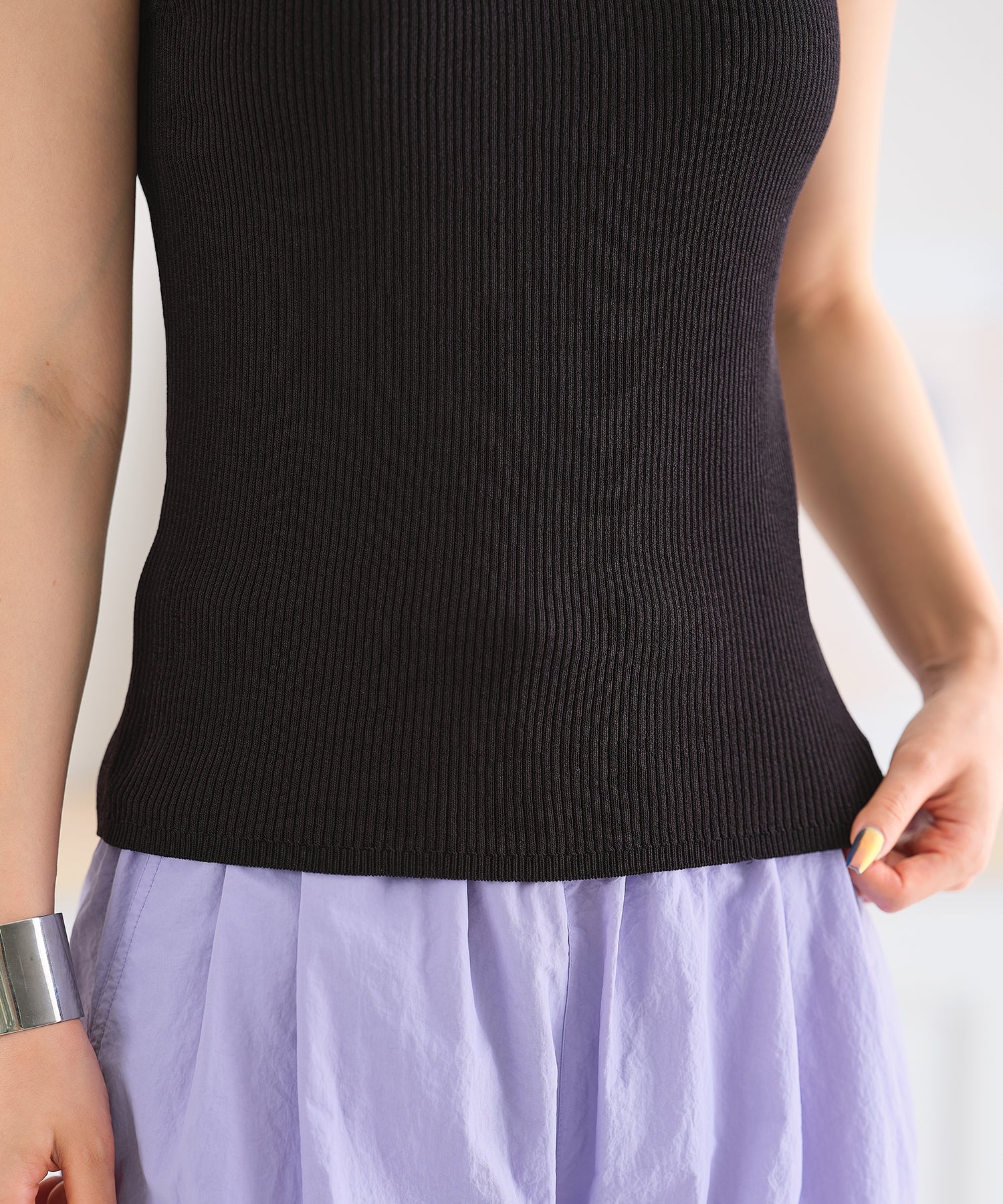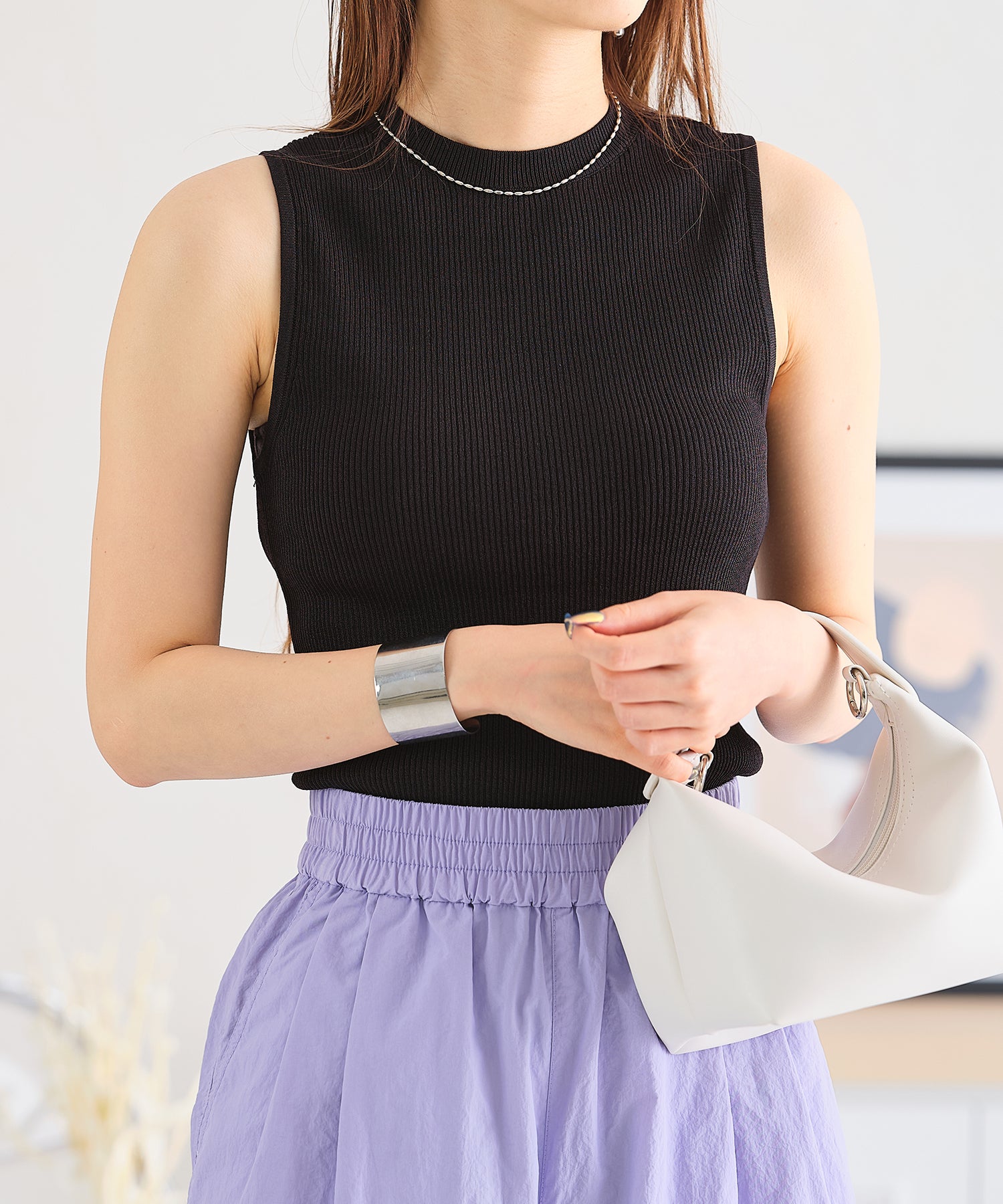 薄手のサマーニットを使用したトップスはケープとノースリーブのセットアイテム。ベーシックに使えるノースリーブに大きめの襟がポイントのケープで可愛らしい旬顔スタイルに。ケープは前後どちらでも使えて、コーディネートの雰囲気に合わせて楽しめるデザイン。