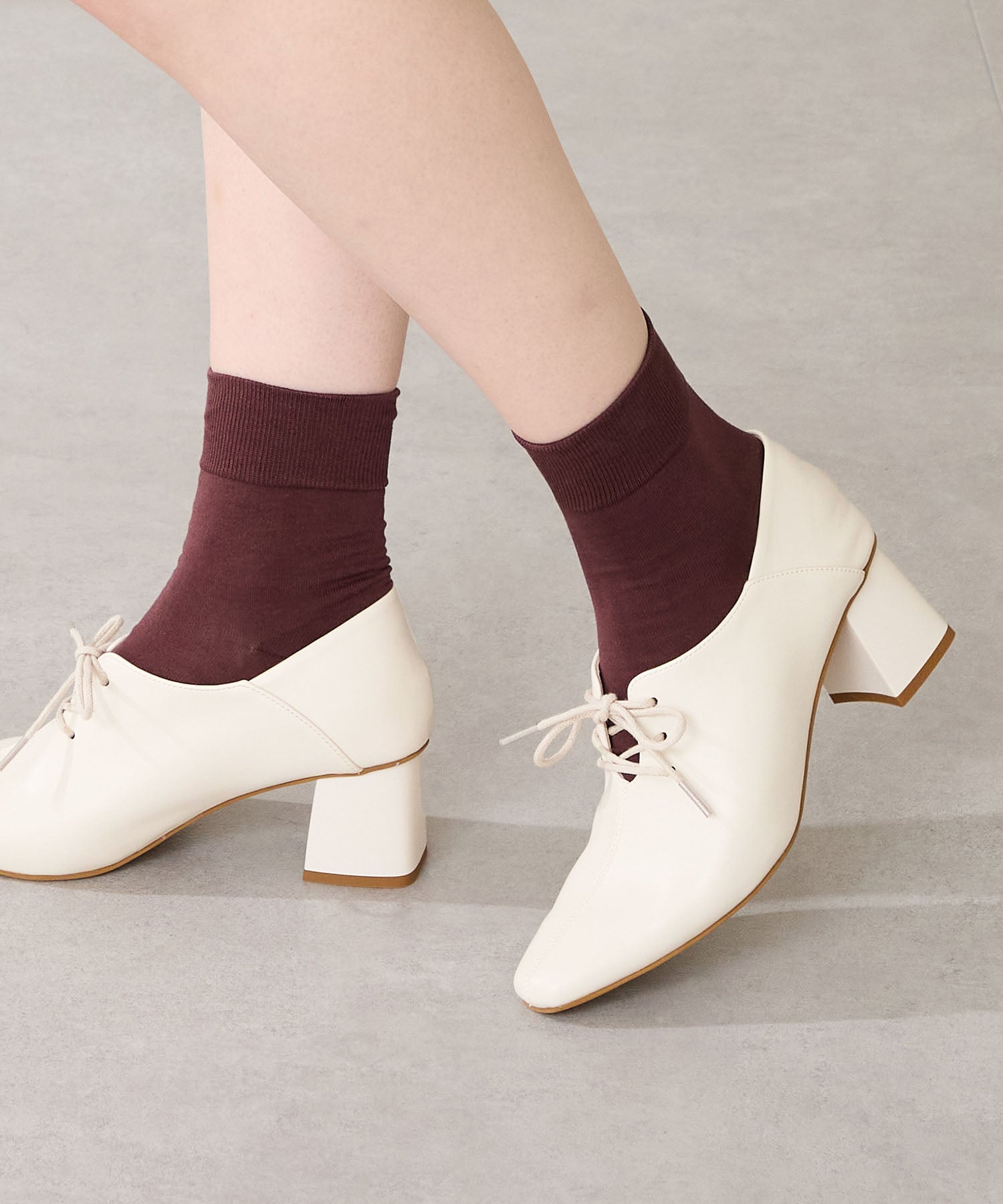 足をすっぽり包み込む甲深パンプスは、細めのシューレースを付けることでフィット感を高めながらも華奢な印象に見せてくれる1足。5.8cmのヒールもチャンキーヒールで安定感があり、さらに踵部分は芯を入れないバブーシュ仕様にすることで踏んでも履けるのが嬉しい2wayデザイン。甲のスリットで程よく抜け感がでるので、長めのボトムスと合わせても相性◎。
