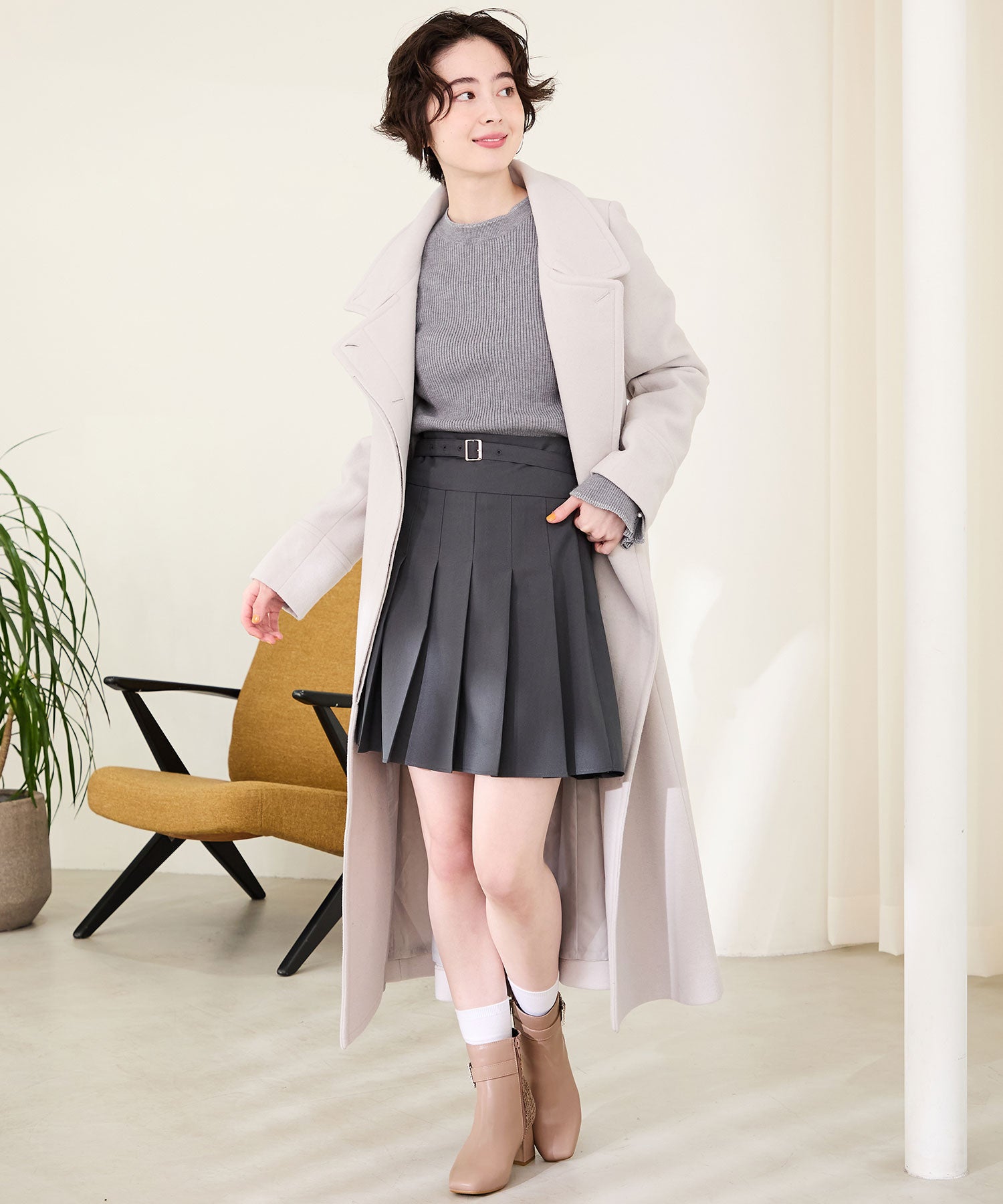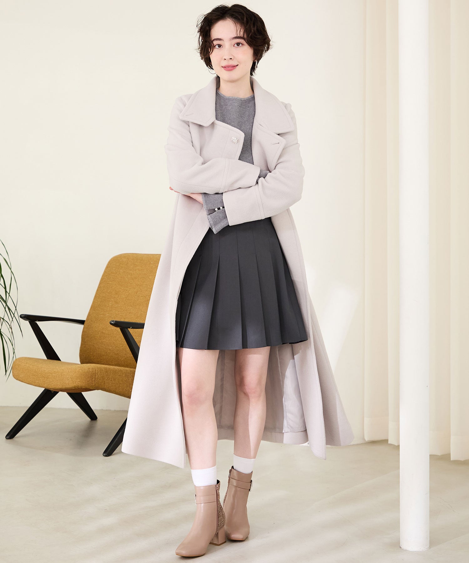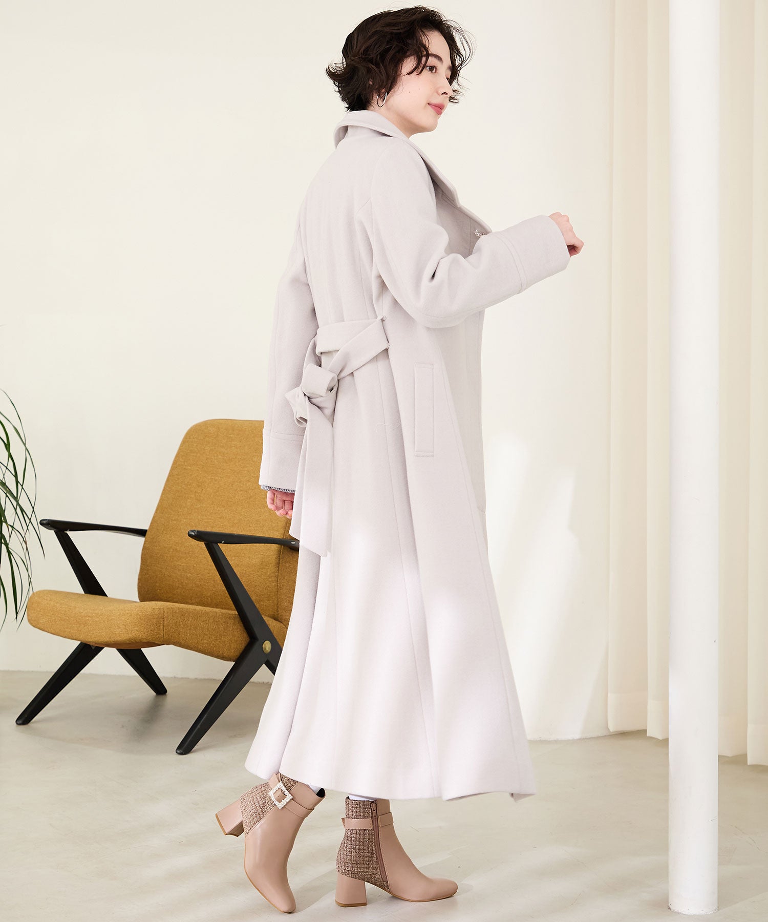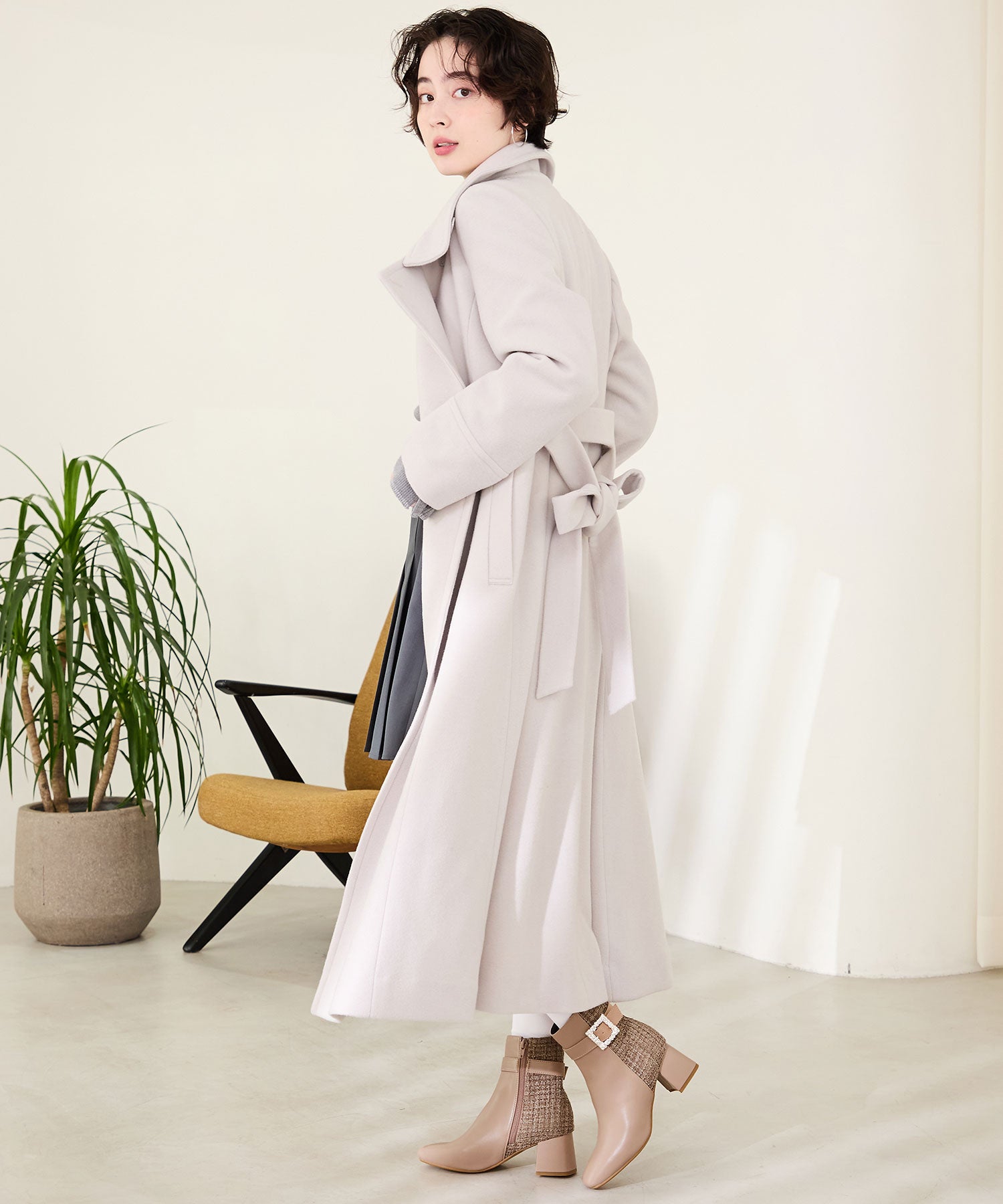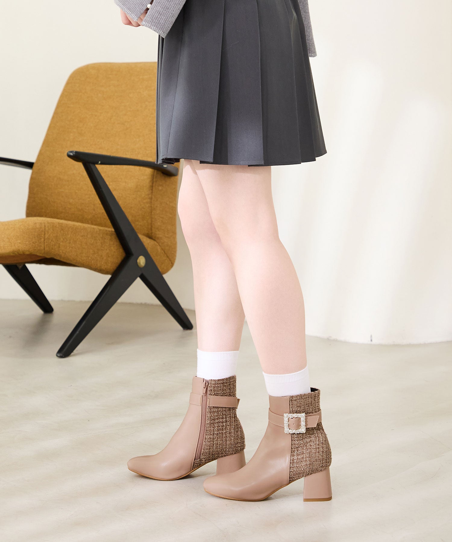 サイドに煌めくビジューモチーフをあしらった華やかなショートブーツは、合皮とツイードの切り替えデザインで、足元に高級感と立体感をプラス。すっきりとしたスクエアトゥと、やや長めの筒丈がレッグラインを綺麗に見せてくれる。カラーによって雰囲気が異なり、ブラックはシックでモードに、ピンクは柔らかで上品に、ベージュは清楚な印象と、デイリーから特別なお出かけにも映える1足。