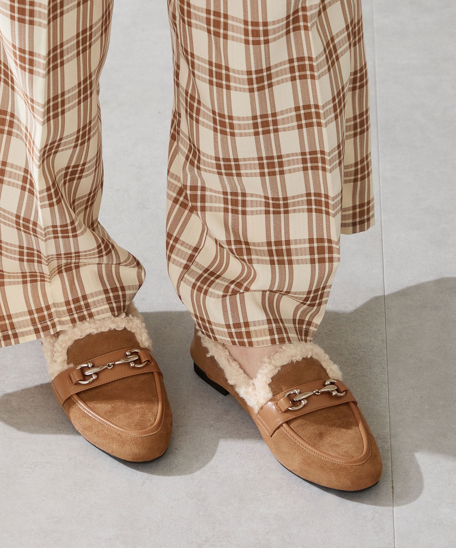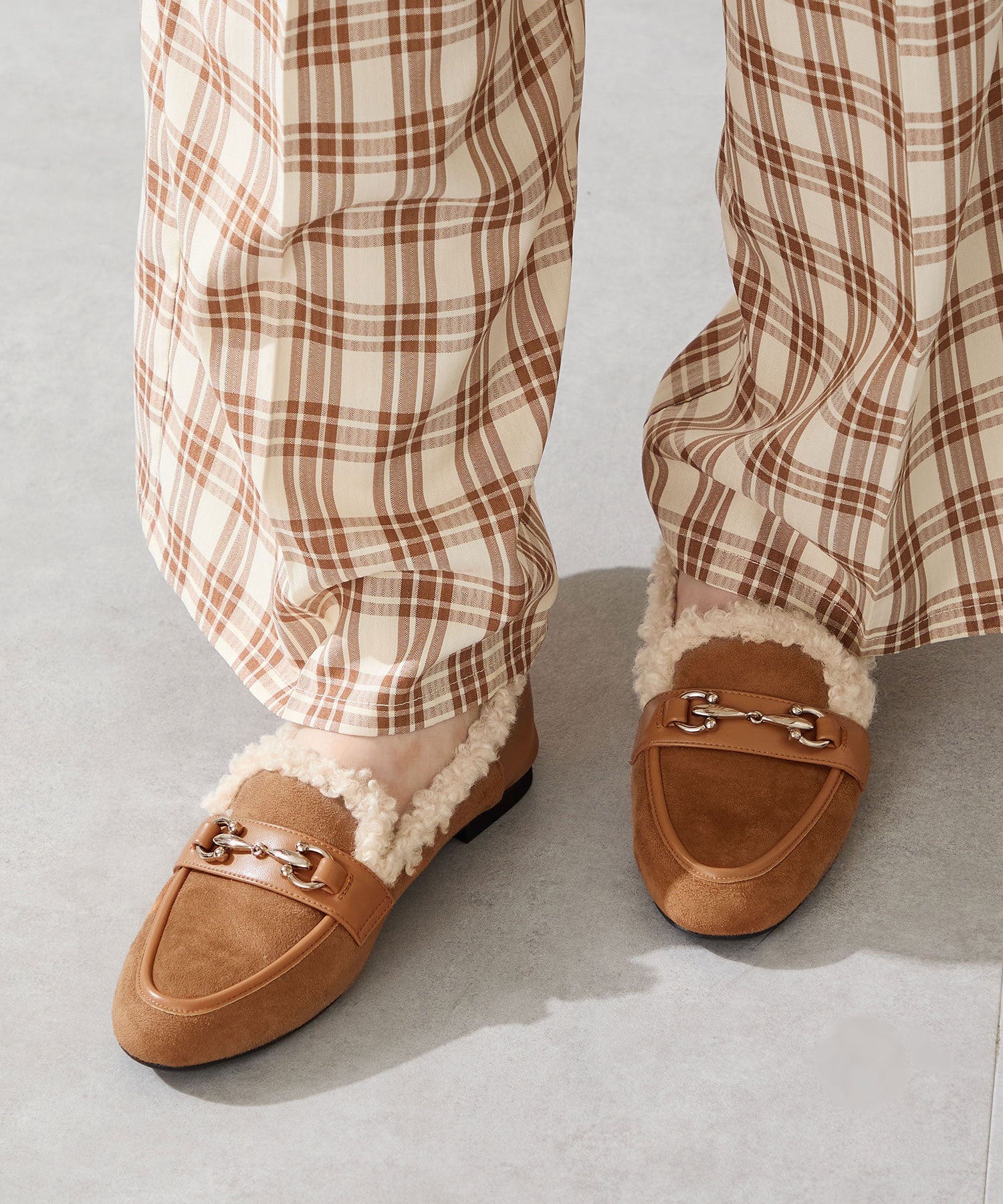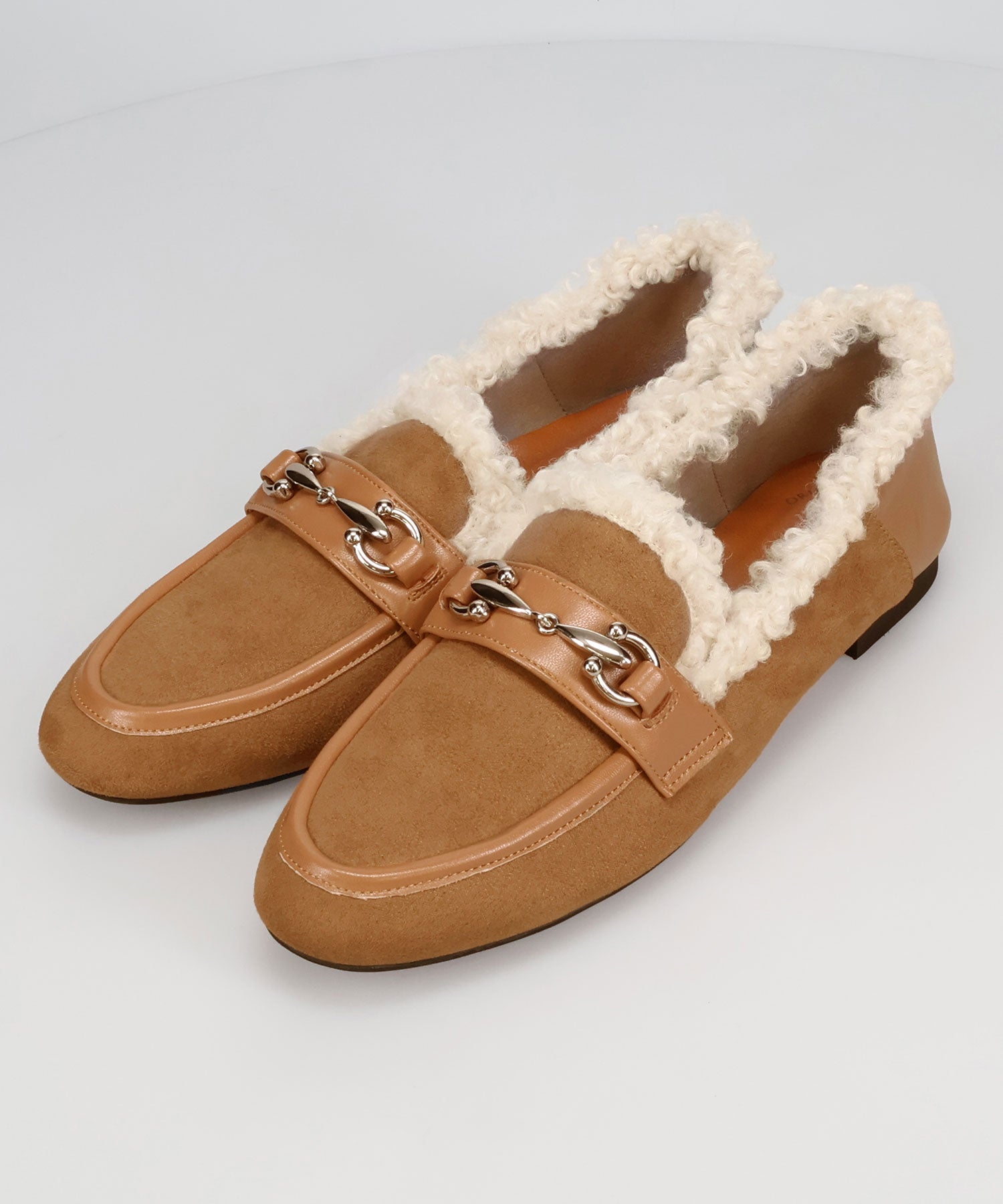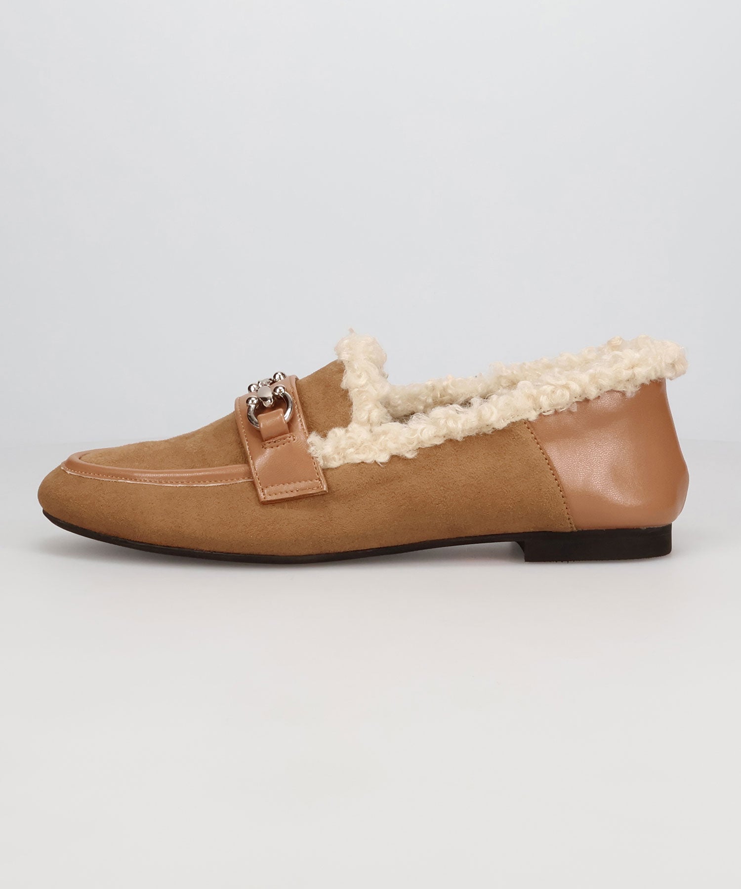 履き口に付けたボアがポイントのローファーは履くだけでシーズンライクな装いに。丸みのあるビットモチーフが程よい存在感を演出。優しい印象のスエード素材のアッパーにスムースの切替を付けることでメリハリと立体感をプラス。踵を踏んでも履けるバブーシュ仕様で、ストレスフリーな履き心地に。着まわしの効く2色展開で普段のコーディネートをアップデートしてくれること間違いなし。
