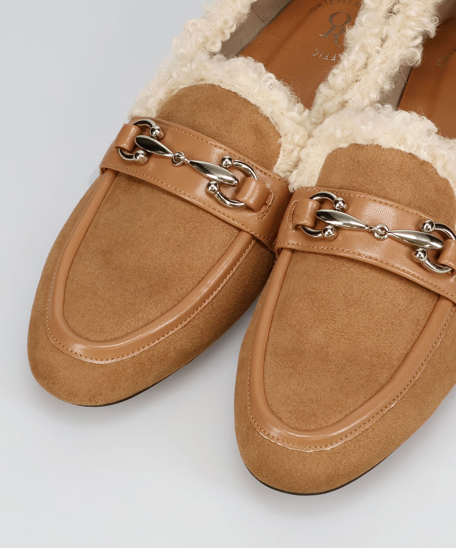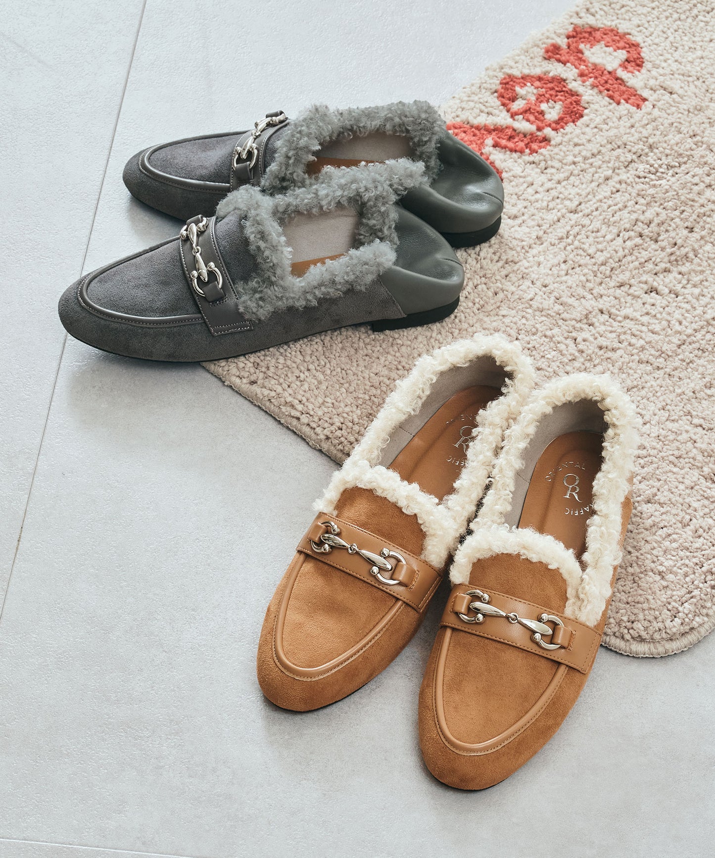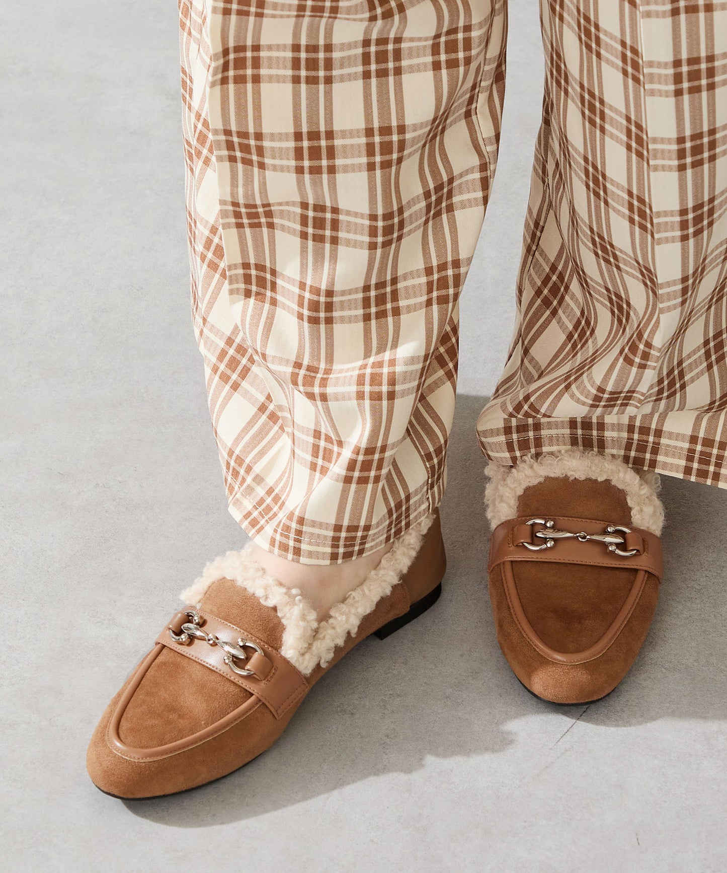 履き口に付けたボアがポイントのローファーは履くだけでシーズンライクな装いに。丸みのあるビットモチーフが程よい存在感を演出。優しい印象のスエード素材のアッパーにスムースの切替を付けることでメリハリと立体感をプラス。踵を踏んでも履けるバブーシュ仕様で、ストレスフリーな履き心地に。着まわしの効く2色展開で普段のコーディネートをアップデートしてくれること間違いなし。