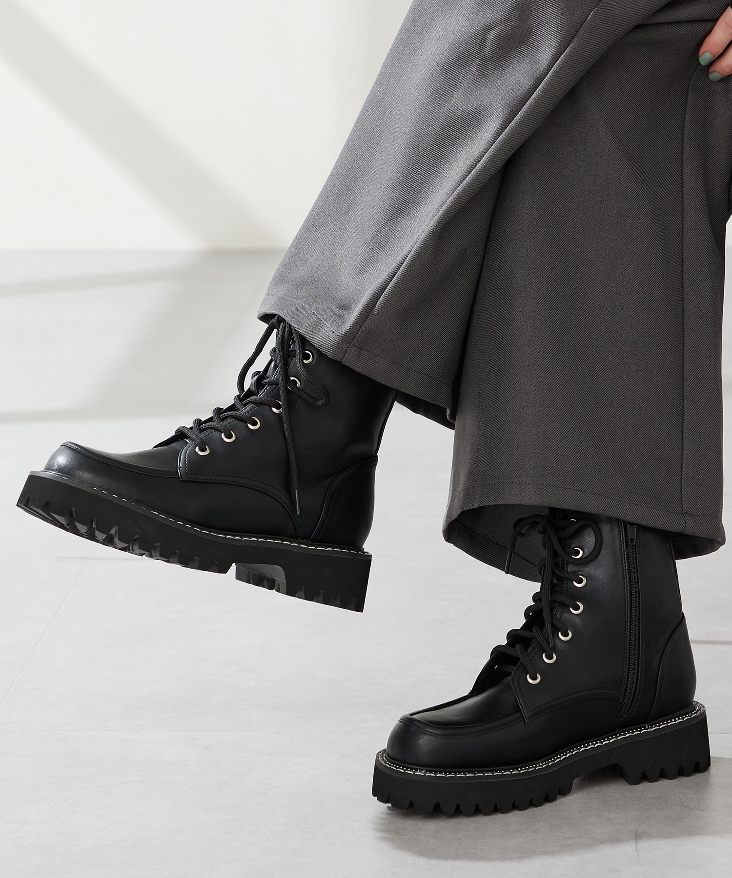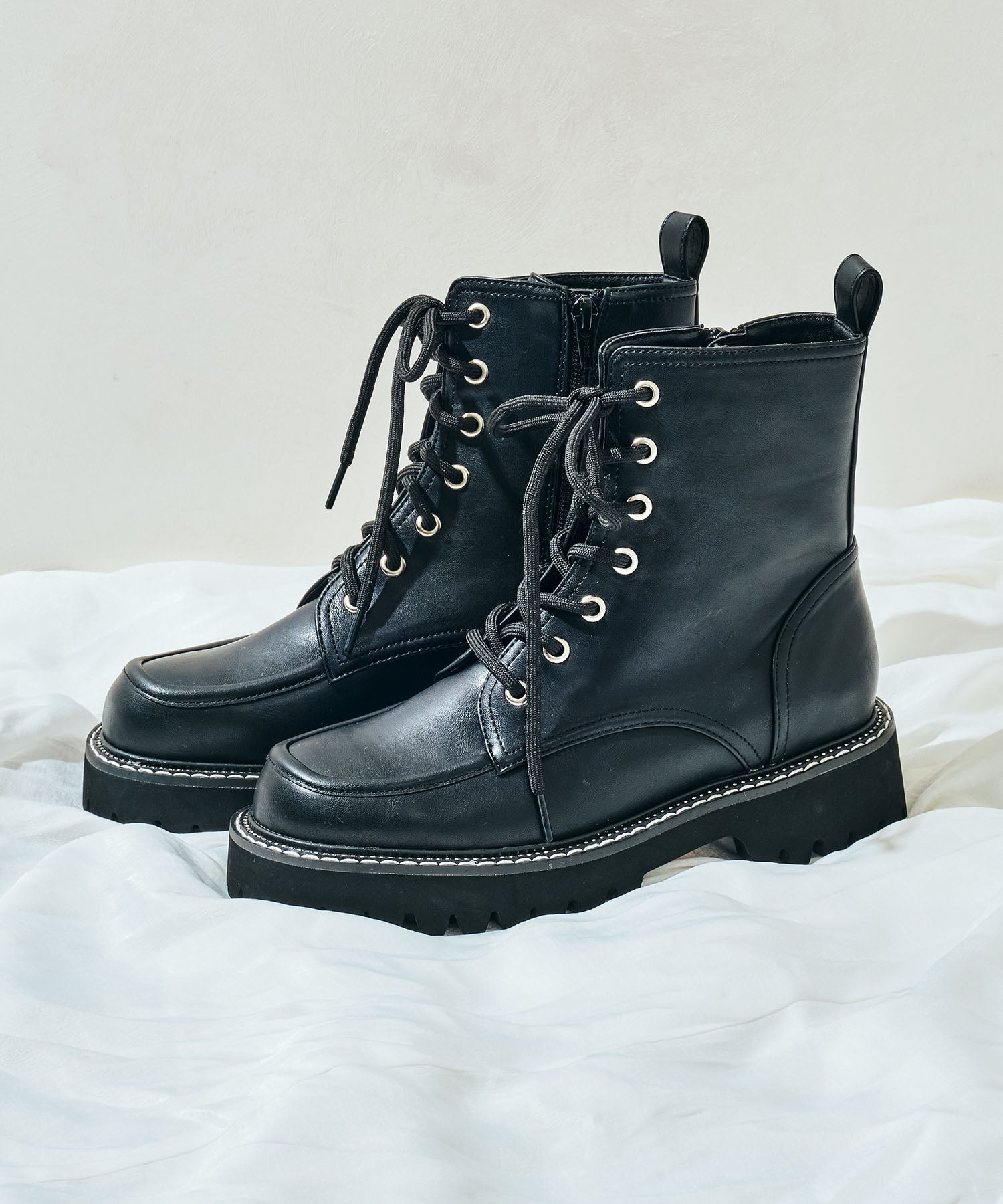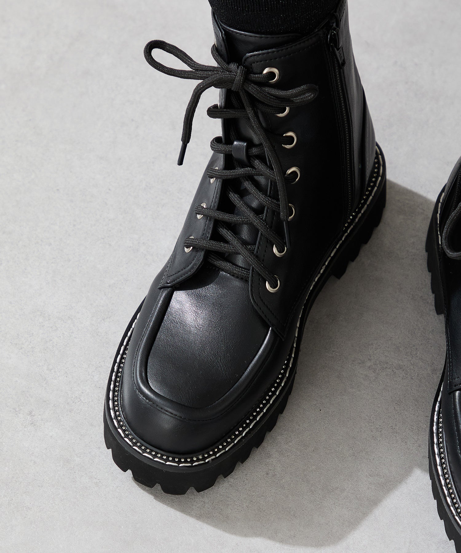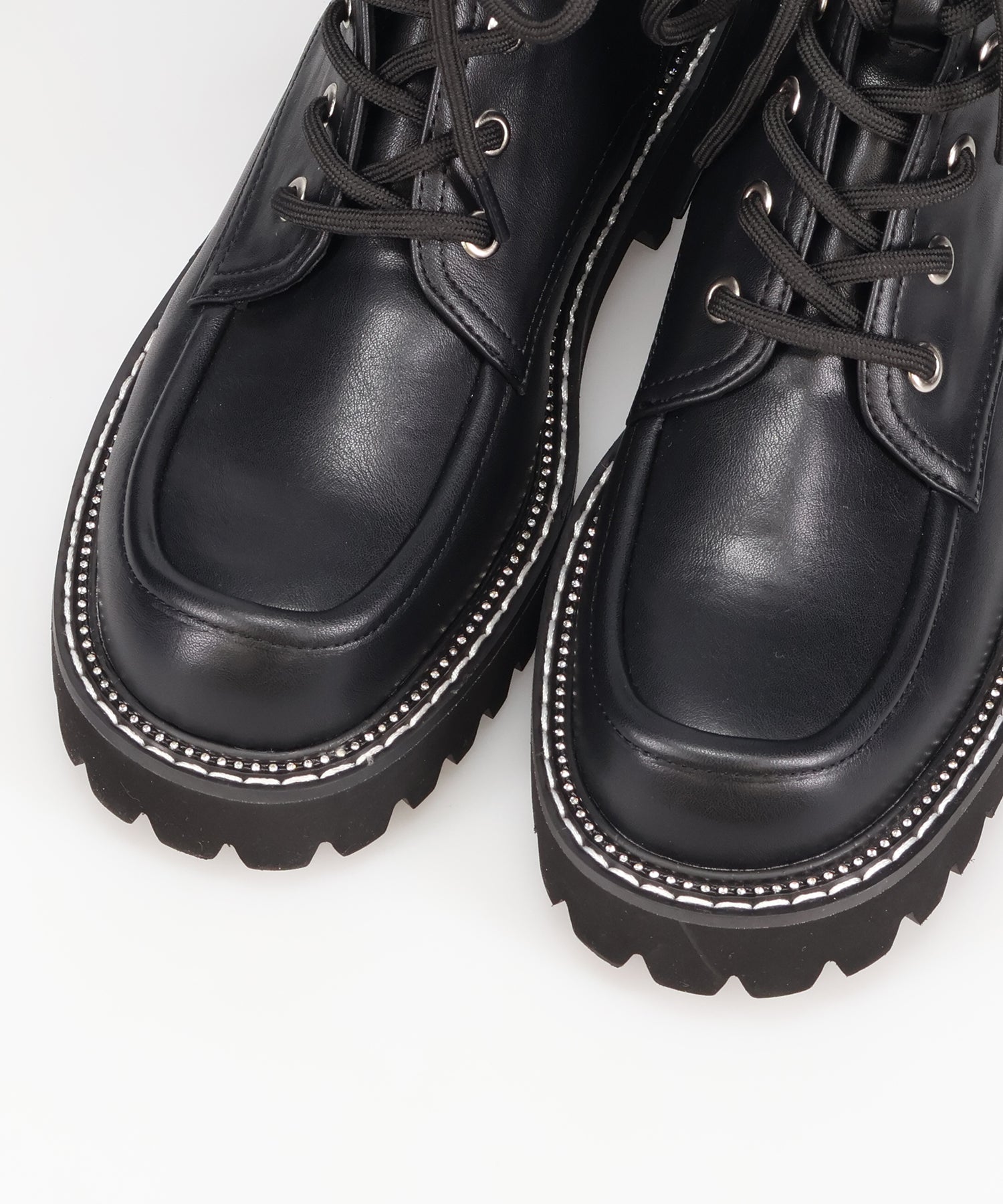 程よいボリュームの厚底や太めのシューレースなどメンズライクな要素を詰め込んだブーツは、コバにホワイトのステッチやラインストーンを施したディテールで他にはないアイテムに仕上げた1足。幅広いスタイルに合わせやすいレースアップデザインも、シルバーのハトメデザインでさらにアクセントをプラス。定番のブラックのみの展開なので、カラーソックスやタイツなどスタイリングを楽しめる。