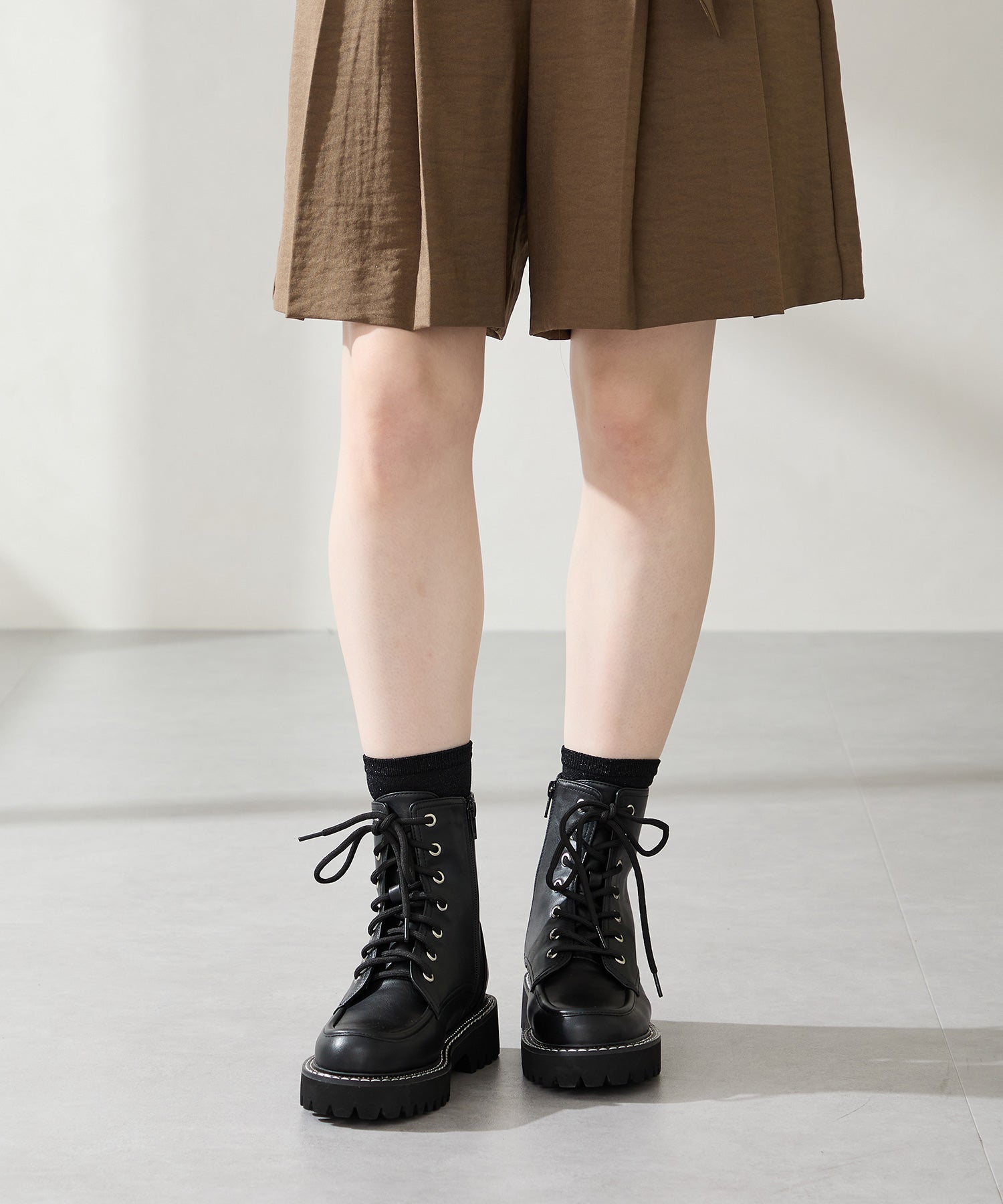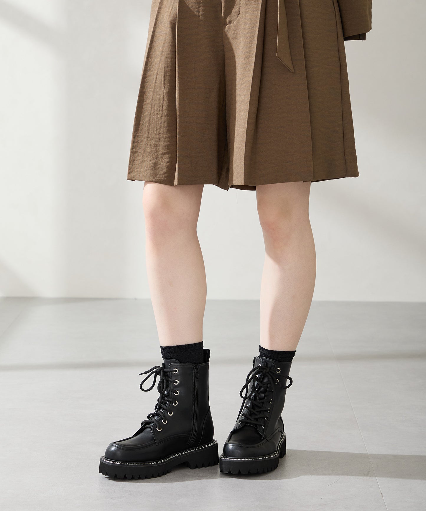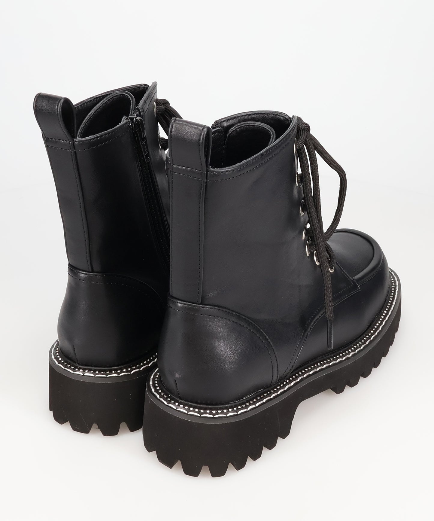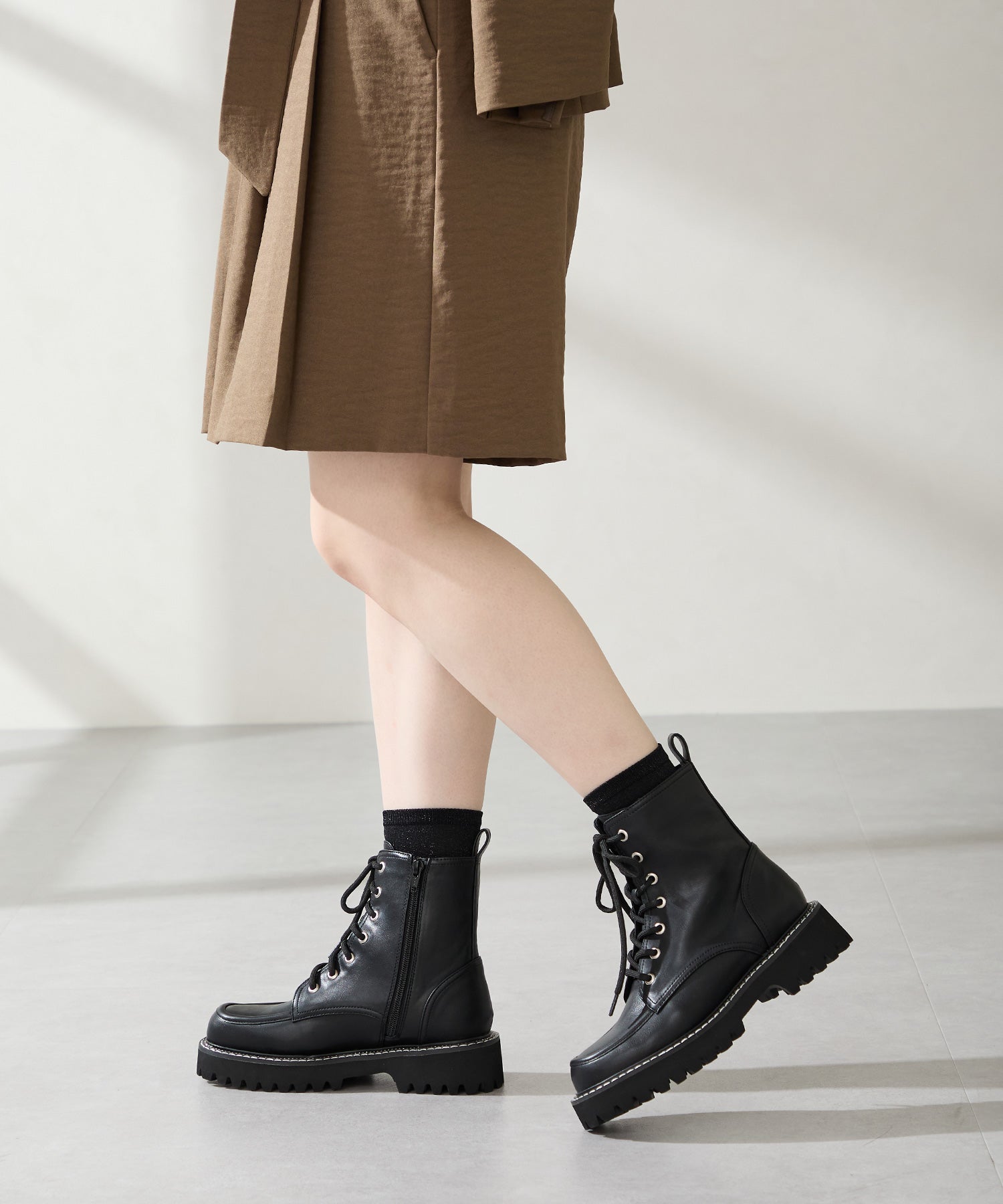 程よいボリュームの厚底や太めのシューレースなどメンズライクな要素を詰め込んだブーツは、コバにホワイトのステッチやラインストーンを施したディテールで他にはないアイテムに仕上げた1足。幅広いスタイルに合わせやすいレースアップデザインも、シルバーのハトメデザインでさらにアクセントをプラス。定番のブラックのみの展開なので、カラーソックスやタイツなどスタイリングを楽しめる。