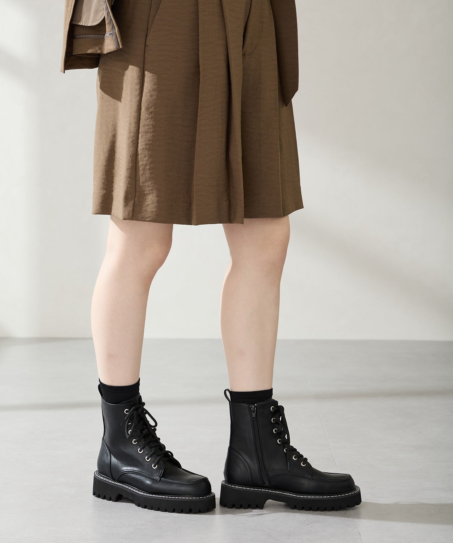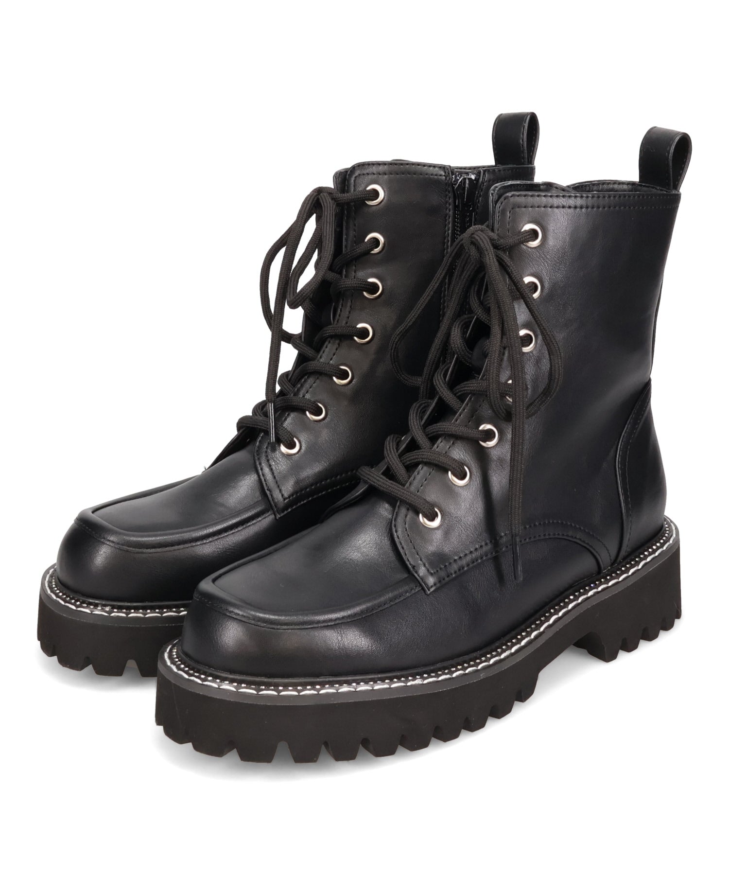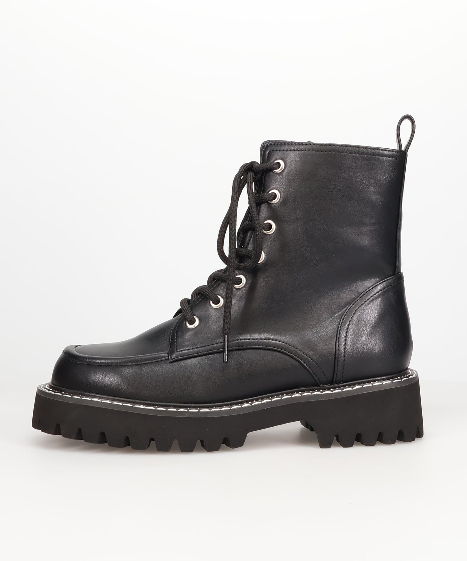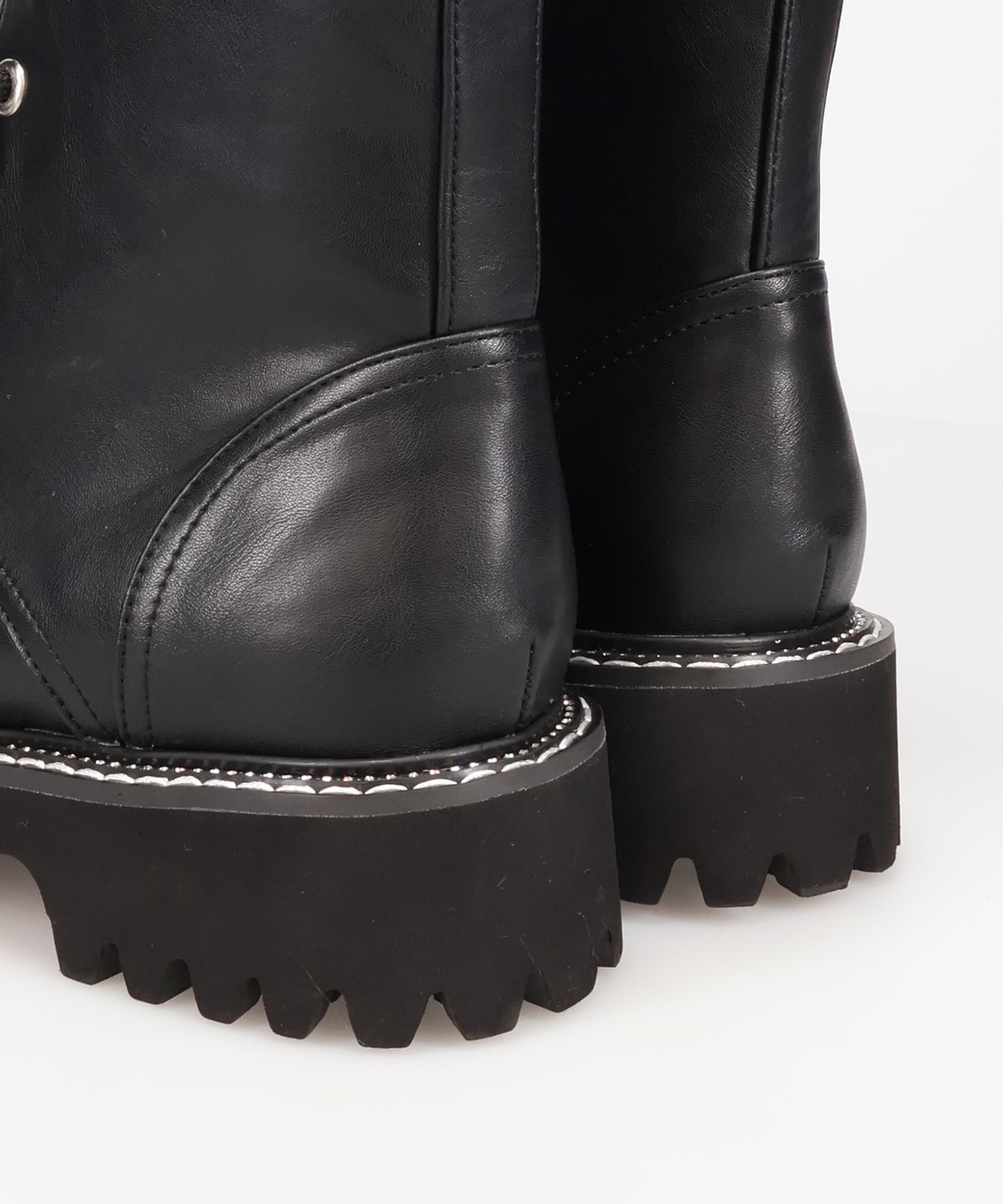 程よいボリュームの厚底や太めのシューレースなどメンズライクな要素を詰め込んだブーツは、コバにホワイトのステッチやラインストーンを施したディテールで他にはないアイテムに仕上げた1足。幅広いスタイルに合わせやすいレースアップデザインも、シルバーのハトメデザインでさらにアクセントをプラス。定番のブラックのみの展開なので、カラーソックスやタイツなどスタイリングを楽しめる。