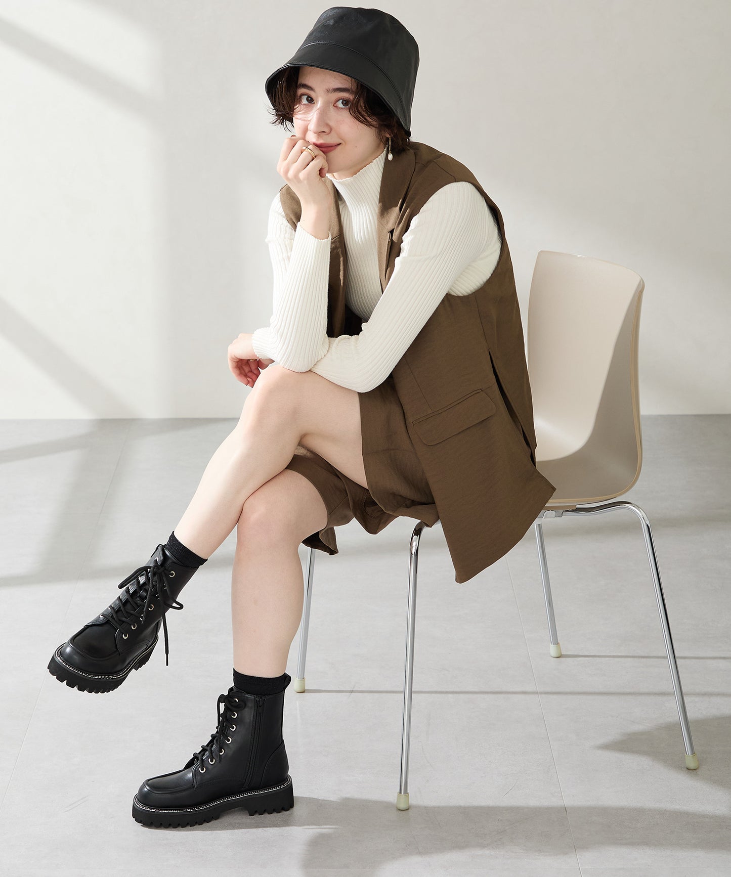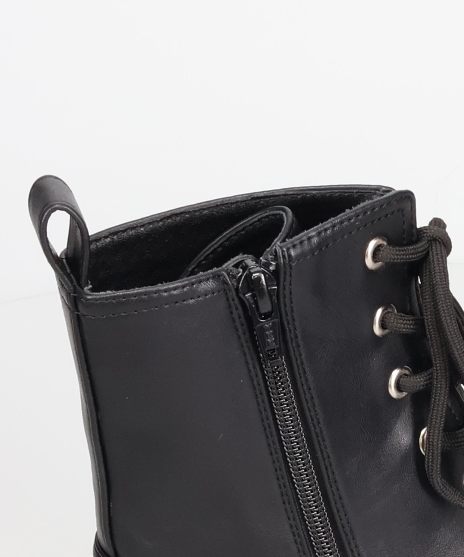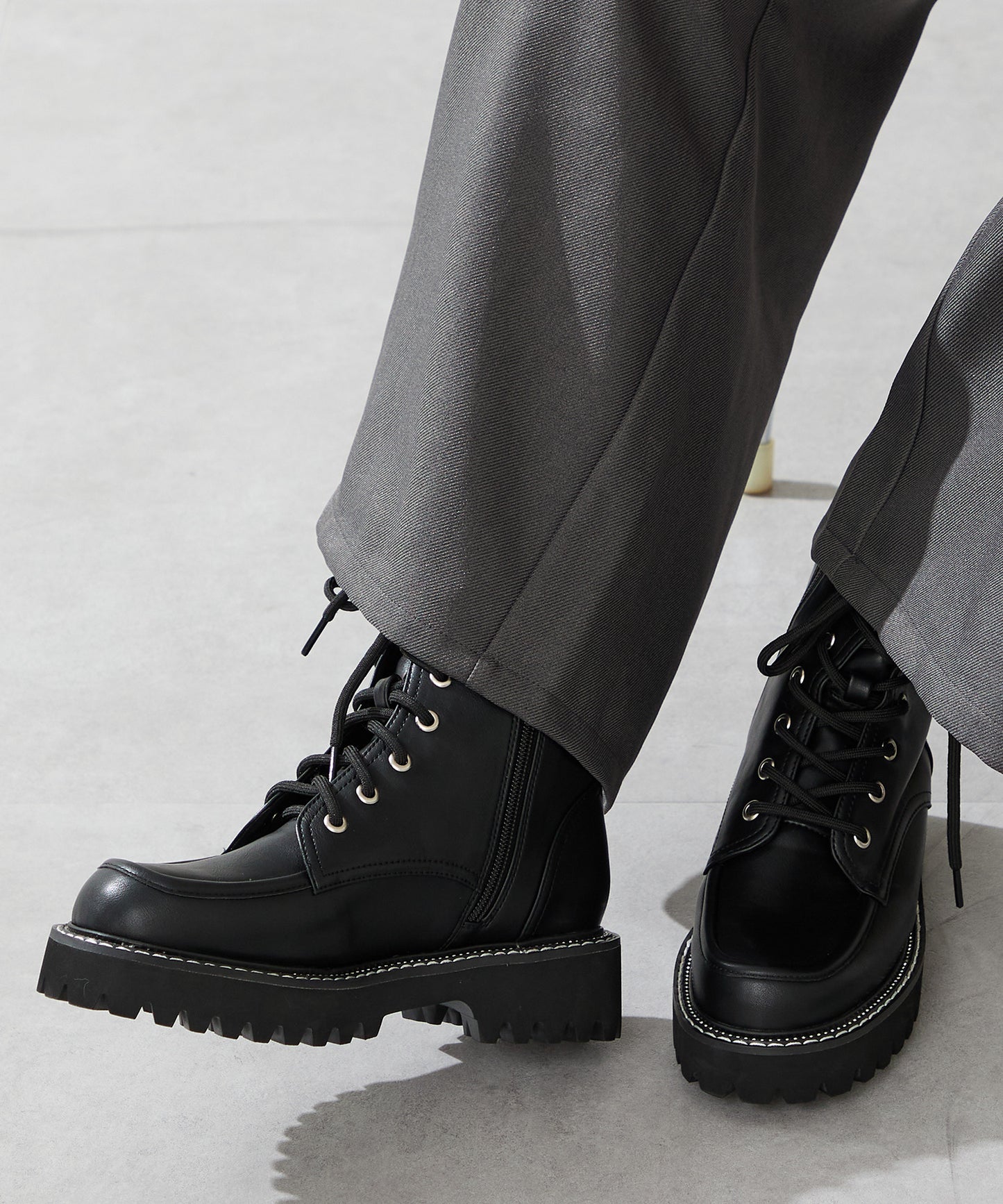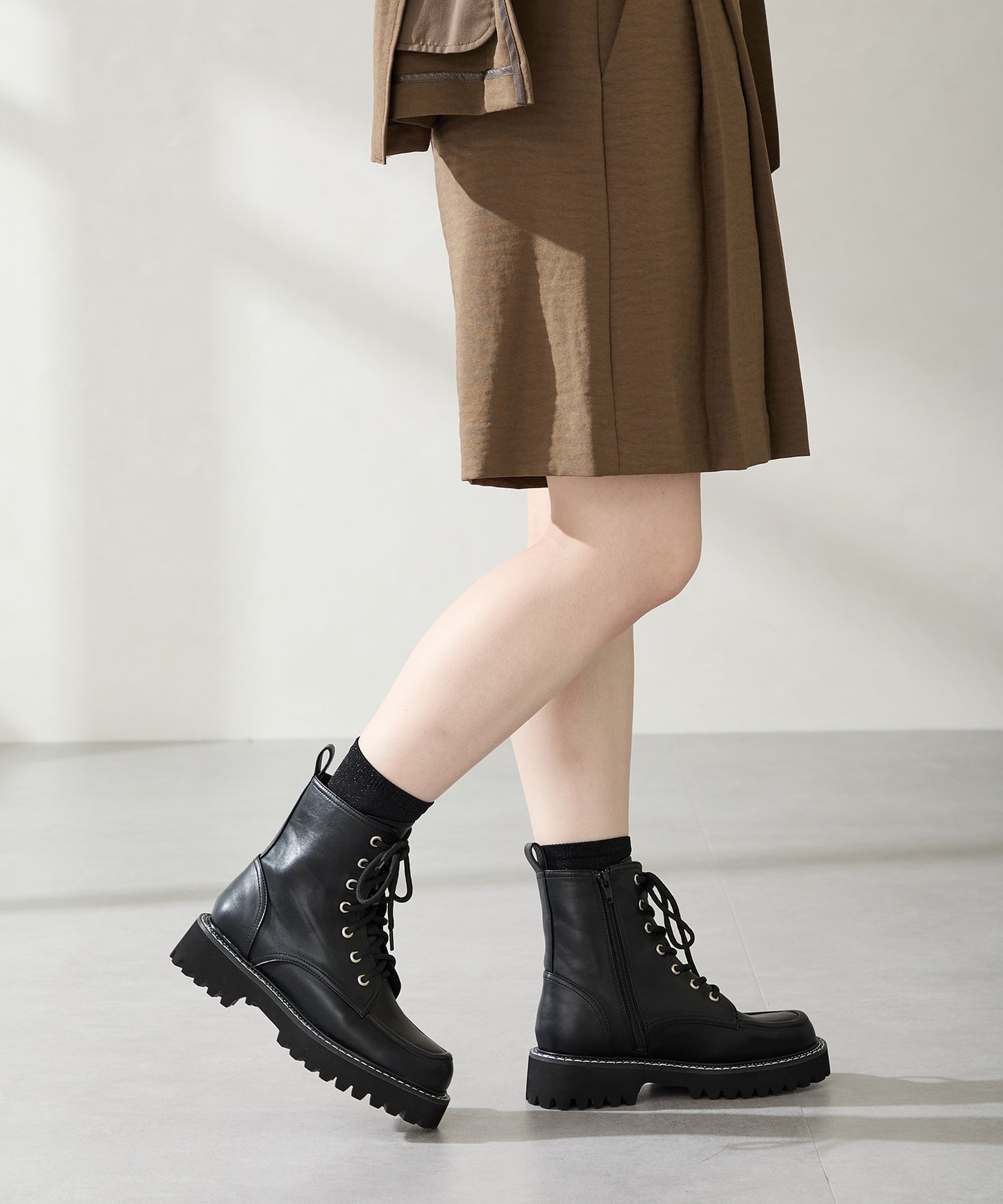 程よいボリュームの厚底や太めのシューレースなどメンズライクな要素を詰め込んだブーツは、コバにホワイトのステッチやラインストーンを施したディテールで他にはないアイテムに仕上げた1足。幅広いスタイルに合わせやすいレースアップデザインも、シルバーのハトメデザインでさらにアクセントをプラス。定番のブラックのみの展開なので、カラーソックスやタイツなどスタイリングを楽しめる。