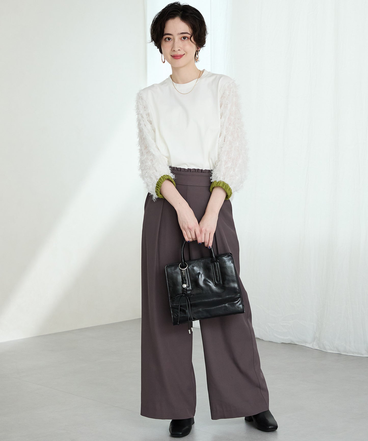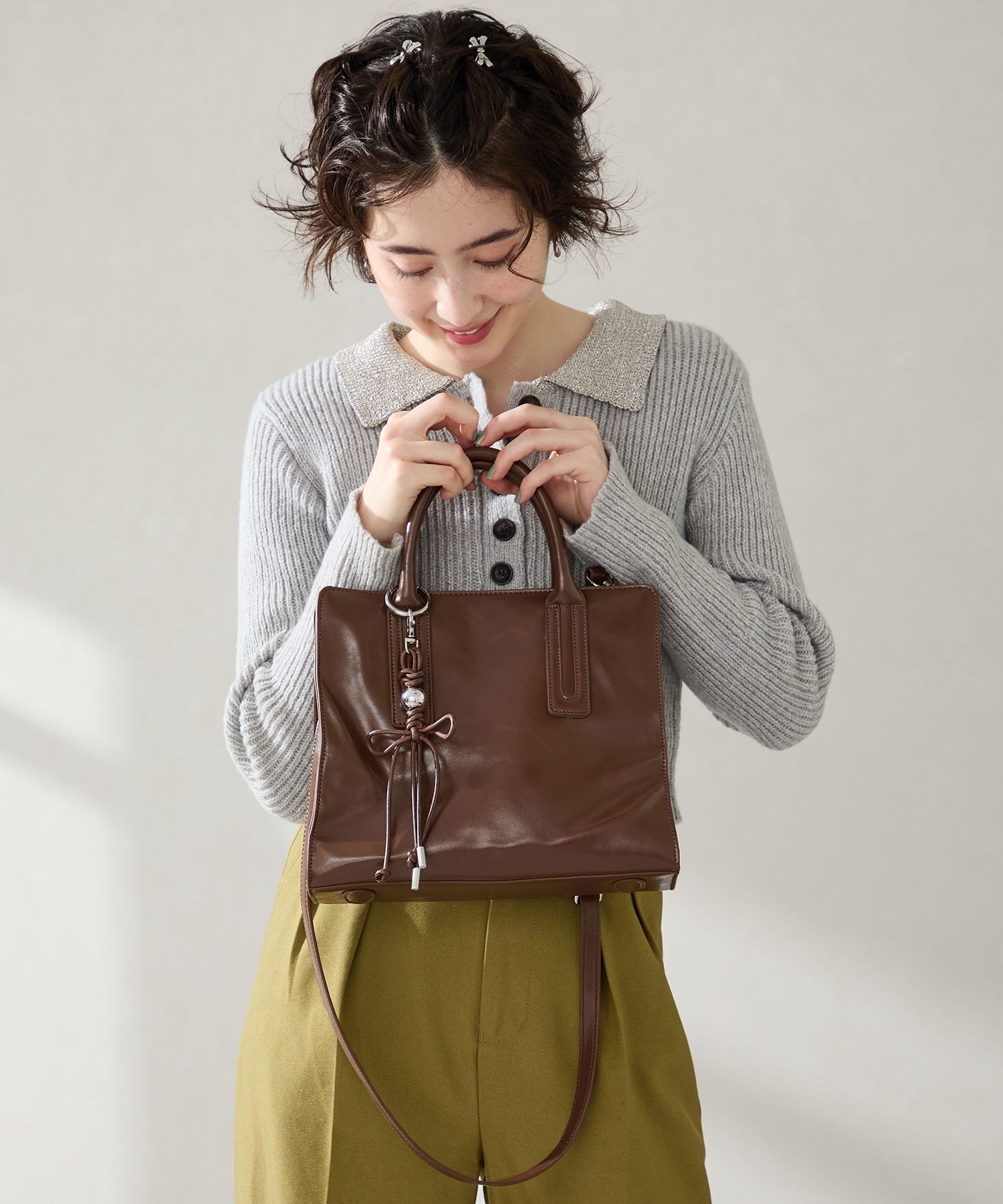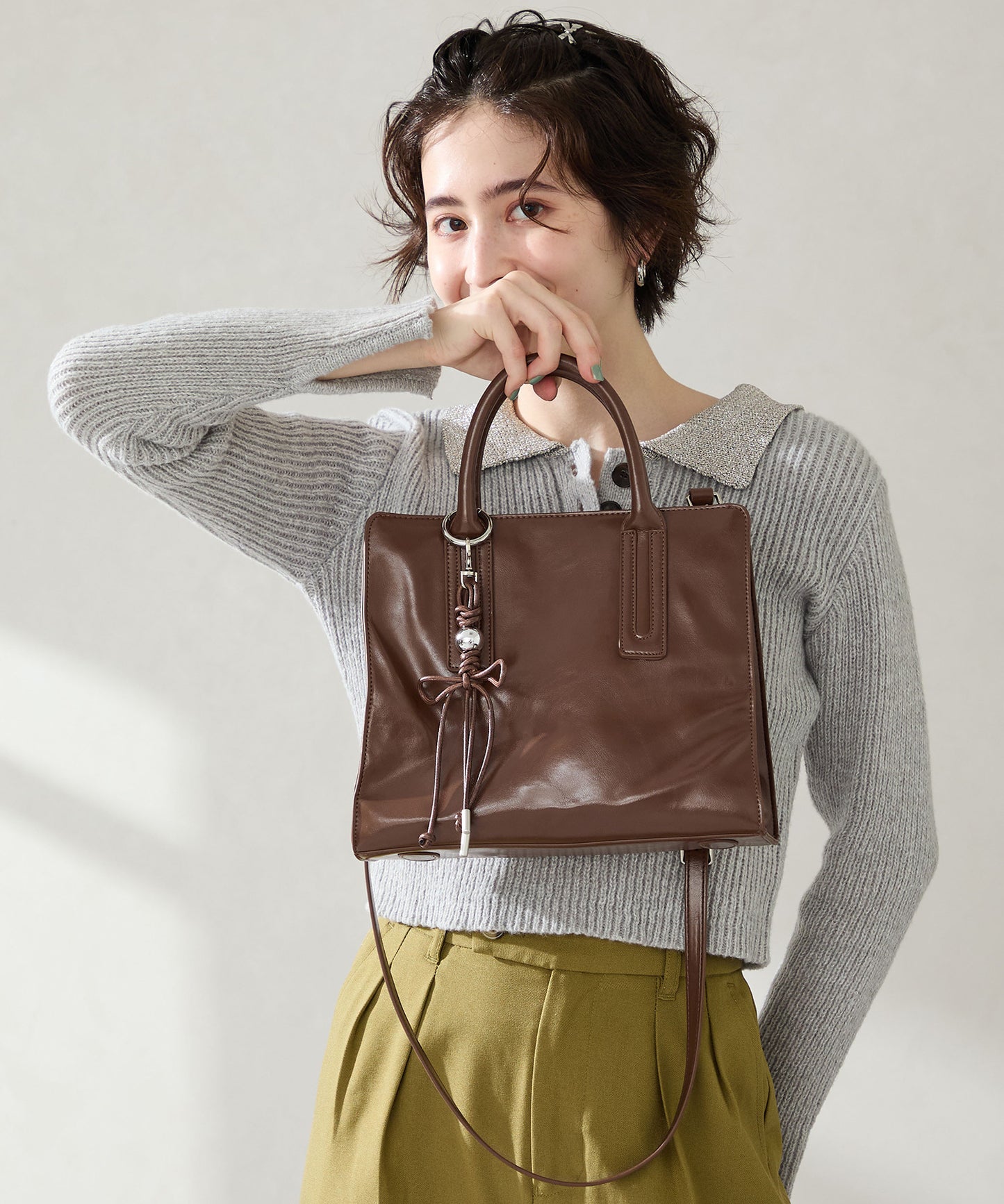 ヴィンテージライクなツヤ感のある素材がおしゃれ見えするボストンバッグ。付属のリボン型のチャームは取り外しができるので、お好みのチャームに付け替えたりとアレンジが楽しめる。使いやすいサイズ感に加え、しっかりとマチがあるので見た目以上に大容量なのとファスナー付きですっきり収納できるのも嬉しい。