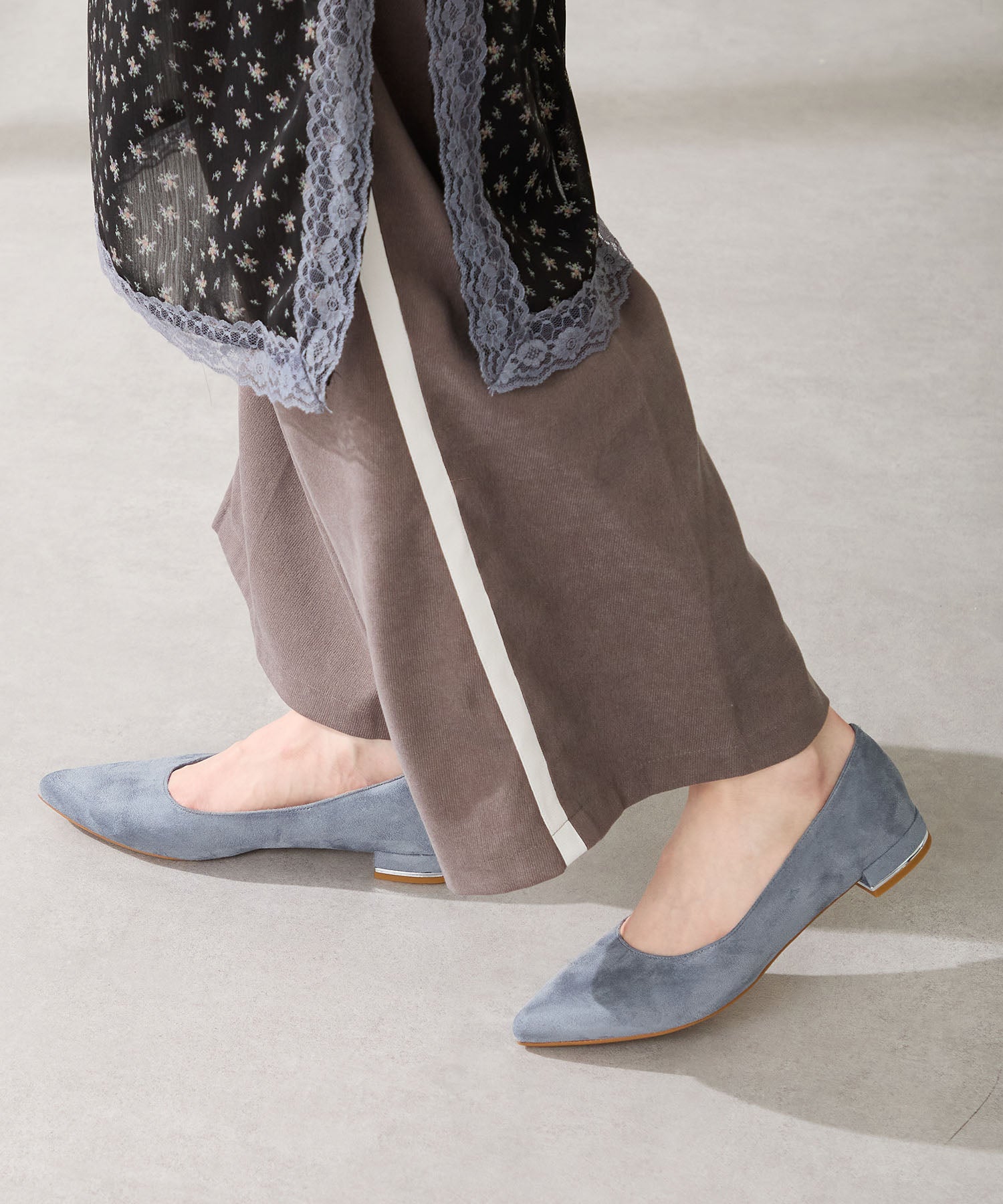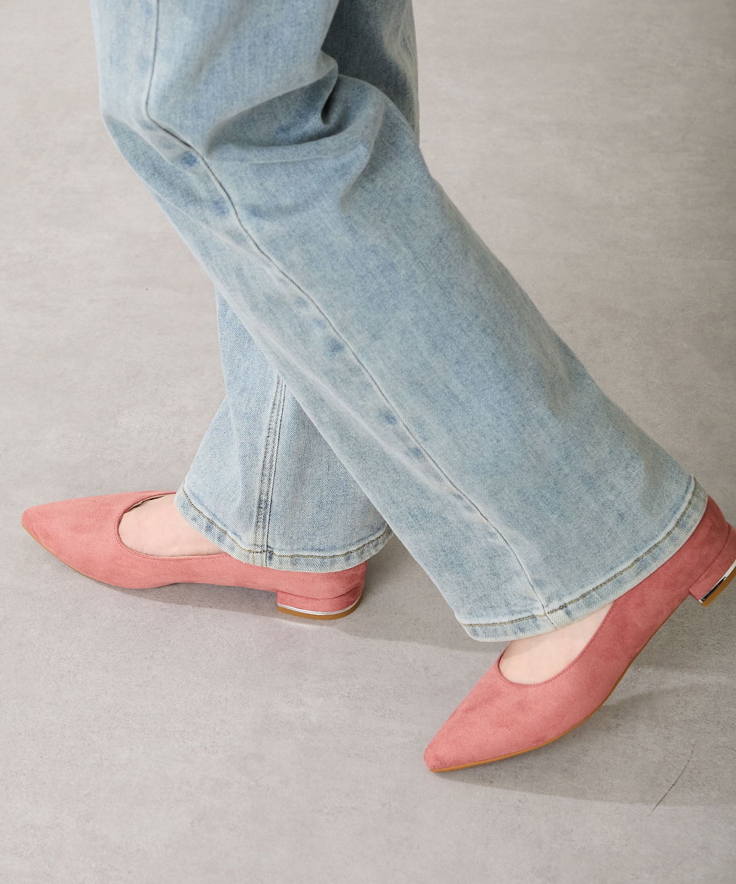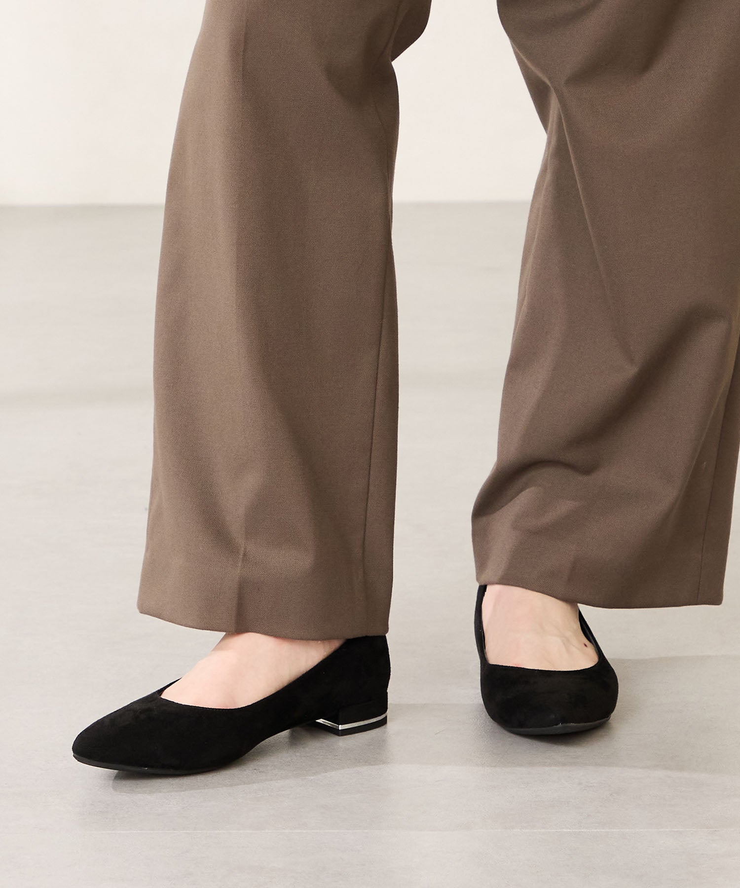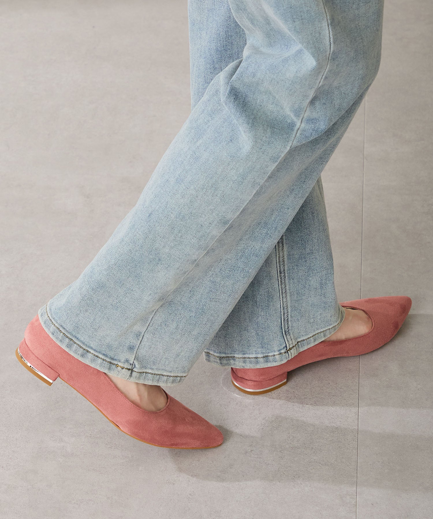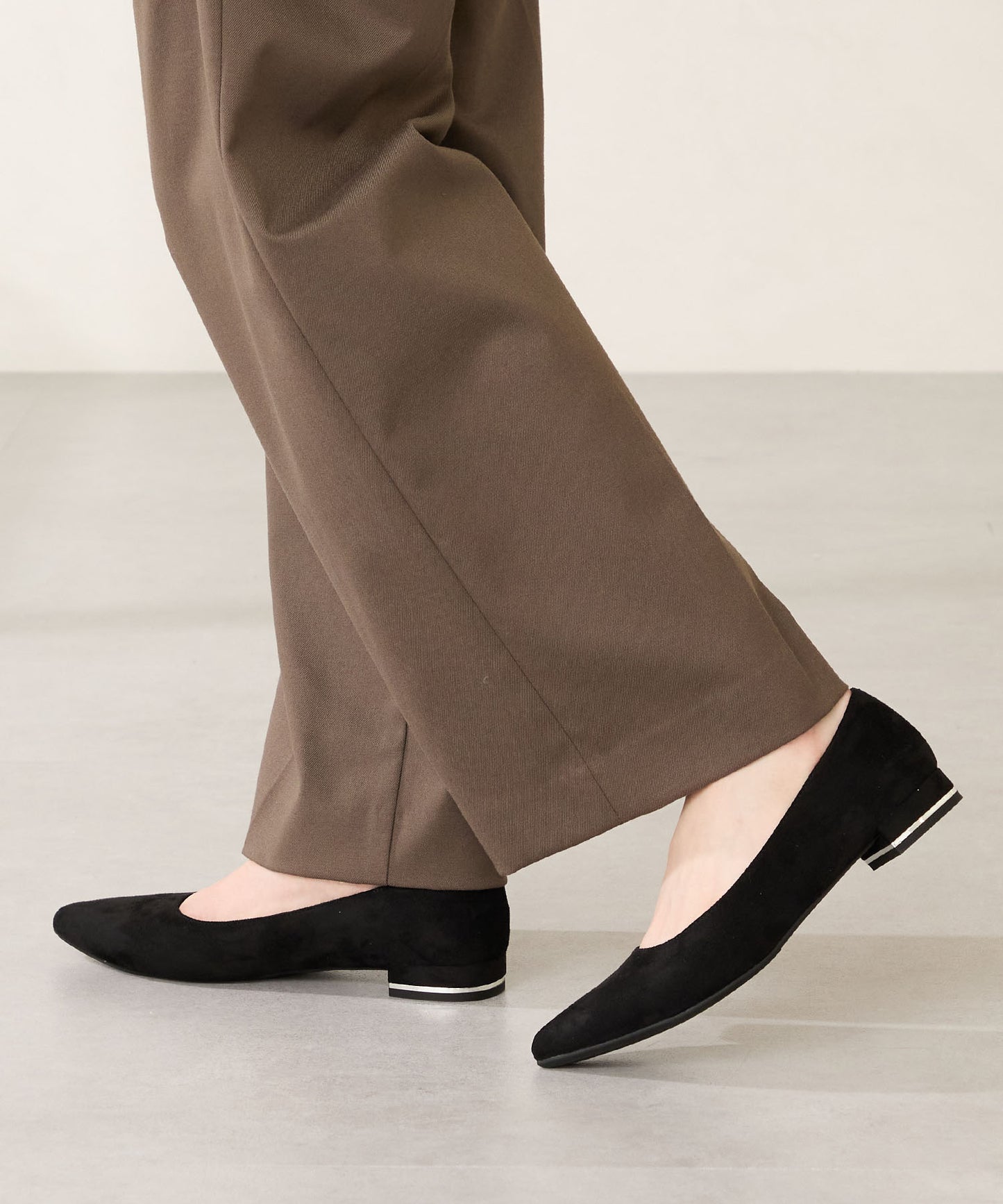 シンプルでデイリー使いしやすいフラットパンプスはシャープなトゥで足元を綺麗に見せてくれる。フラットでも足裏が痛くなりにくい厚手クッションや返りの良いソールなど機能性も抜群。無駄のないデザインながらヒールにはメタリックラインを付けてさりげないワンポイントをプラス。オンオフ使える豊富なカラー展開で色違いで揃えるのもおすすめ。