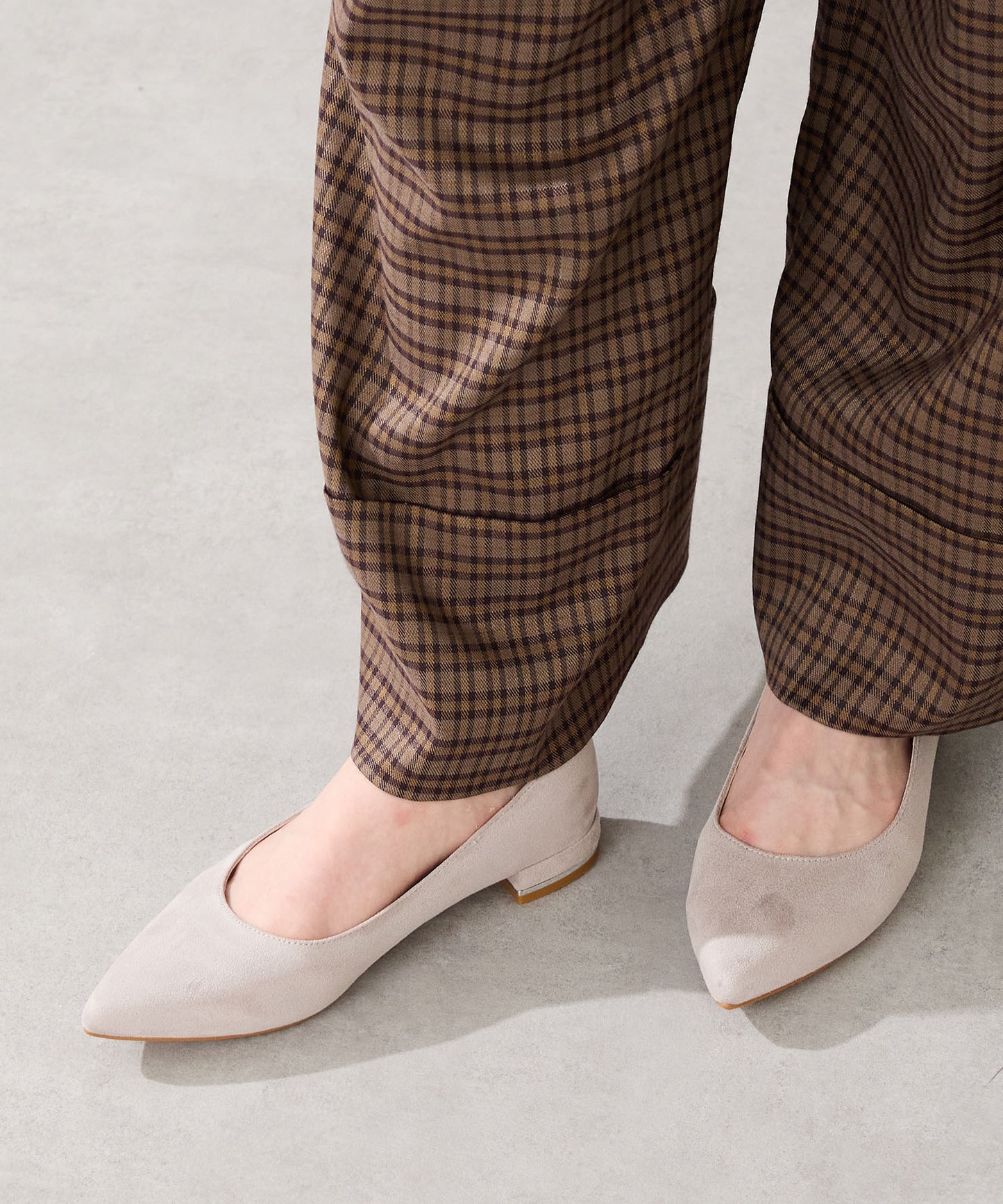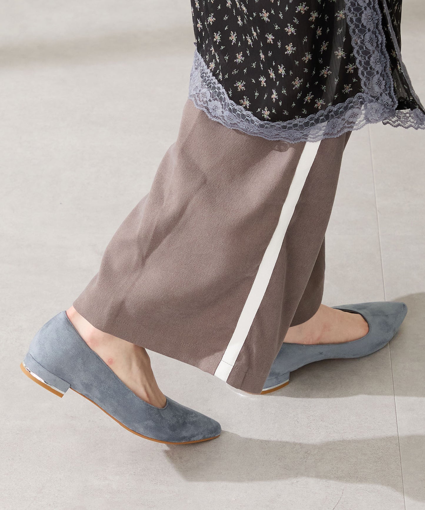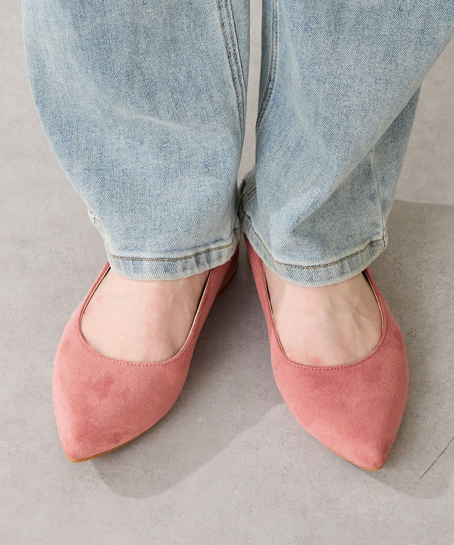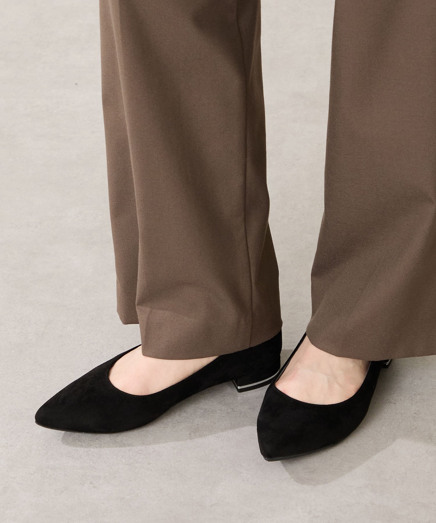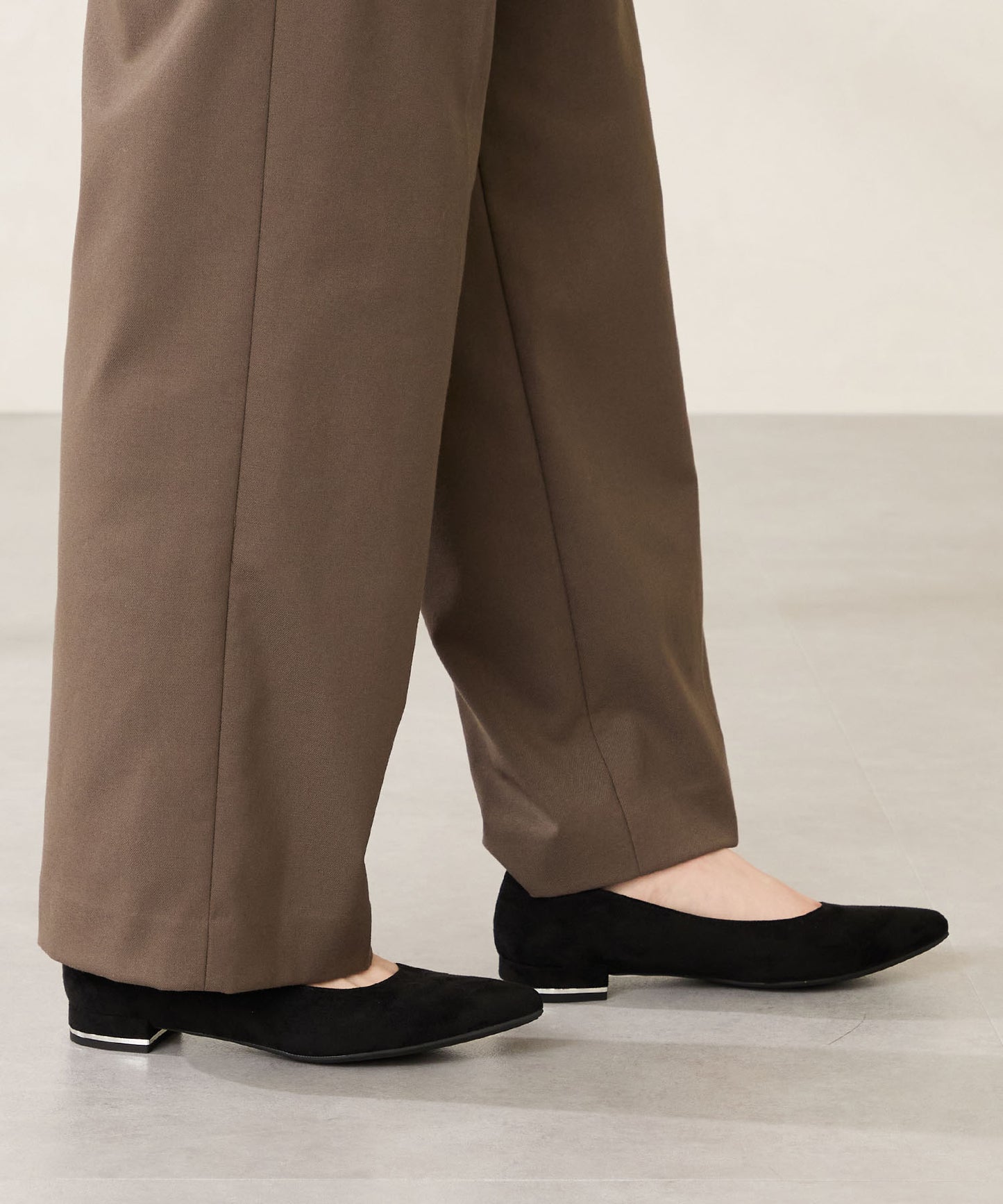 シンプルでデイリー使いしやすいフラットパンプスはシャープなトゥで足元を綺麗に見せてくれる。フラットでも足裏が痛くなりにくい厚手クッションや返りの良いソールなど機能性も抜群。無駄のないデザインながらヒールにはメタリックラインを付けてさりげないワンポイントをプラス。オンオフ使える豊富なカラー展開で色違いで揃えるのもおすすめ。